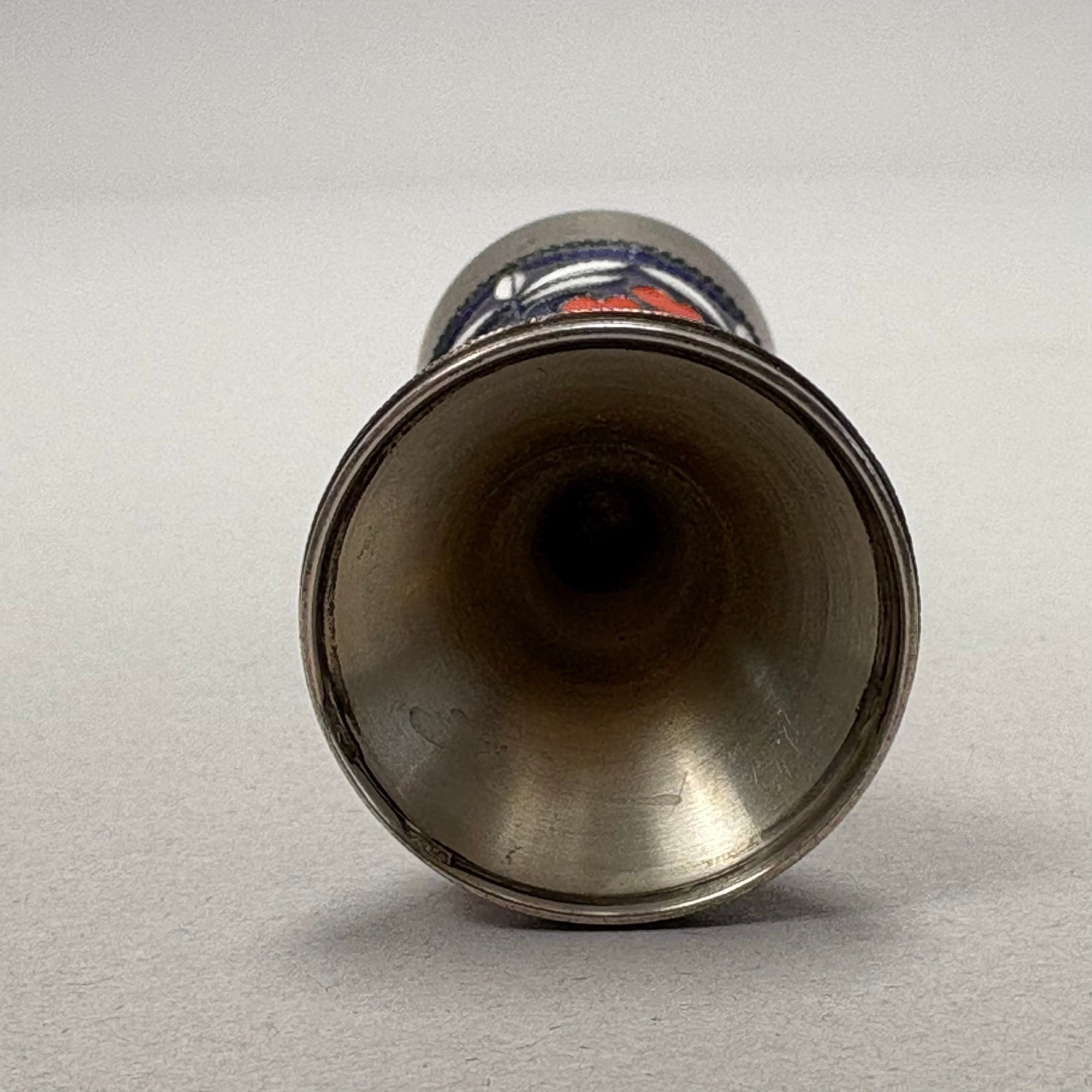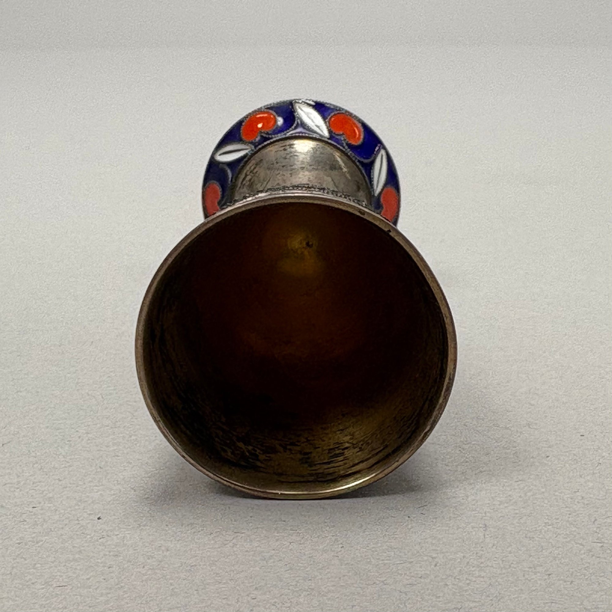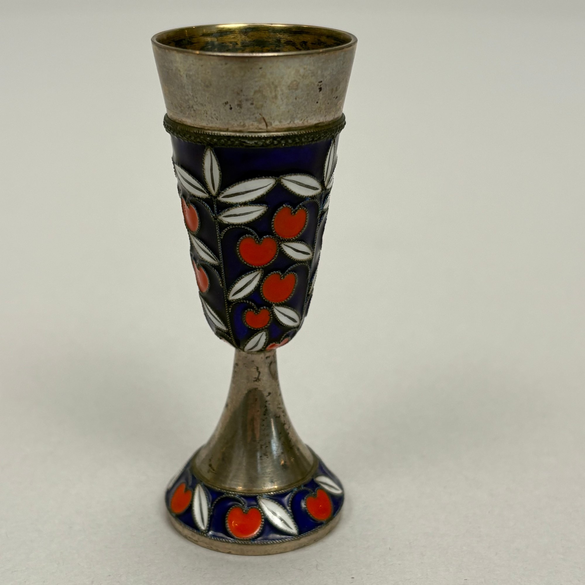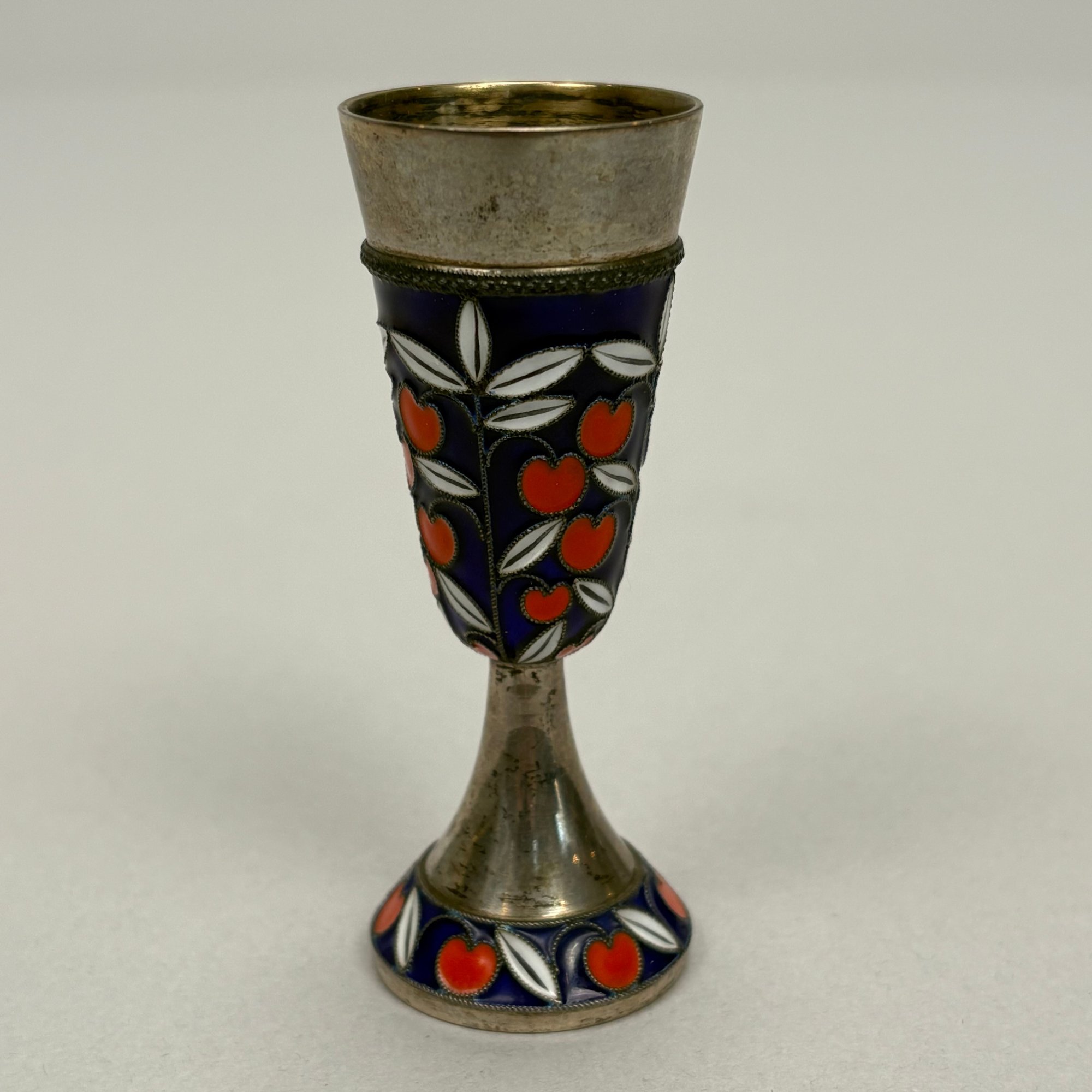 Russian Sterling Silver and Enamel Cordial, After 1958. The tapered bowl and foot enamelled with cherries and branches, silver-gilt on the interior, mark of a Cyrillic letter "A" beside a hammer and sickle inside a star into a rectangle with oval edges, a "2" and anchor (?) on the inside edge of the foot rim.