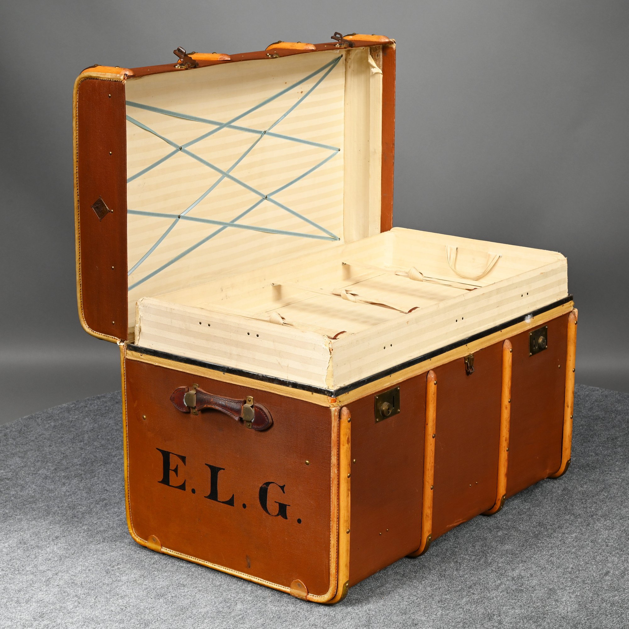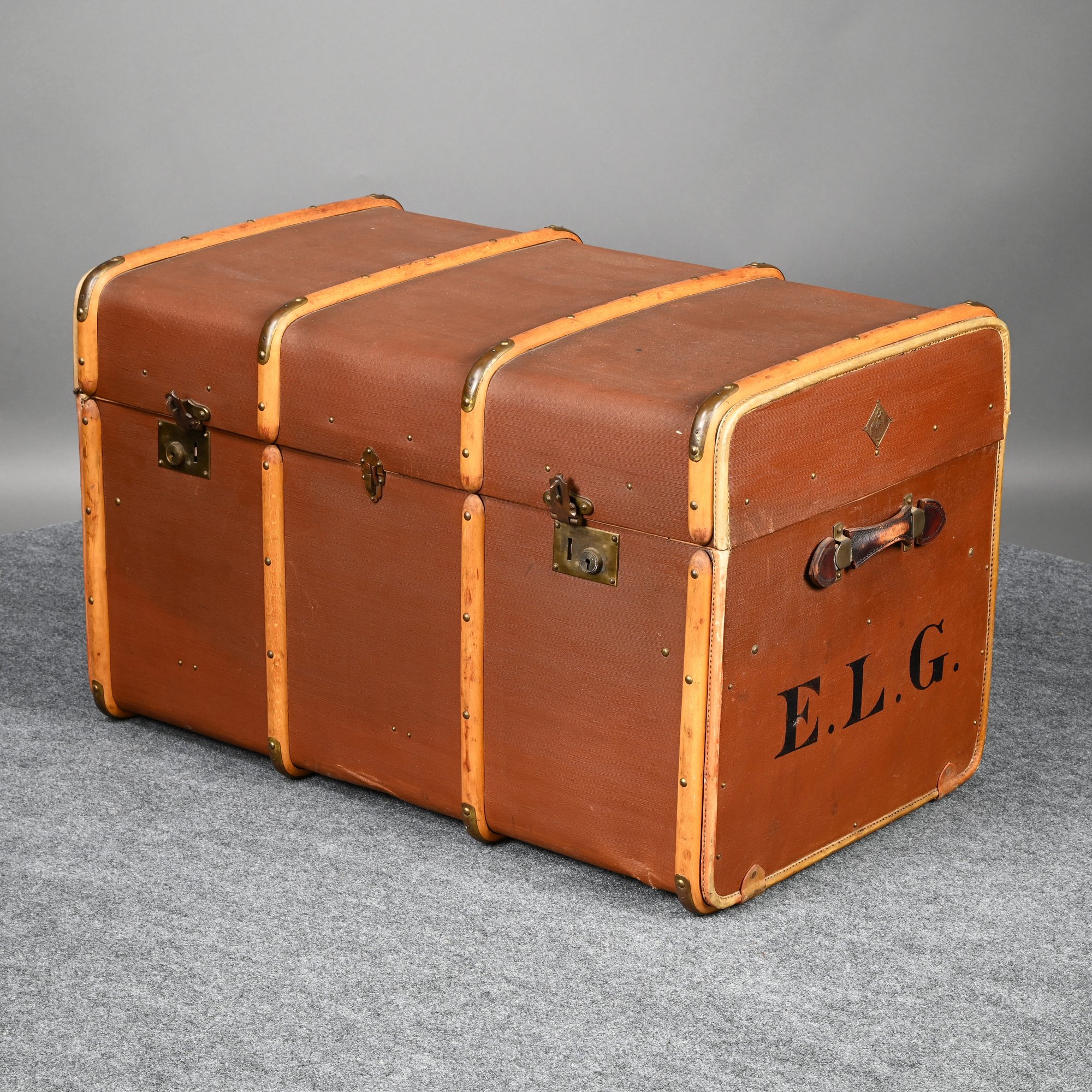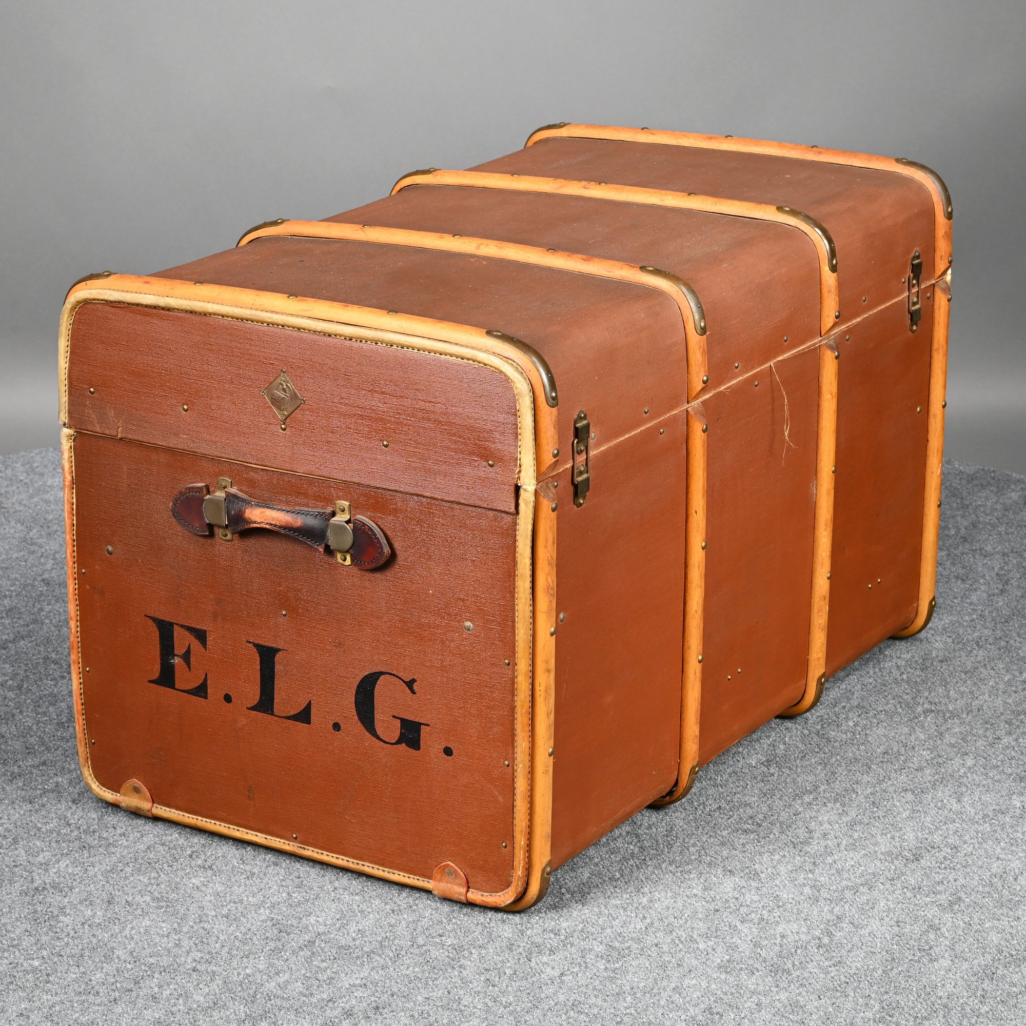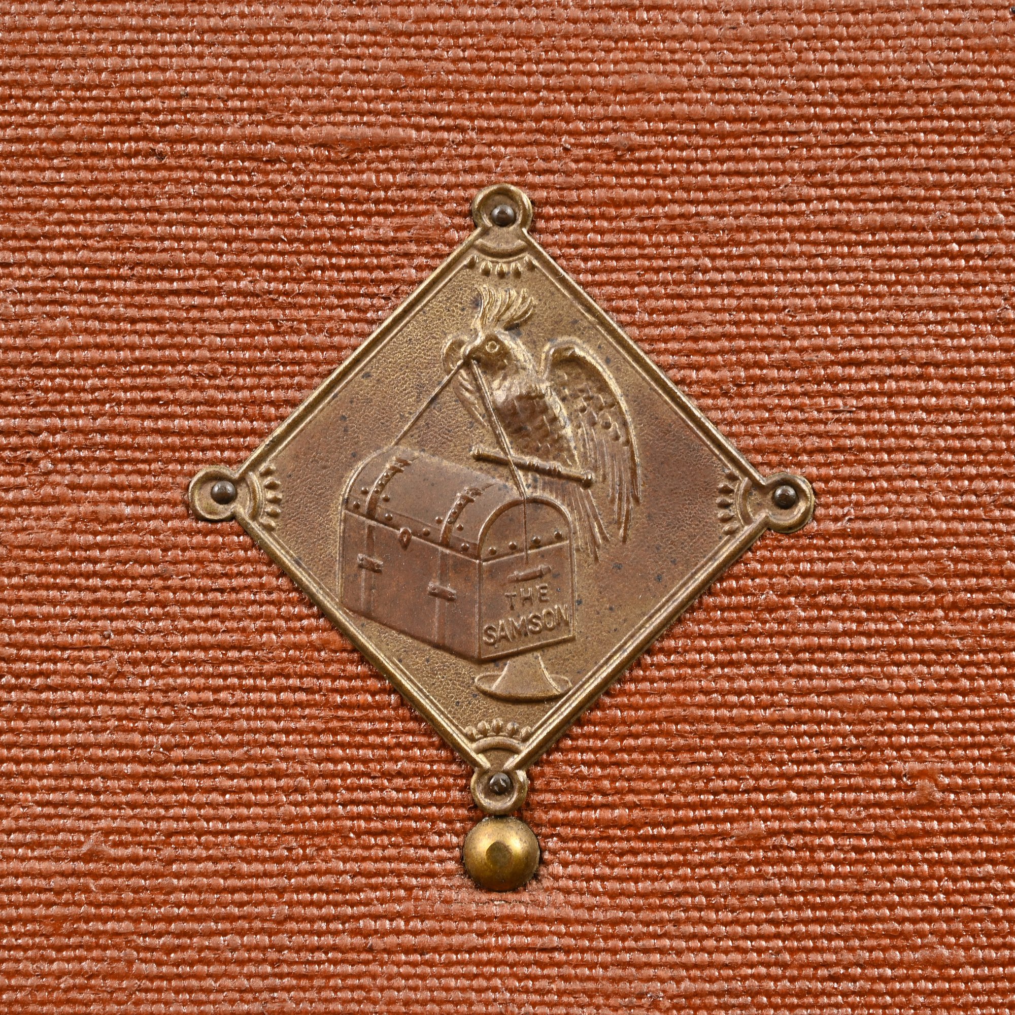 Samson Canvas, Maple- and Brass-Bound Steamer Trunk, Shwayder Brothers, Inc./ Samson, Denver, Colorado, Early Twentieth Century. The interior lined in the original cotton striped fabric, fitted with two long trays over a folding compartment on the right side of the bottom, stencilled on each end with the initials "E.L.G.," affixed on each side of the lid with a brass tag embossed with a cockatoo holding a rope in its beak suspending a mailbox stamped "The SAMSON," leather carrying handles.