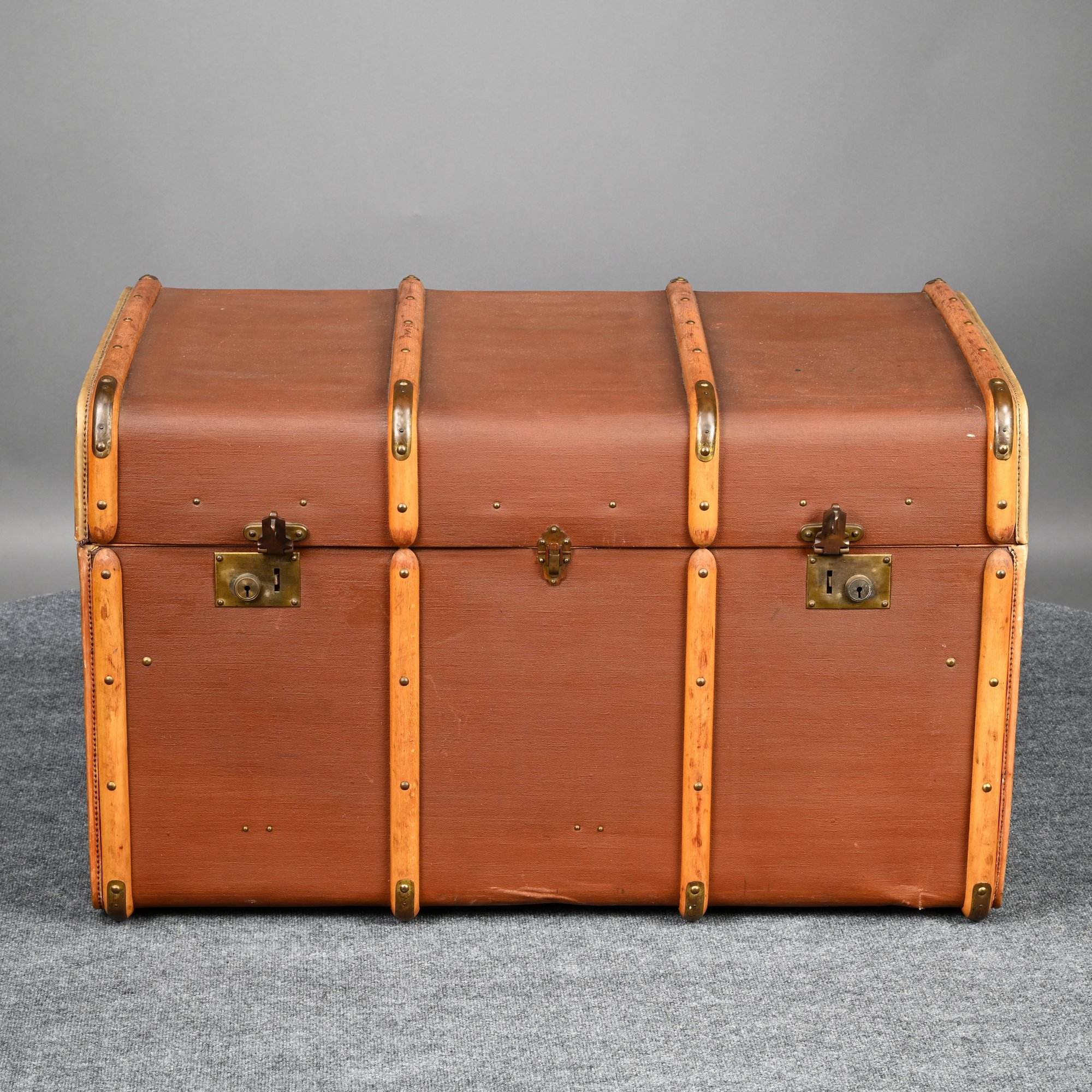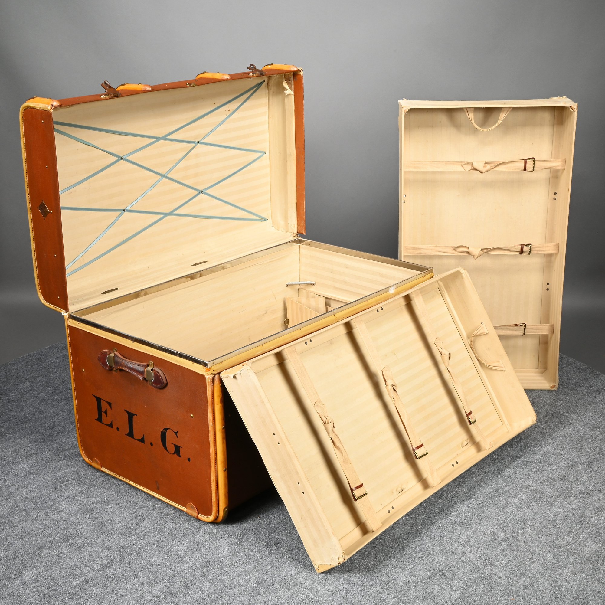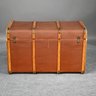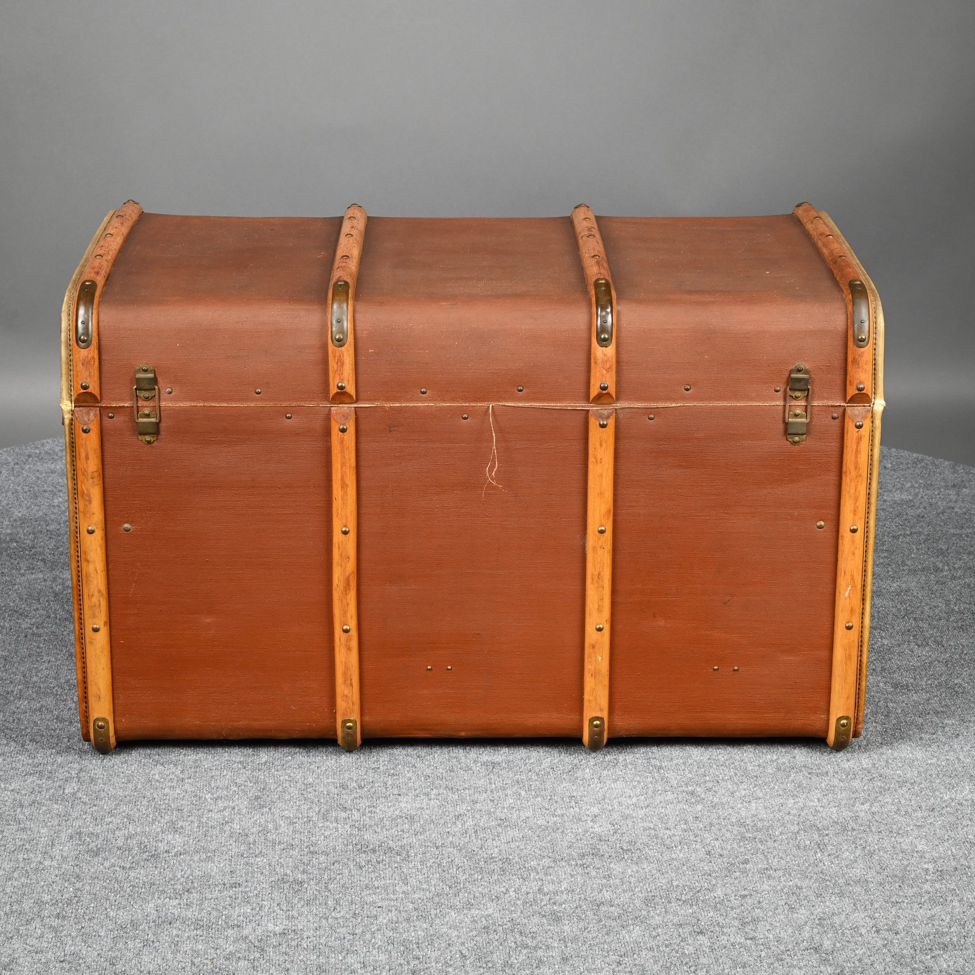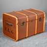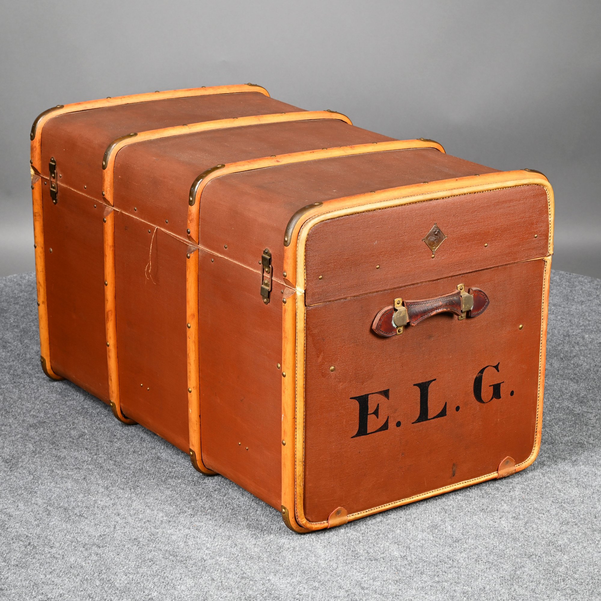 Samson Canvas, Maple- and Brass-Bound Steamer Trunk, Shwayder Brothers, Inc./ Samson, Denver, Colorado, Early Twentieth Century. The interior lined in the original cotton striped fabric, fitted with two long trays over a folding compartment on the right side of the bottom, stencilled on each end with the initials "E.L.G.," affixed on each side of the lid with a brass tag embossed with a cockatoo holding a rope in its beak suspending a mailbox stamped "The SAMSON," leather carrying handles.