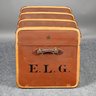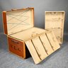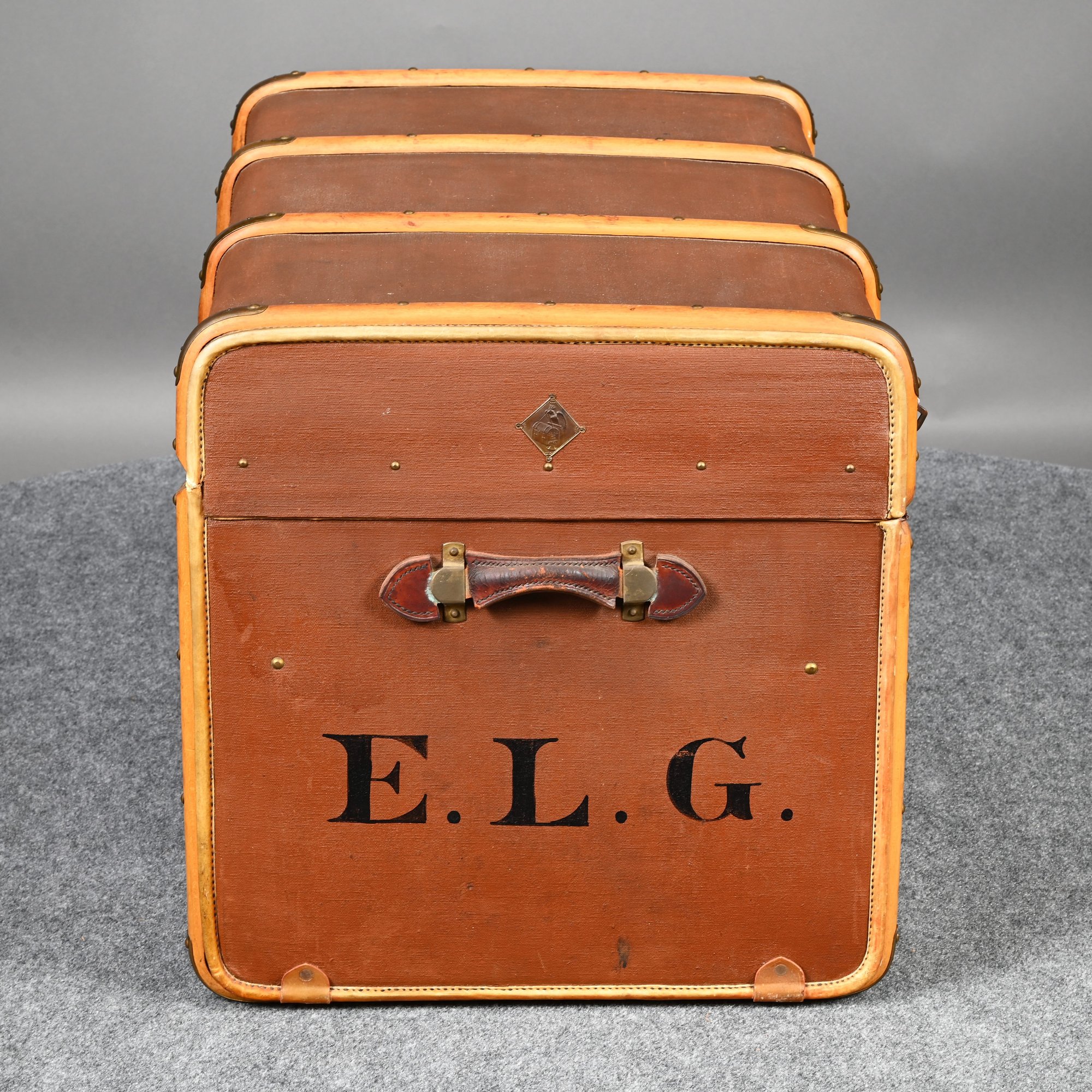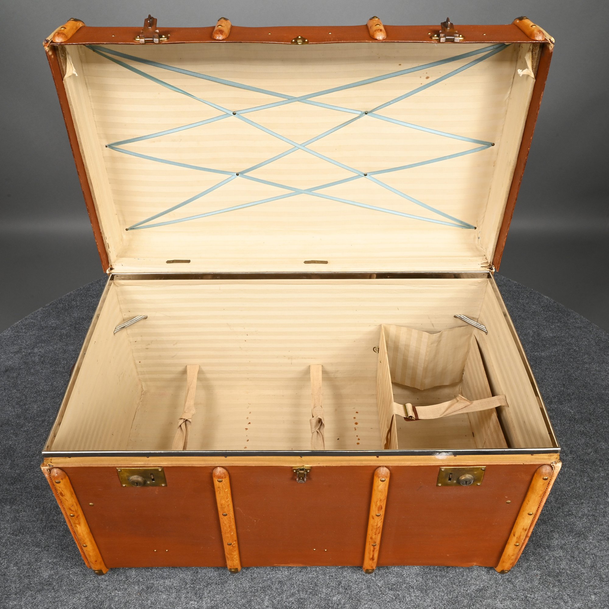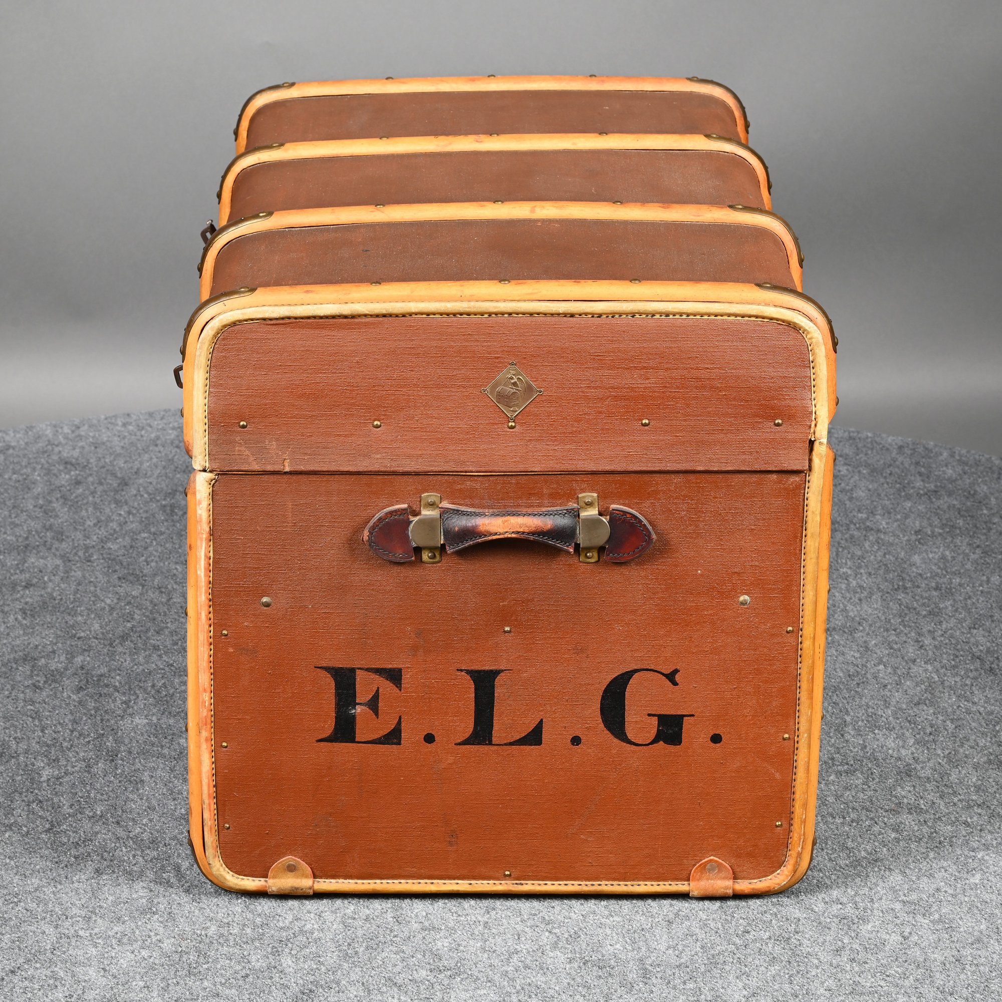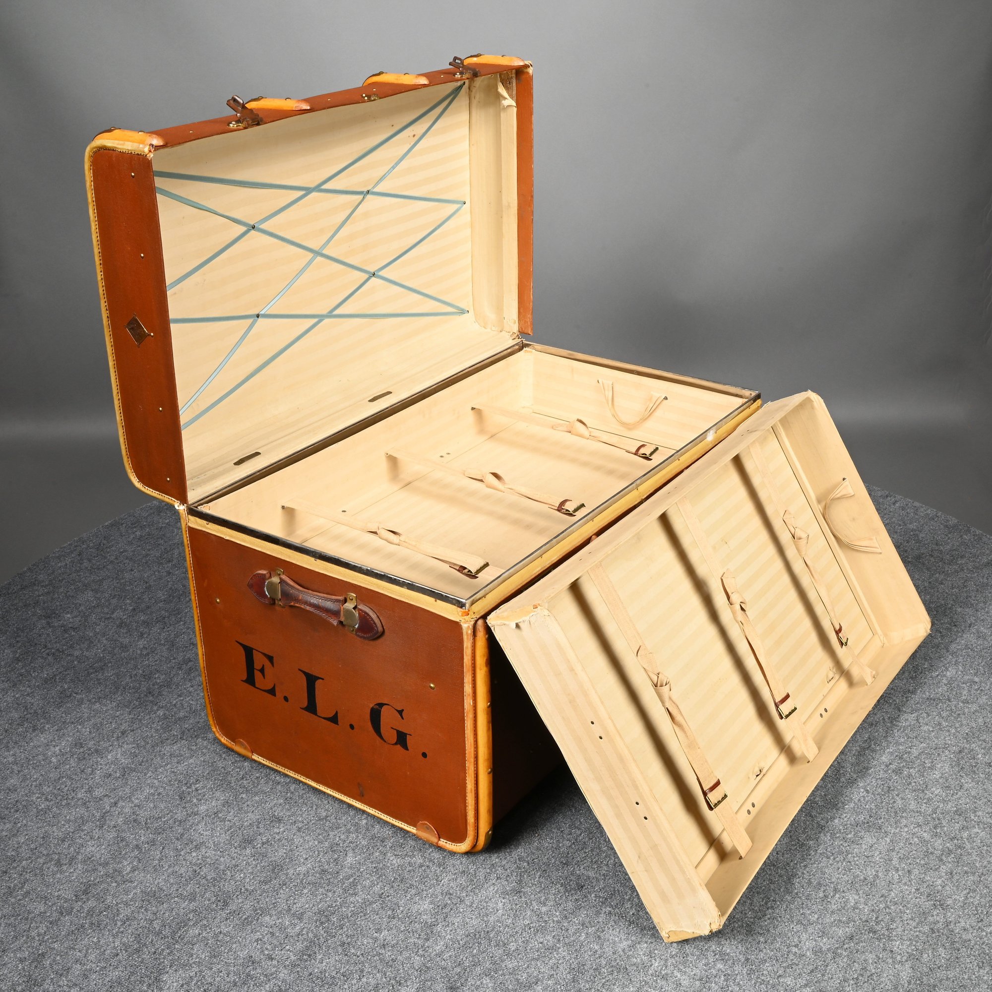 Samson Canvas, Maple- and Brass-Bound Steamer Trunk, Shwayder Brothers, Inc./ Samson, Denver, Colorado, Early Twentieth Century. The interior lined in the original cotton striped fabric, fitted with two long trays over a folding compartment on the right side of the bottom, stencilled on each end with the initials "E.L.G.," affixed on each side of the lid with a brass tag embossed with a cockatoo holding a rope in its beak suspending a mailbox stamped "The SAMSON," leather carrying handles.