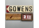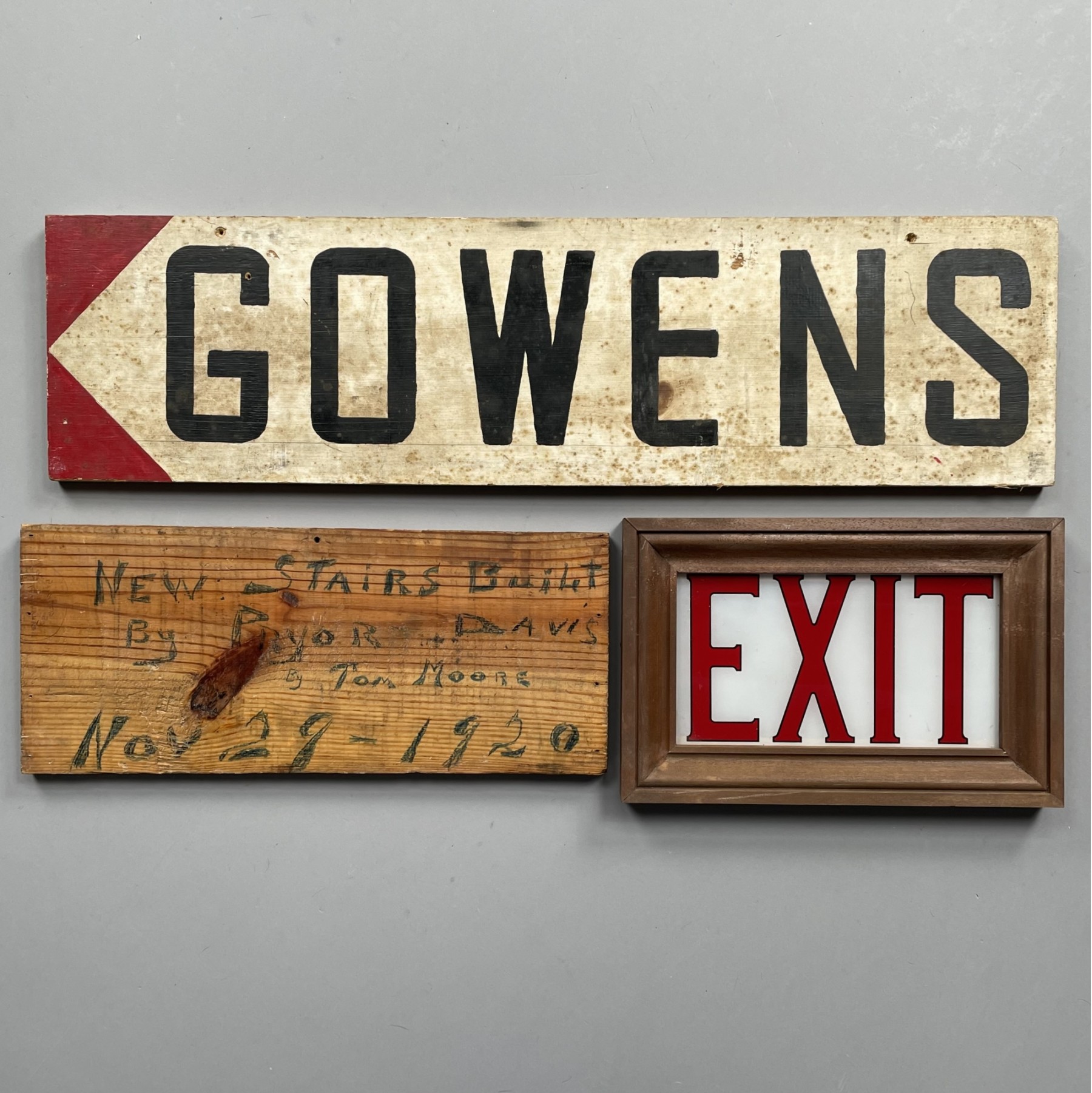 Comprising a stair step inscribed on one side with four names and a date of demolition, and on the other side written in crayon "NEW STAiRS Built By Pryor Davis by TOM MOORE Nov 29- 1920;" a painted wood sign for "GOWENS;" and a plastic "EXIT" sign.