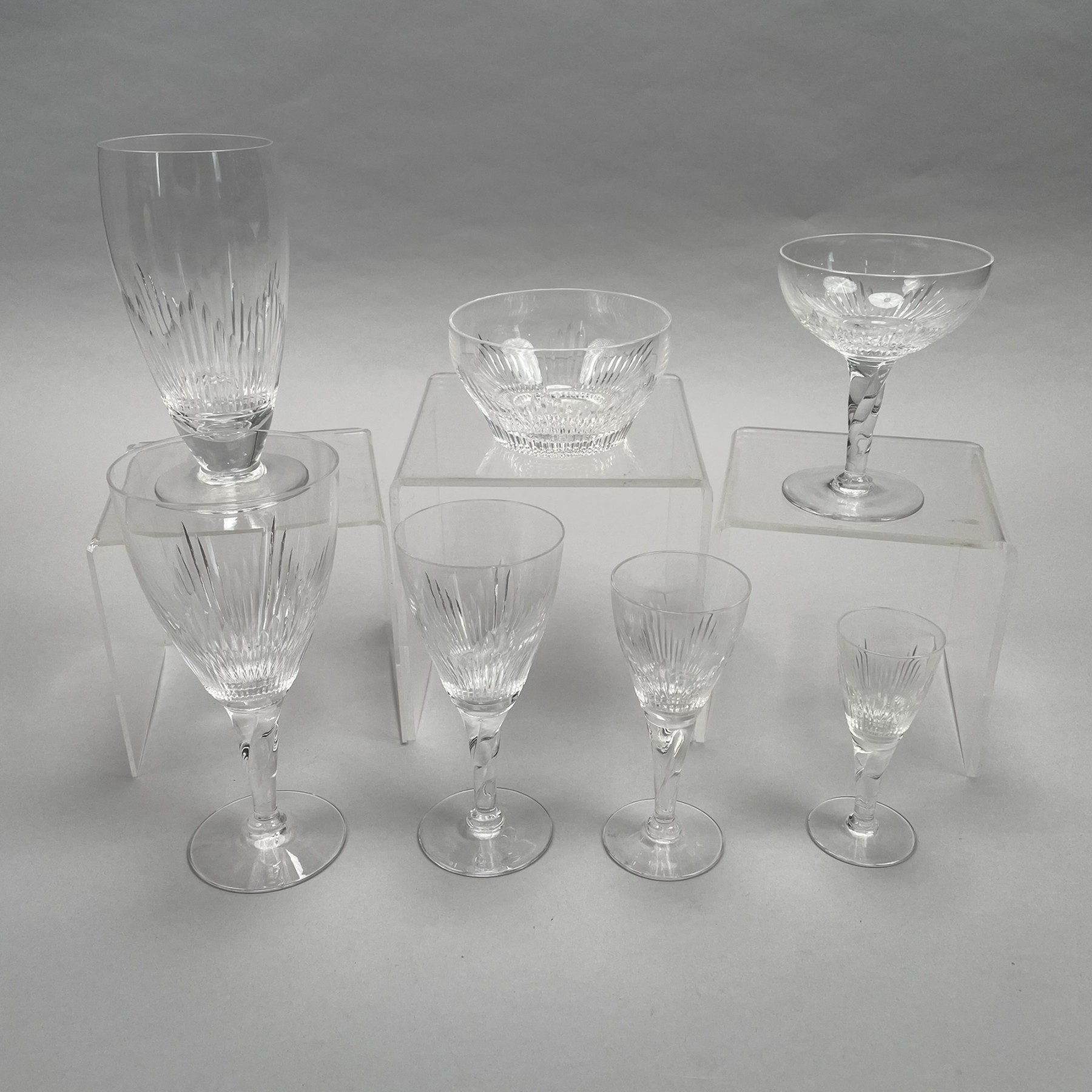 Comprising 18 water glasses, 15 water goblets, h: 7.125 in., 14 champagne, 6 red wine, 17 white wine, 10 sherry glasses, h: 4.125 in., and 11 finger bowls, each etched "Stuart/ ENGLAND." (91)