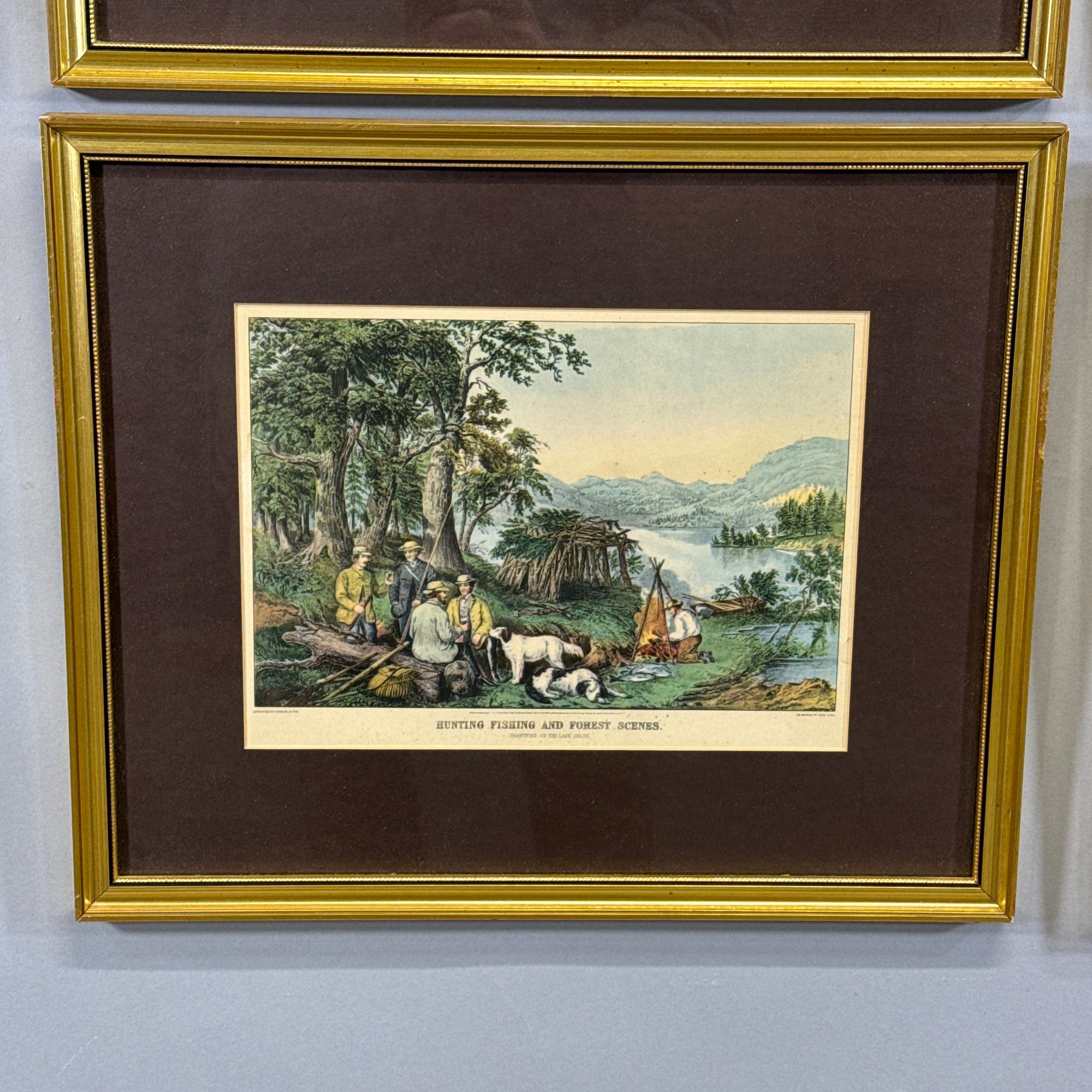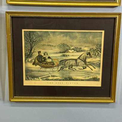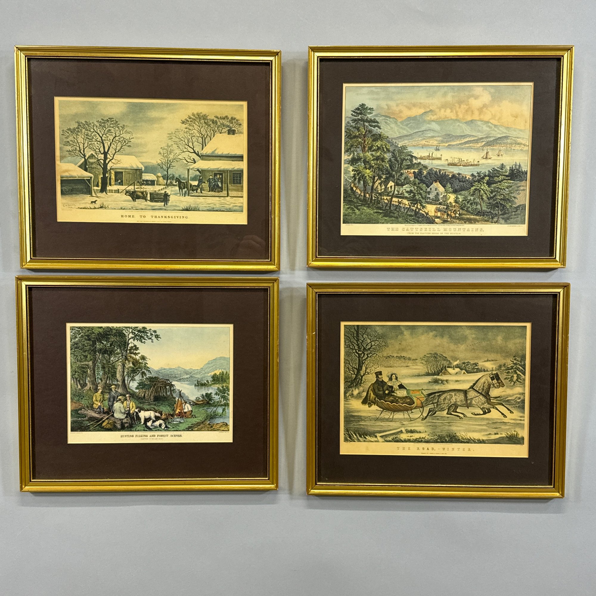 Set of Four Currier & Ives Reproduction Prints, 20th Century. Comprising "The Cattskill Mountains from the Eastern Shore of the Hudson," "Hunting, Fishing and Forest Scenes: Shantying on the Lake Shore," "Home to Thanksgiving" and "The Road, - Winter."