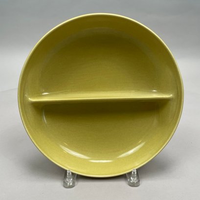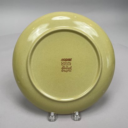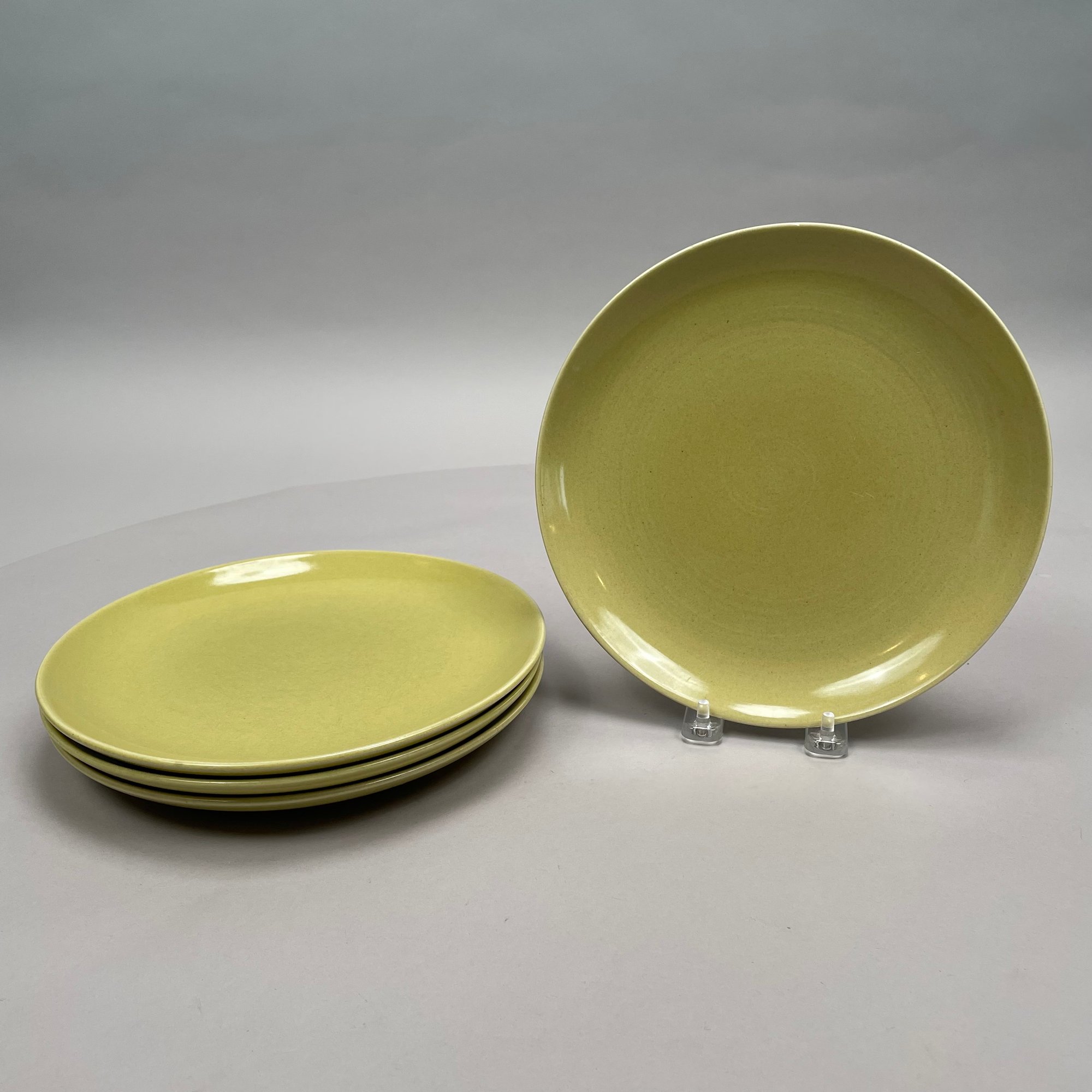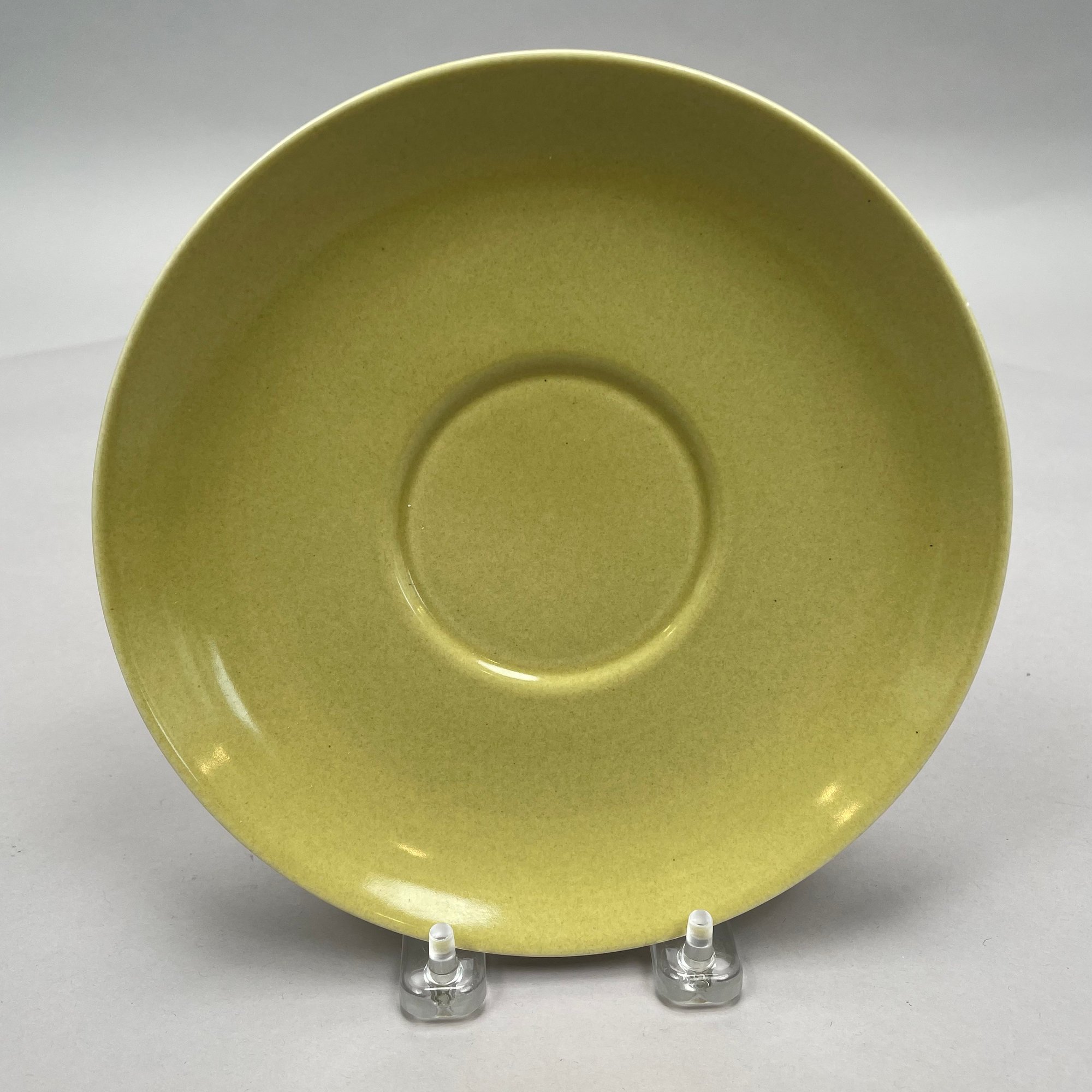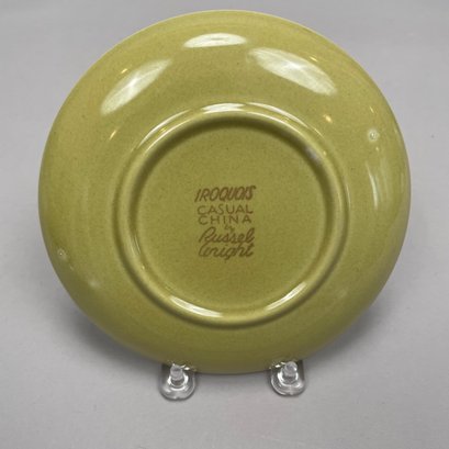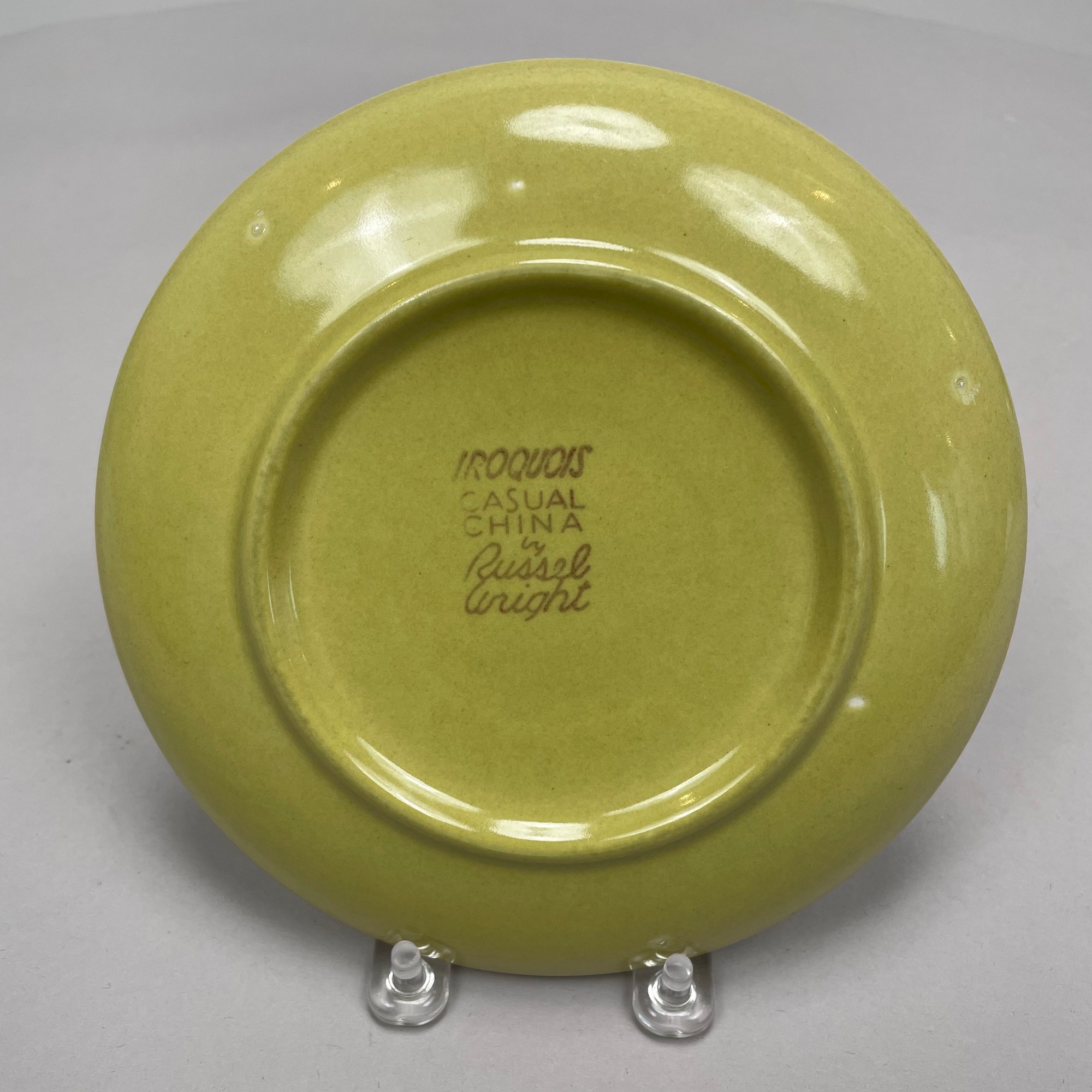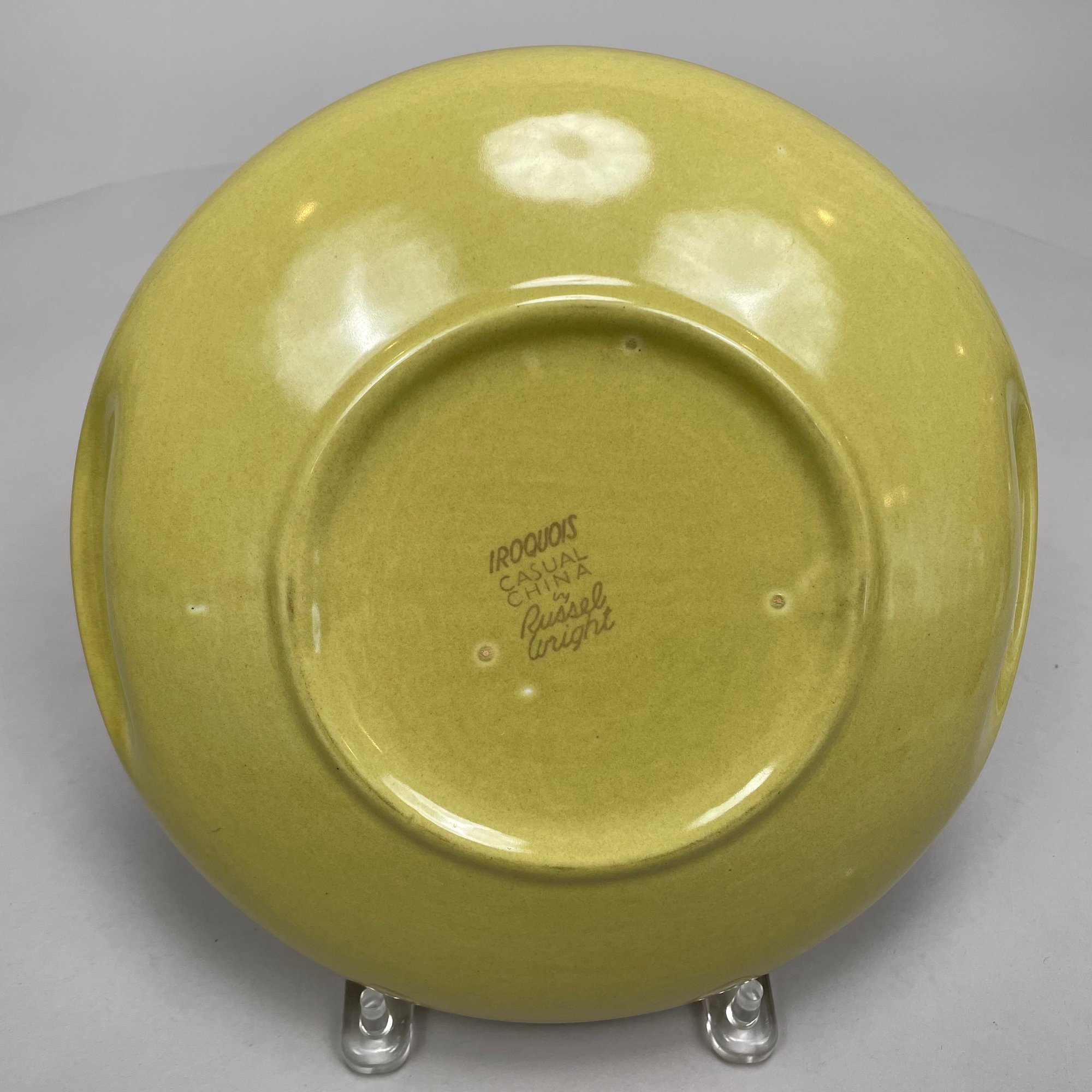 Set of Russel Wright 'Iroquois Casual China' Avocado Yellow Dinnerware. Comprising one divided 10- inch serving dish, one 7.5- inch gravy liner, three 10- inch dinner plates, four 9.25- inch lunch plates, three 6.5- inch bread and butter plates, five tea/ coffee cups and eight saucers, each printed "IROQUOIS CASUAL CHINA by Russel Wright." (25)