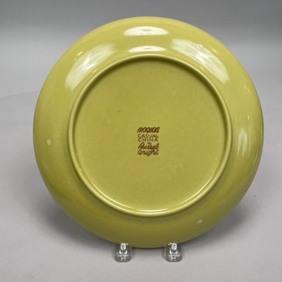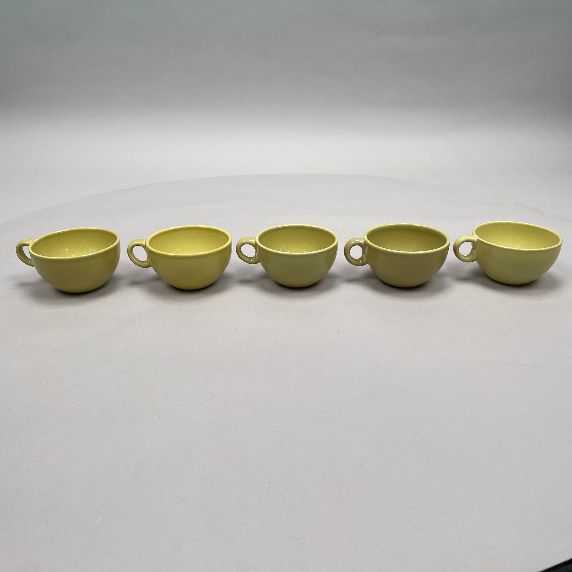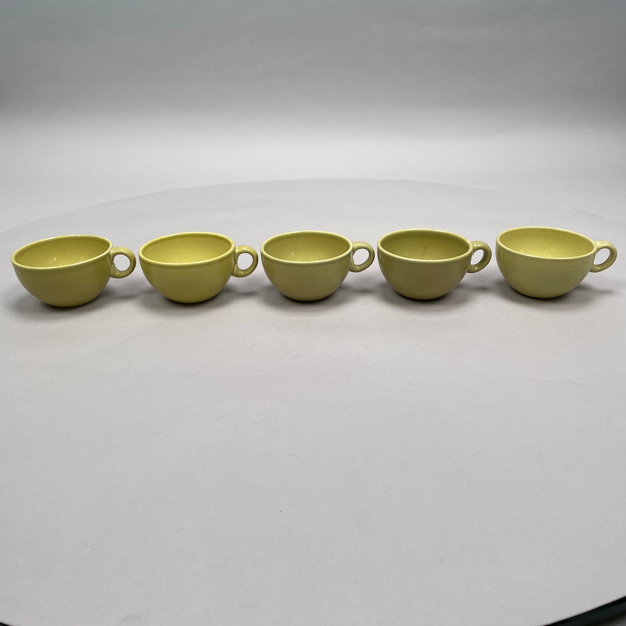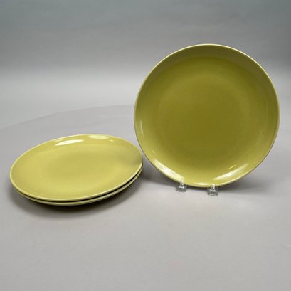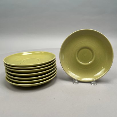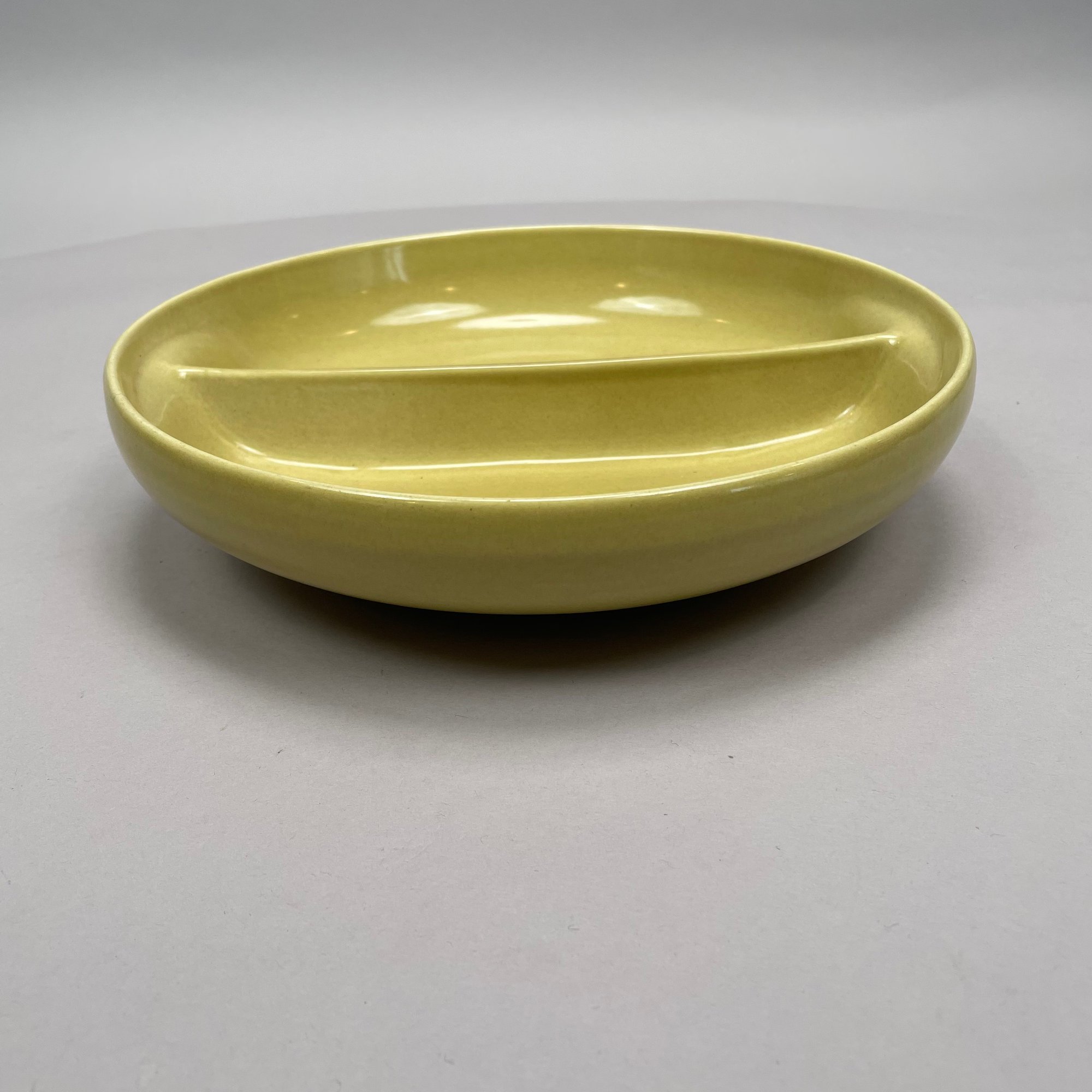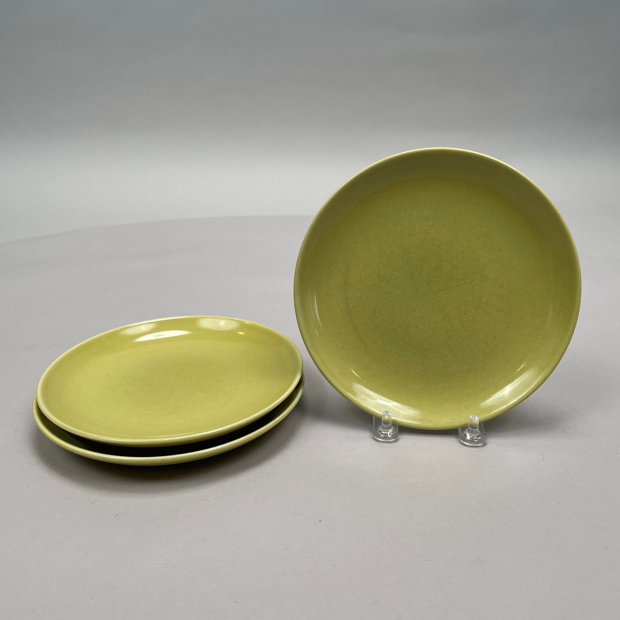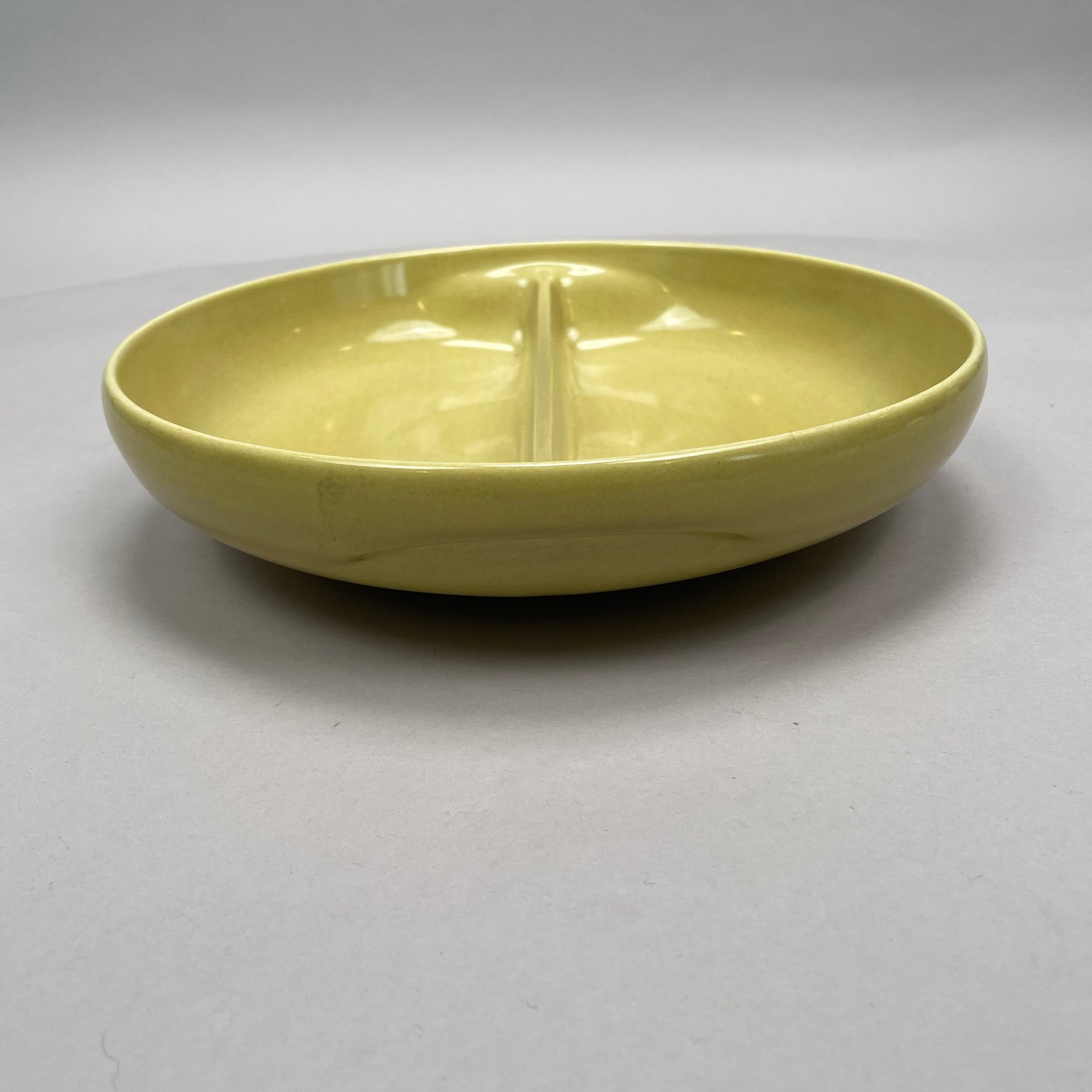 Set of Russel Wright 'Iroquois Casual China' Avocado Yellow Dinnerware. Comprising one divided 10- inch serving dish, one 7.5- inch gravy liner, three 10- inch dinner plates, four 9.25- inch lunch plates, three 6.5- inch bread and butter plates, five tea/ coffee cups and eight saucers, each printed "IROQUOIS CASUAL CHINA by Russel Wright." (25)