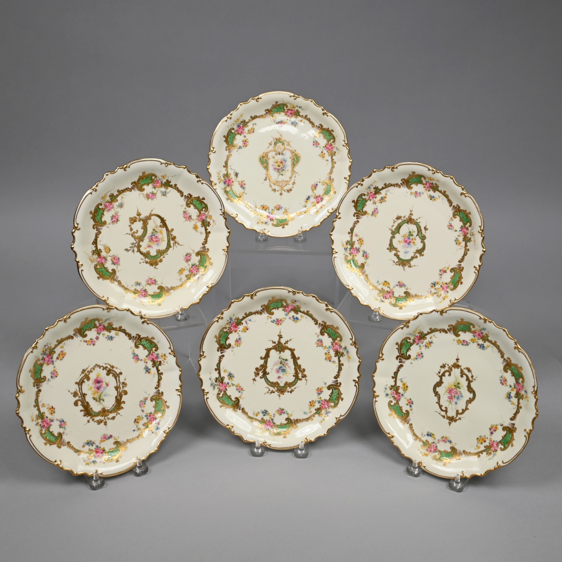 Each painted in the center with a floral spray within a gilt-edged cartouche heightened with green panels, the rim surrounded by a border of roses and scroll cartouches within a molded gilt scroll edge, five printed in iron-red and one in green with "ROYAL CROWN DERBY" factory mark, "ENGLAND" vertically to the side, and retailer "DAVIS COLLAMORE & CO., LTD., 921 BROADWAY, NEW YORK," above the year code for 1893. H: 1 in., Diam.: 9 in.