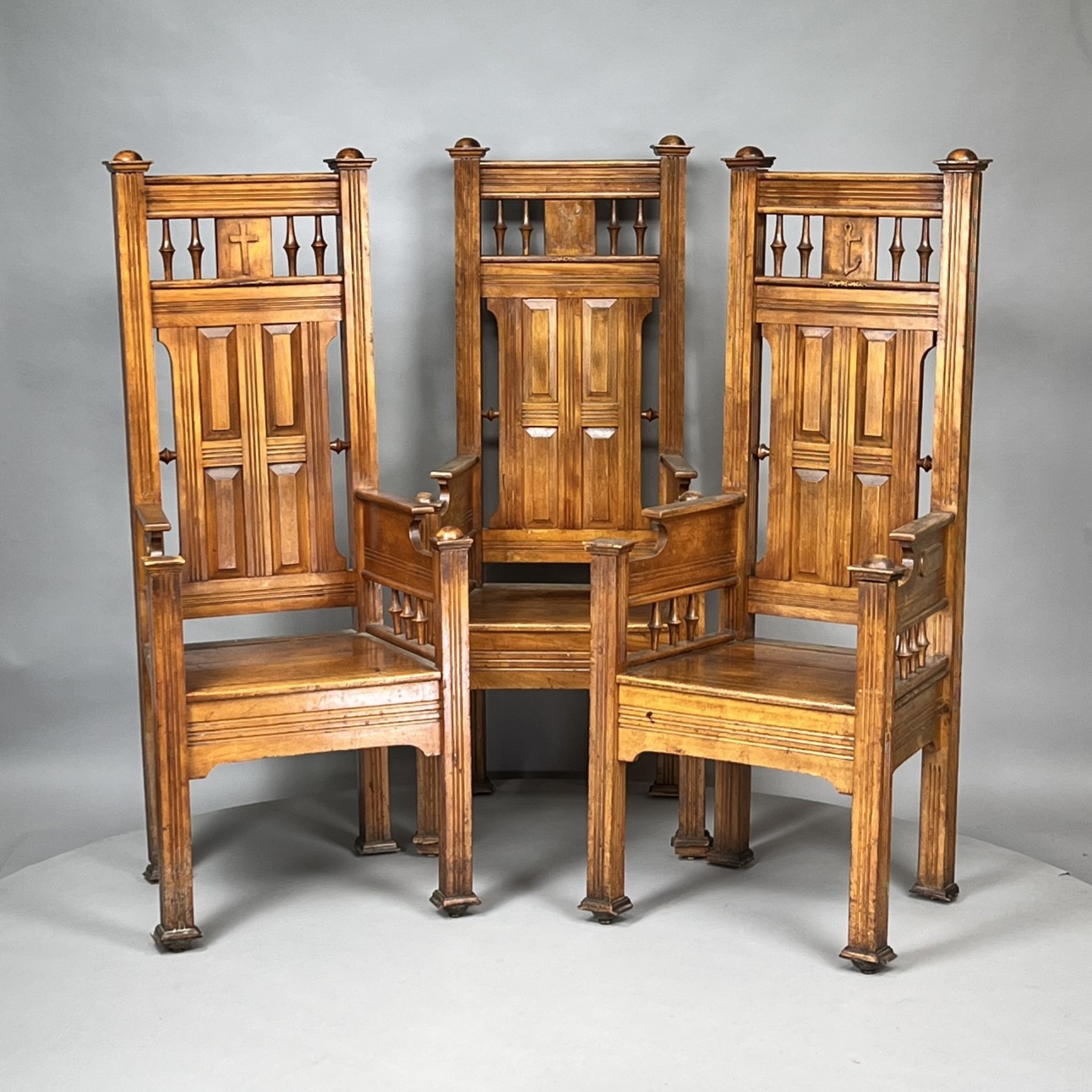 Each fitted with turned spindles centering an applied symbol, above a rectangular panelled back and drop arms ending in ball hand grips, the trapezoidal seat raised on straight square legs, the symbols comprising a cross, half an anchor, and the shadow of crossed sabres.