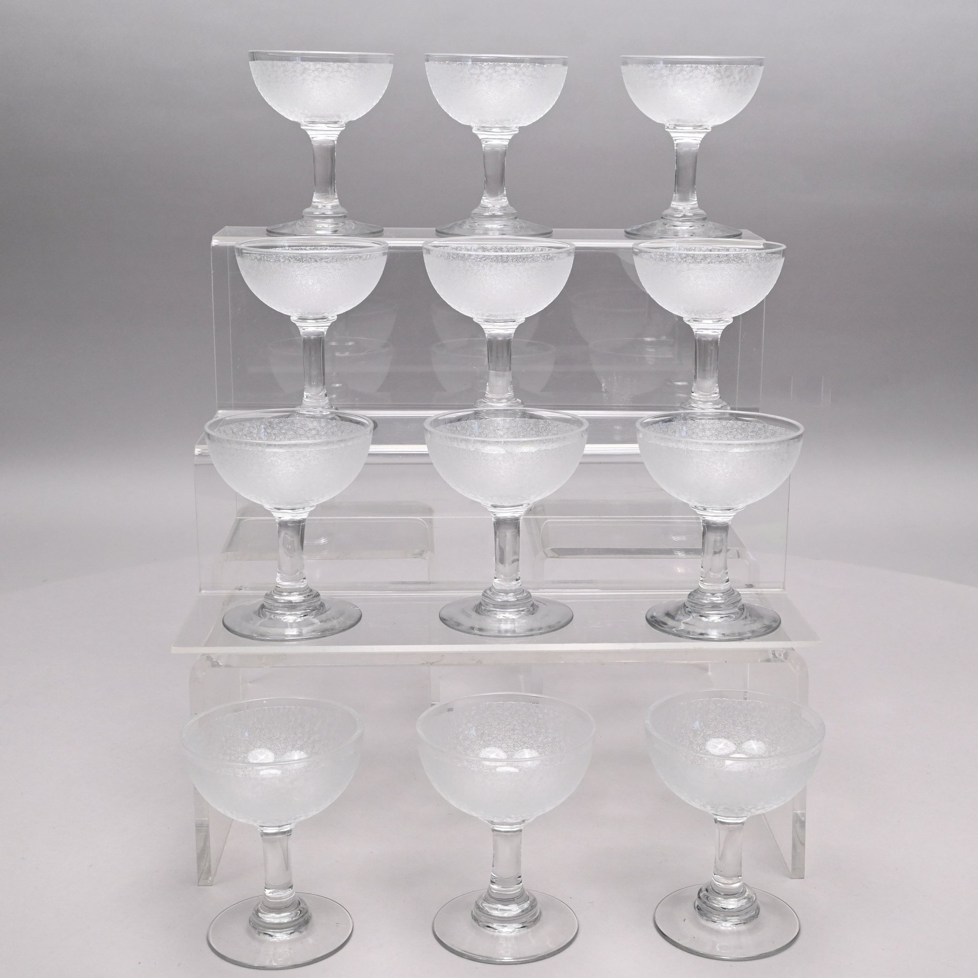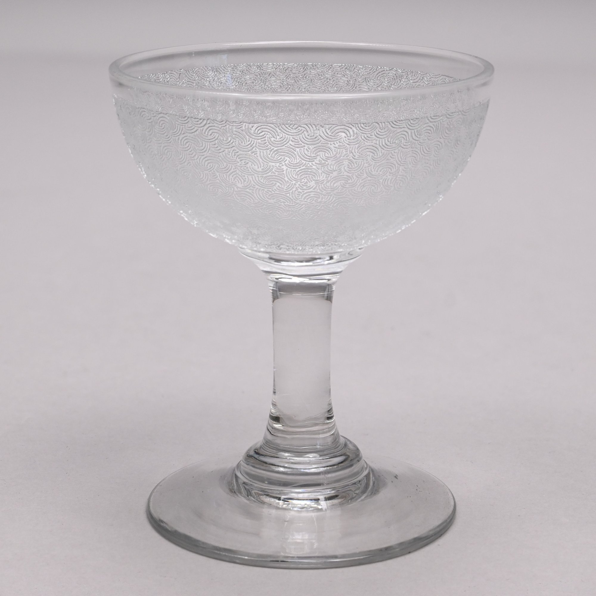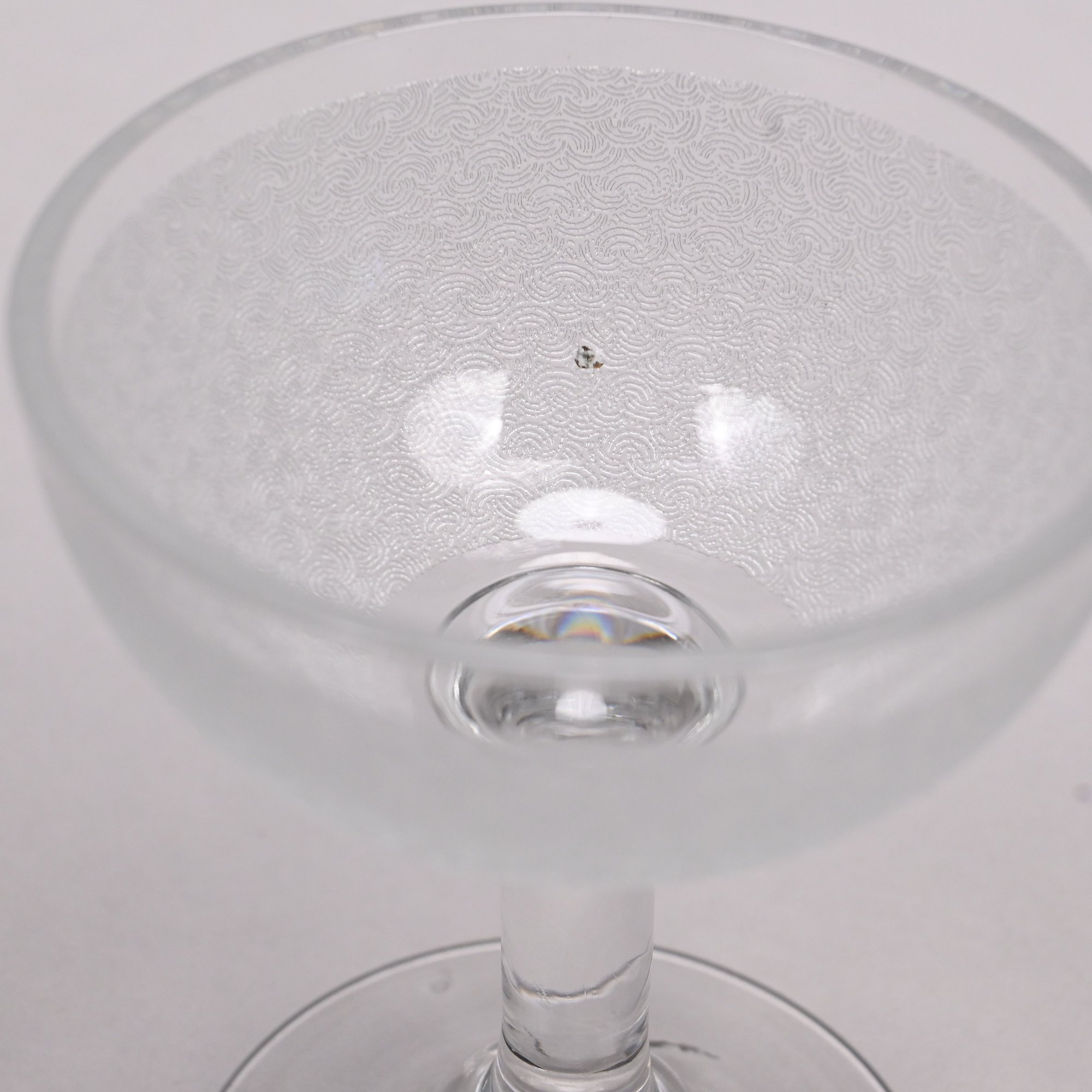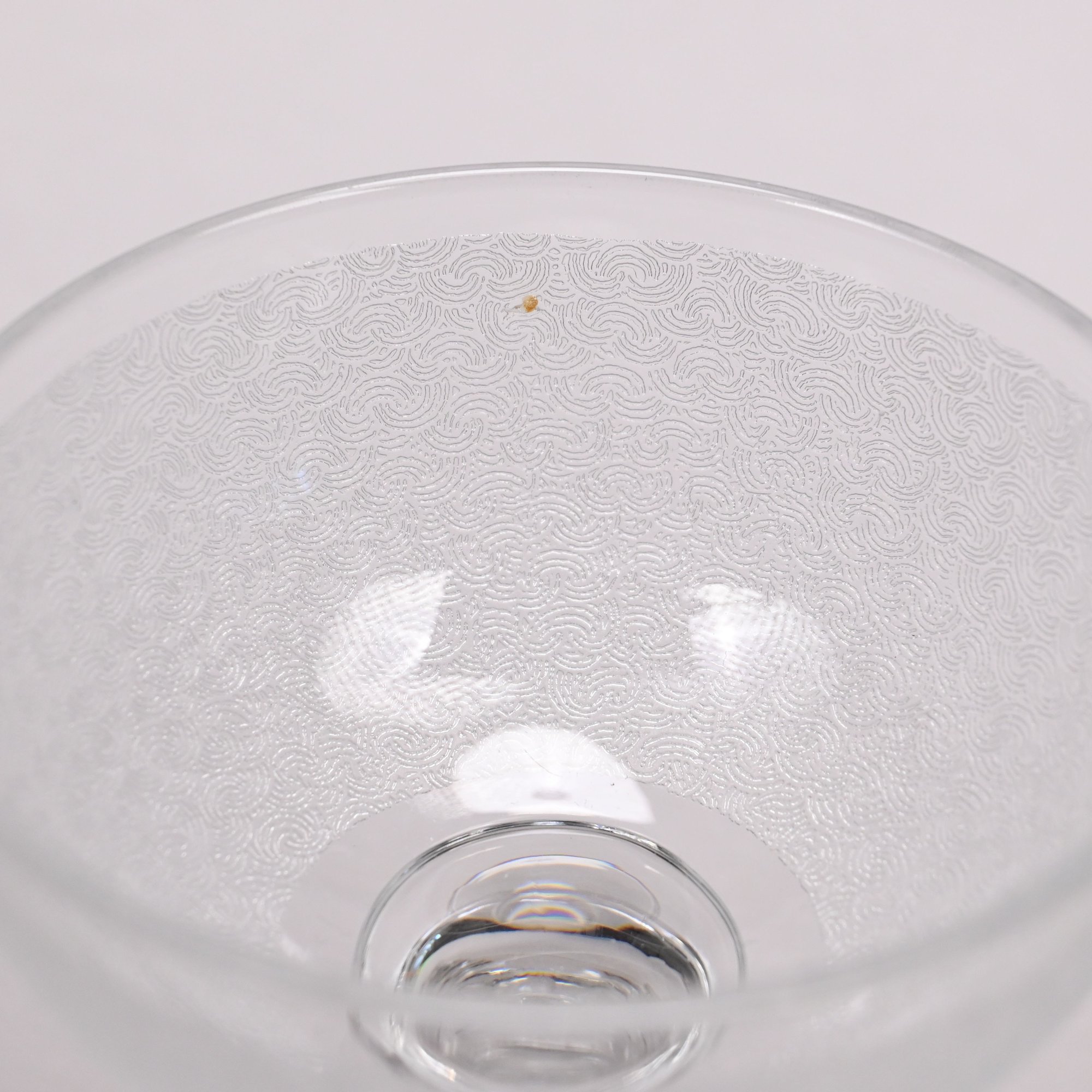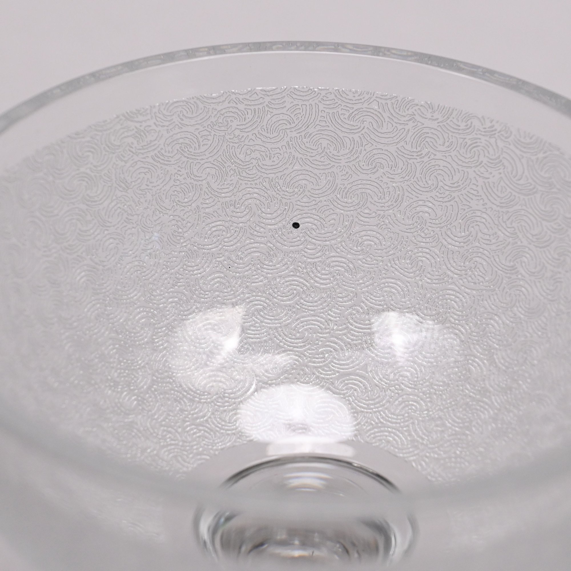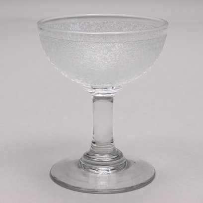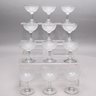 Set of Twelve Etched Colorless Glass Liquor Glasses, Probably French, 20th Century. Each bowl etched with tightly compacted scrolls.