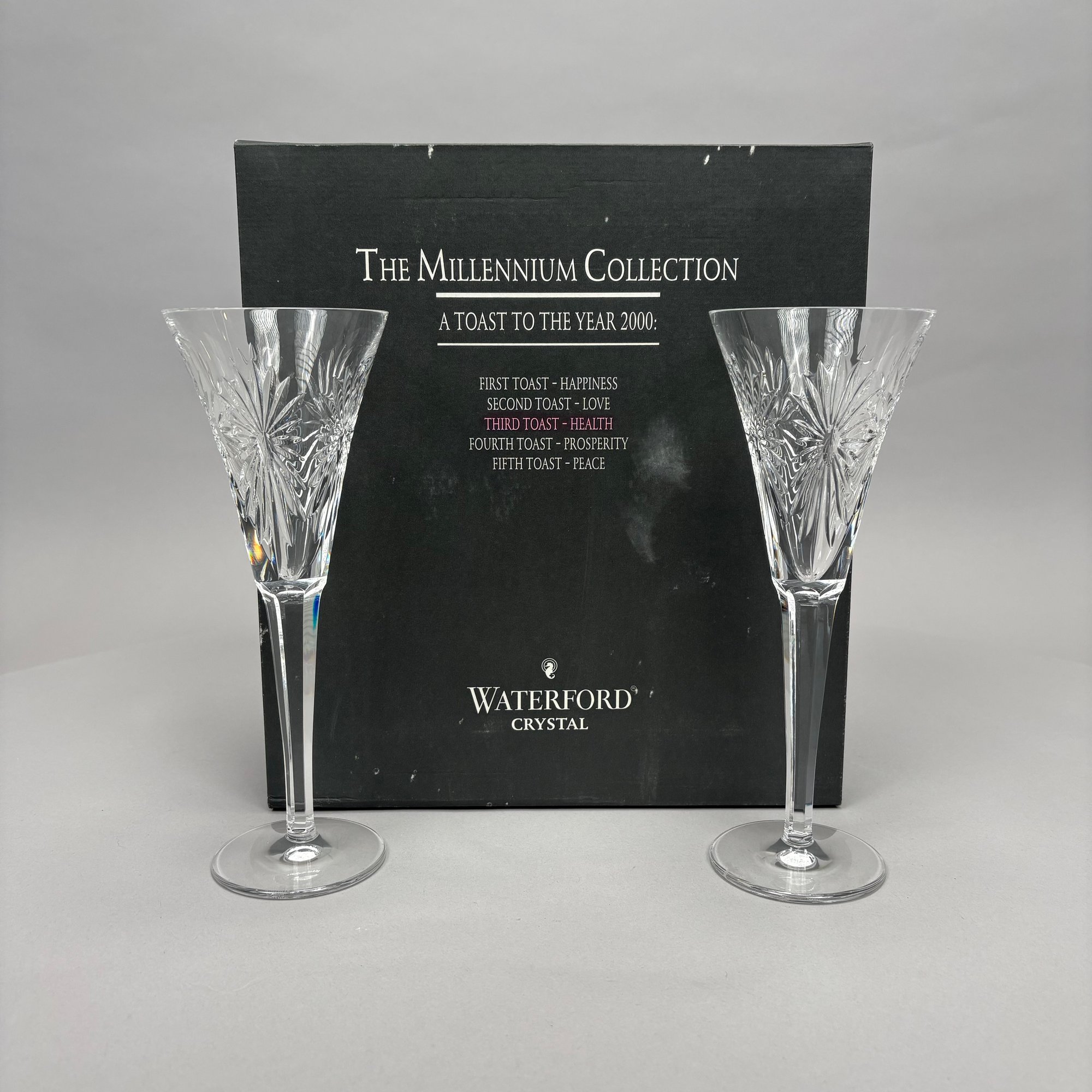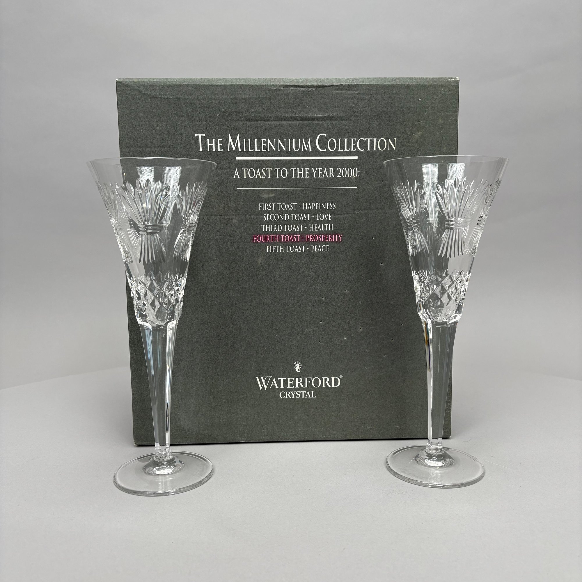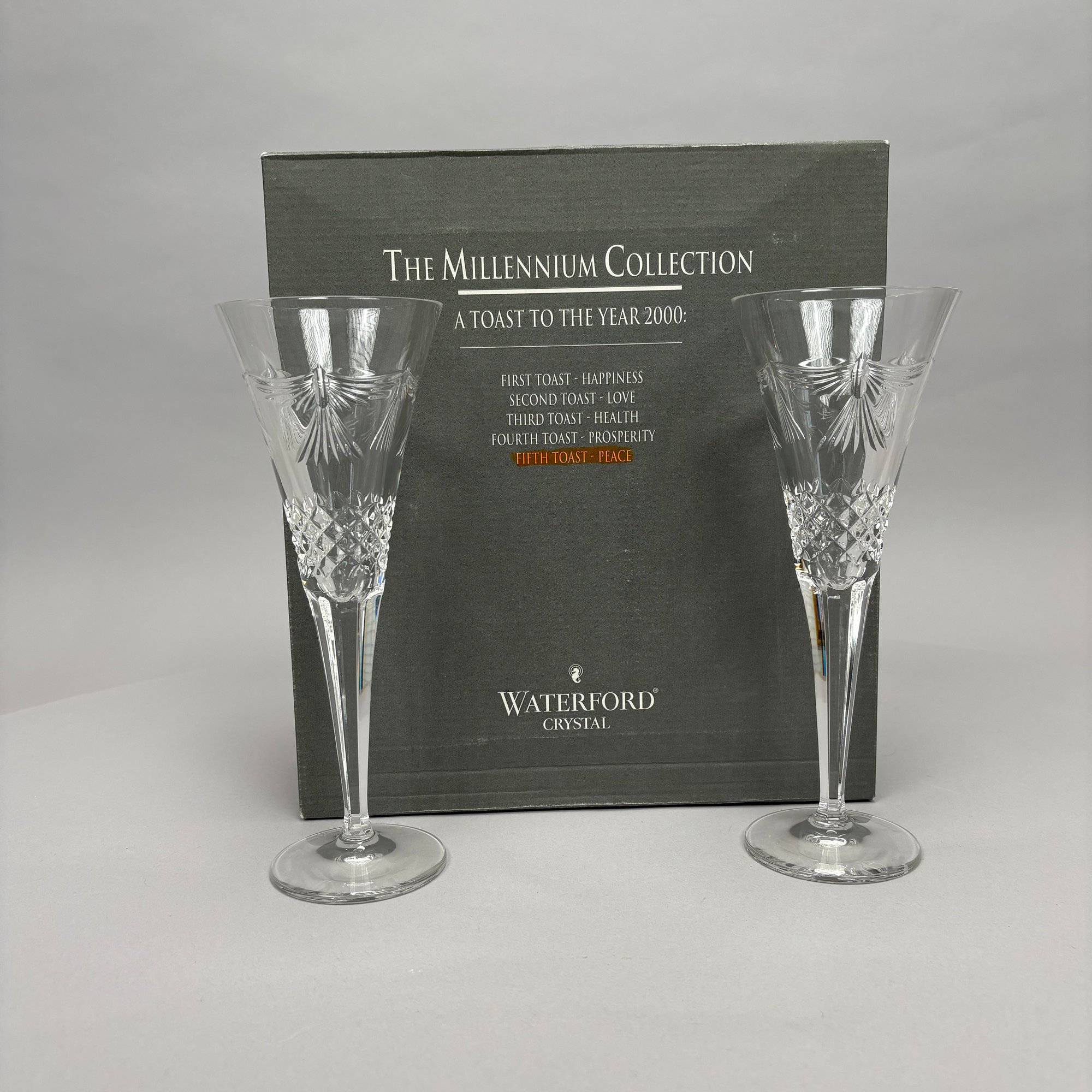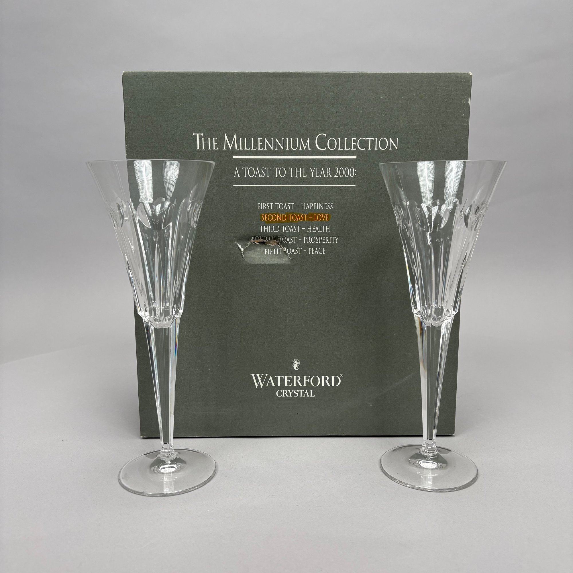 Set of twelve Waterford Crystal Millenium Collection toasting flutes celebrating the turn of the millenium. Comprising six pairs, each of five pairs with designs corresponding to five symbolic toasts; the final pair of flutes featuring all five designs.