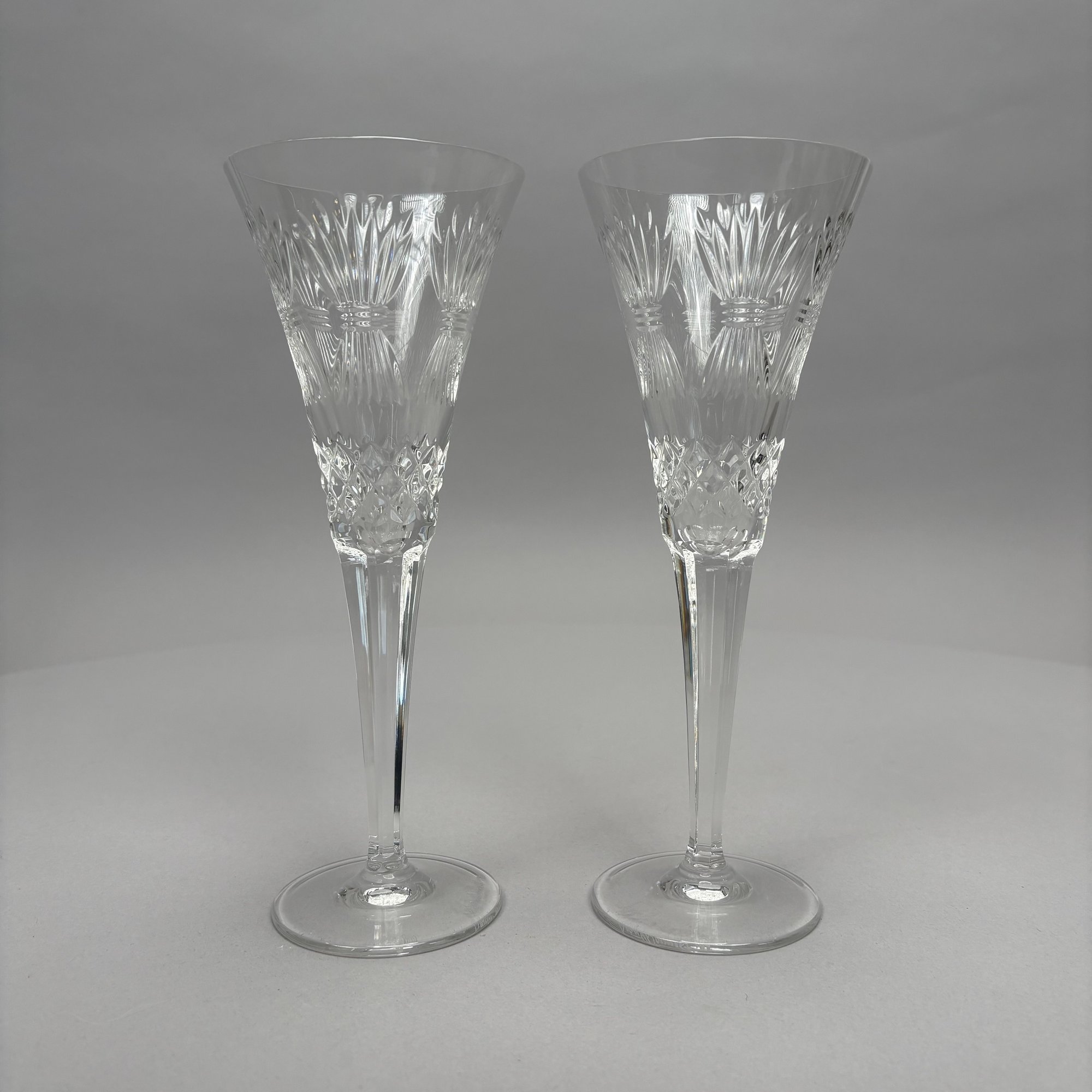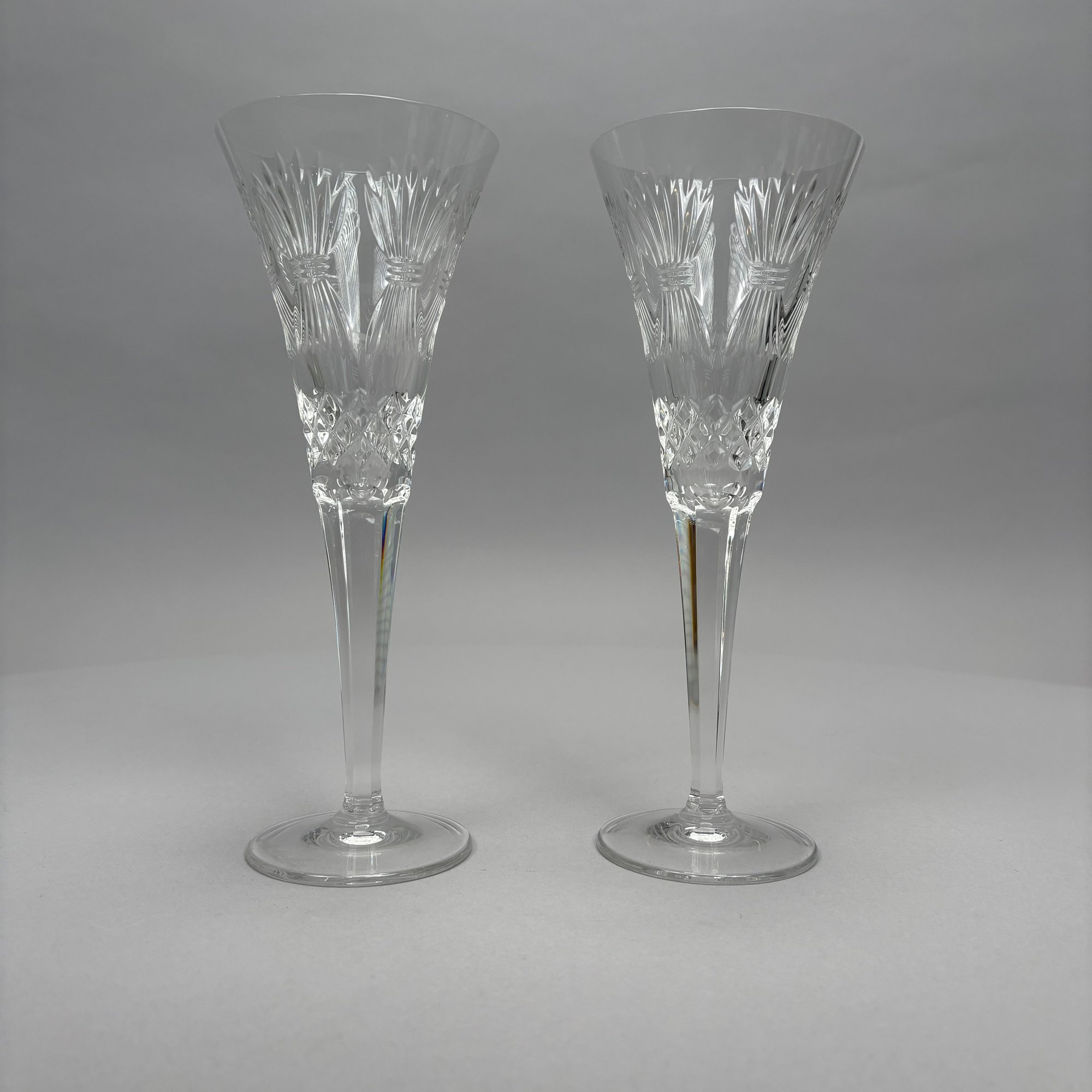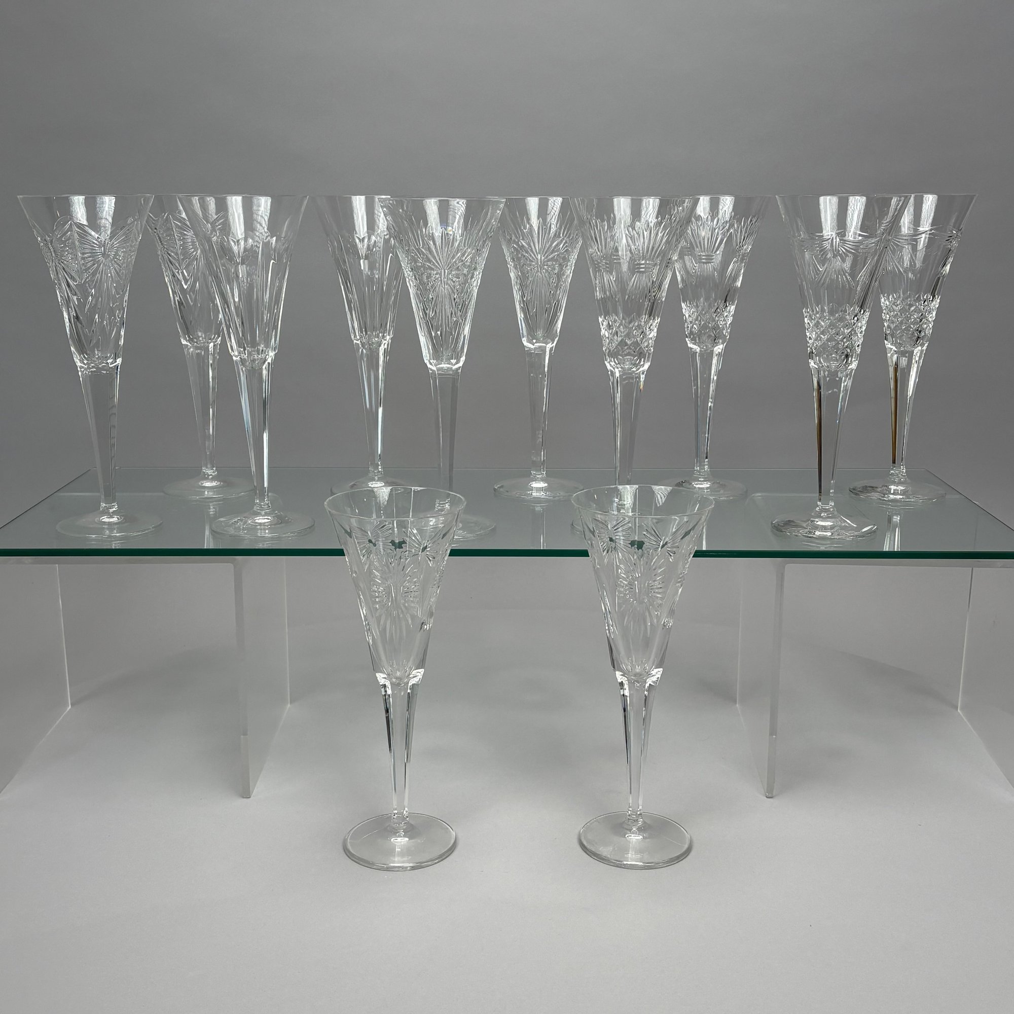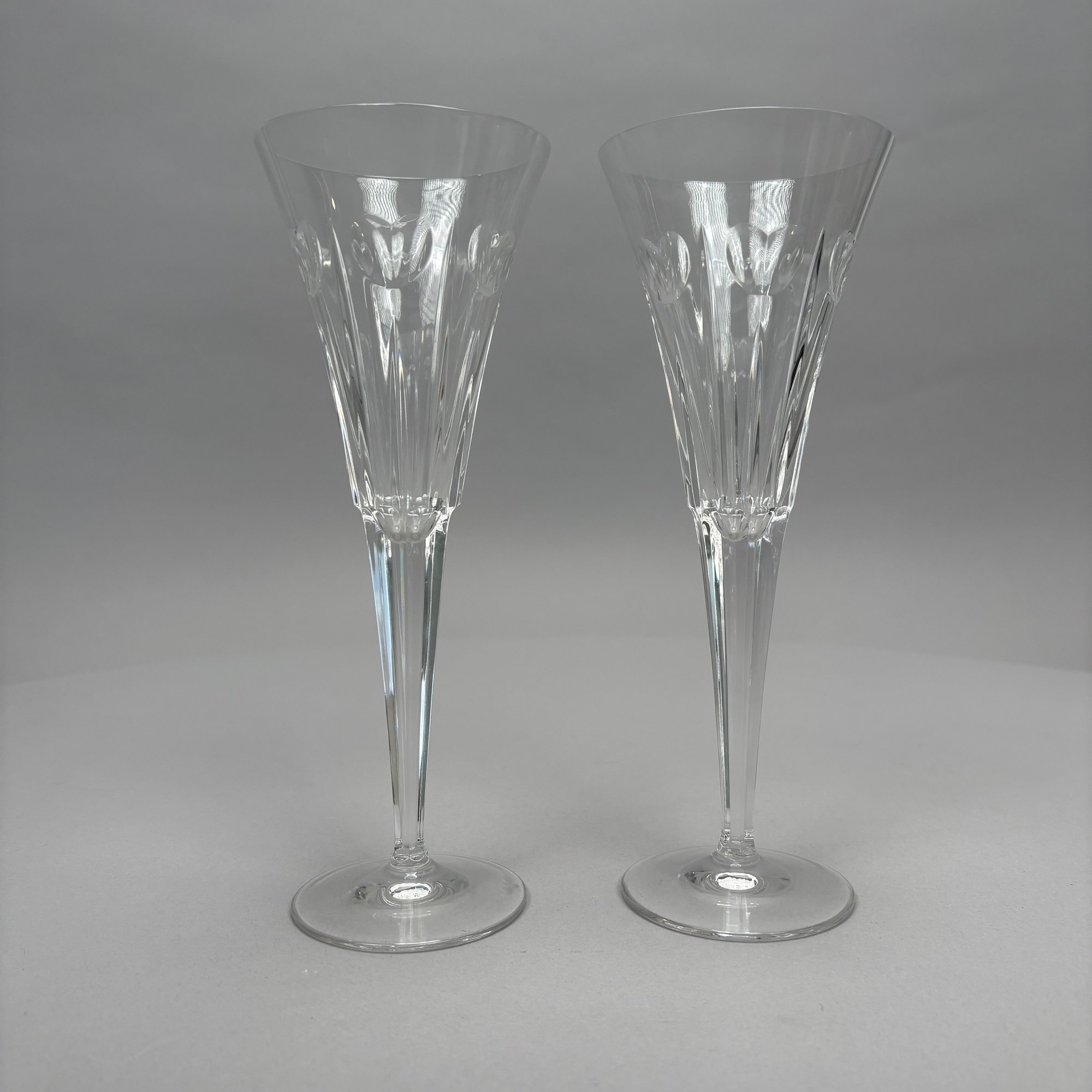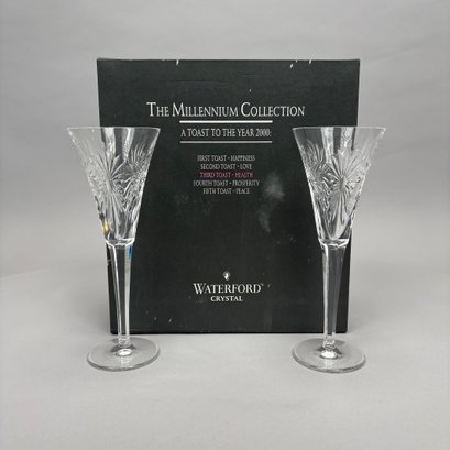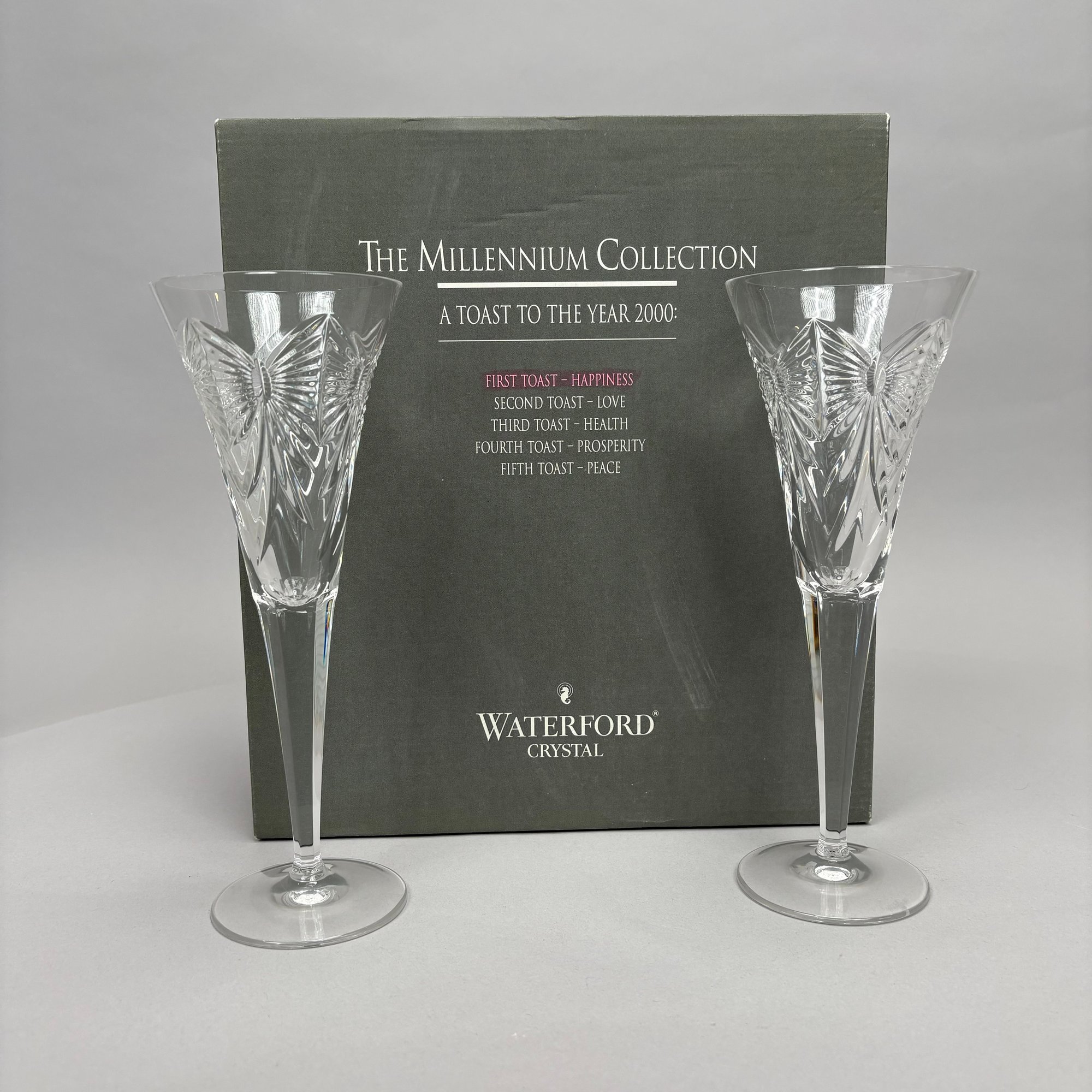 Set of twelve Waterford Crystal Millenium Collection toasting flutes celebrating the turn of the millenium. Comprising six pairs, each of five pairs with designs corresponding to five symbolic toasts; the final pair of flutes featuring all five designs.