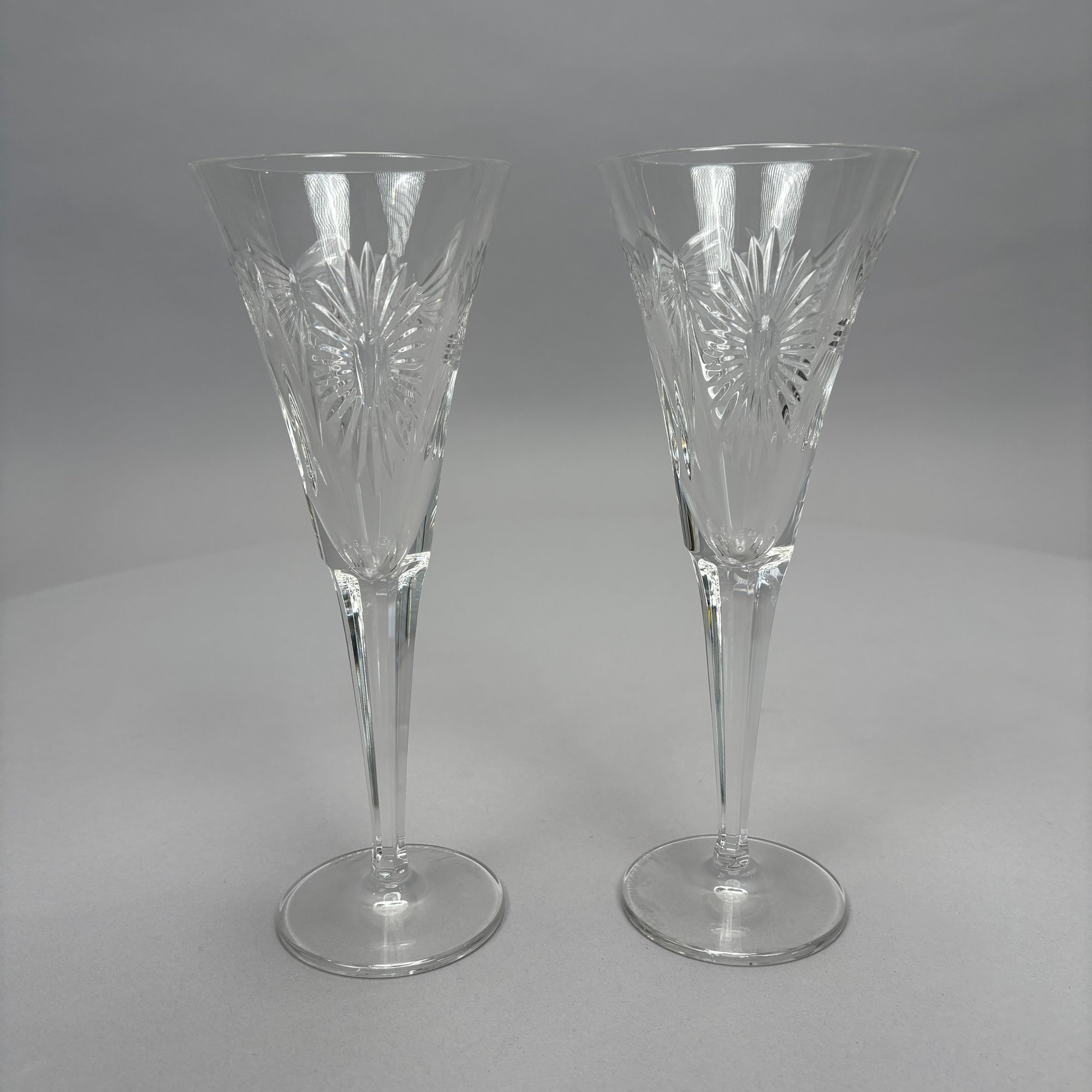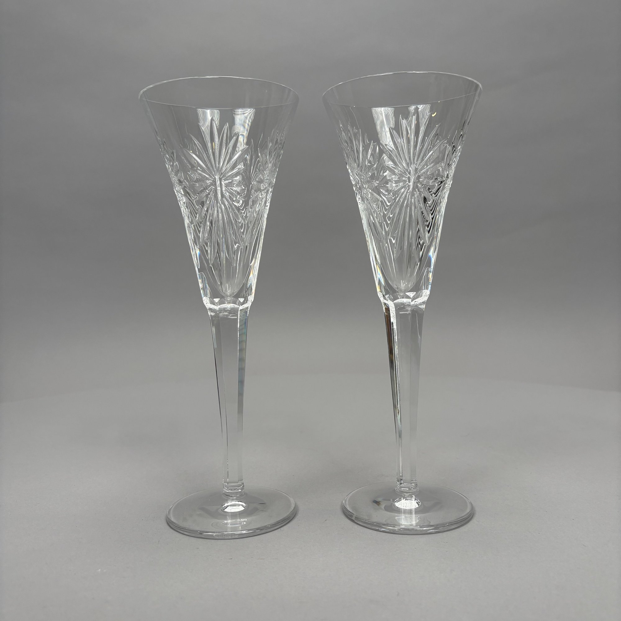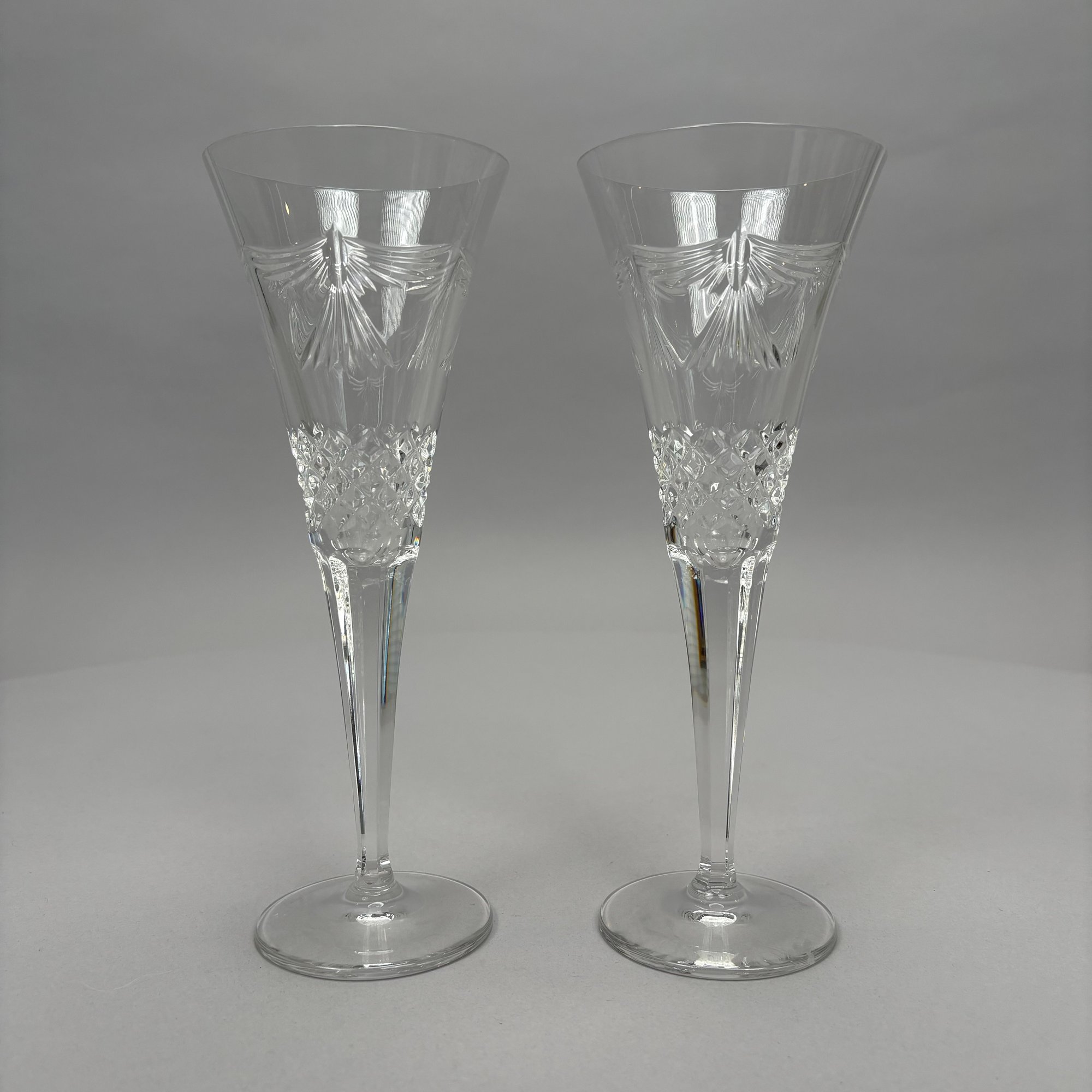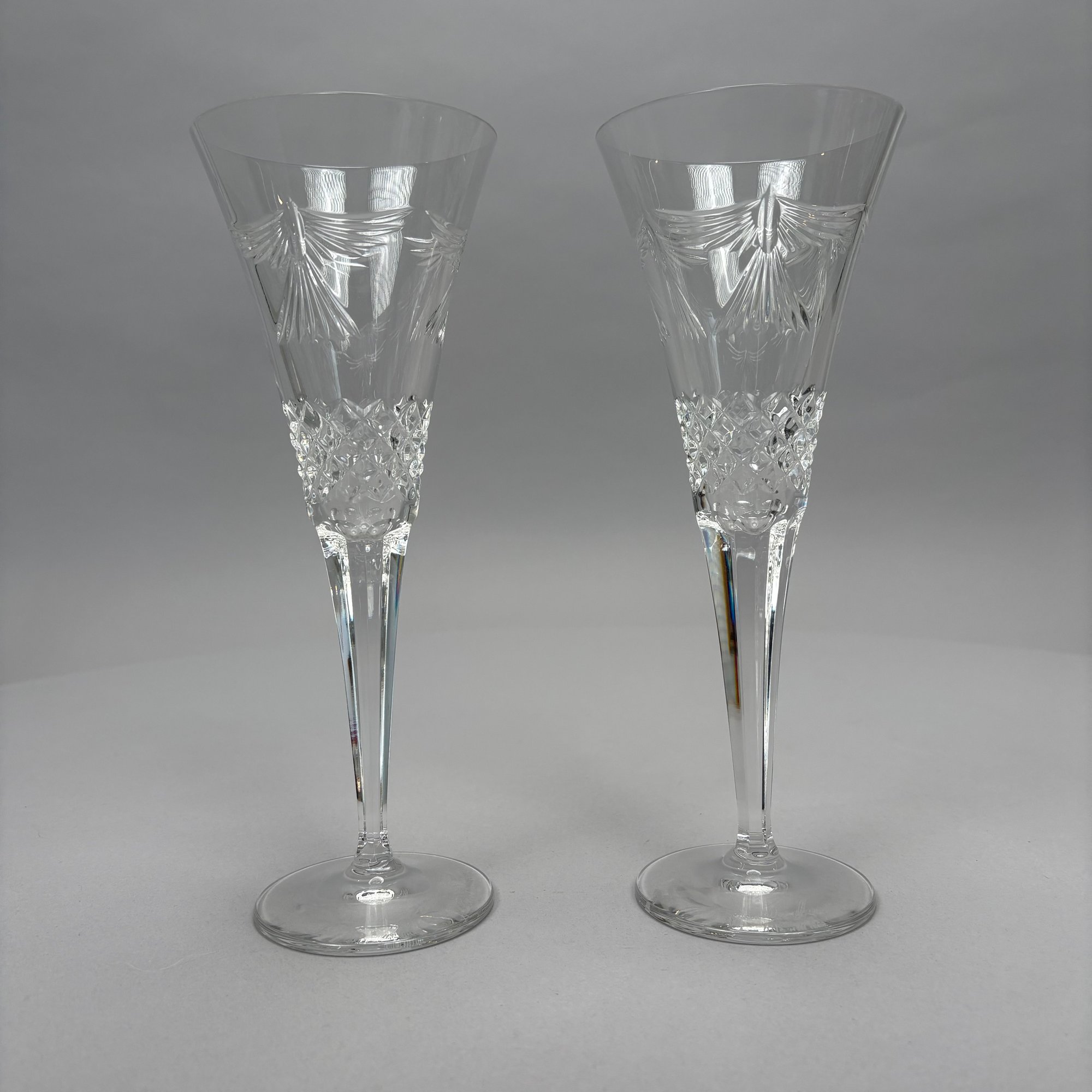Set of twelve Waterford Crystal Millenium Collection toasting flutes celebrating the turn of the millenium. Comprising six pairs, each of five pairs with designs corresponding to five symbolic toasts; the final pair of flutes featuring all five designs.
