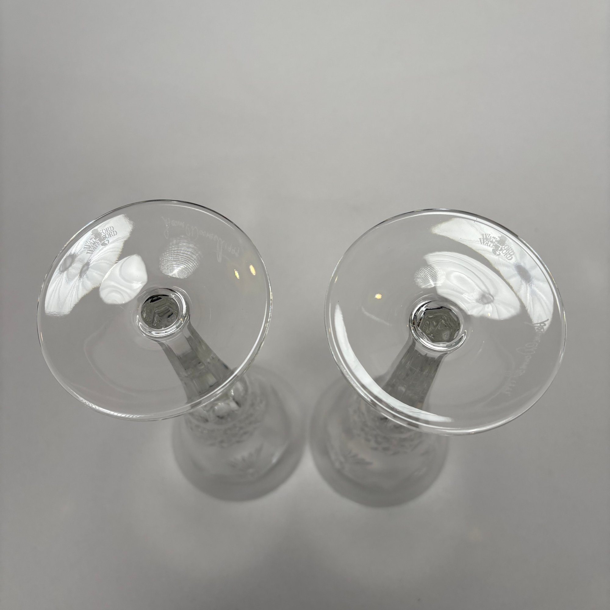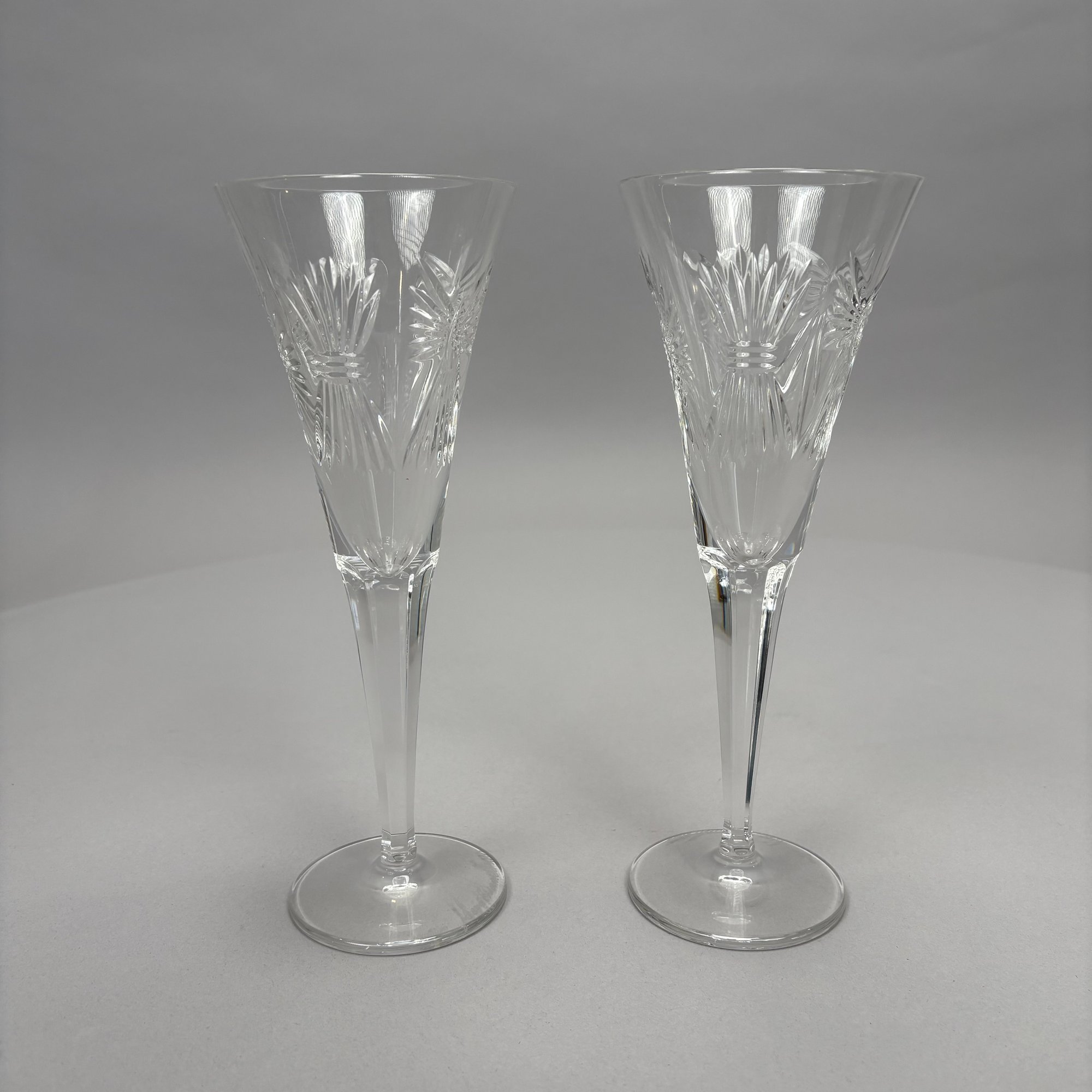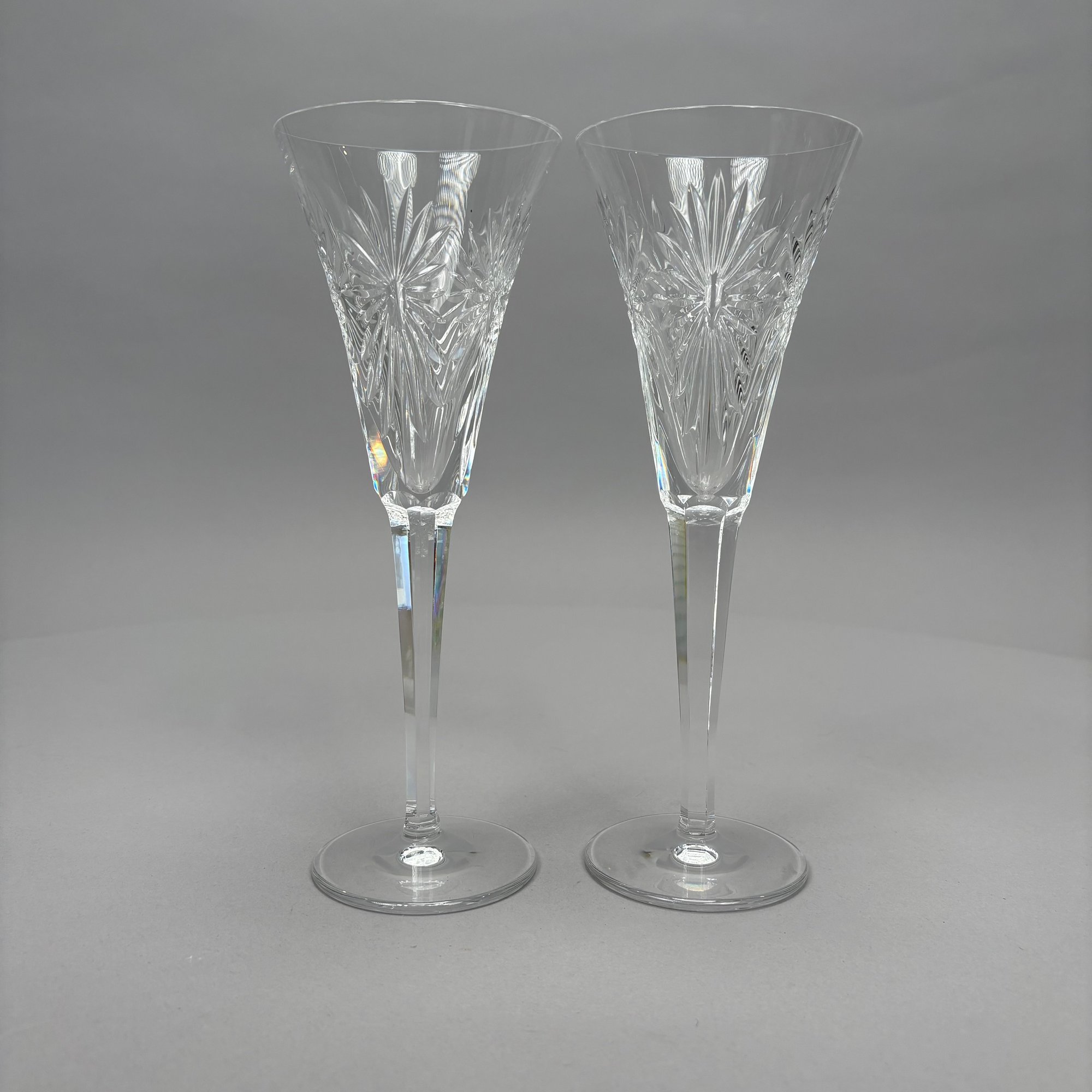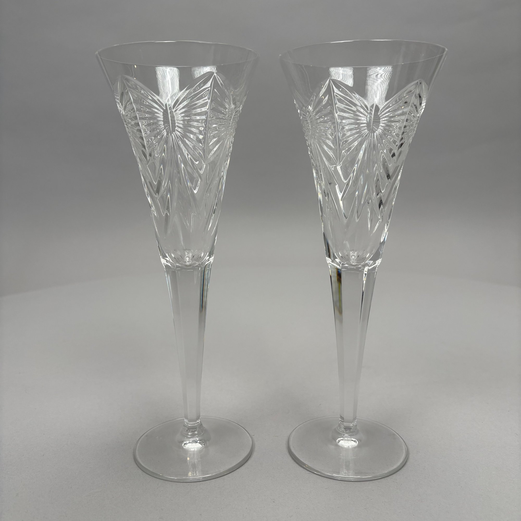 Set of twelve Waterford Crystal Millenium Collection toasting flutes celebrating the turn of the millenium. Comprising six pairs, each of five pairs with designs corresponding to five symbolic toasts; the final pair of flutes featuring all five designs.