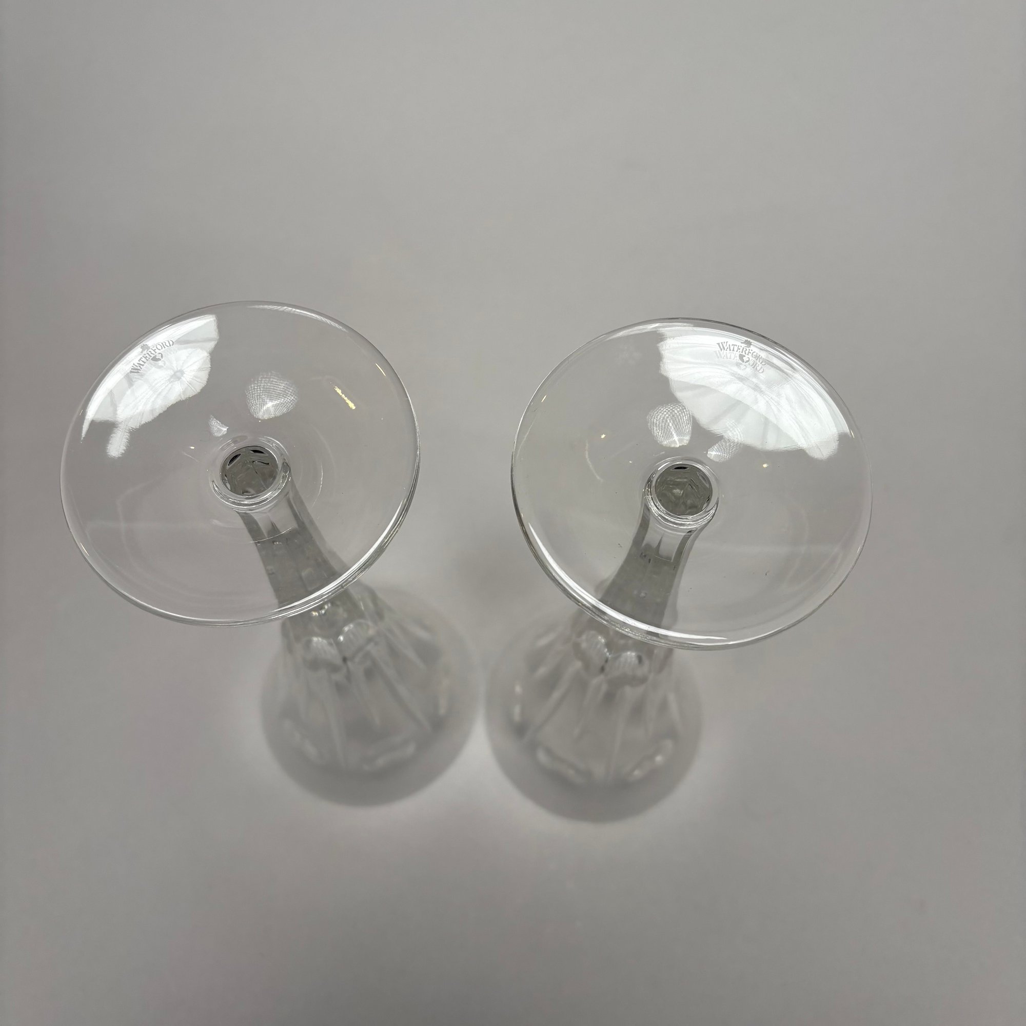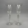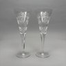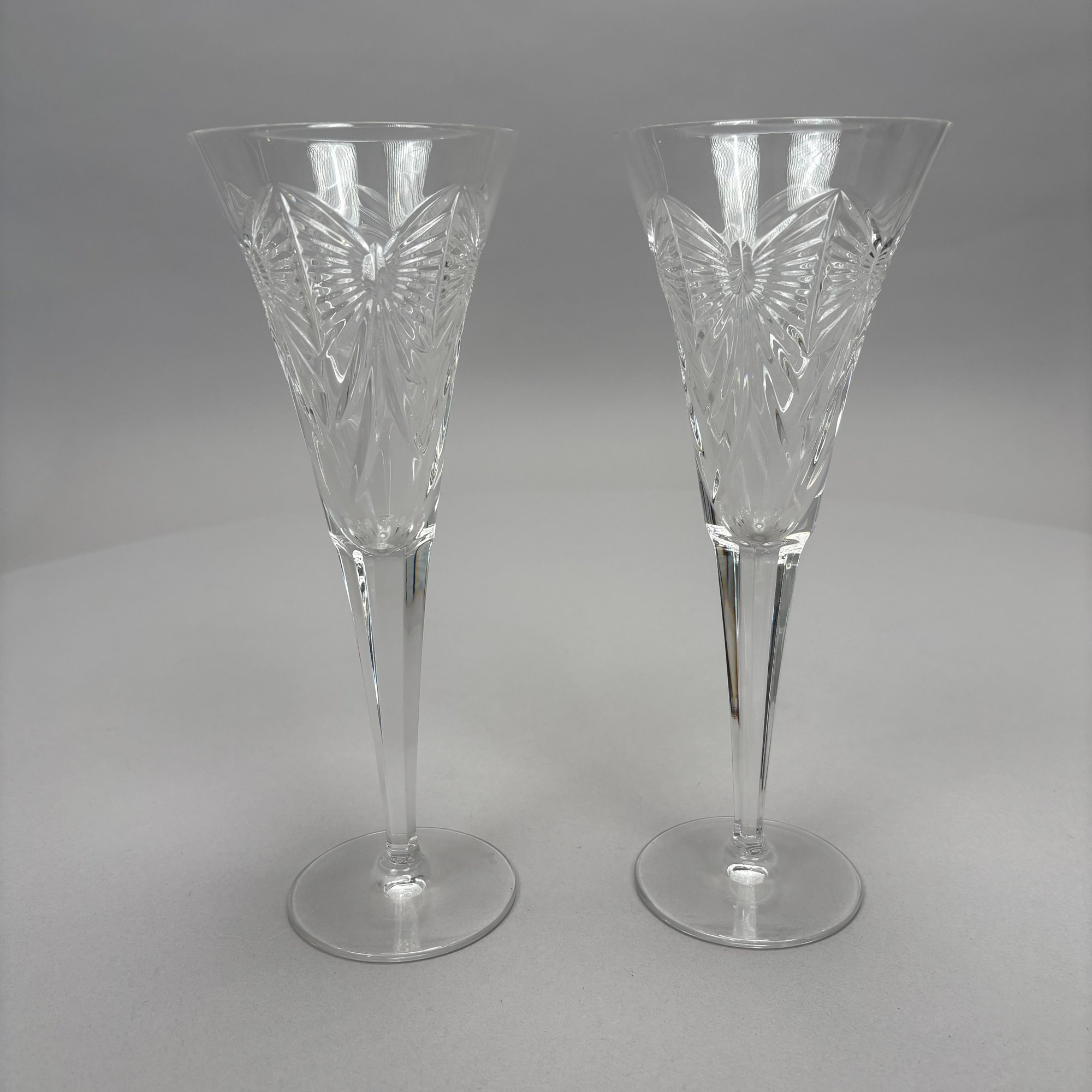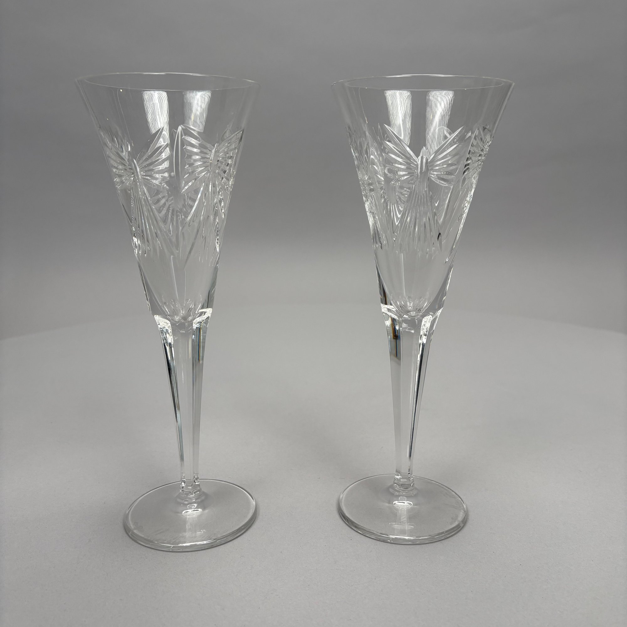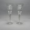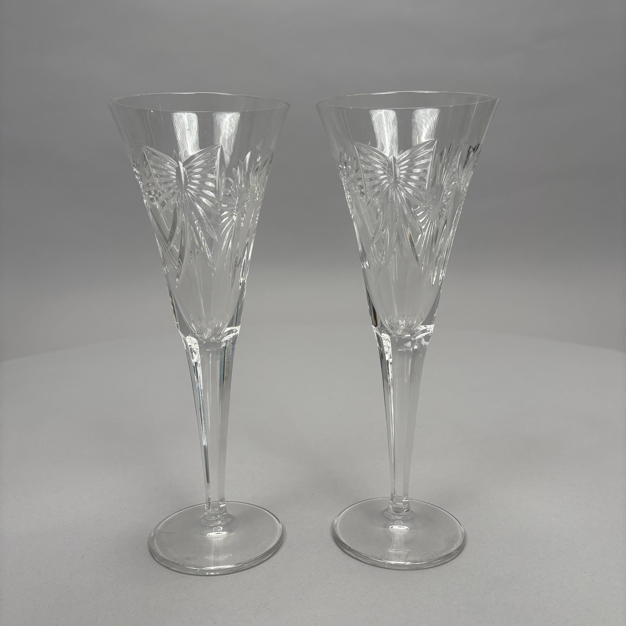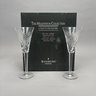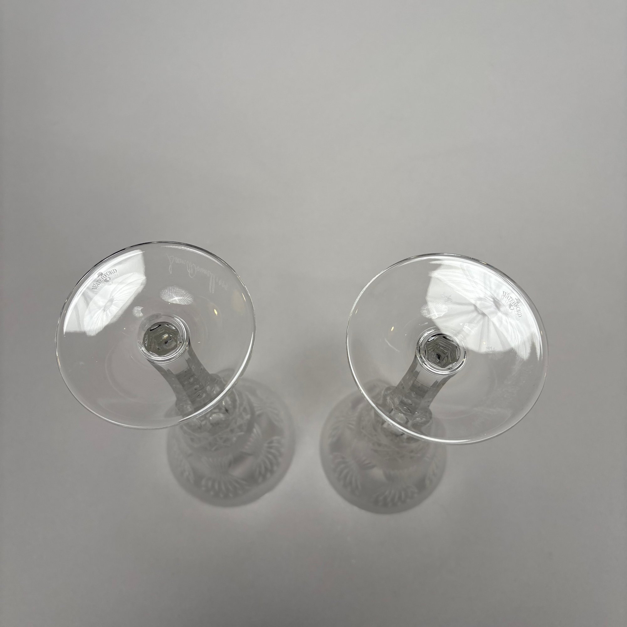 Set of twelve Waterford Crystal Millenium Collection toasting flutes celebrating the turn of the millenium. Comprising six pairs, each of five pairs with designs corresponding to five symbolic toasts; the final pair of flutes featuring all five designs.