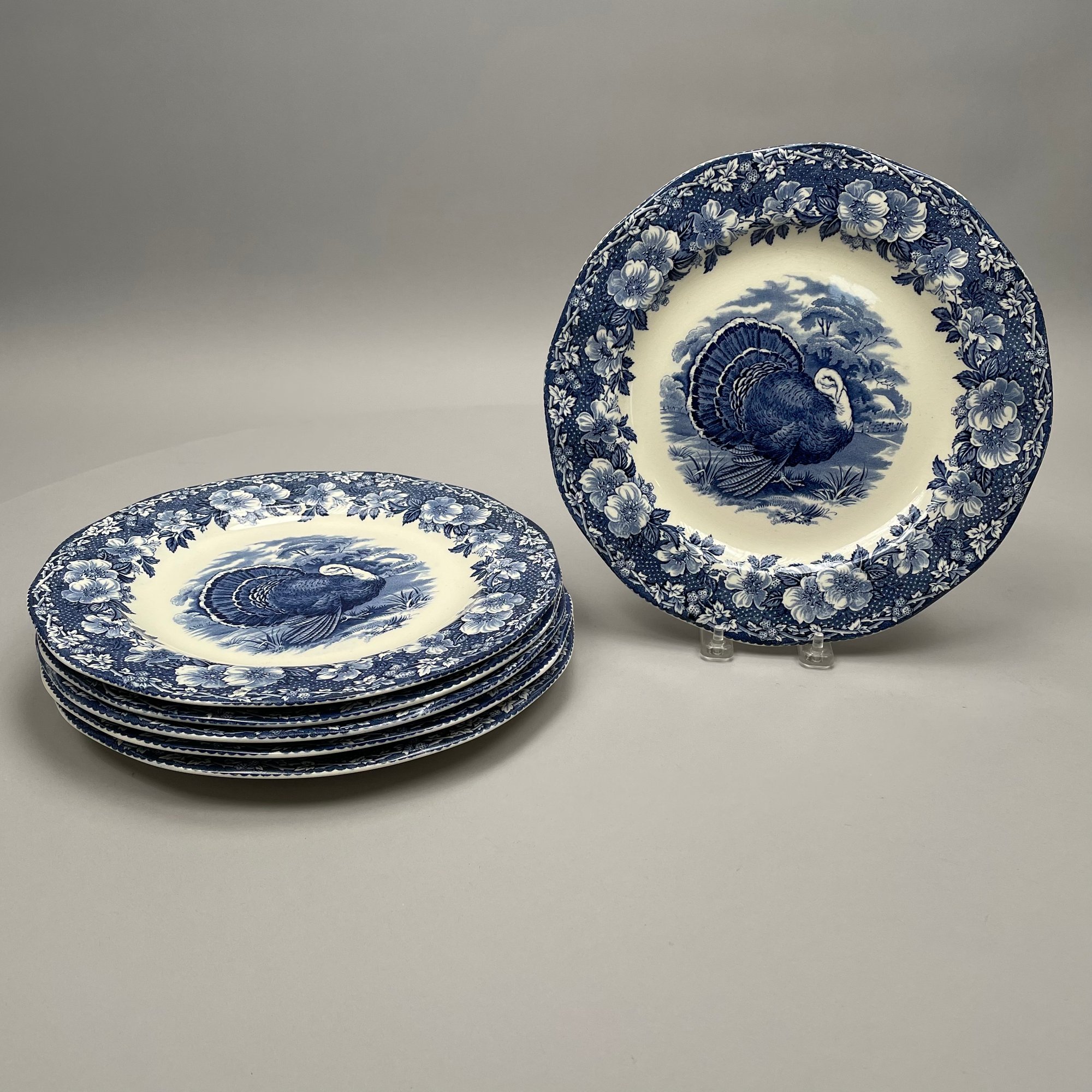 Set of Wedgwood & Co., Ltd. Blue Transfer-Printed 'Turkey' Pattern Plates, Early Twentieth Century. Comprising six 11.25 inch dinner plates and six 9.75 inch luncheon plates, each printed with the unicorn mark, "ENGLAND" and registration number "547269."