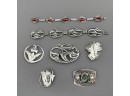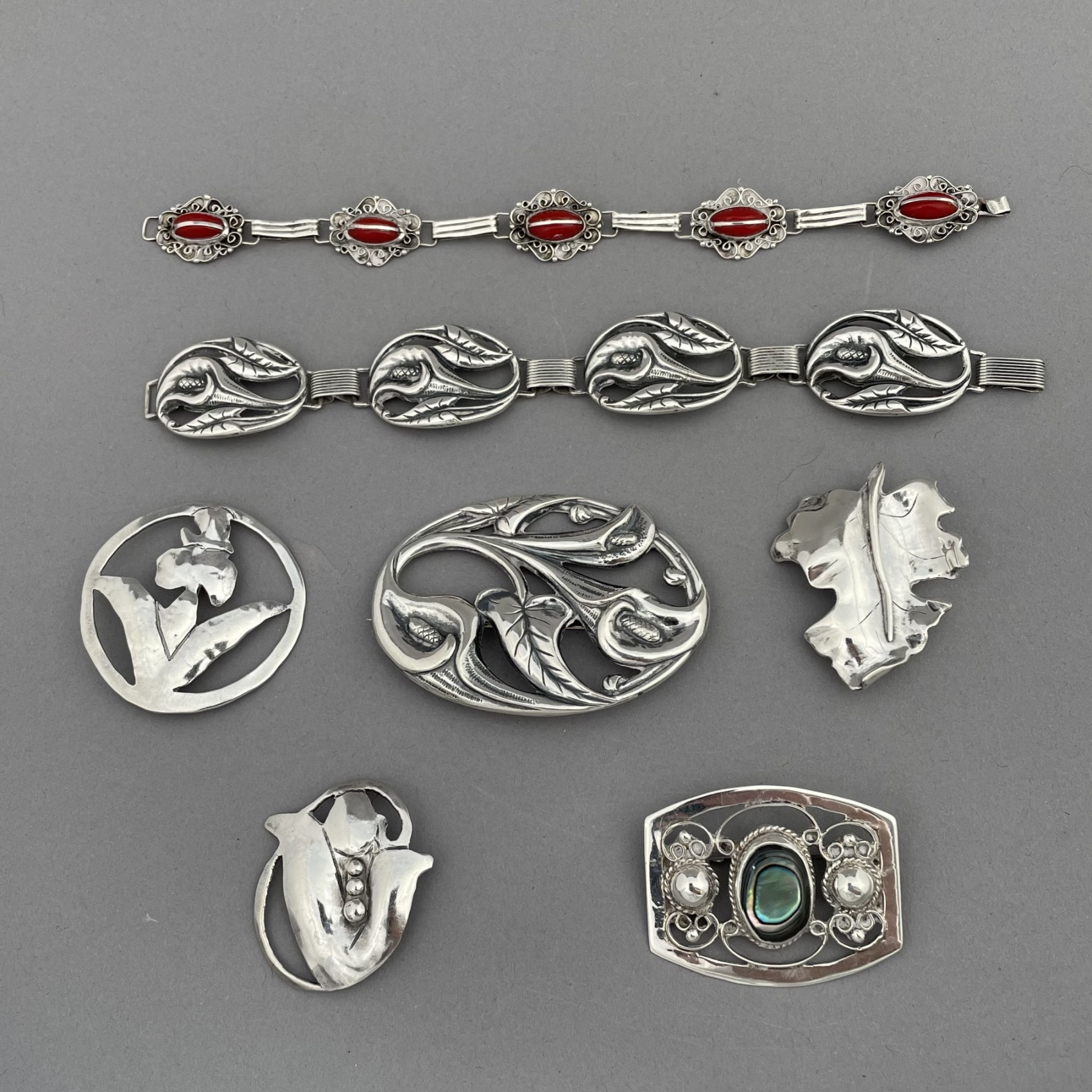 Comprising a Calla Lily pin and bracelet, two floral pins, a leaf pin, a brooch mounted with a stone, and a bracelet mounted with stones, various marks.