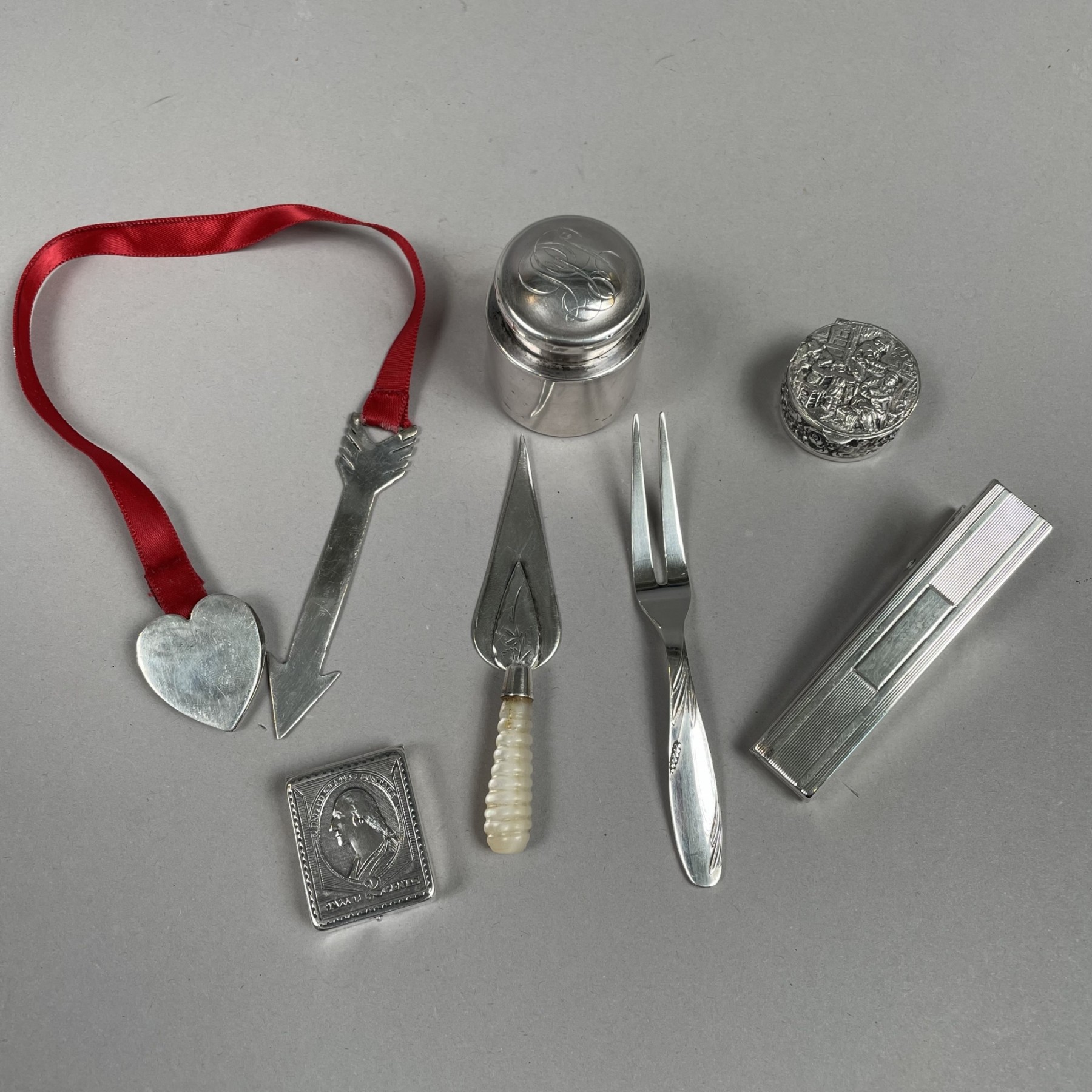 Comprising a stamp box, chased and repousse on the cover with a "TWO 2 CENTS" stamp, marked "u" and "STERLING;" an ink bottle, Whiting Mfg. Co., New York, New York, factory mark, "3037" and "STERLING;" a money clip, The Thomae Co., Attleboro, Massachusetts, factory cipher and "STERLING;" a 'Willow' pattern lemon fork, Gorham Mfg. Co., Providence, Rhode Island, 1954-1991, marked "GORHAM STERLING;" a trowel with plastic handle, marked "STERLING;" an arrow and heart, the arrow marked "STERLING;" and a German pill box, B. Nerescheimer & Sons, Hanau, after 1903, marked "GERMANY, psuedo hallmark, 925 and STERLING."