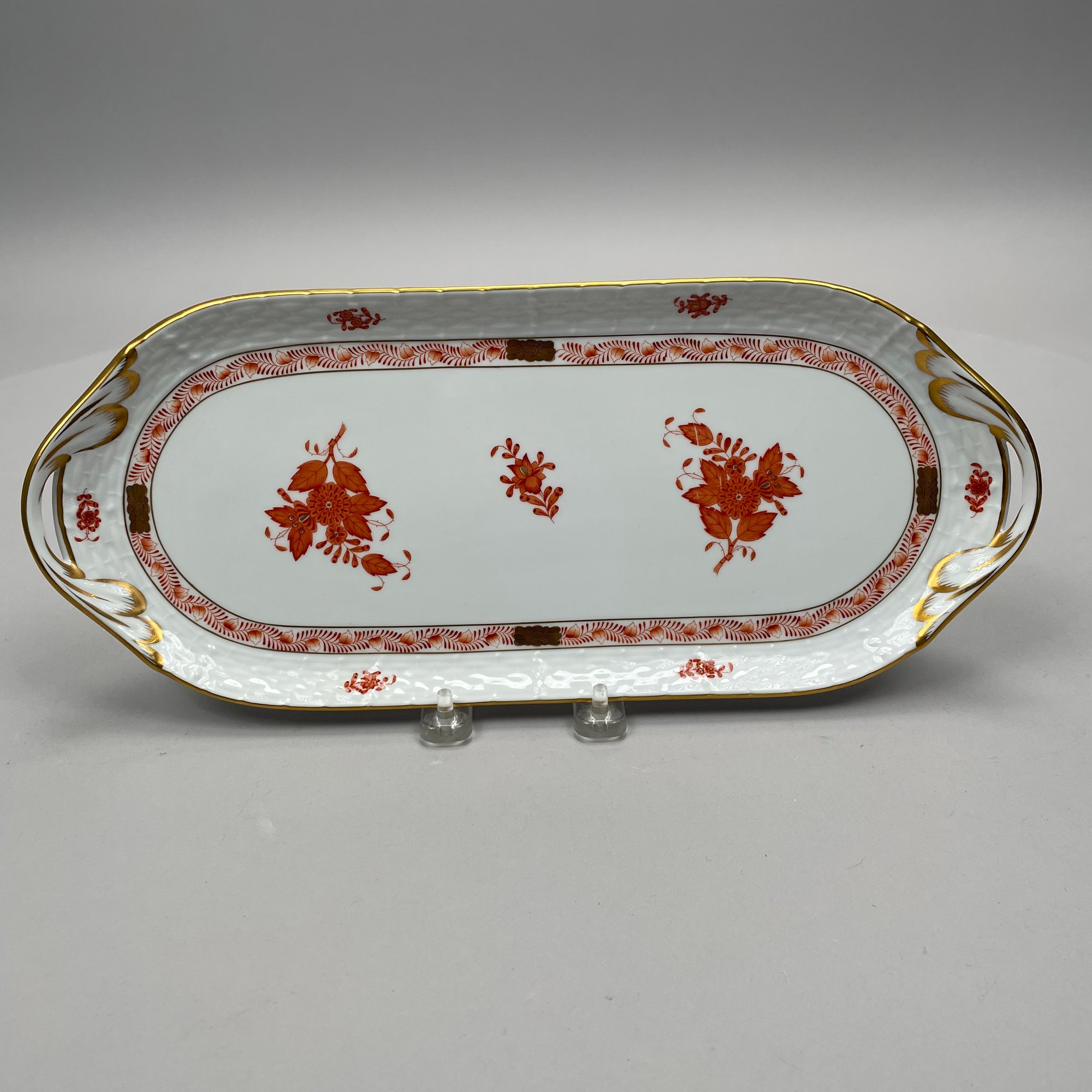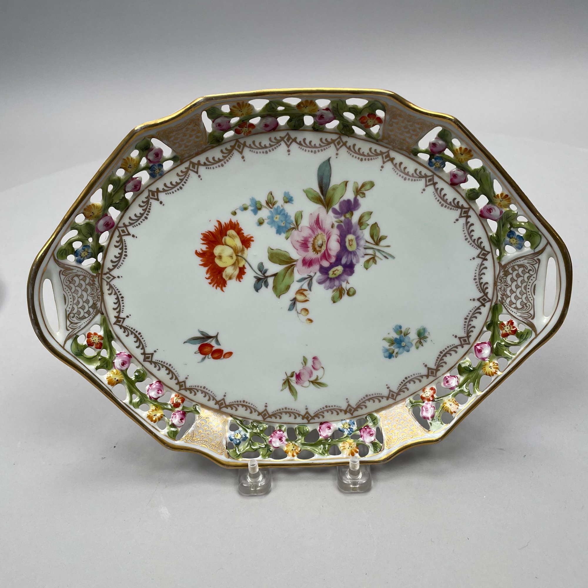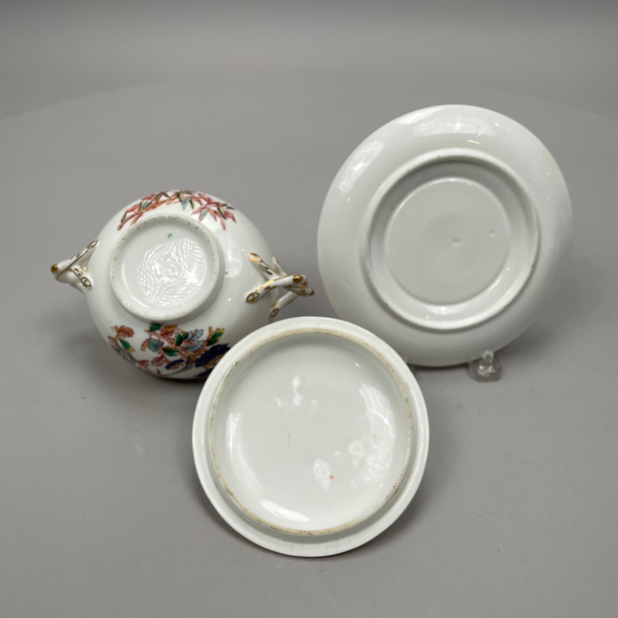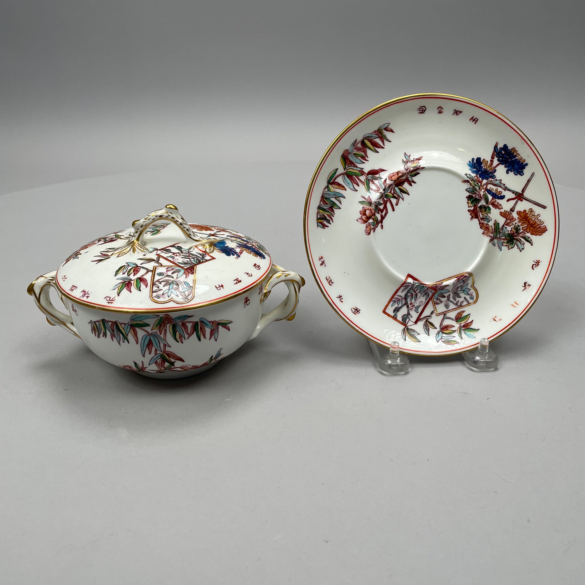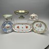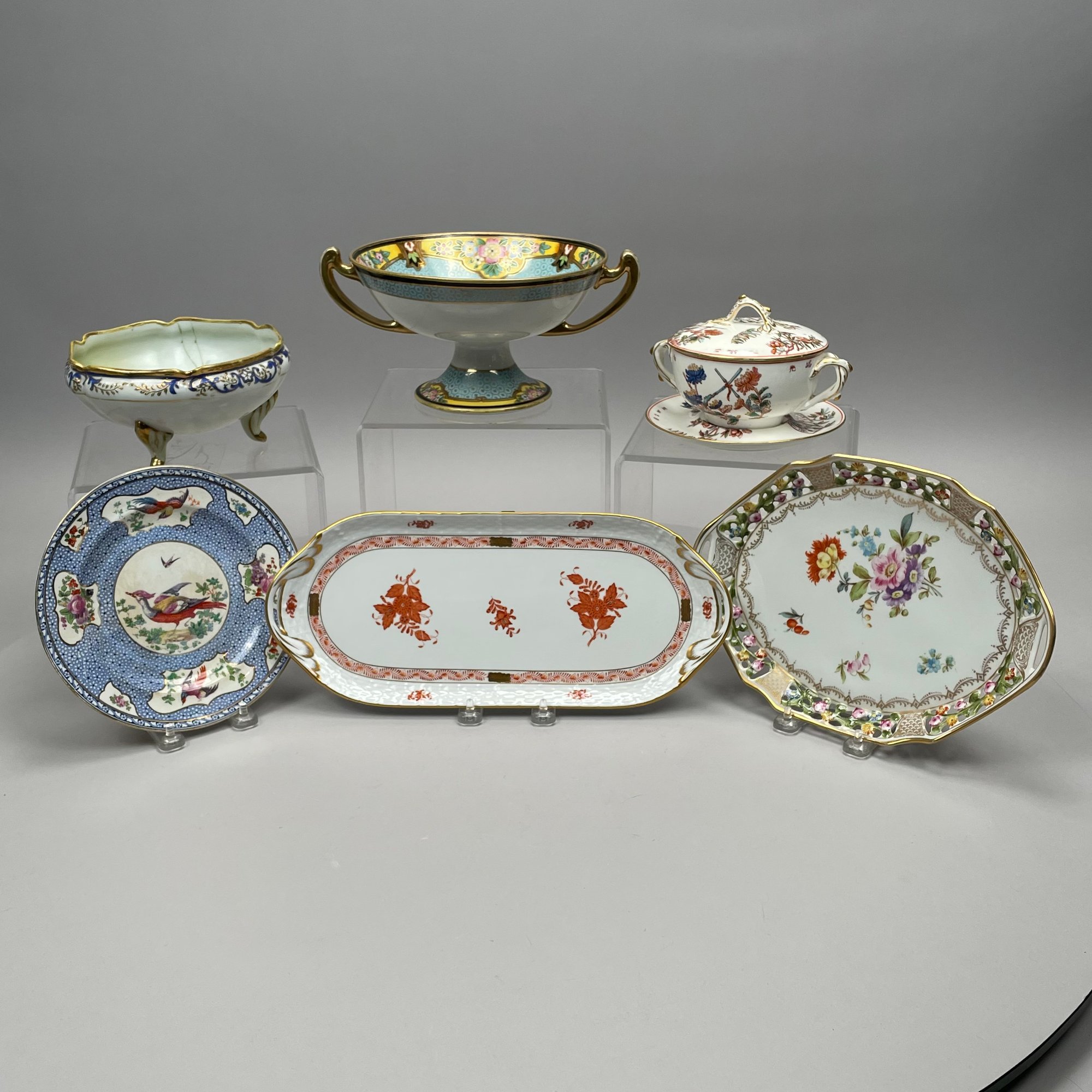 Seven Continental Painted and Printed Porcelain Wares, Twentieth Century. Comprising an iron-red 'Chinese Bouquet' tray, Herend Porcelain Co.; a Bavarian tray, Retsch & Co.; a Nippon two handled pedestal bowl and a handpainted bowl, after 1911; a Staffordshire 'Mosaic Panel' plate, Booth's Ltd., each with printed mark; and a covered bowl and liner in an Aesthetic Movement pattern, unmarked.