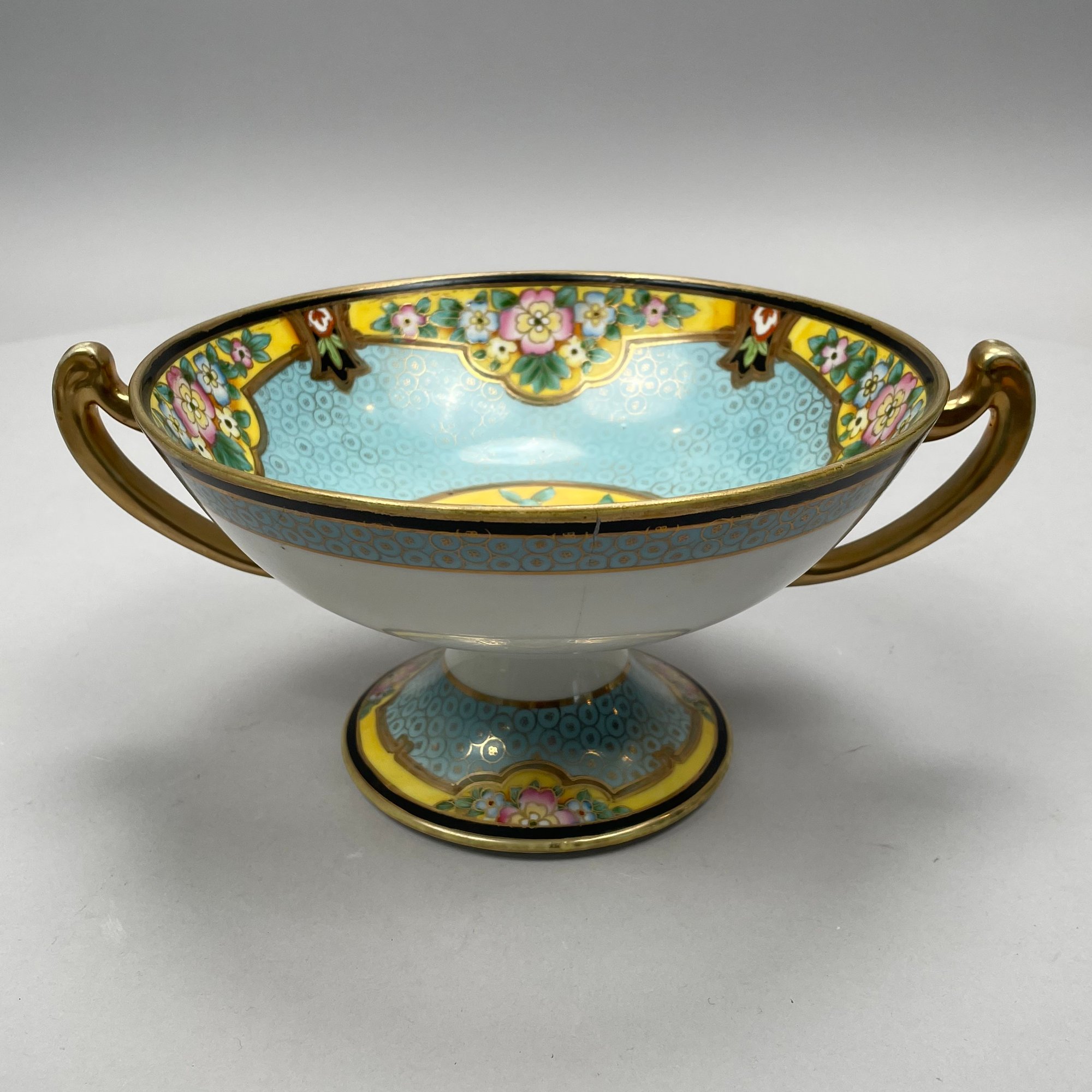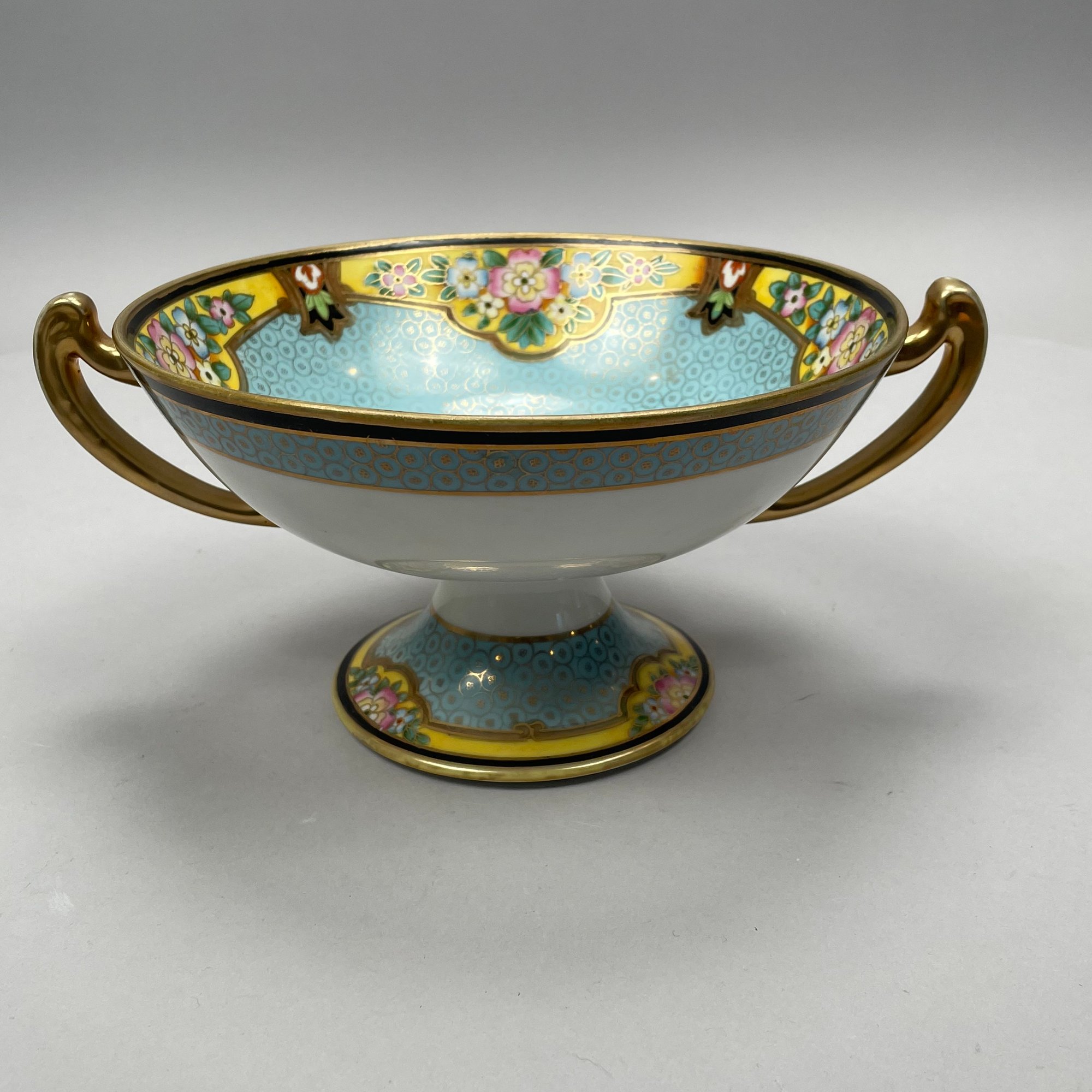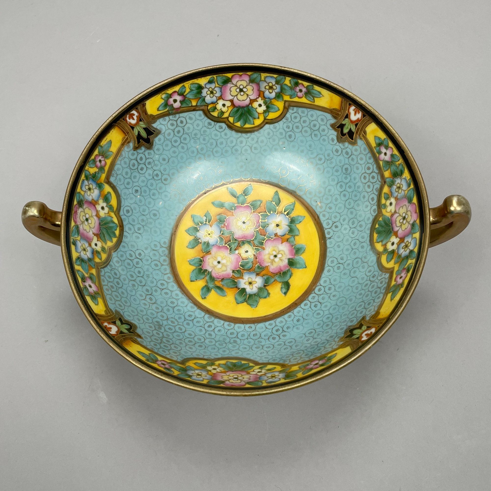 Two-handled bowl: H: 4.75 in., W: 10.25 in., D: 8.25 in.