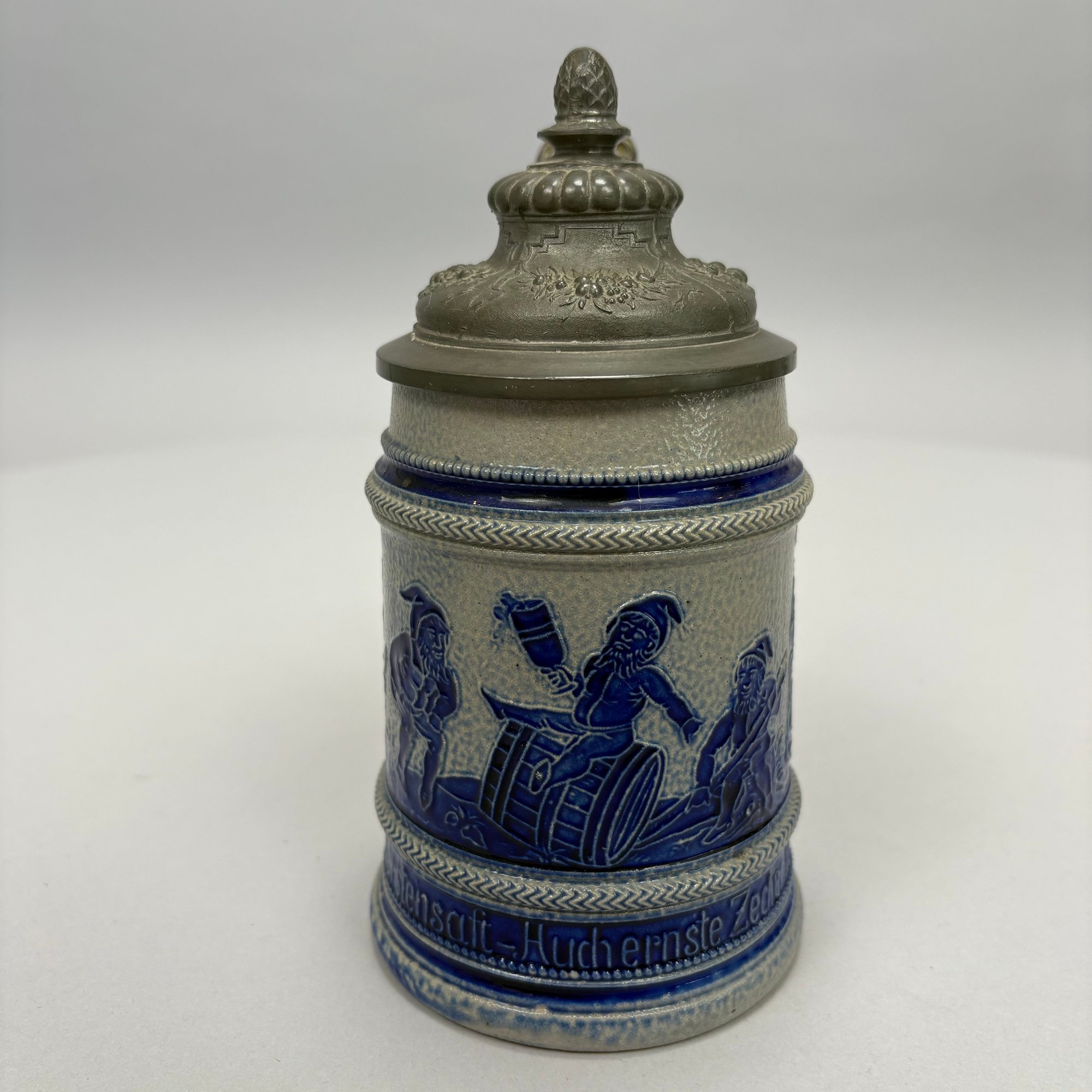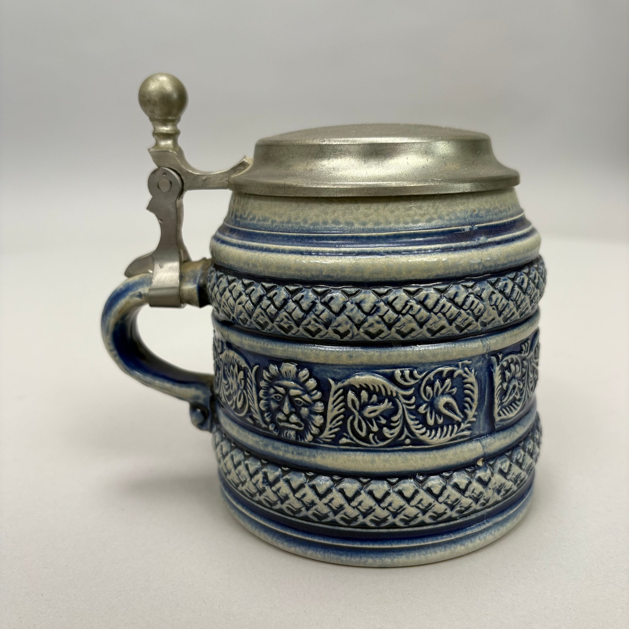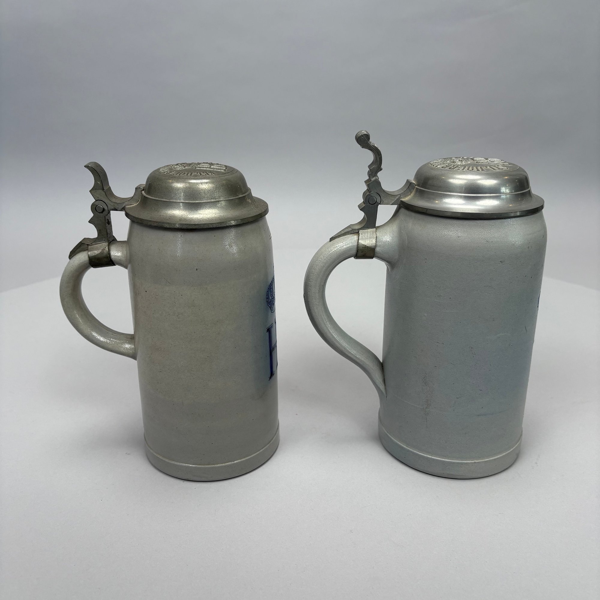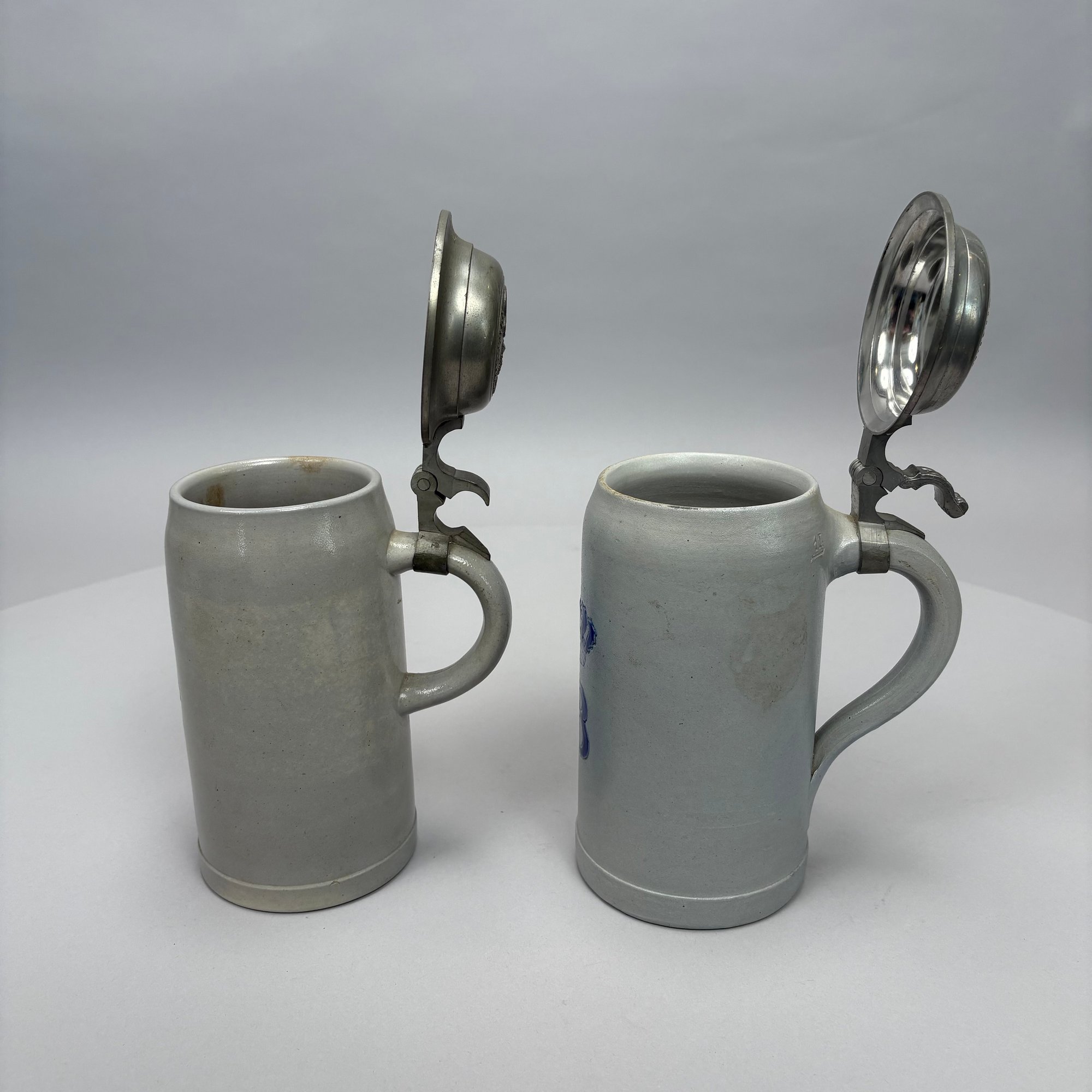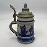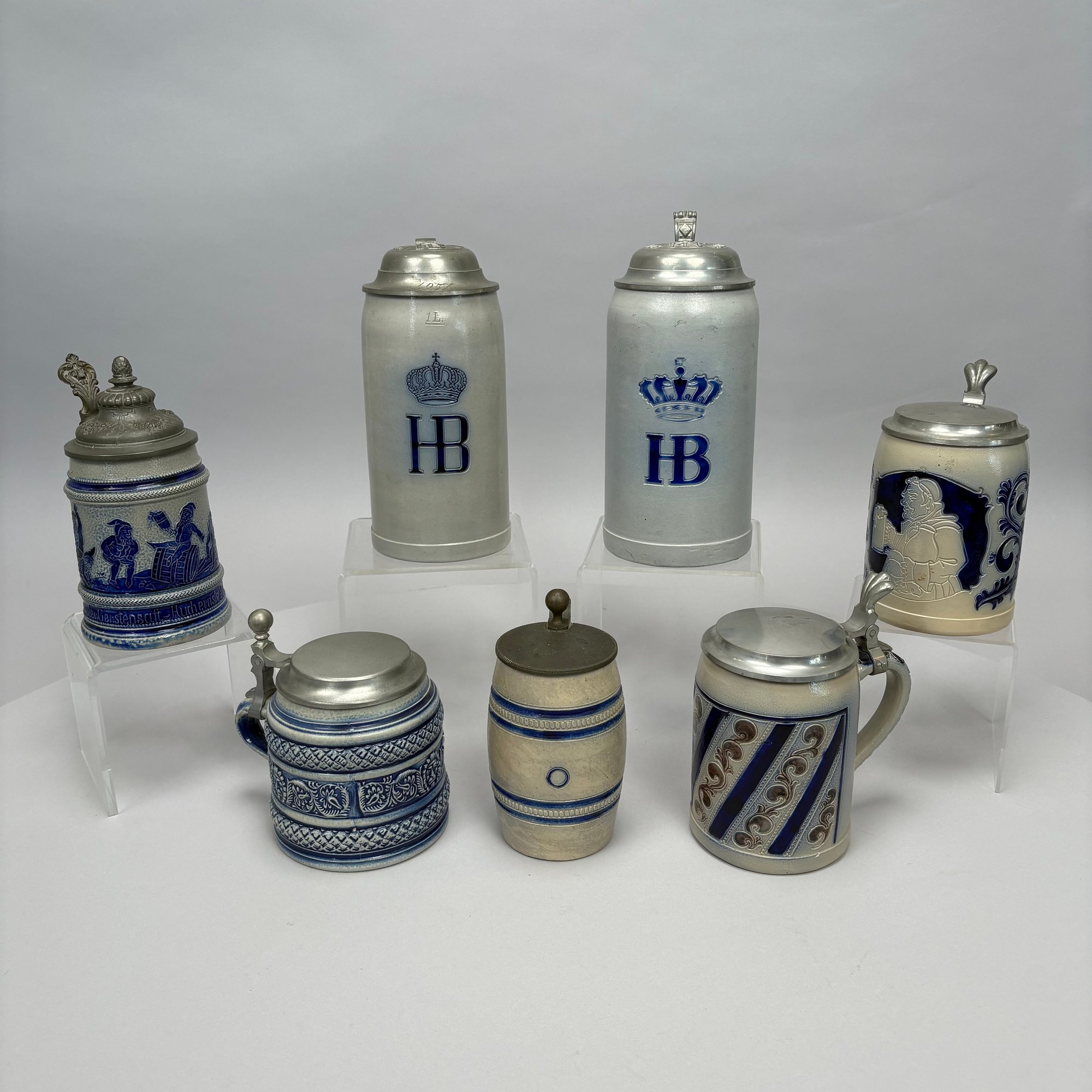 Seven German Cobalt Blue-Decorated Saltglaze Stoneware Steins with Pewter Lids, Late 19th-20th Century. Including impressed marks for "A.K," "ECHT/ SALZGLASIERT," "GERZ/ W. GERMANY" and "R. MERKELBACH GRENZHAUSEN."