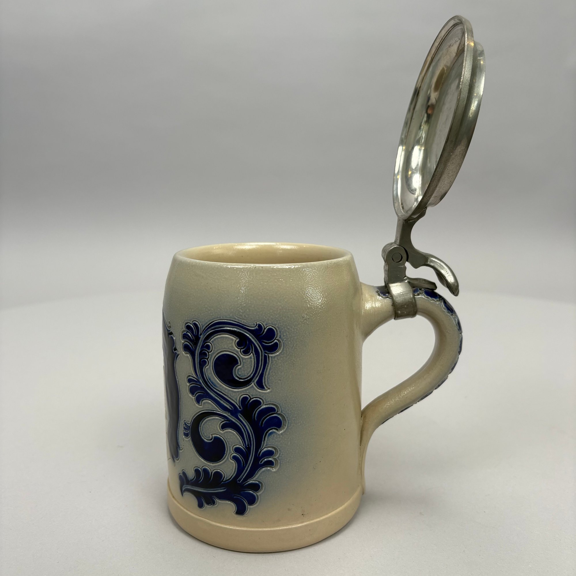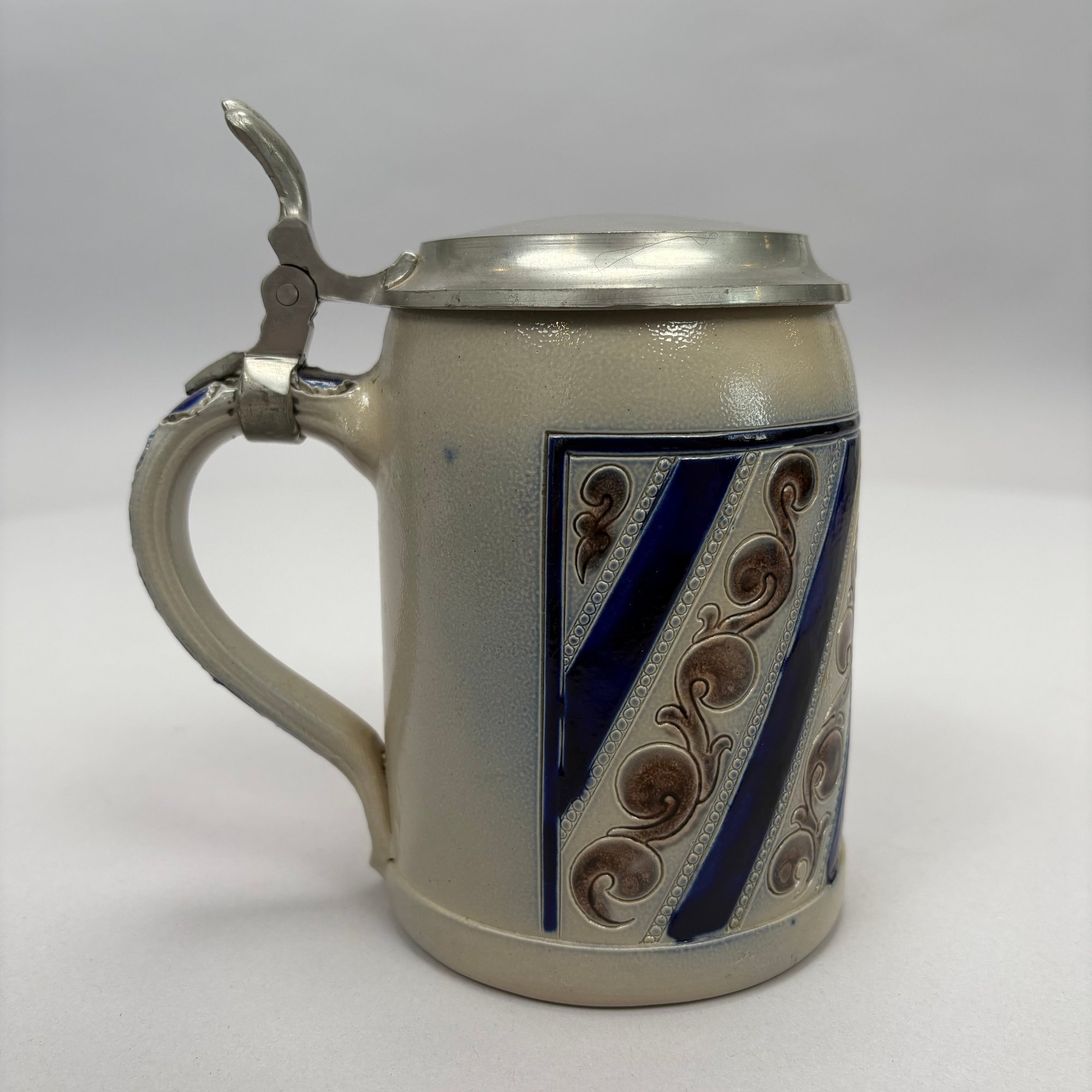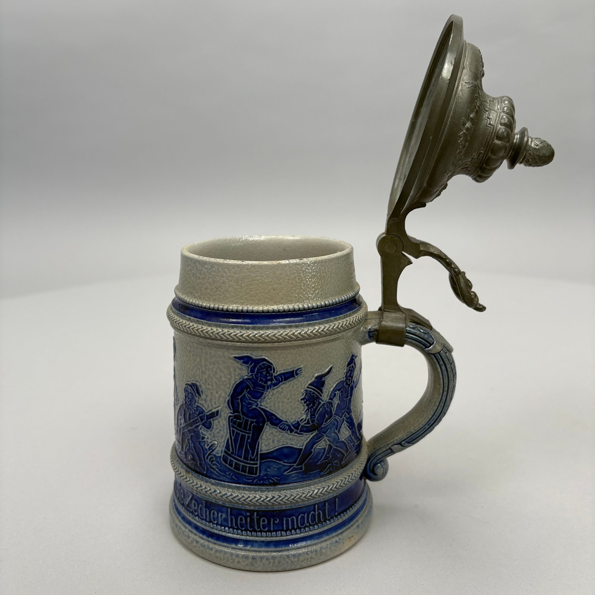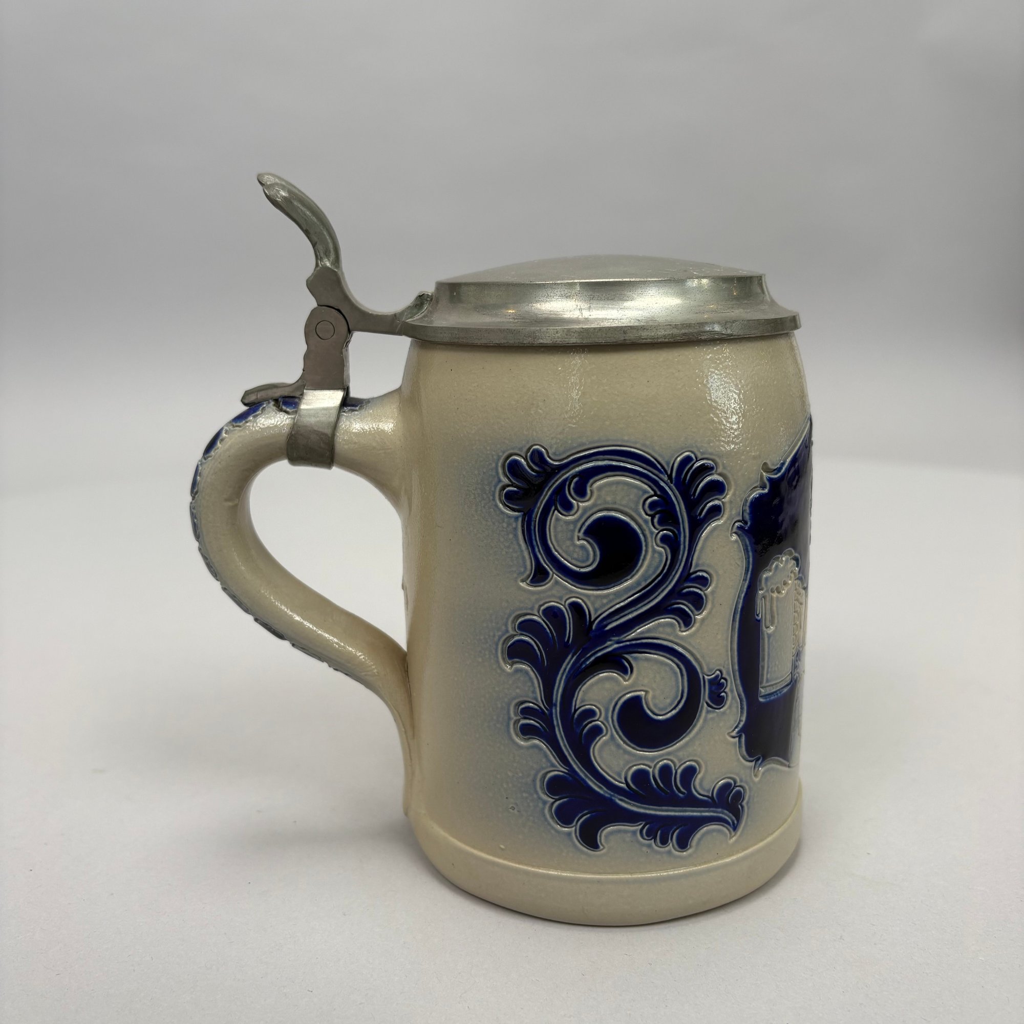 Seven German Cobalt Blue-Decorated Saltglaze Stoneware Steins with Pewter Lids, Late 19th-20th Century. Including impressed marks for "A.K," "ECHT/ SALZGLASIERT," "GERZ/ W. GERMANY" and "R. MERKELBACH GRENZHAUSEN."
