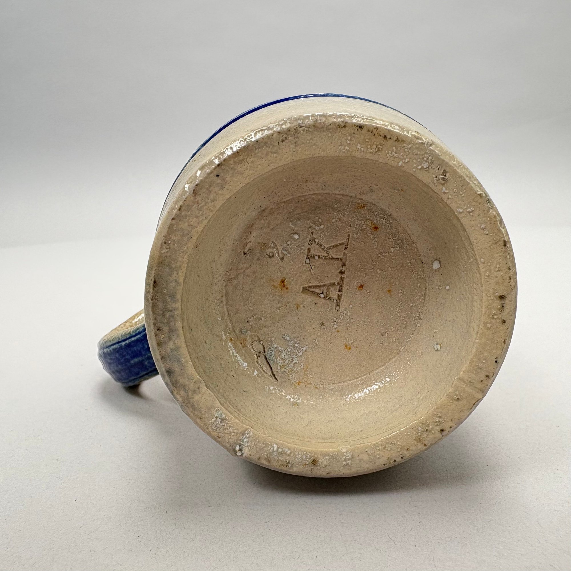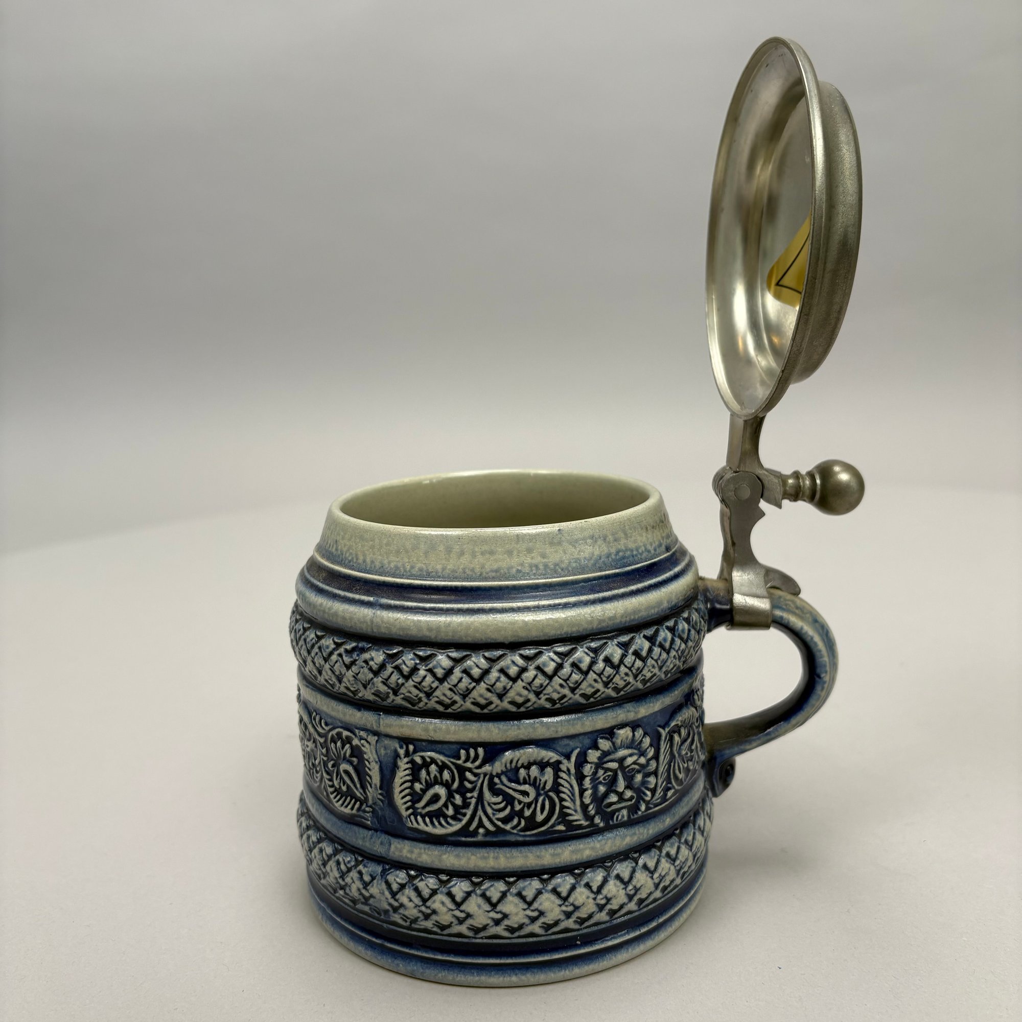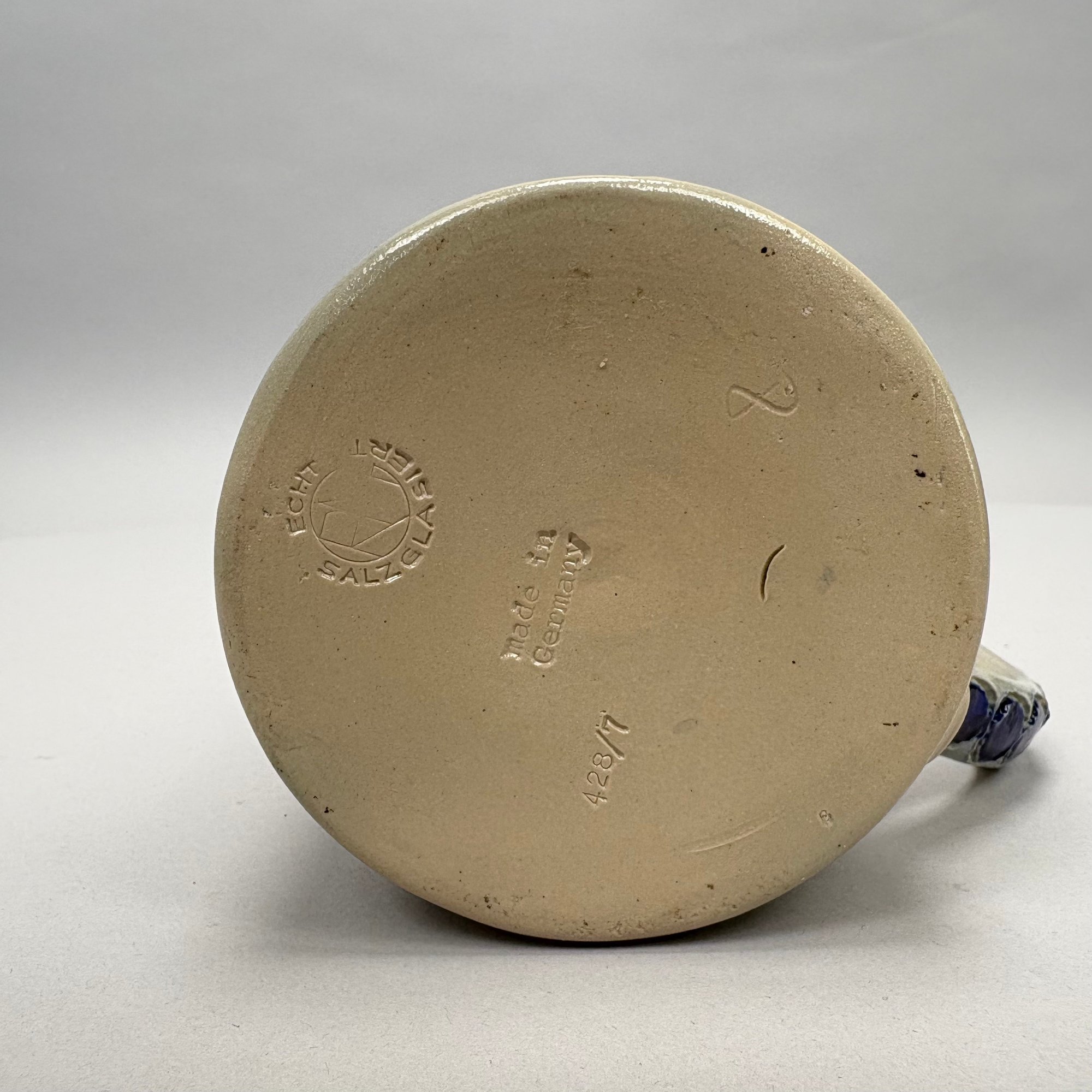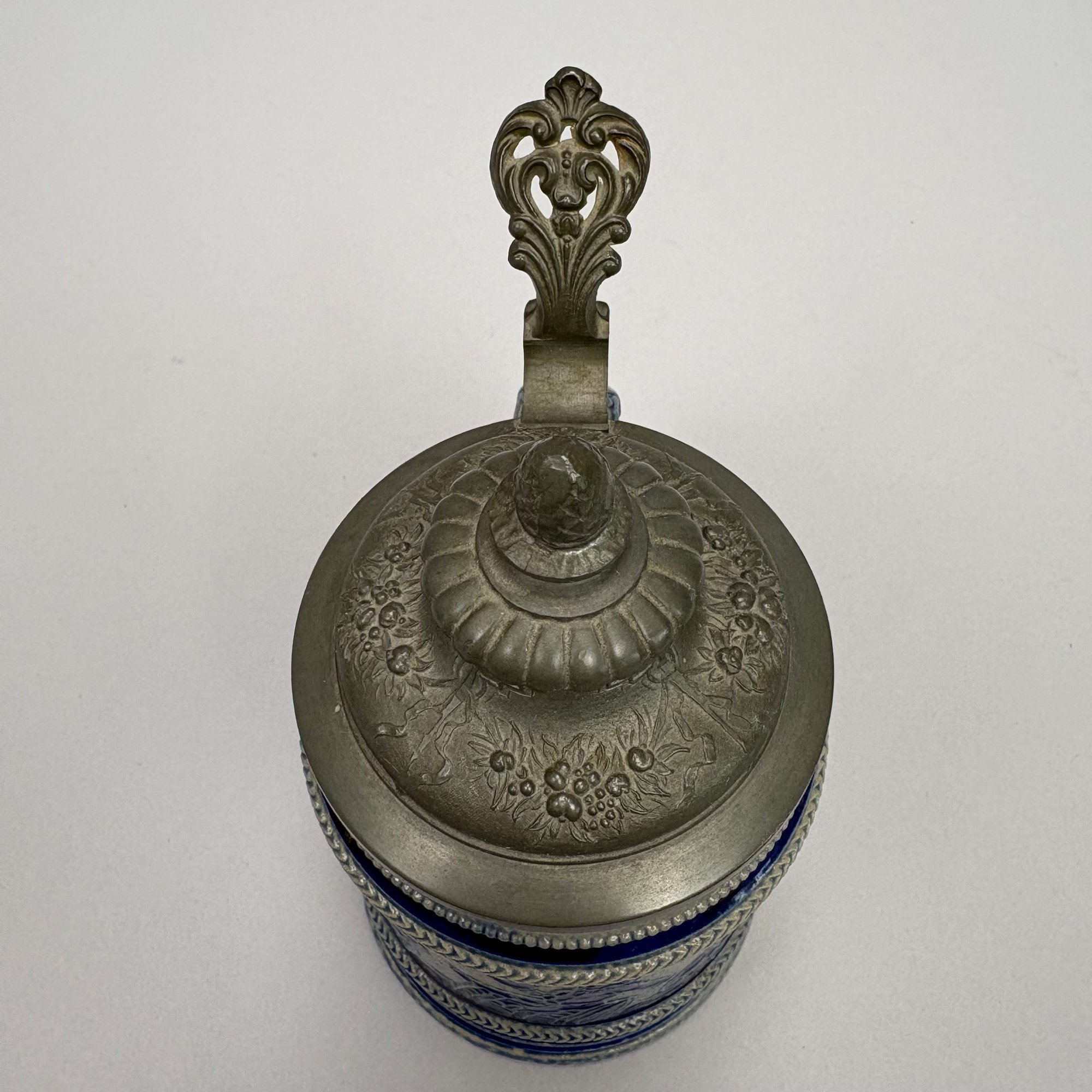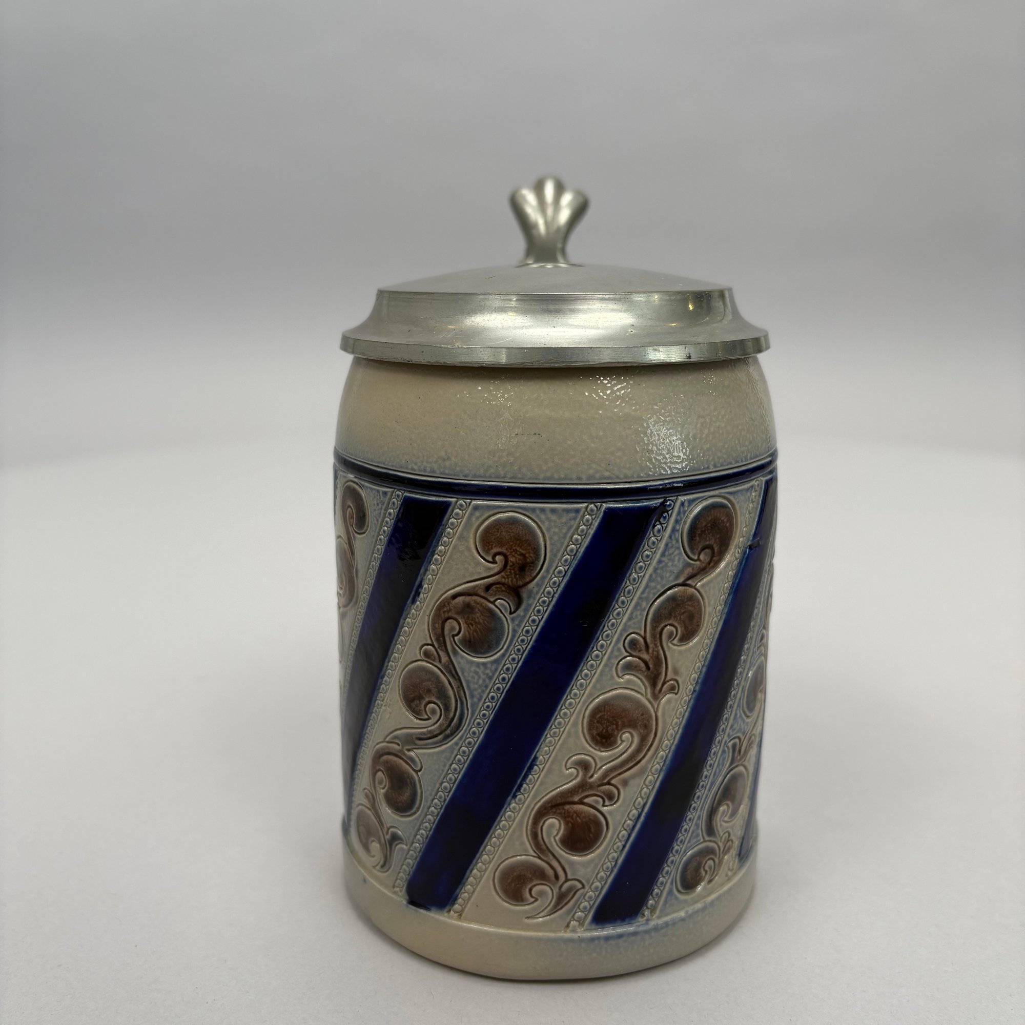 Seven German Cobalt Blue-Decorated Saltglaze Stoneware Steins with Pewter Lids, Late 19th-20th Century. Including impressed marks for "A.K," "ECHT/ SALZGLASIERT," "GERZ/ W. GERMANY" and "R. MERKELBACH GRENZHAUSEN."