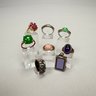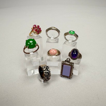 Seven Gold and Sterling Silver Rings and a Locket, Various Makers. Comprising a 14k yellow gold cluster ring, a sterling silver ring mounted with an oval lazurite stone, designed by Harald Nielsen for Georg Jensen, "GEORG JENSEN" oval dotted mark, "925S/ DENMARK/ 46/ B;" and five sterling silver rings and a locket.