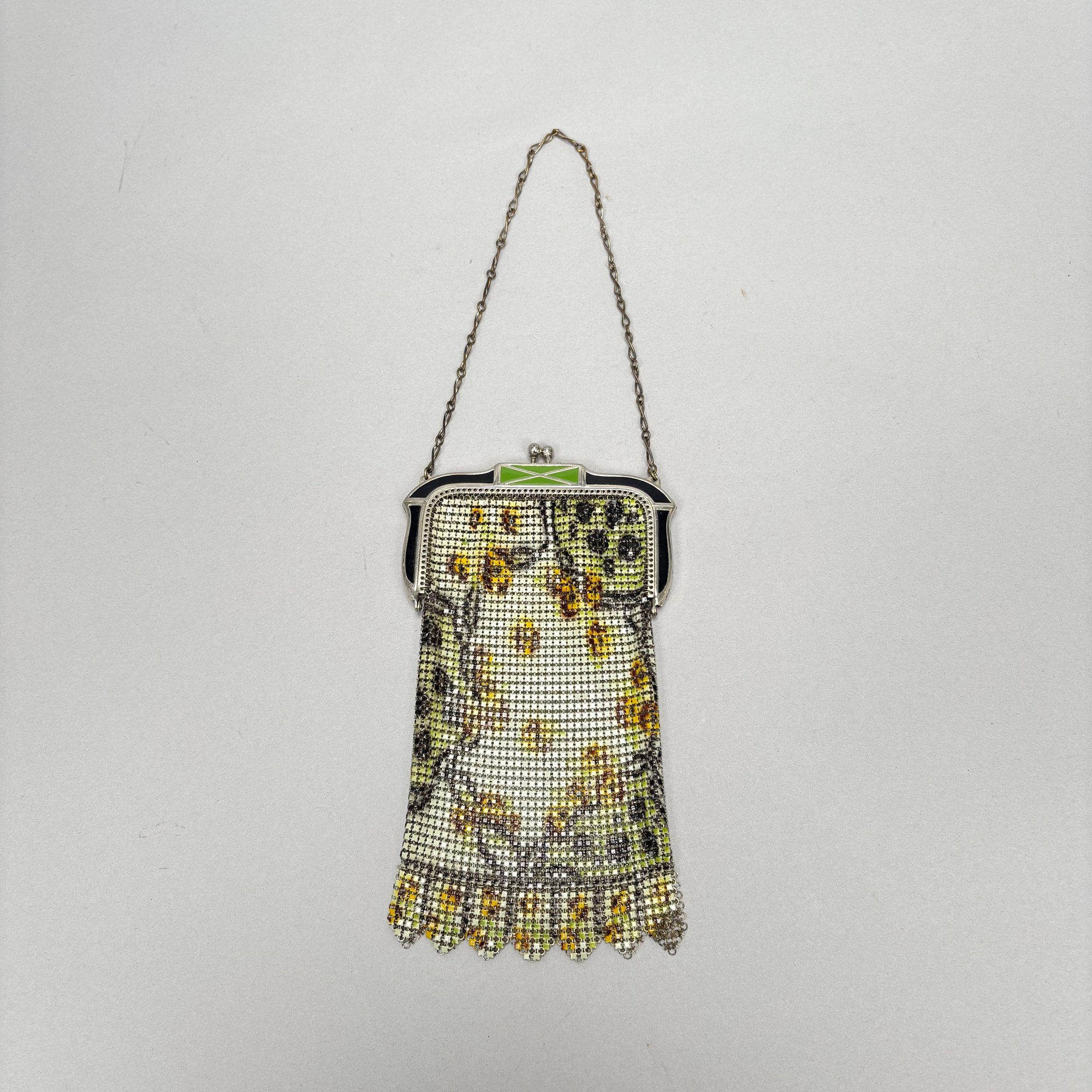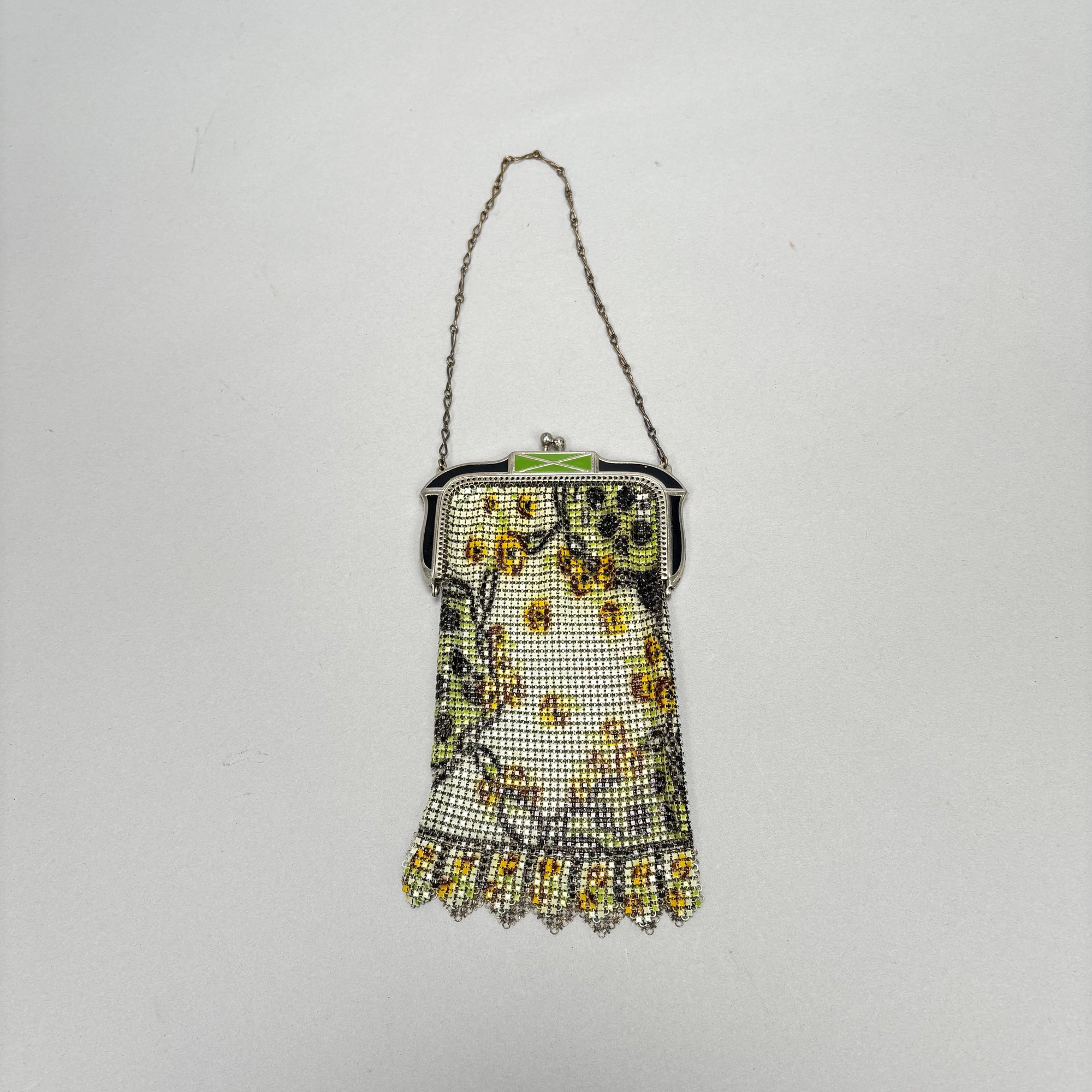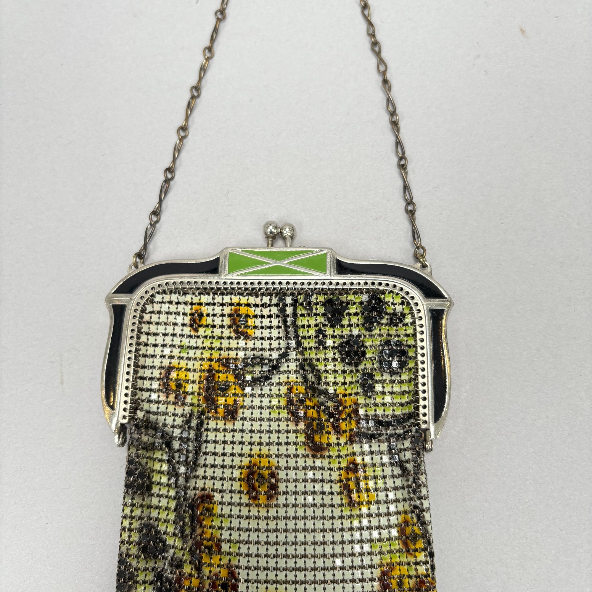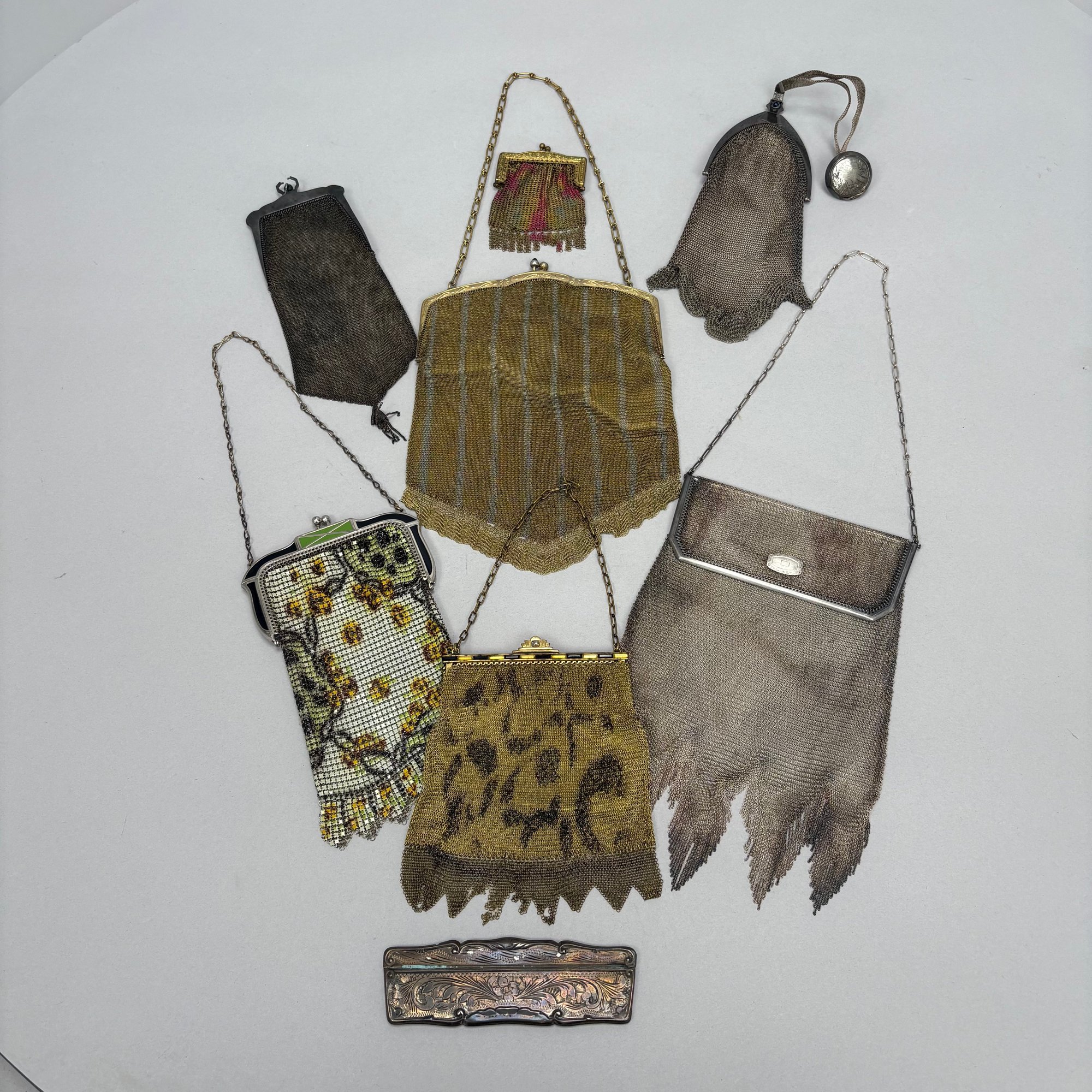 Seven Ladies Mesh Evening Bags and a Comb. Including two bags by Whiting & Davis Company, North Attleboro/ Plainville, Massachusetts,1920'S-40's, the first in Art Deco style with a flowering plant on either side in yellow, green and black, the enamel frame with kiss clasp, the second with folding cover and fringe border, marked "PRINCESS MARY" and both marked "WHITING & DAVIS CO./ MESH BAGS."