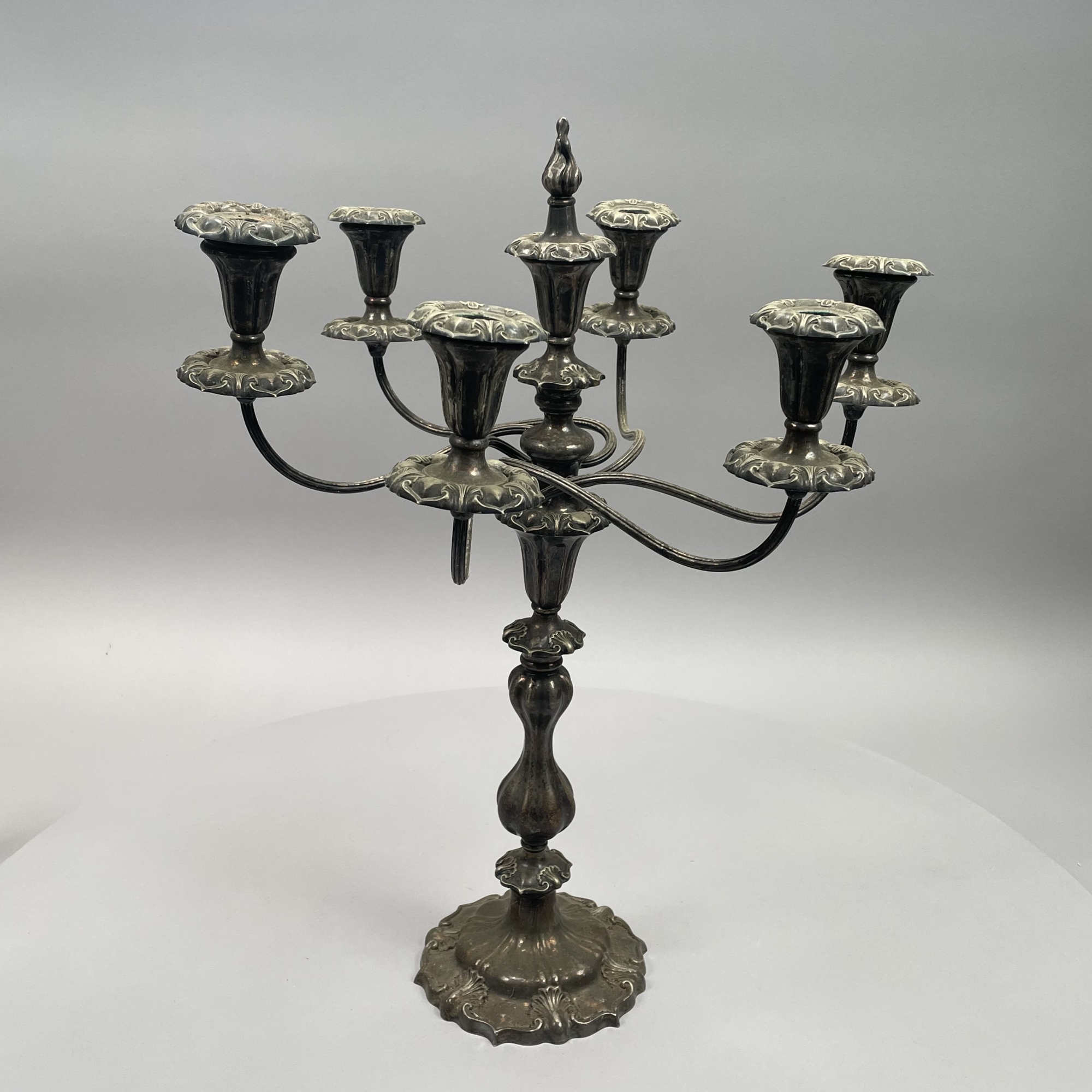 In two parts, the flame form snuffer above seven candle sockets with shell decorated bobeches, raised on a knopped standard with shell decorated scalloped edge base.