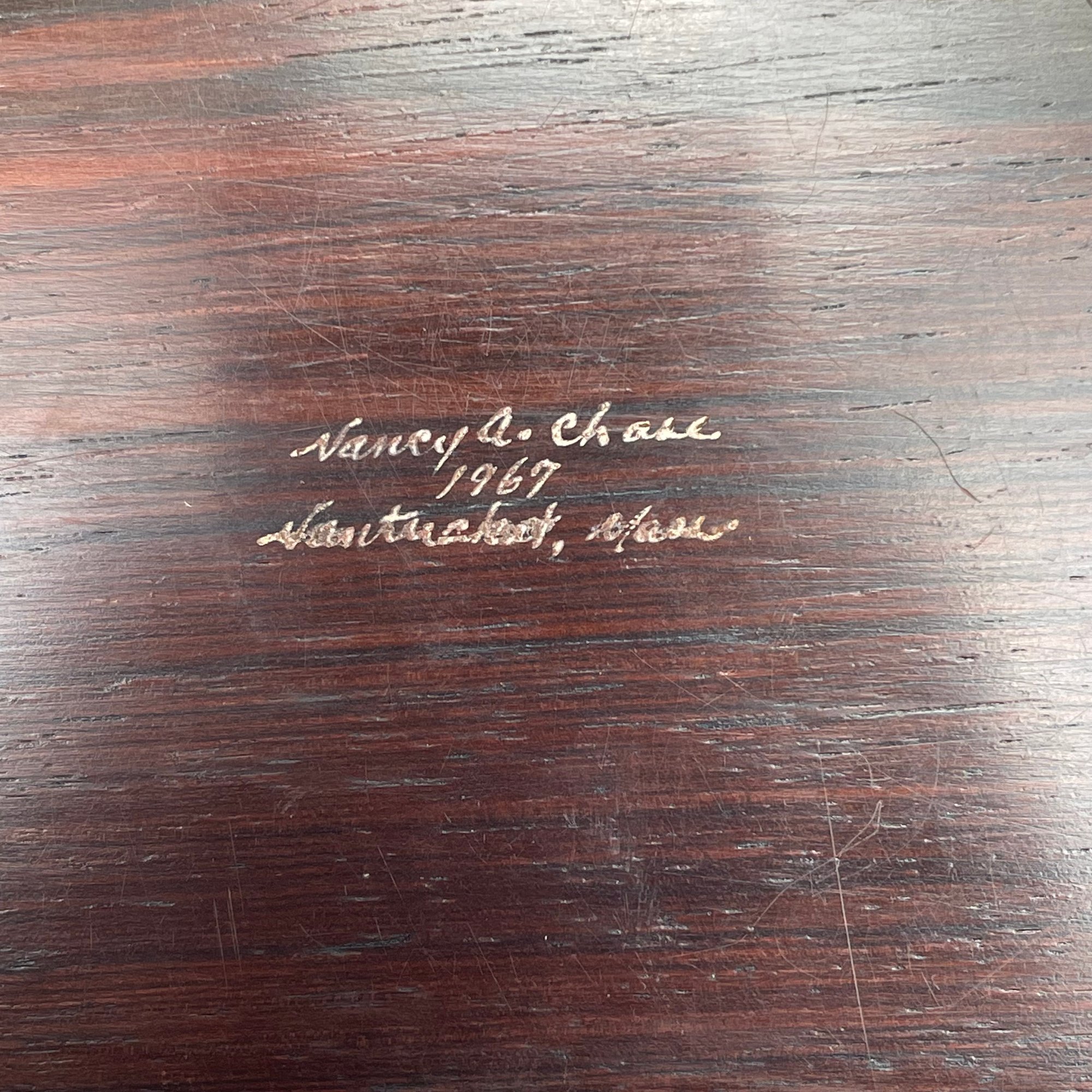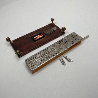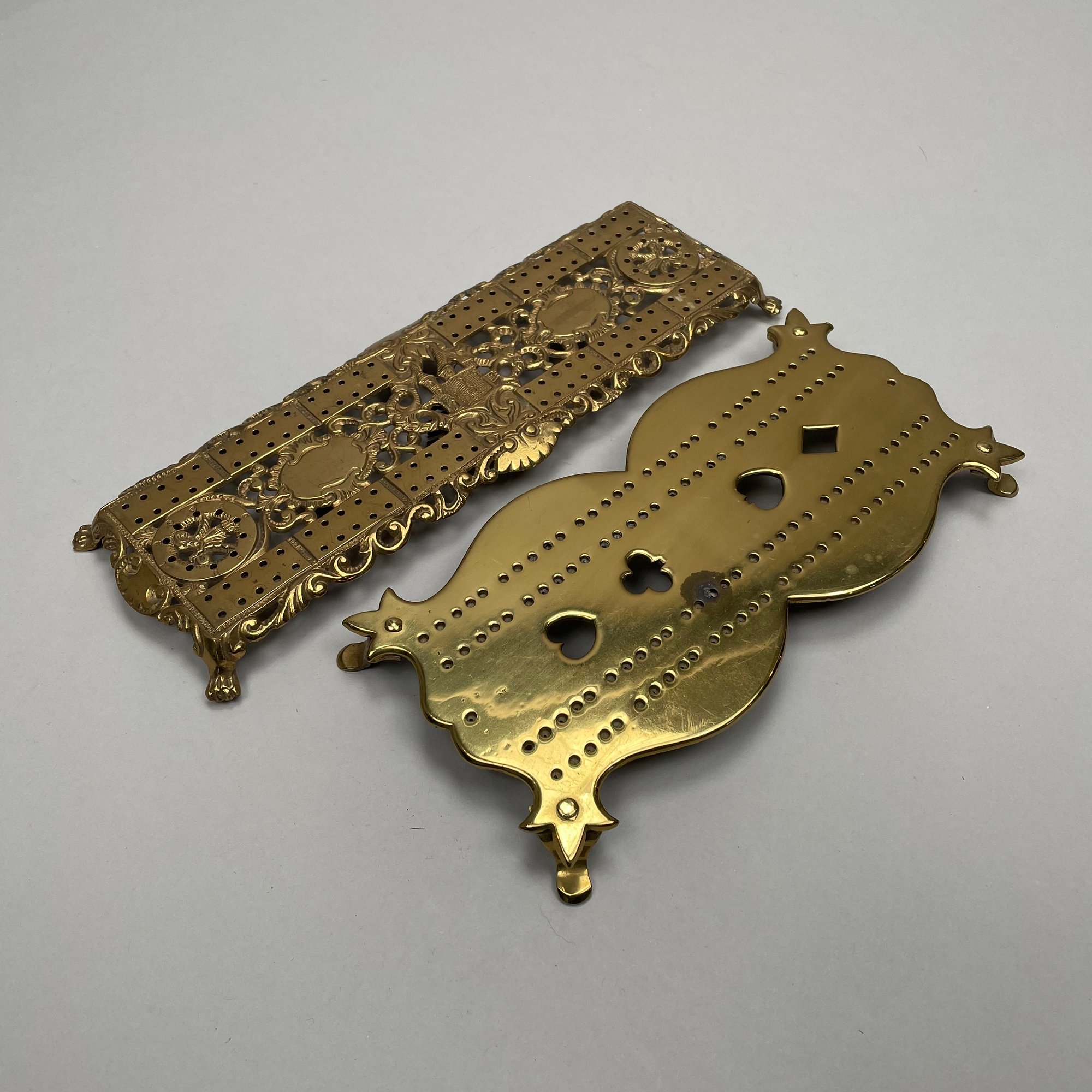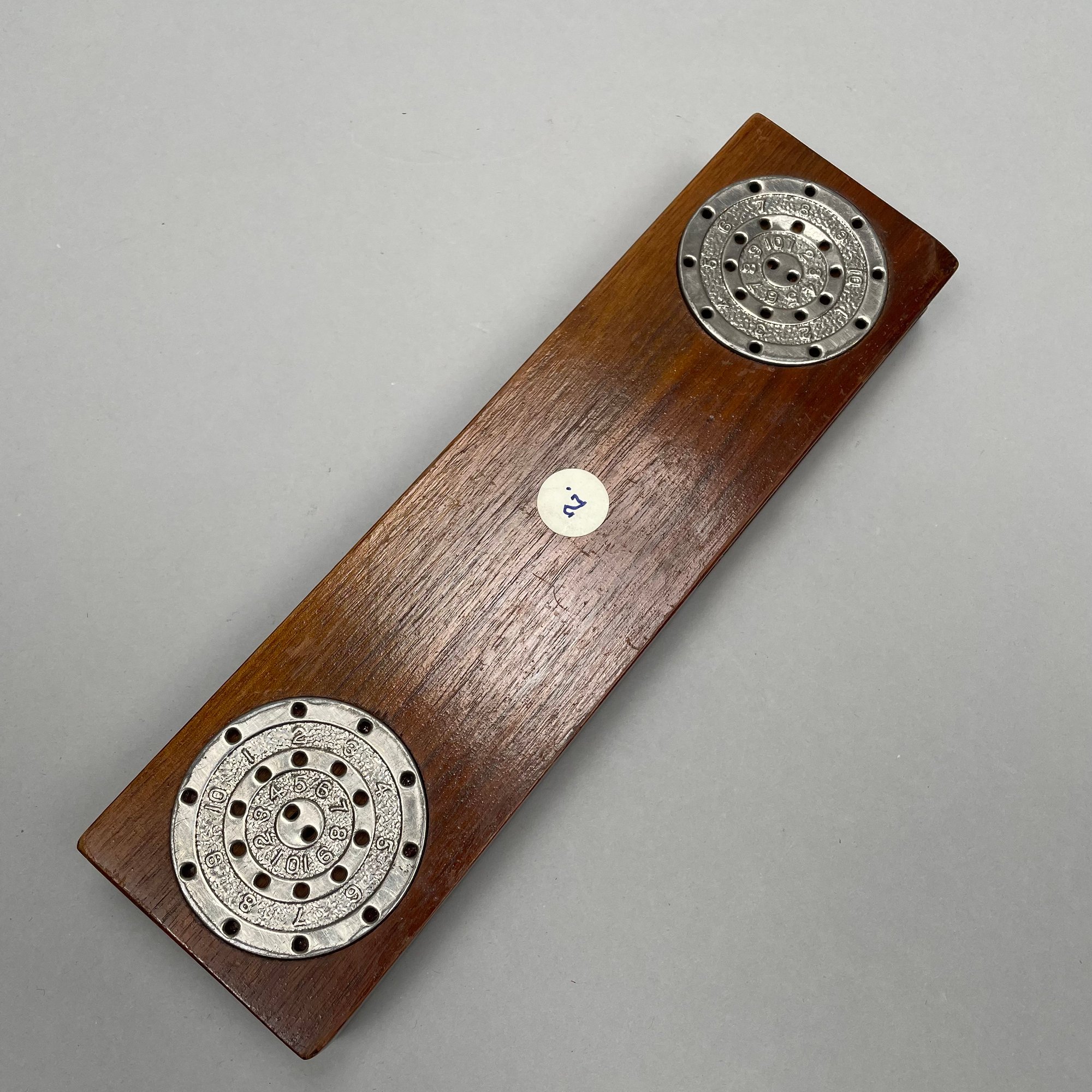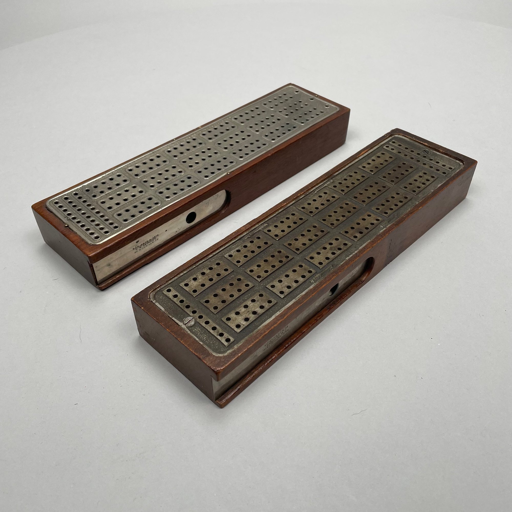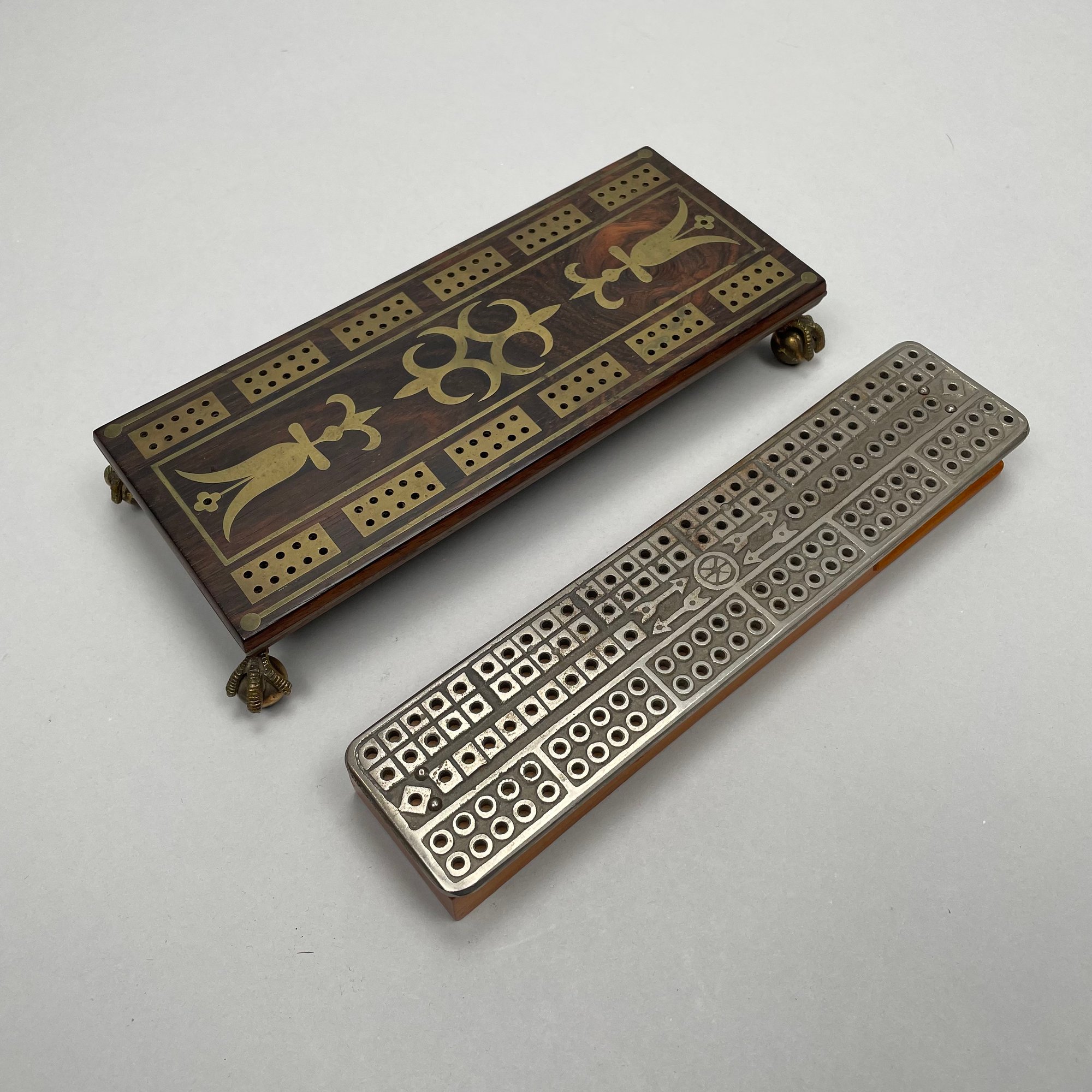 Seven Wood and Brass Cribbage Boards. Comprising two rosewood boards, one inlaid in brass and the other with a scrimshawed armorial panel for Seagrave, the remaining in mahogany, maple and brass.