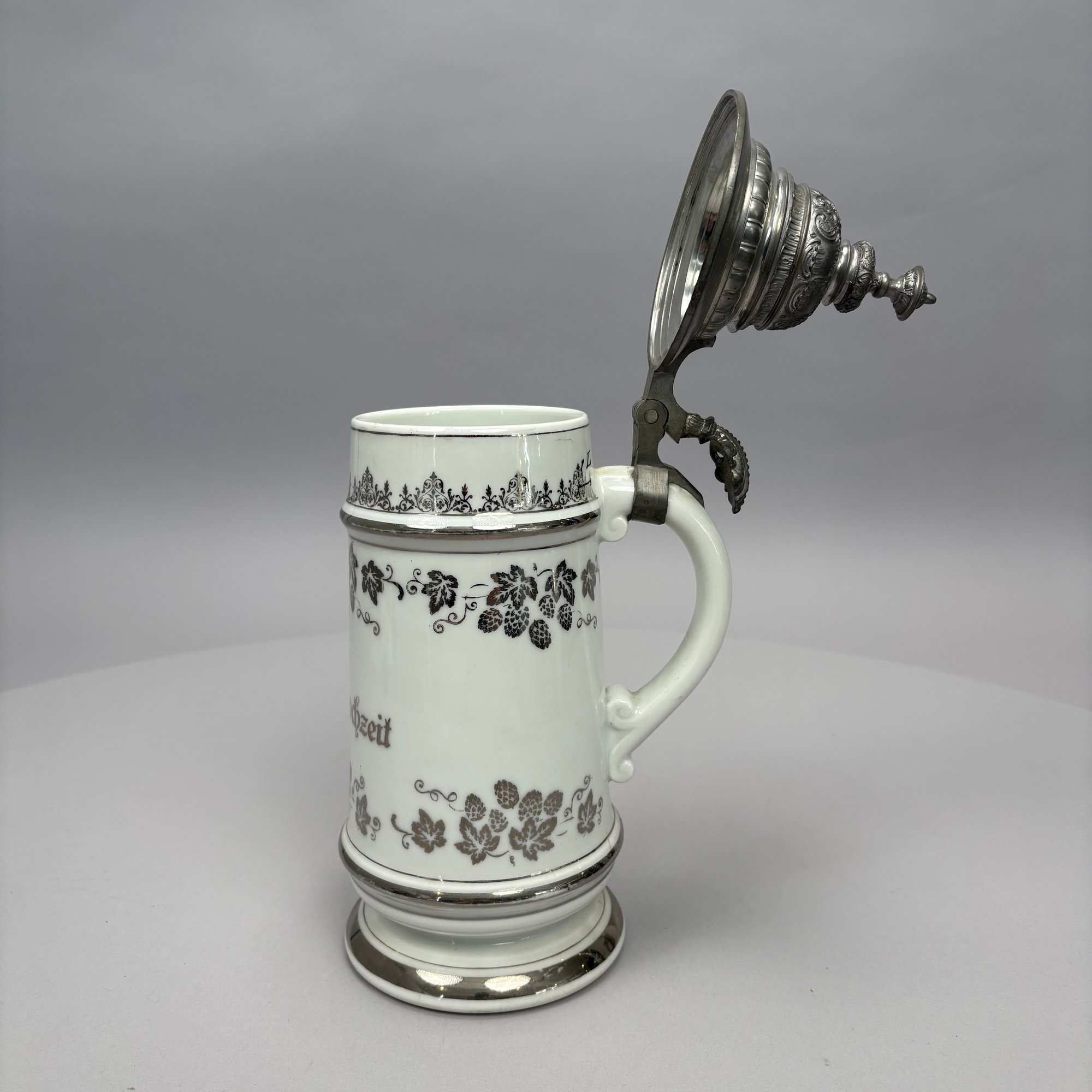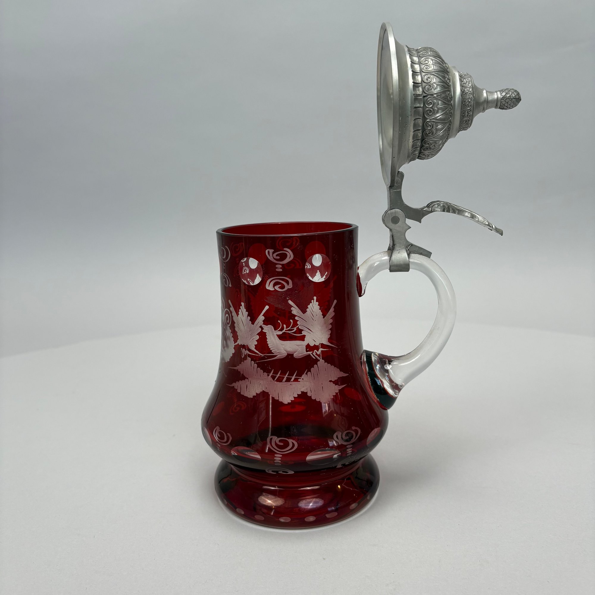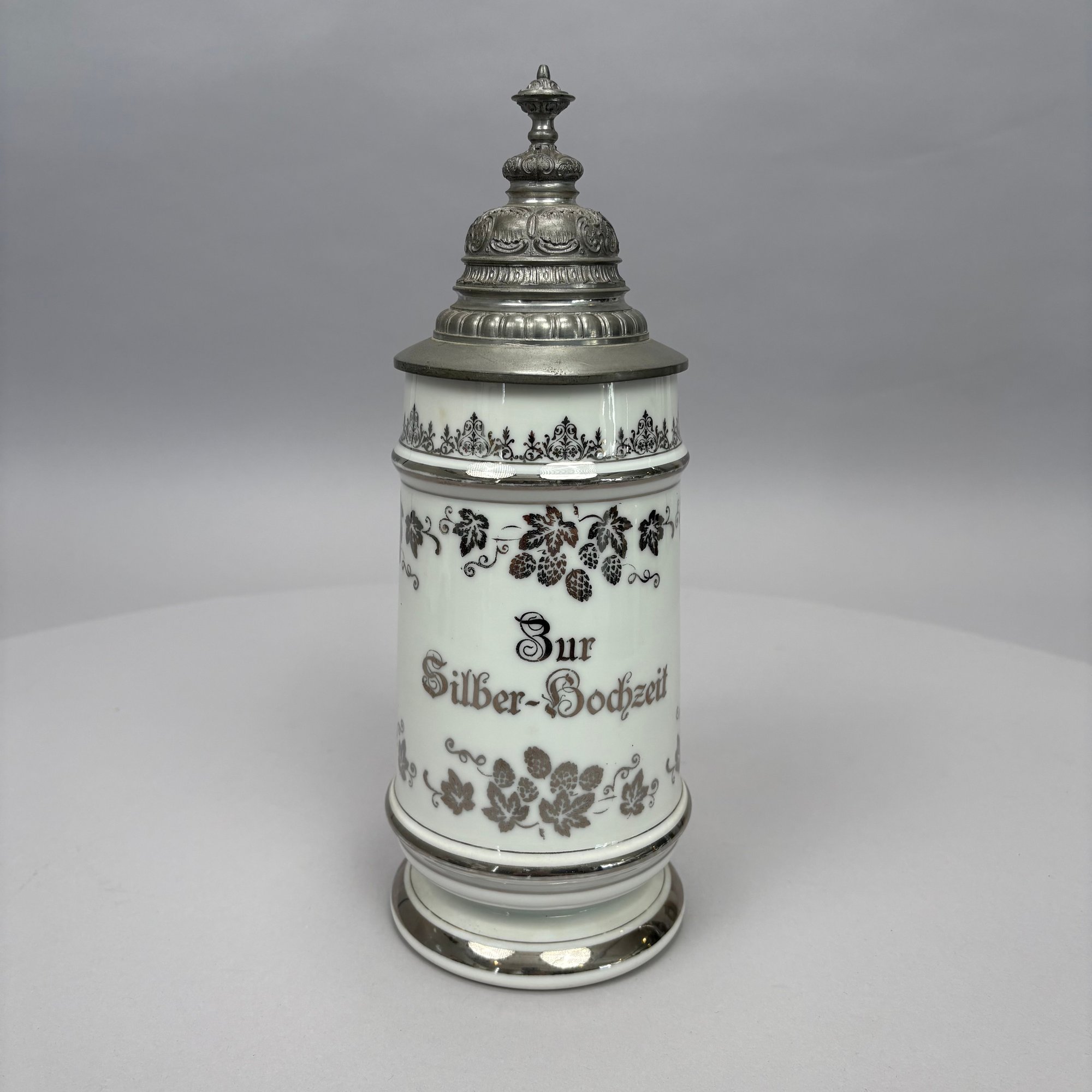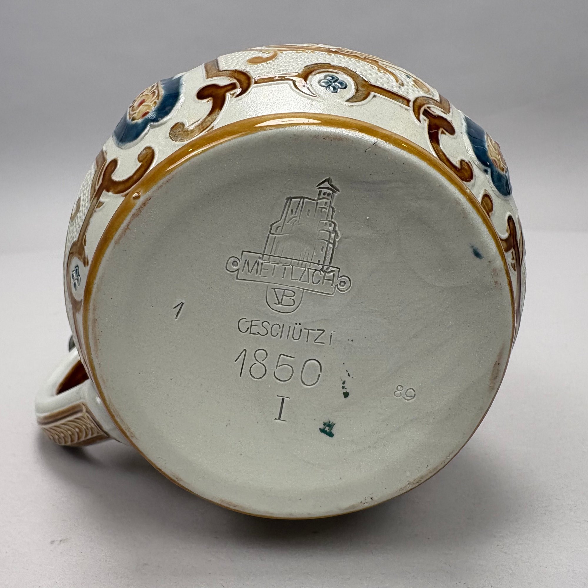 Six German Stoneware, Porcelain Lithophane and Glass Steins, Late 19th-20th Century. Comprising a Mettlach Pottery 'Scrollwork' stein #1850, impressed abbey mark, "METTLACH/ VB/ GESCHUTZ" and number "1850/ I;" a Merkelbach Mfg. Goebel stein, impressed "Handarbeit 32-322150D; two porcelain lithophane steins, one inscribed "Zur Silber-Hochzeit," (For the silver wedding anniversary), the other depicting a cavalier and each lithophane in the base depicting a husband and wife; a Bohemian flashed ruby glass stein and a green glass stein.