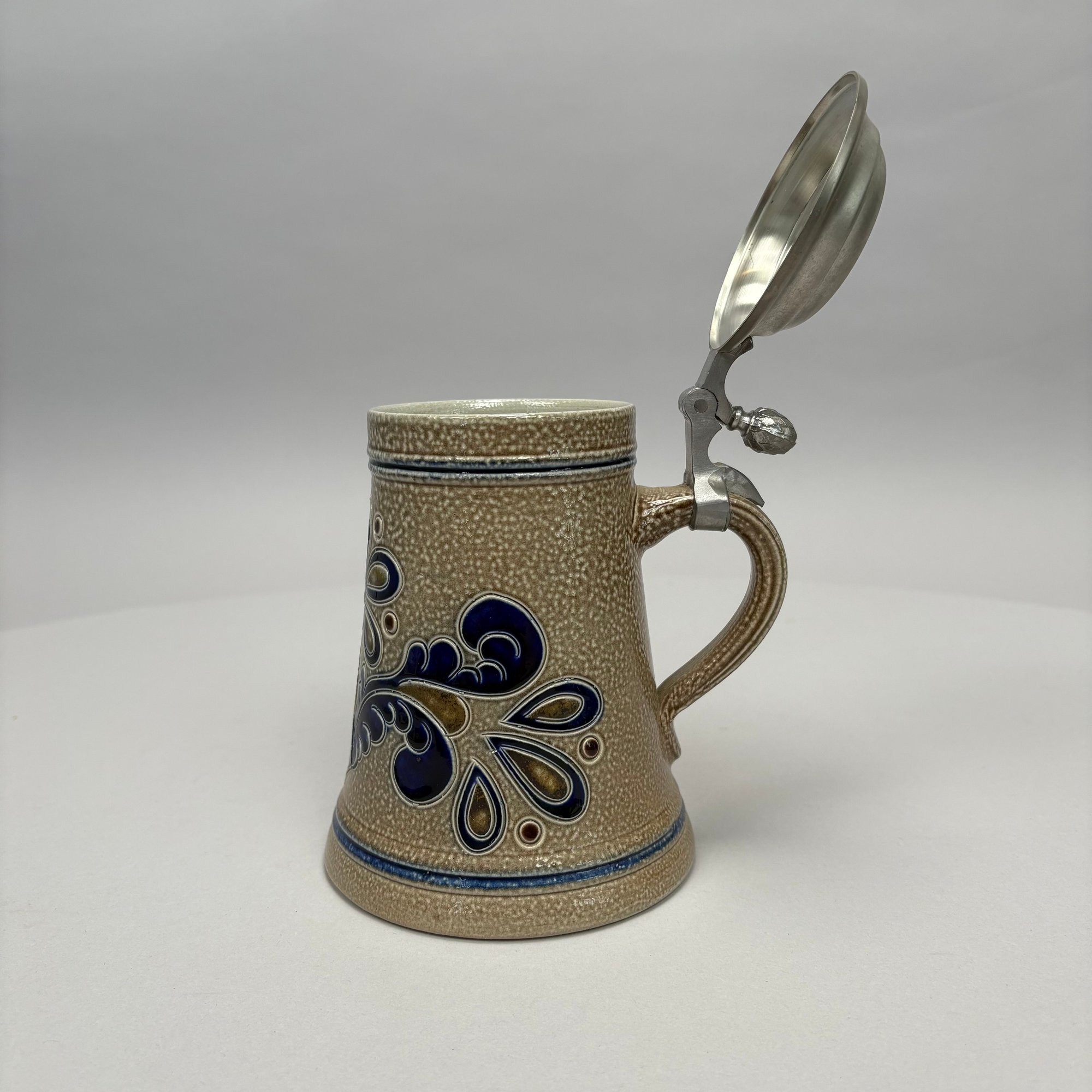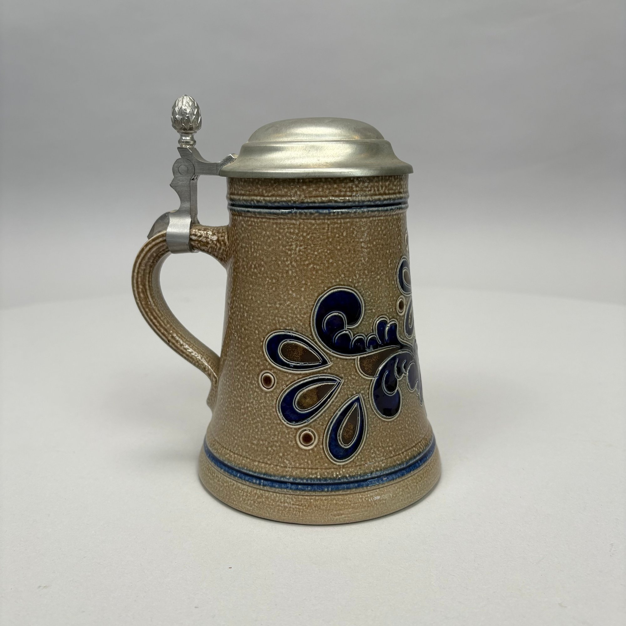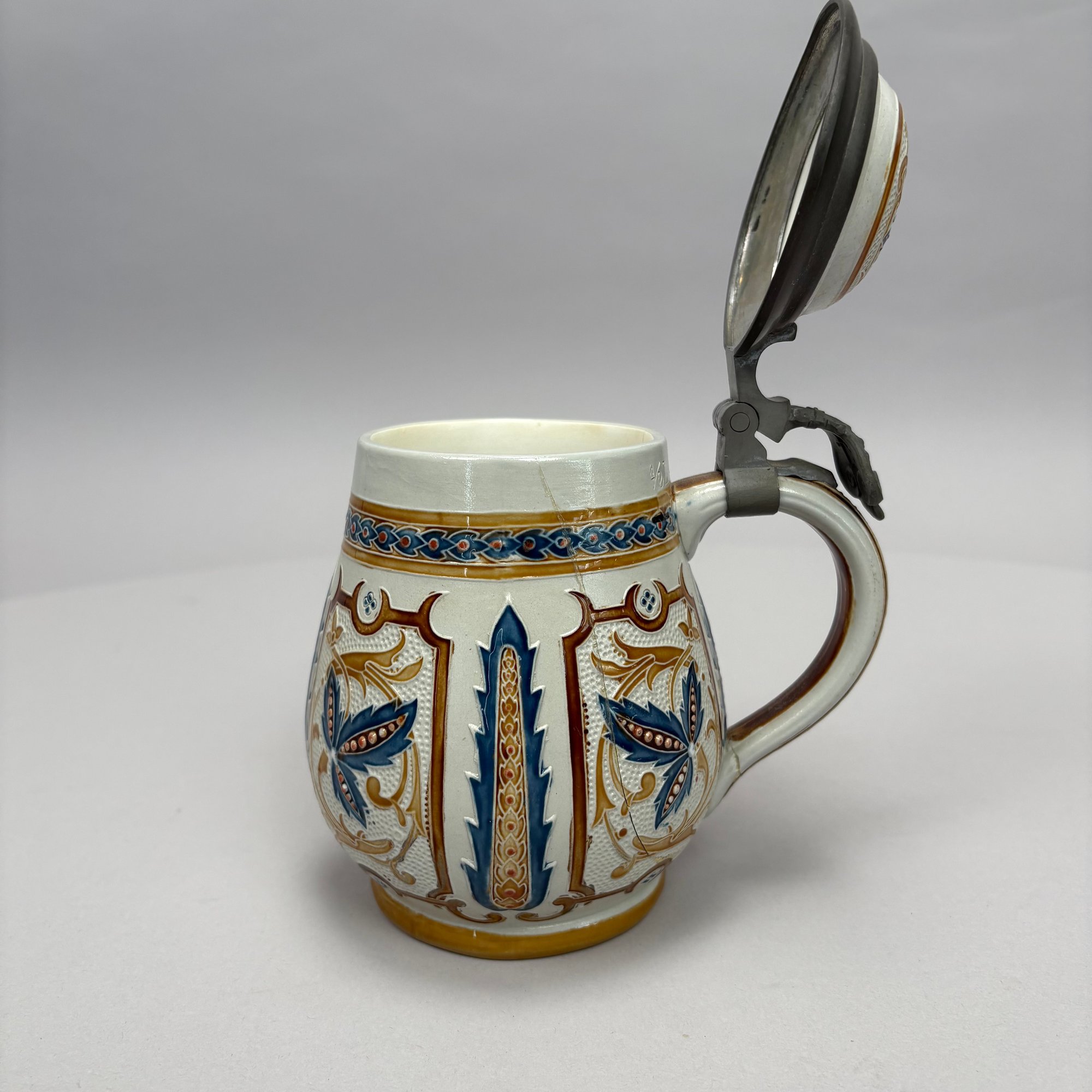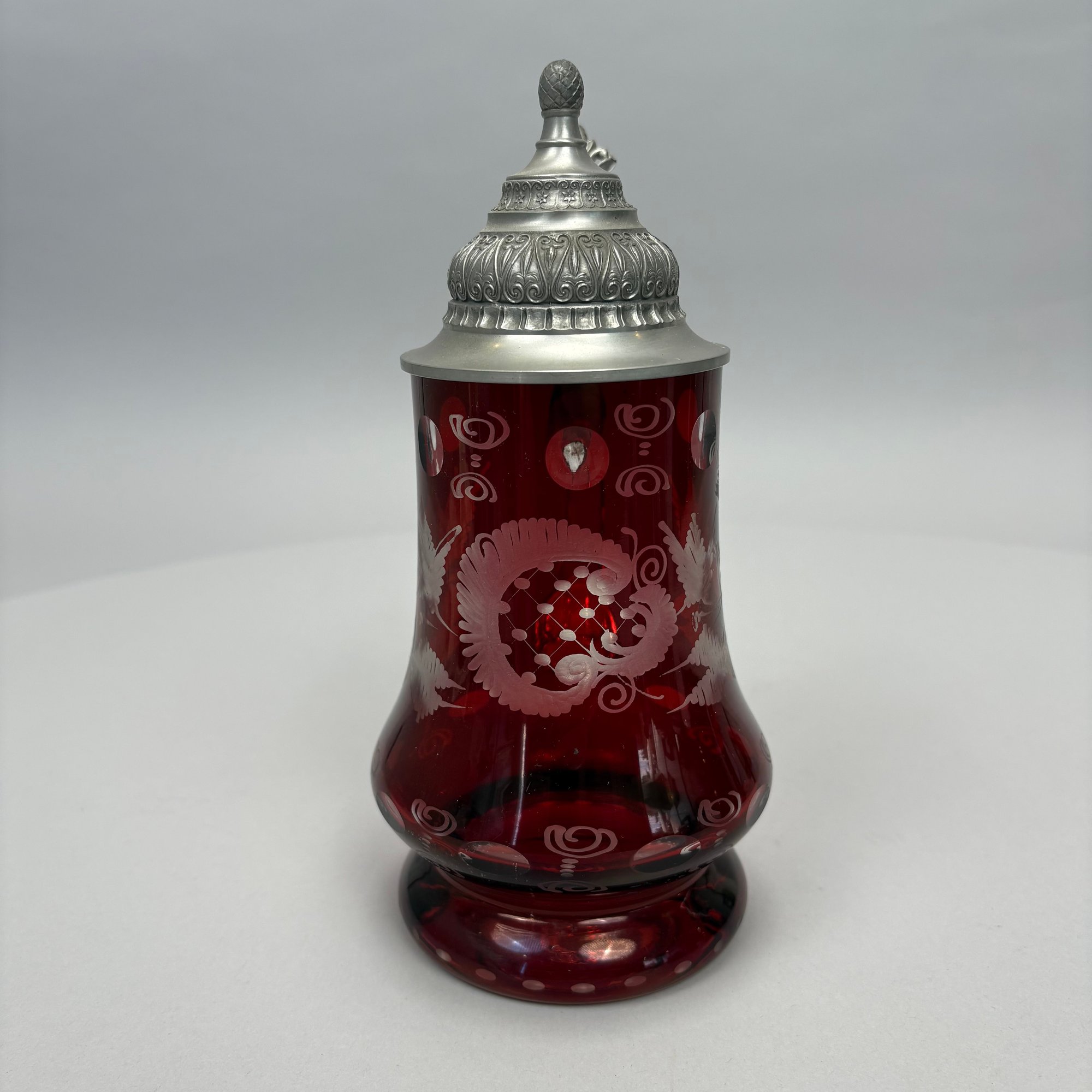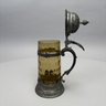 Six German Stoneware, Porcelain Lithophane and Glass Steins, Late 19th-20th Century. Comprising a Mettlach Pottery 'Scrollwork' stein #1850, impressed abbey mark, "METTLACH/ VB/ GESCHUTZ" and number "1850/ I;" a Merkelbach Mfg. Goebel stein, impressed "Handarbeit 32-322150D; two porcelain lithophane steins, one inscribed "Zur Silber-Hochzeit," (For the silver wedding anniversary), the other depicting a cavalier and each lithophane in the base depicting a husband and wife; a Bohemian flashed ruby glass stein and a green glass stein.