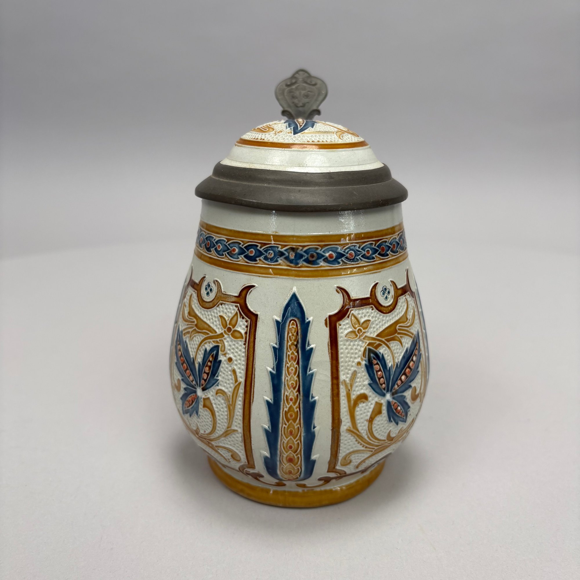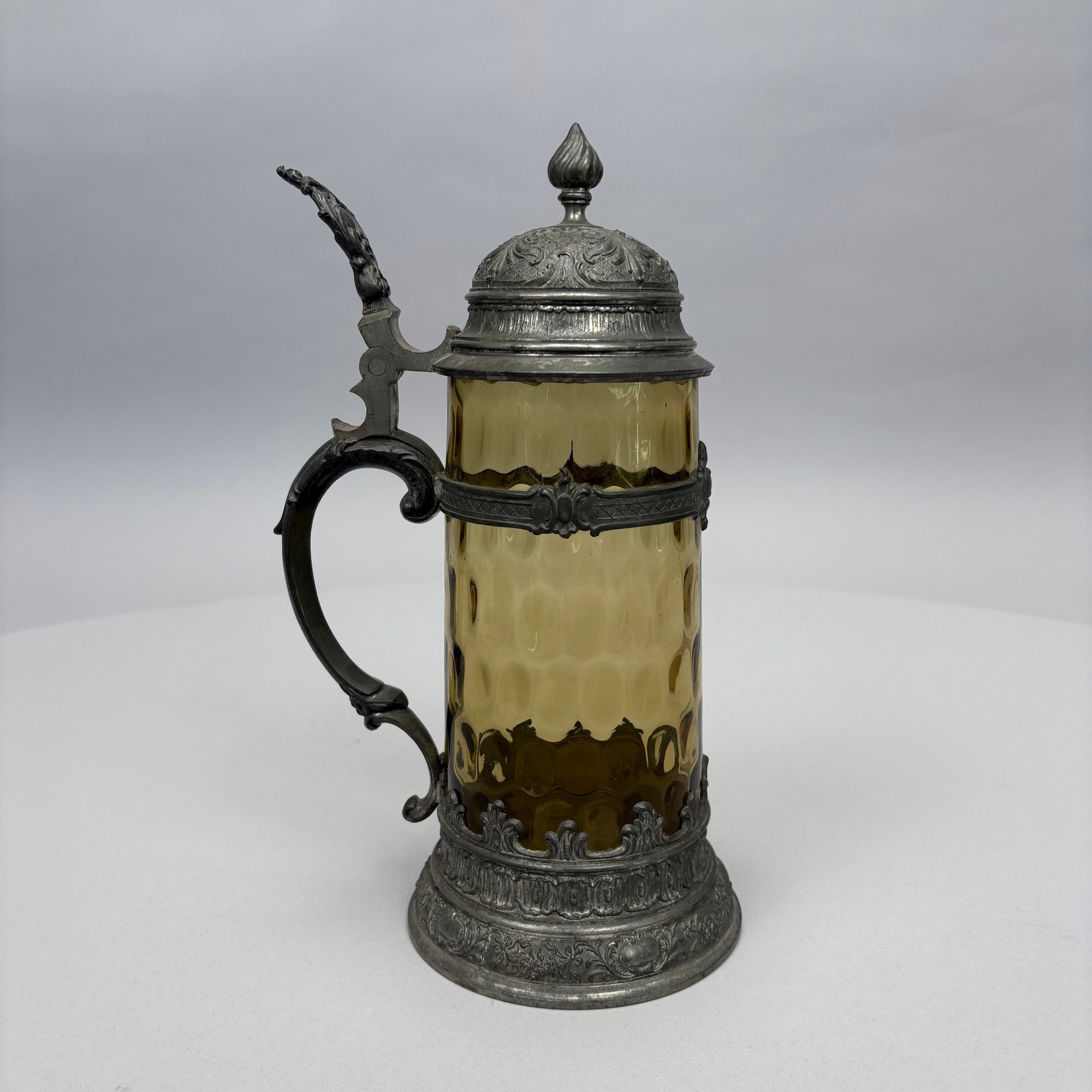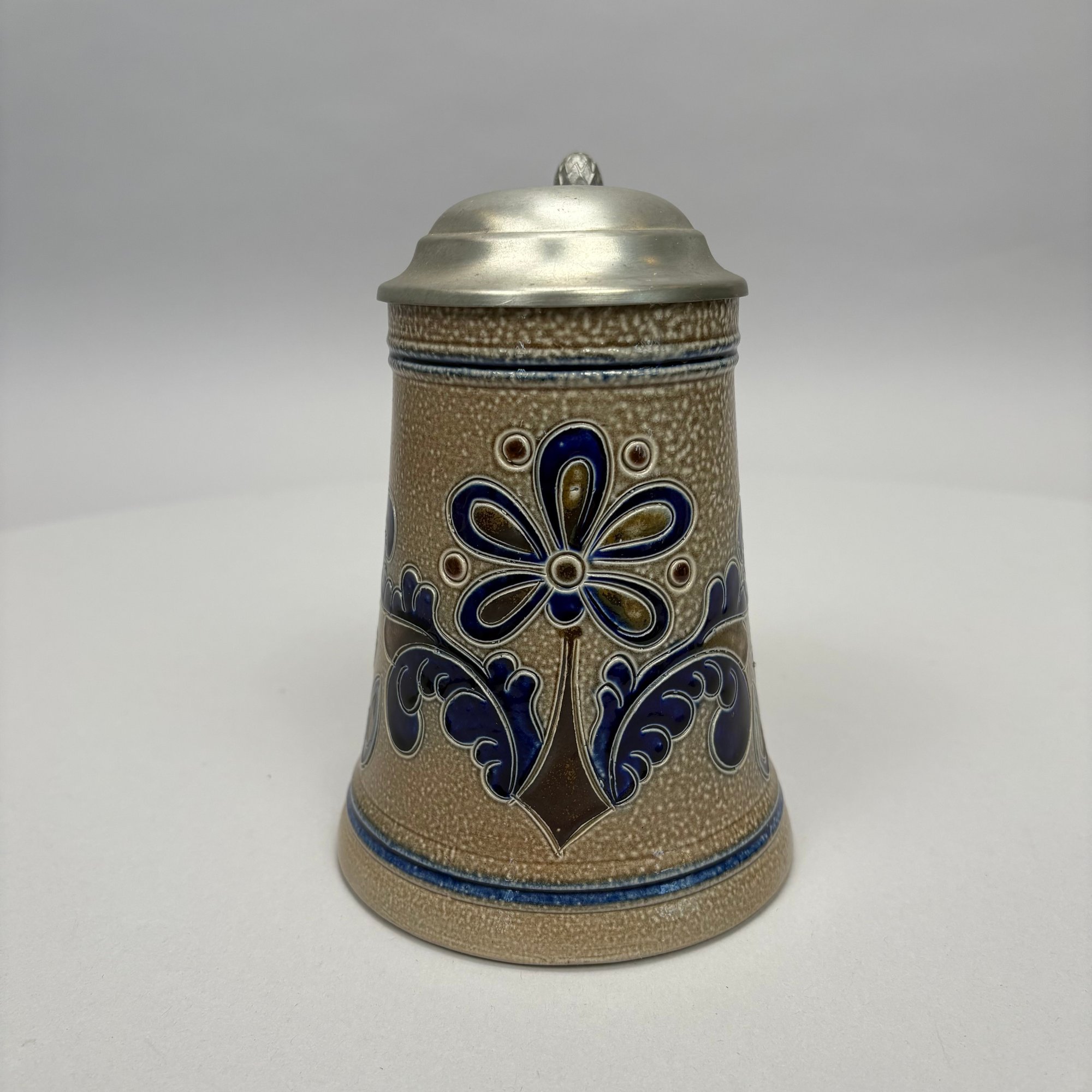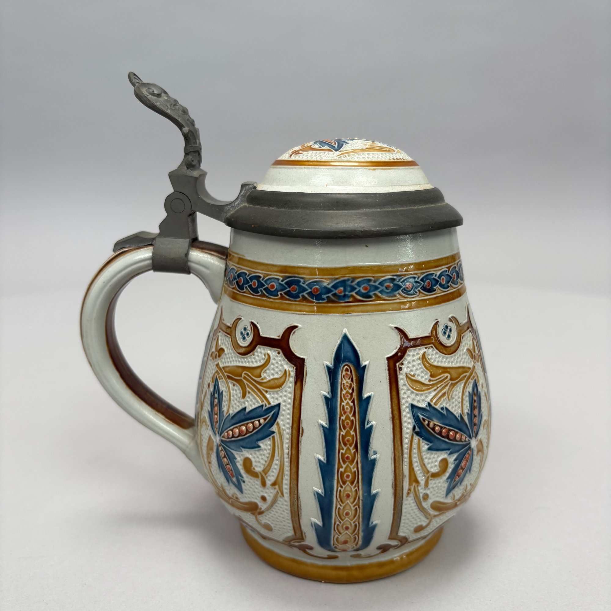 Six German Stoneware, Porcelain Lithophane and Glass Steins, Late 19th-20th Century. Comprising a Mettlach Pottery 'Scrollwork' stein #1850, impressed abbey mark, "METTLACH/ VB/ GESCHUTZ" and number "1850/ I;" a Merkelbach Mfg. Goebel stein, impressed "Handarbeit 32-322150D; two porcelain lithophane steins, one inscribed "Zur Silber-Hochzeit," (For the silver wedding anniversary), the other depicting a cavalier and each lithophane in the base depicting a husband and wife; a Bohemian flashed ruby glass stein and a green glass stein.
