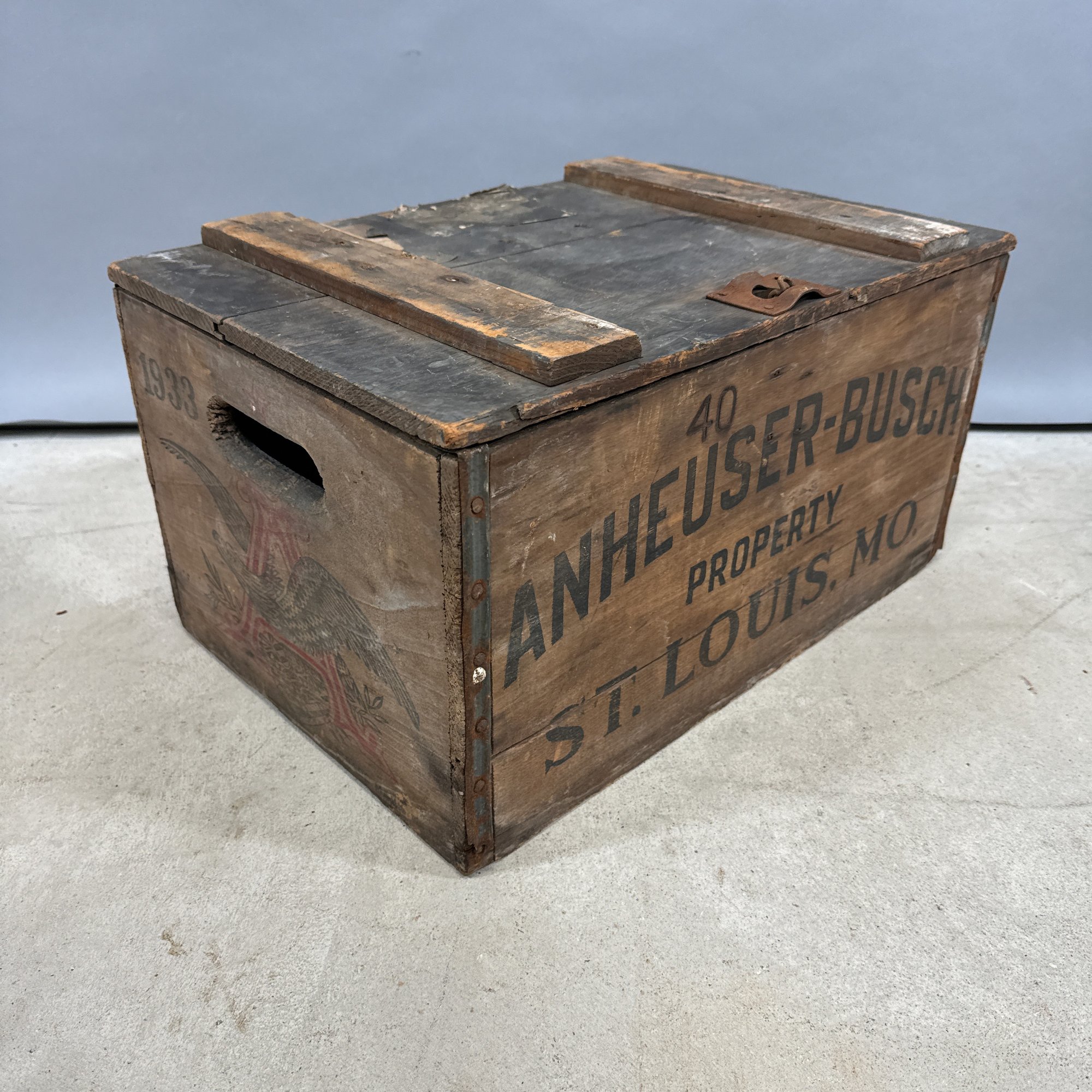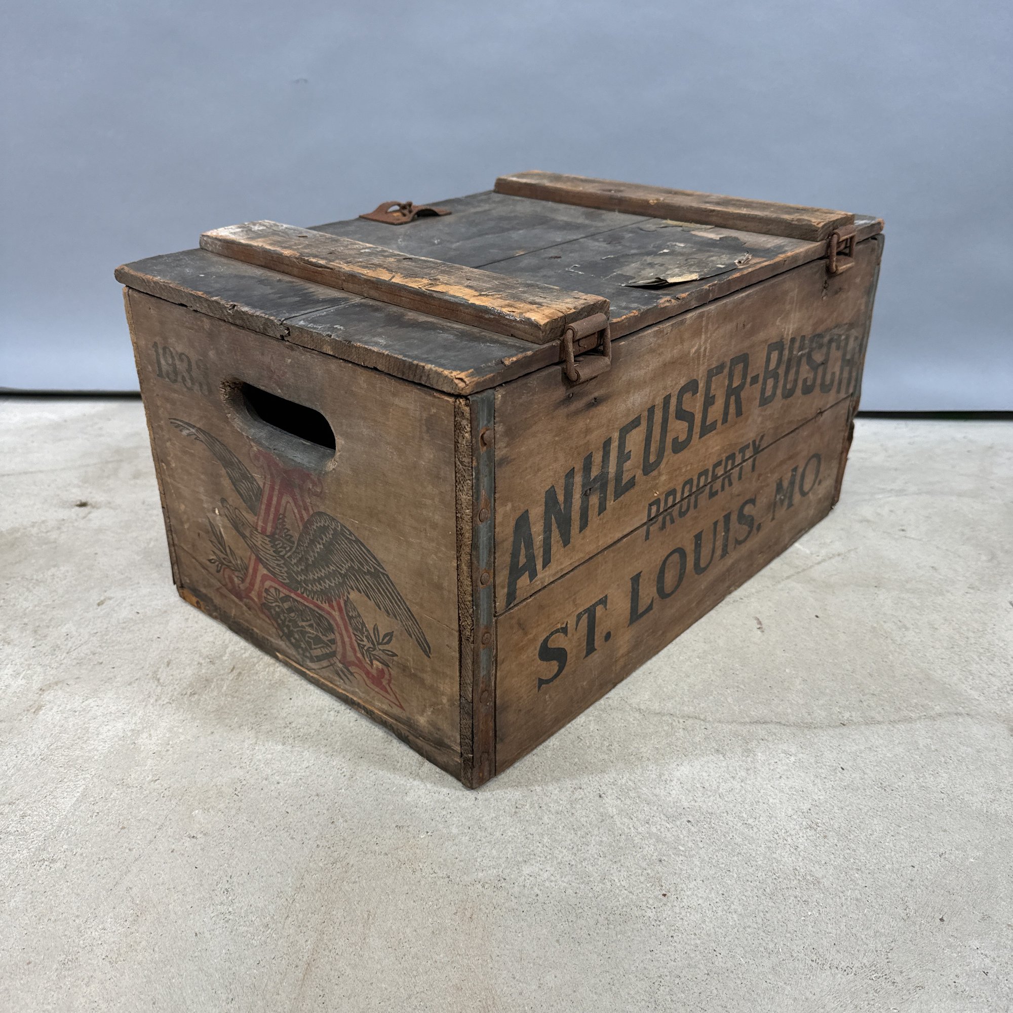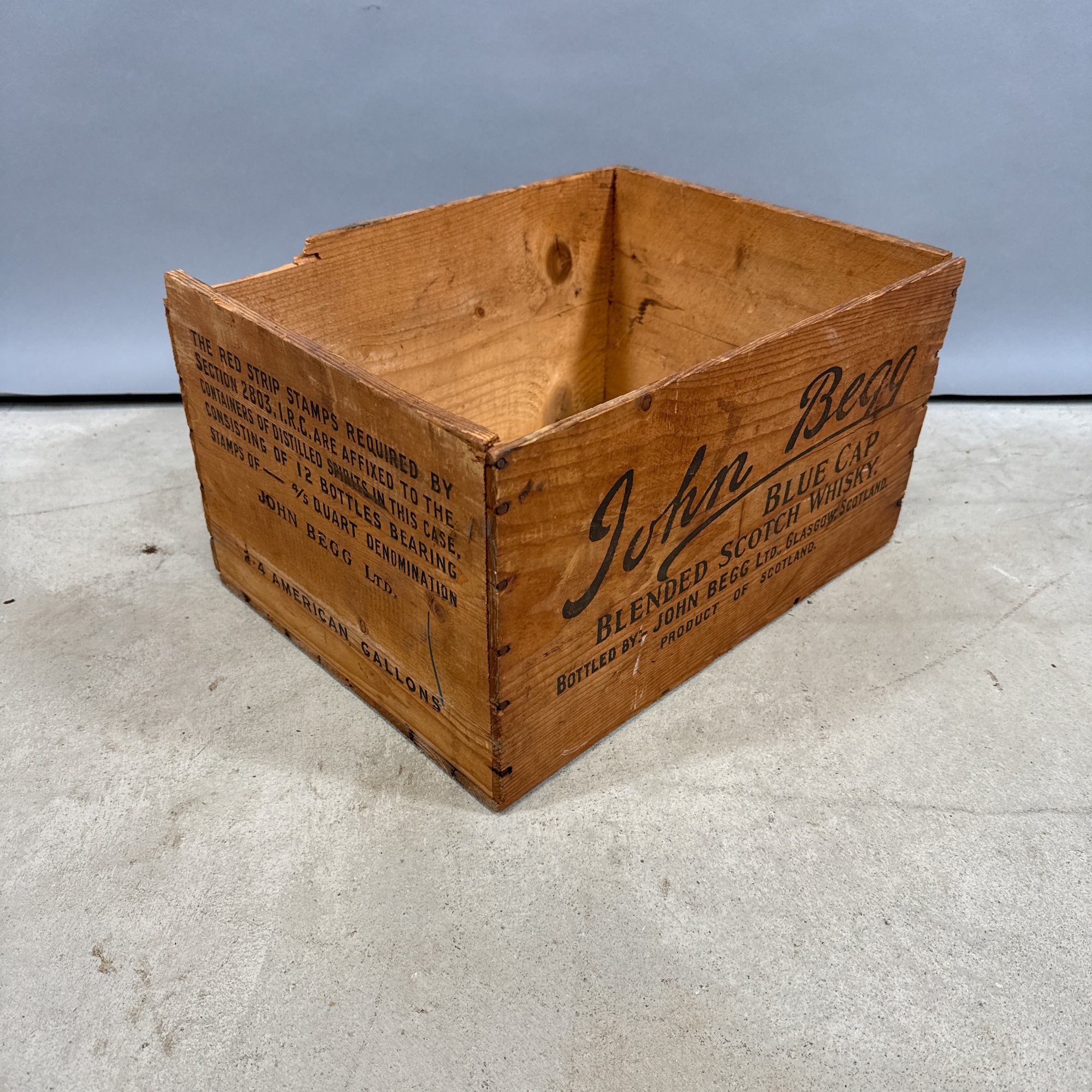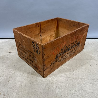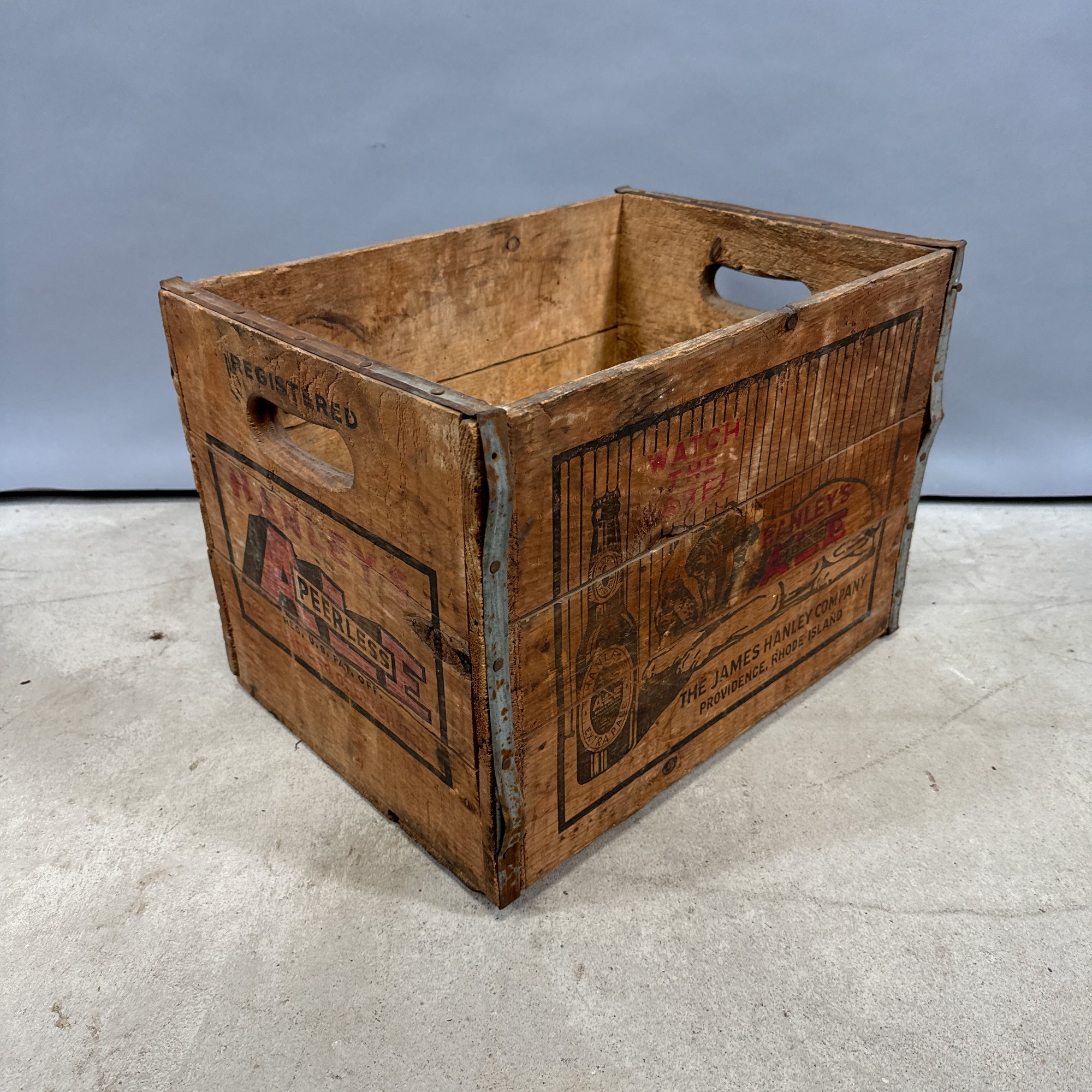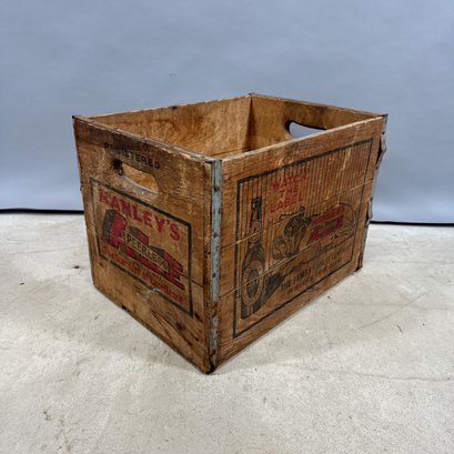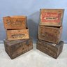 Six Printed Wooden Beer and Liquor Crates, Various Makers, Late 19th-Early 20th Century. For the makers "John Begg," "GLEN GARRY," "Rheingold," HANLEY'S PEERLESS ALE," ANHEUSER-BUSCH" and "ANDREW O. CASWELL."