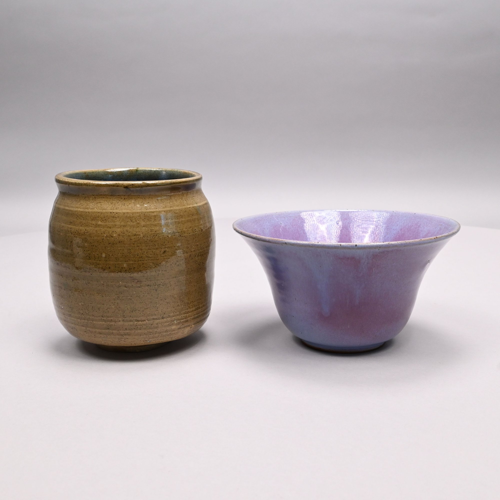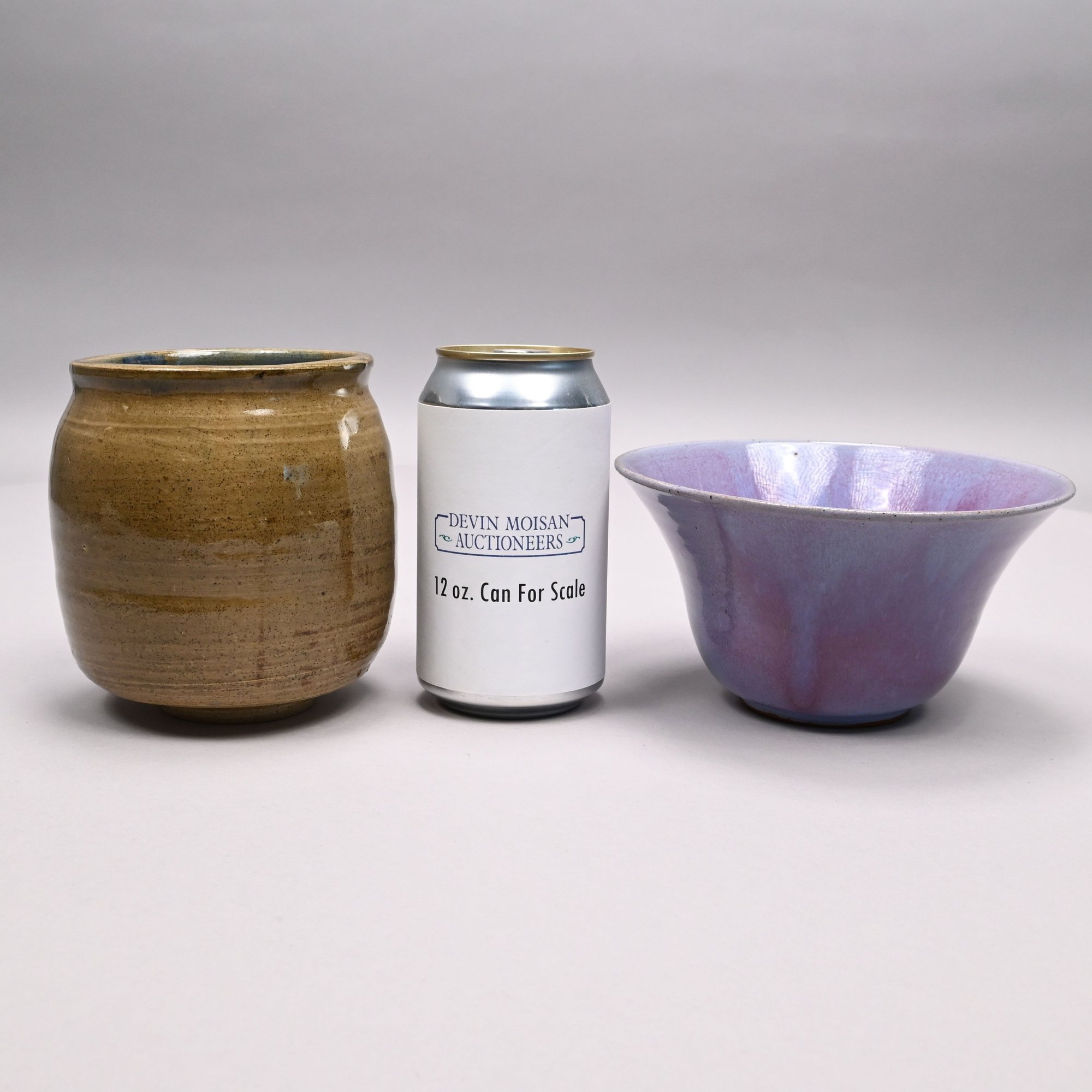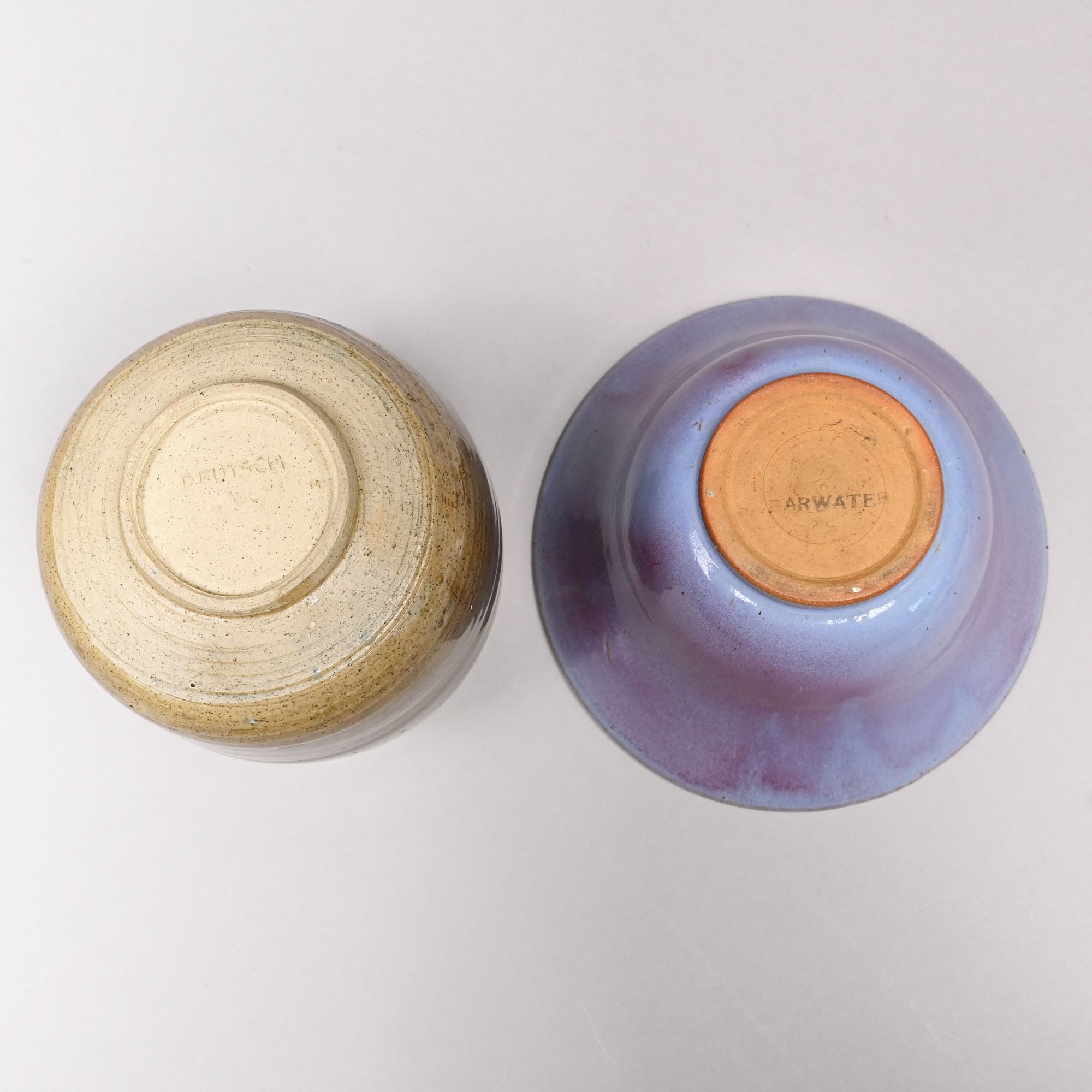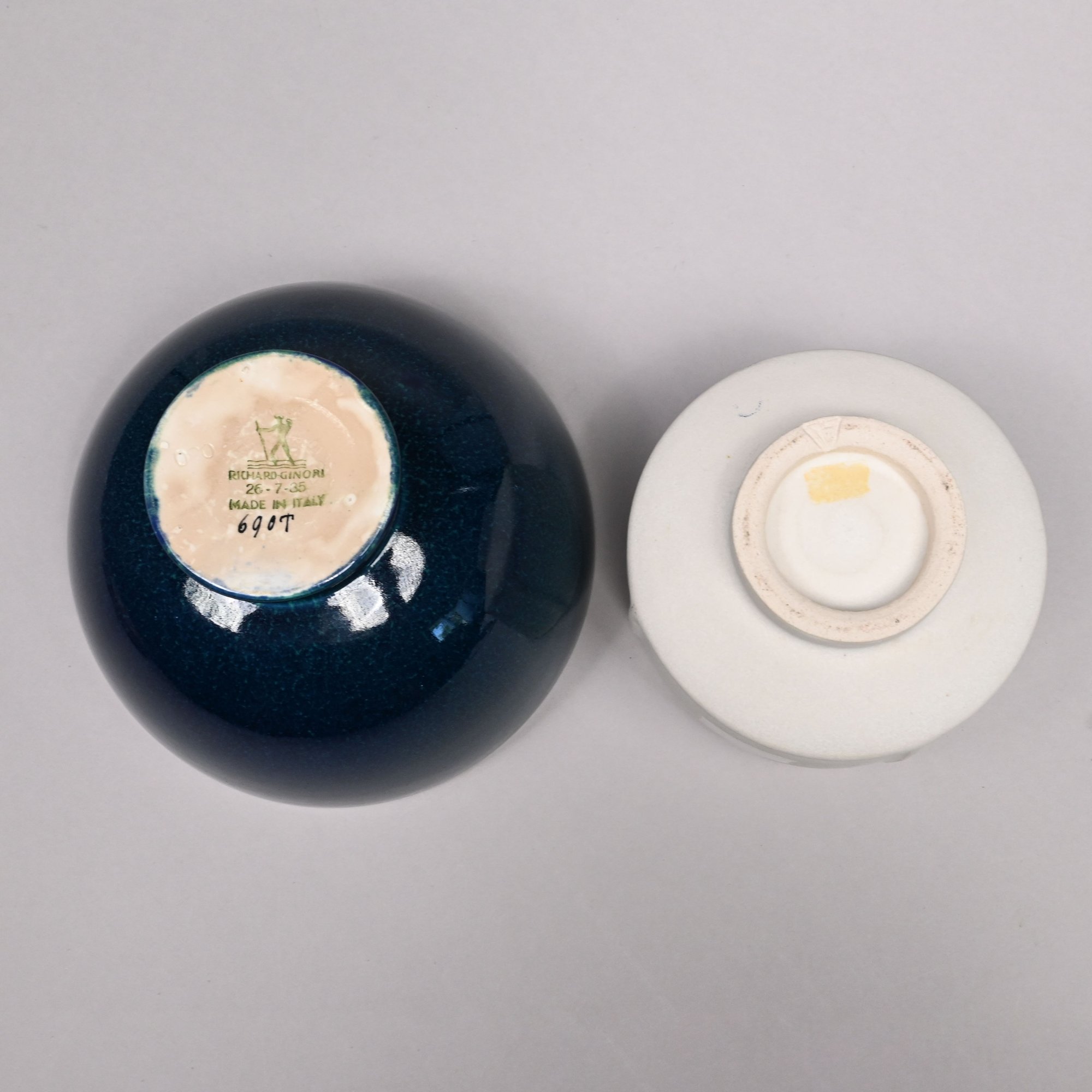 Six Studio and Contemporary Ceramic Vessels, 20th Century. Comprising a Shearwater Pottery bowl, circa 1935, by Peter Anderson (1901-1984), in shaded lavender high glaze, "SHEARWATER" mark printed in black; and a turned stoneware vase in green-brown glaze, the interior in blue, incised "DEUTSCH;" a Christa Assad (b. Pittsburgh, Pennsylvania, 1970) vase in white glaze, impressed "CA" triangle mark; an Earthborn, Leeds, Alabama red stoneware oval dish in "Hazel" glaze, impressed mark; a glazed stoneware leaf-shaped dish, incised "Beck;" and a Richard Ginori footed bowl in indigo glaze, Italia mark "RICHARD GINORI/ 26-7-35/ MADE IN ITALY" and handwritten "690 T."
