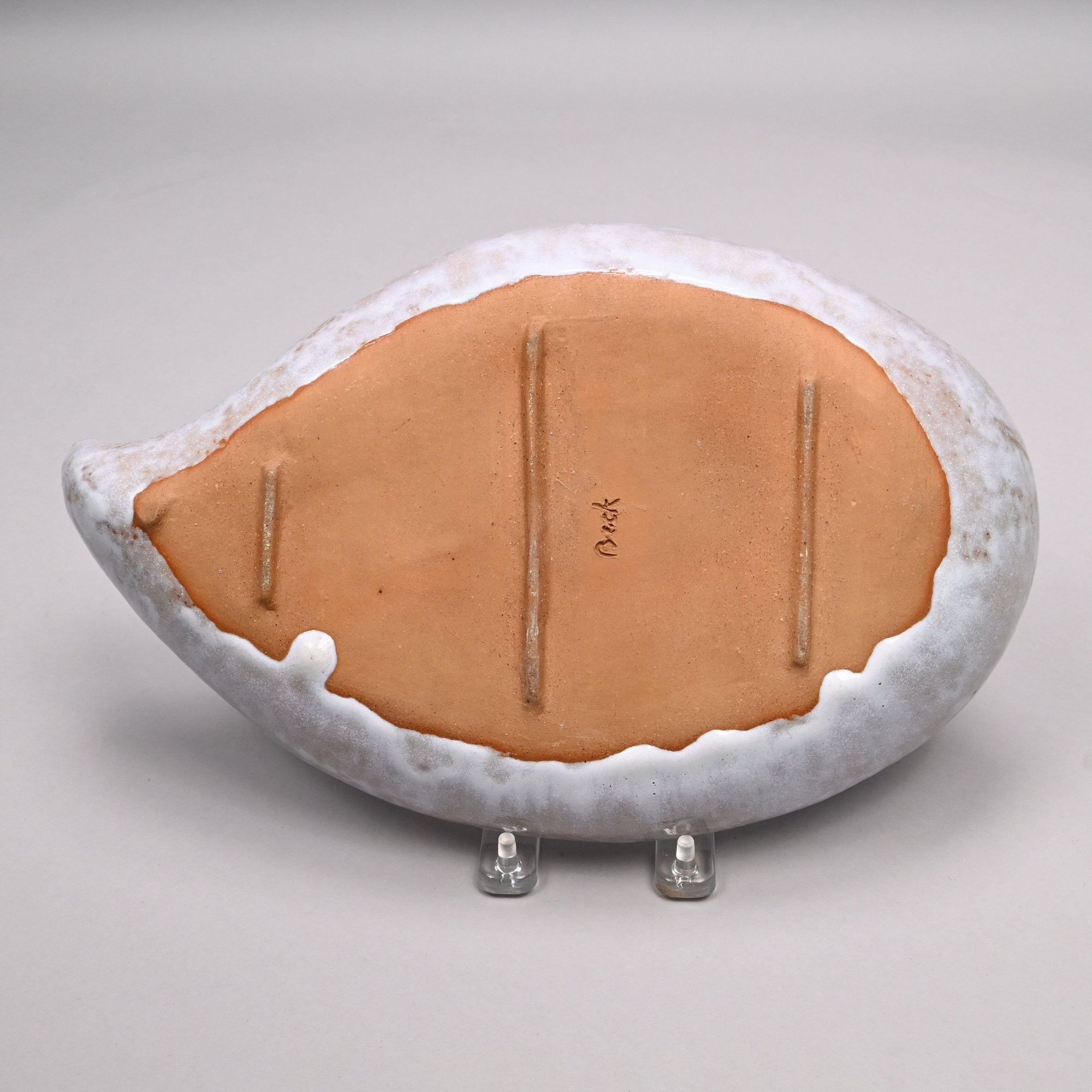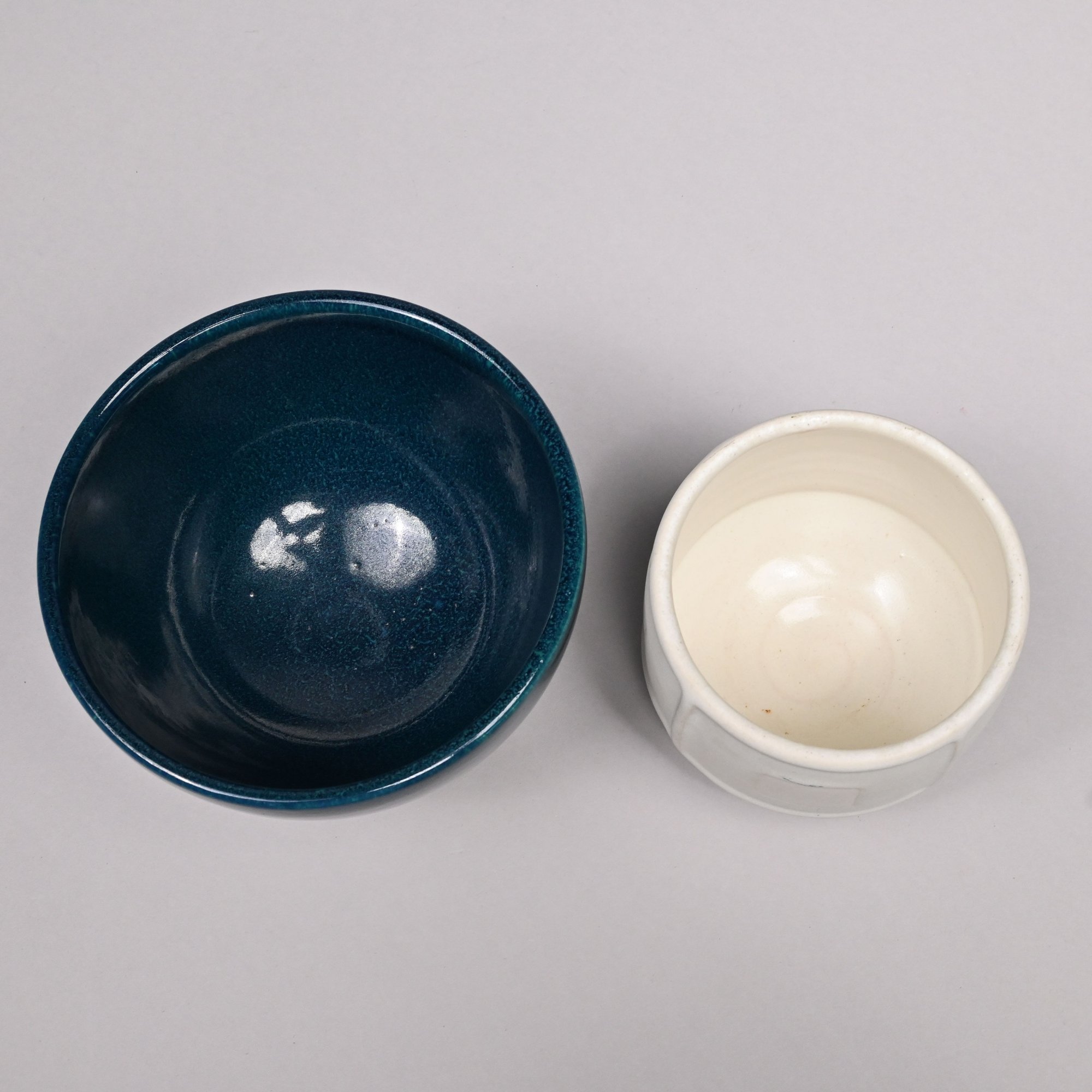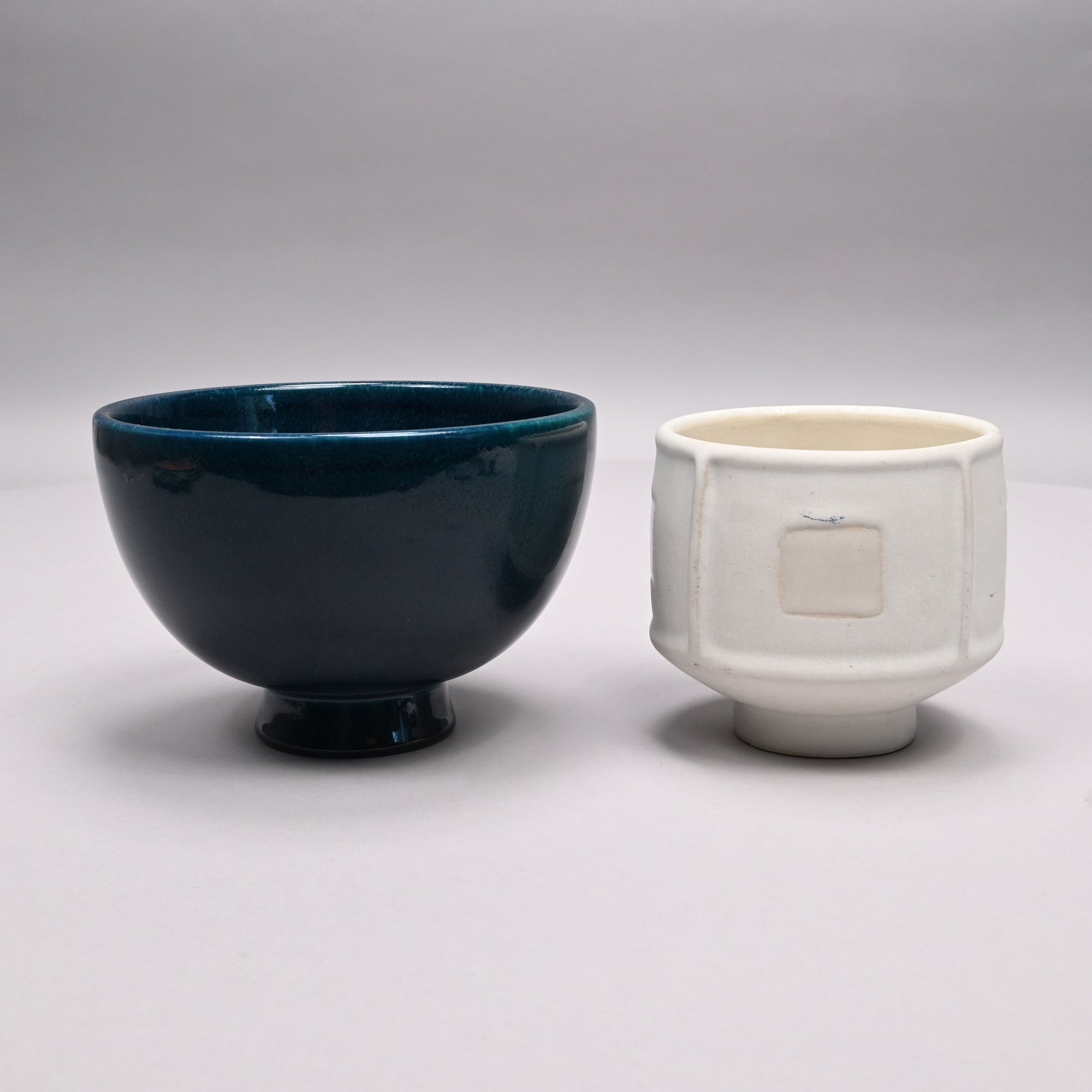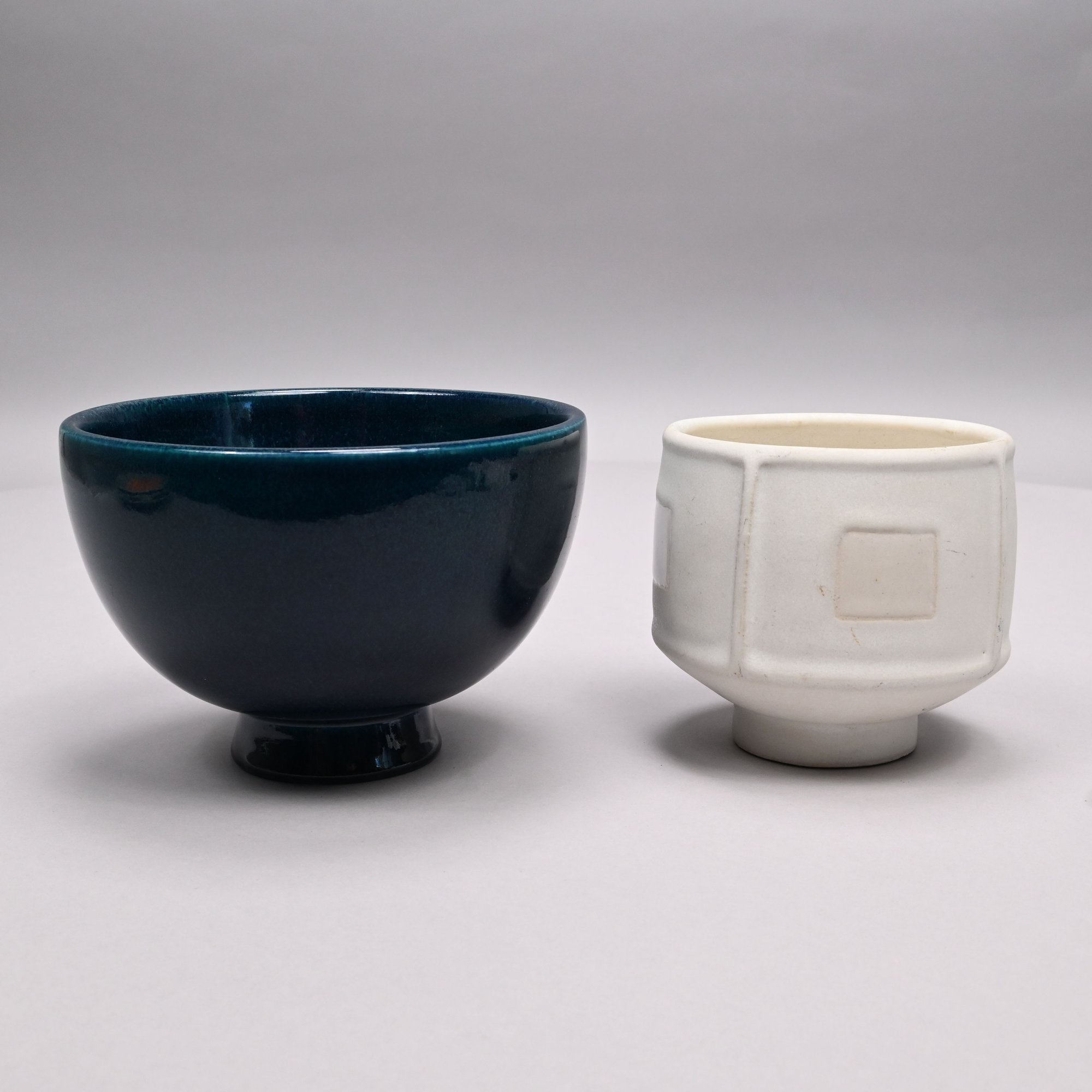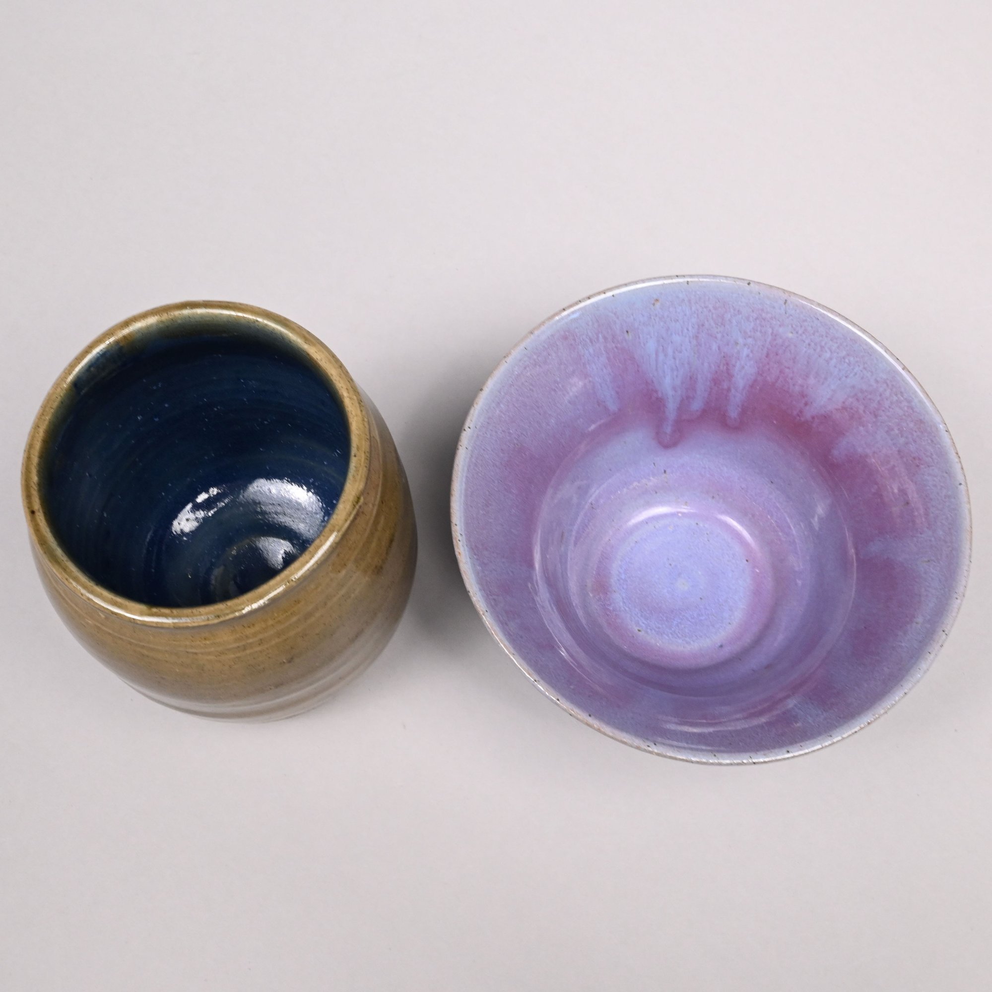 Six Studio and Contemporary Ceramic Vessels, 20th Century. Comprising a Shearwater Pottery bowl, circa 1935, by Peter Anderson (1901-1984), in shaded lavender high glaze, "SHEARWATER" mark printed in black; and a turned stoneware vase in green-brown glaze, the interior in blue, incised "DEUTSCH;" a Christa Assad (b. Pittsburgh, Pennsylvania, 1970) vase in white glaze, impressed "CA" triangle mark; an Earthborn, Leeds, Alabama red stoneware oval dish in "Hazel" glaze, impressed mark; a glazed stoneware leaf-shaped dish, incised "Beck;" and a Richard Ginori footed bowl in indigo glaze, Italia mark "RICHARD GINORI/ 26-7-35/ MADE IN ITALY" and handwritten "690 T."