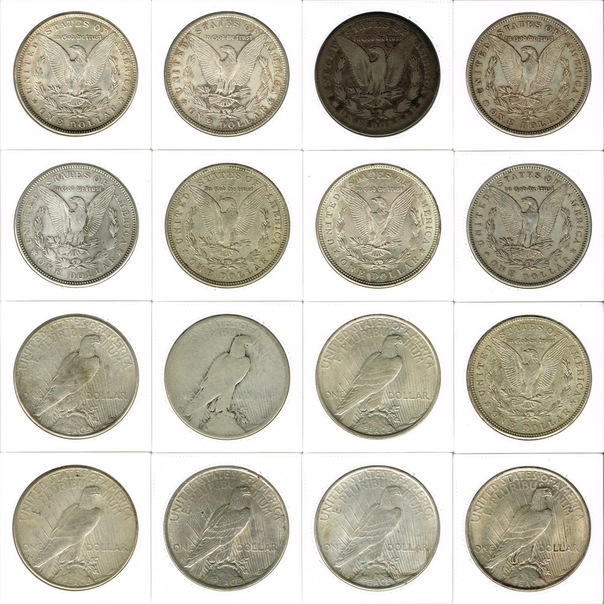 Sixteen Morgan and Peace United States Silver Dollars. Including 1880-S; 1881-S; 1883-O; 1889; 1893; 1921; 1921-D (3) Morgan silver dollars and 1922; 1922-D; 1922-S; 1923 (3); 1926-S Peace silver dollars.