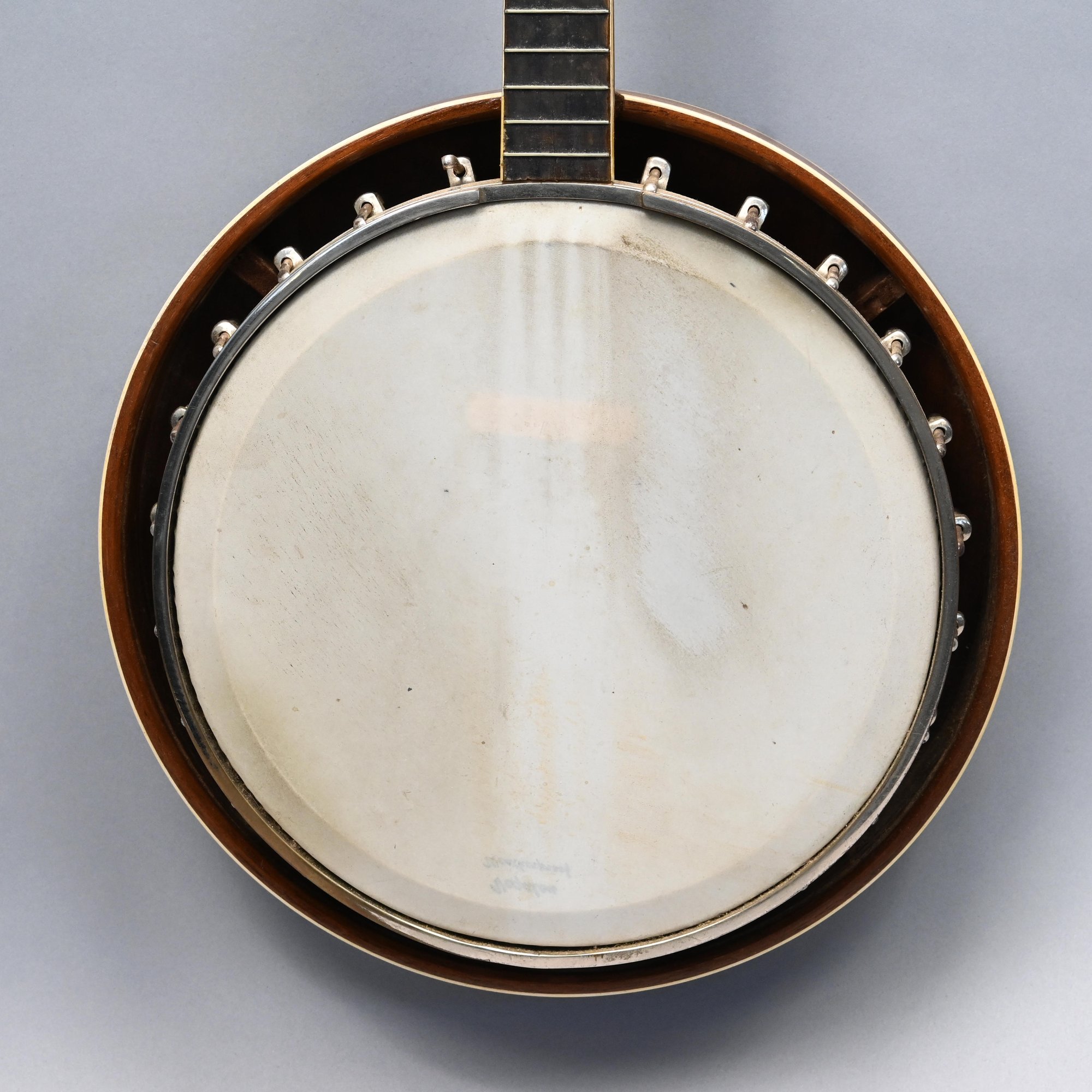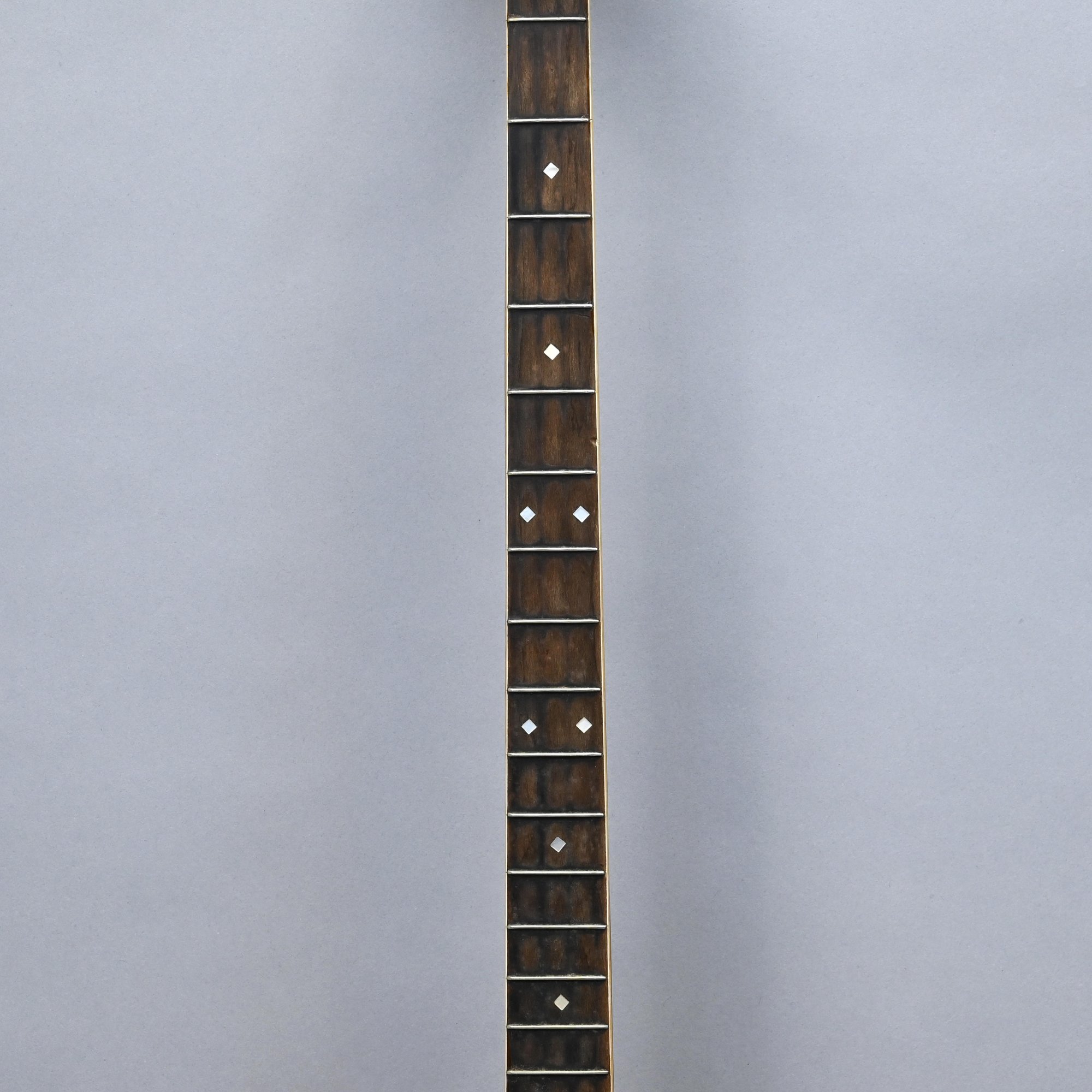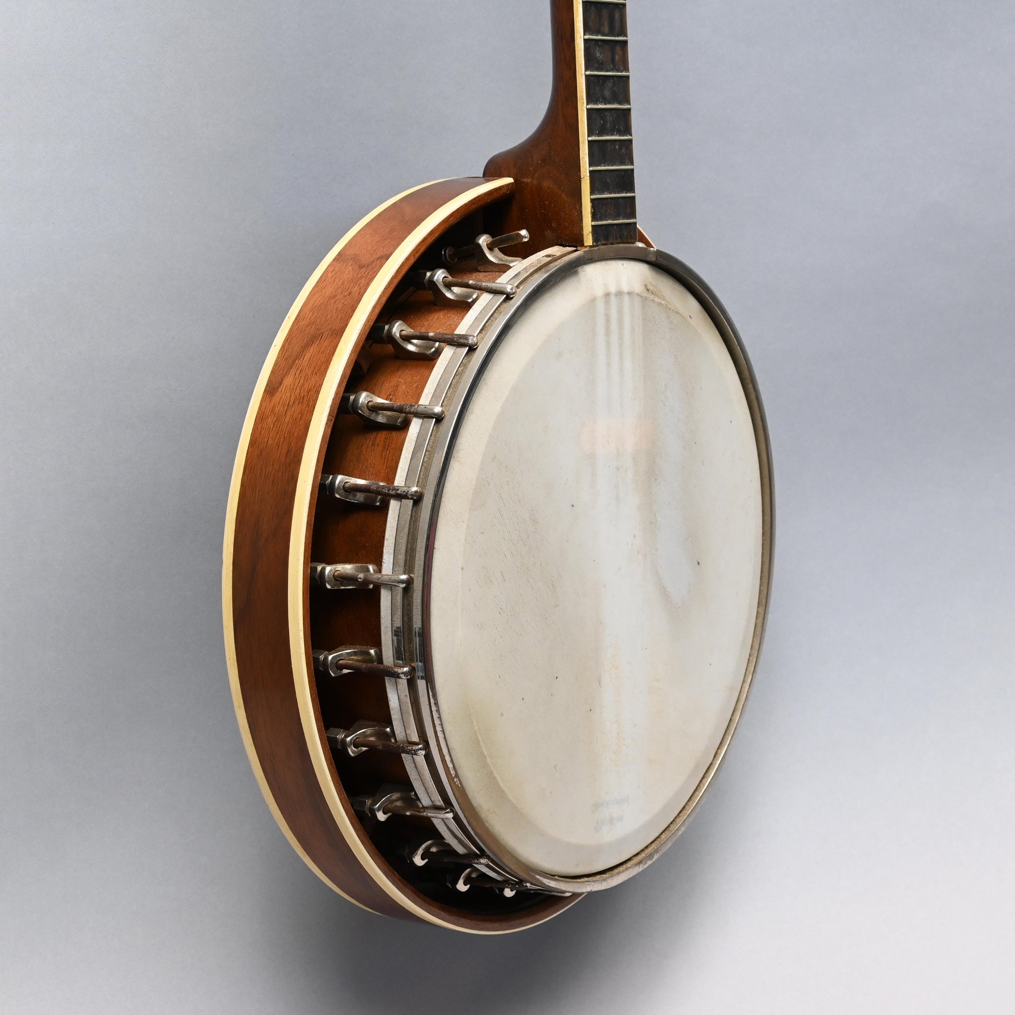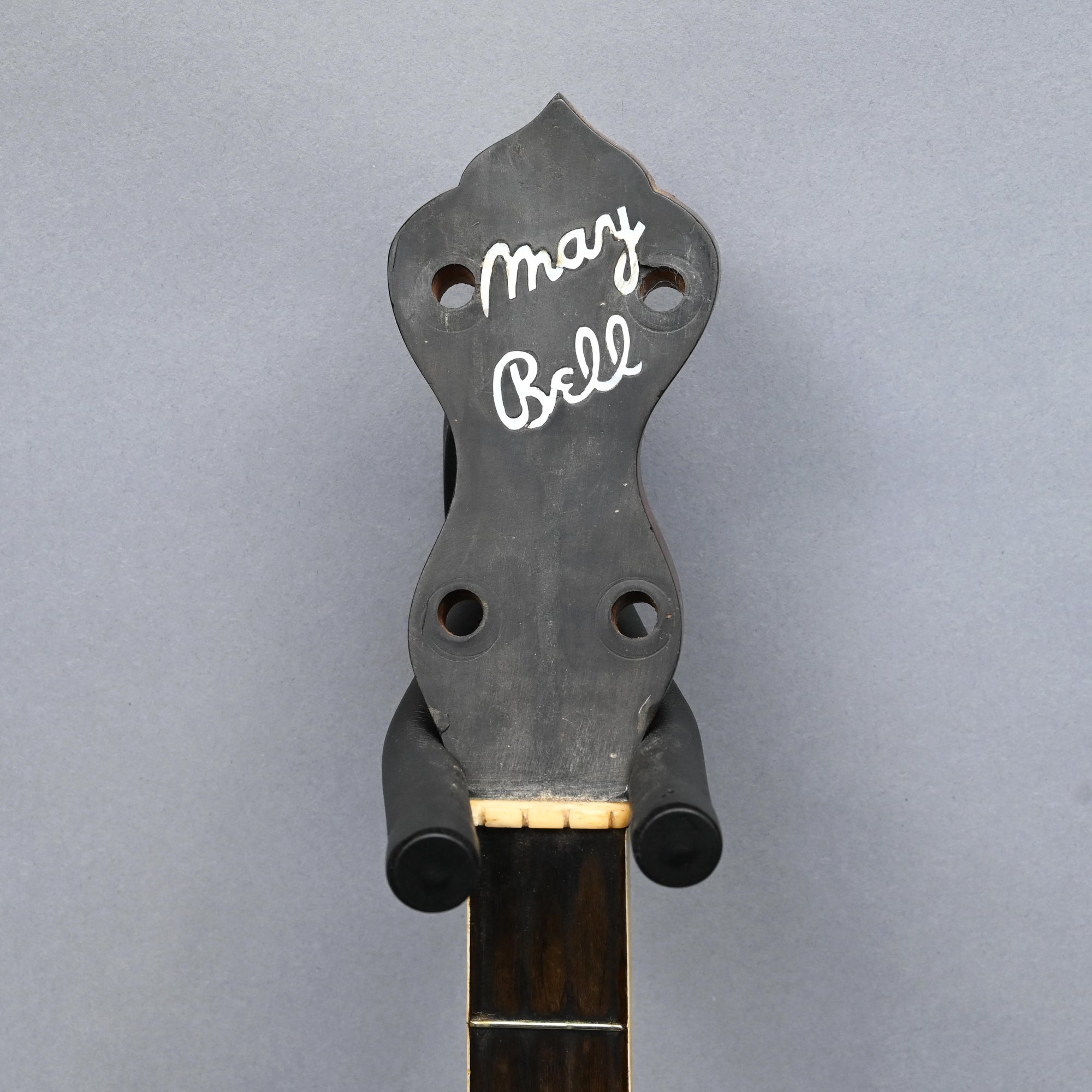 Slingerland May Bell Rosewood, Walnut and Mother-of-Pearl inlaid 23-Fret Four-String (Plectrum) Resonator Tenor Banjo, 1920-40. Inlaid in mother-of-pearl on the peghead "May Bell," the drum head marked, together with one Black Diamond String steel 1st loop end 720 1/2, one Black Diamond 2nd steel n. 721 string, one Black Diamond String steel 2nd loop end 721 1/2, one Black Diamond String wound on steel 4th, and one Gibson Plectrum and 5-String banjo C or 4th-Wound strings; housed in a hardshell case.