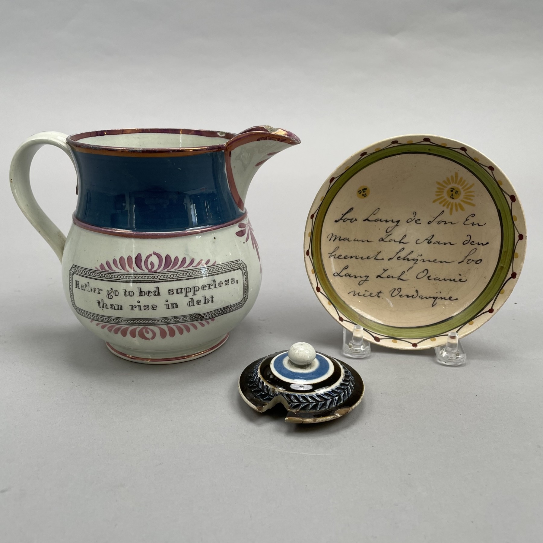 Transfer-printed on one side with the motto "Rather go to bed supperless, than rise in debt," and on the other side with a poem regarding friendship. H: 4.75 in. Together with a French saucer painted with a poem, and a British pearlware mochaware rouletted mustard jar cover, circa 1800, diam. of inner rim 1.75 in. (3)