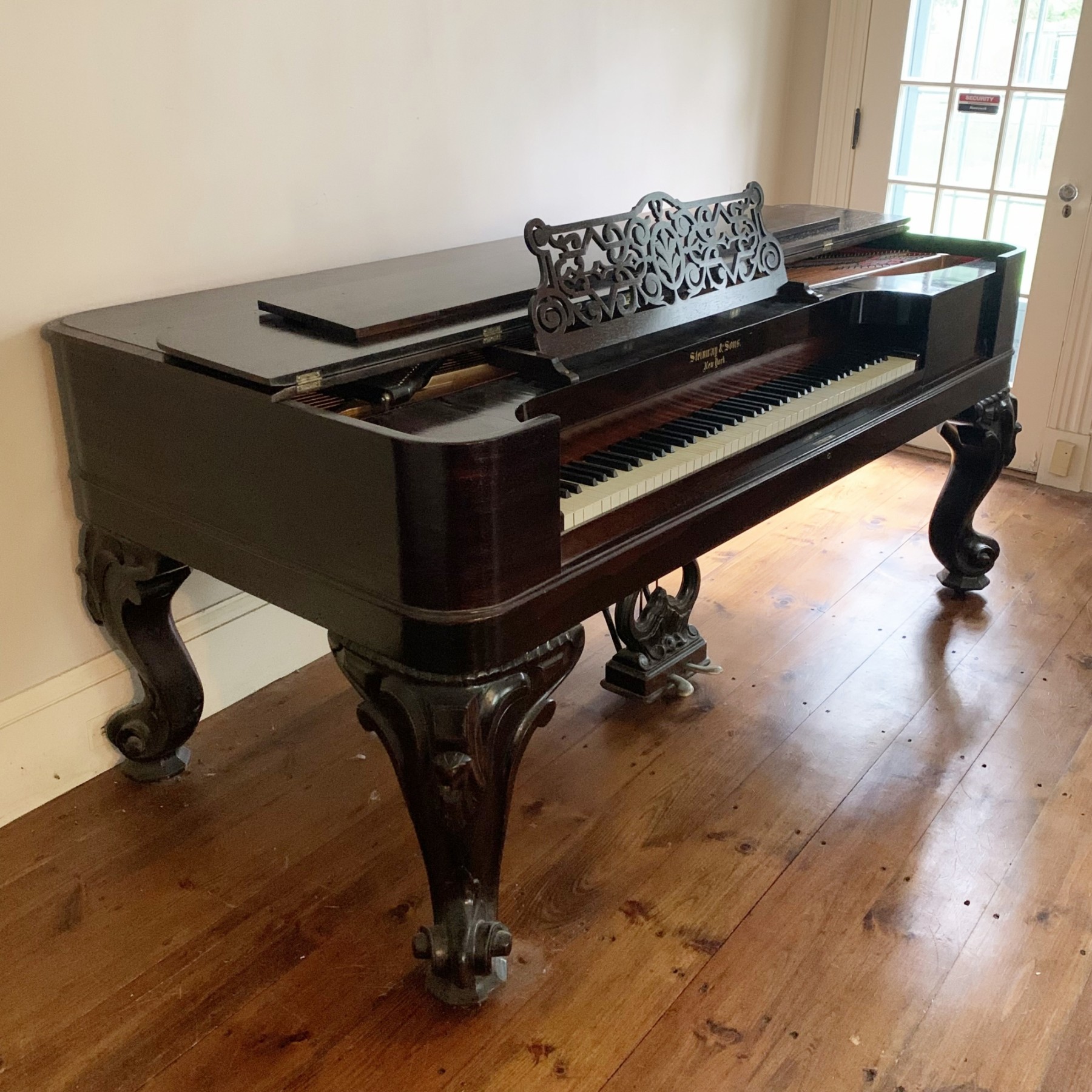 The oblong hinged lid with rounded corners and molded edge opening to a cast brass plate labeled "Steinway & Sons, New York, Pat. Nov. 29, 1859," raised on heavily carved cabriole legs terminating in scrolled feet, on casters. Piano has undergone professional restoration.