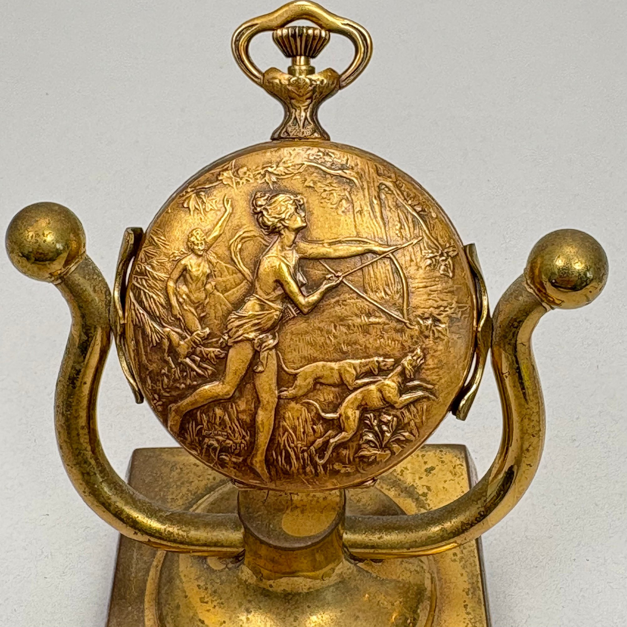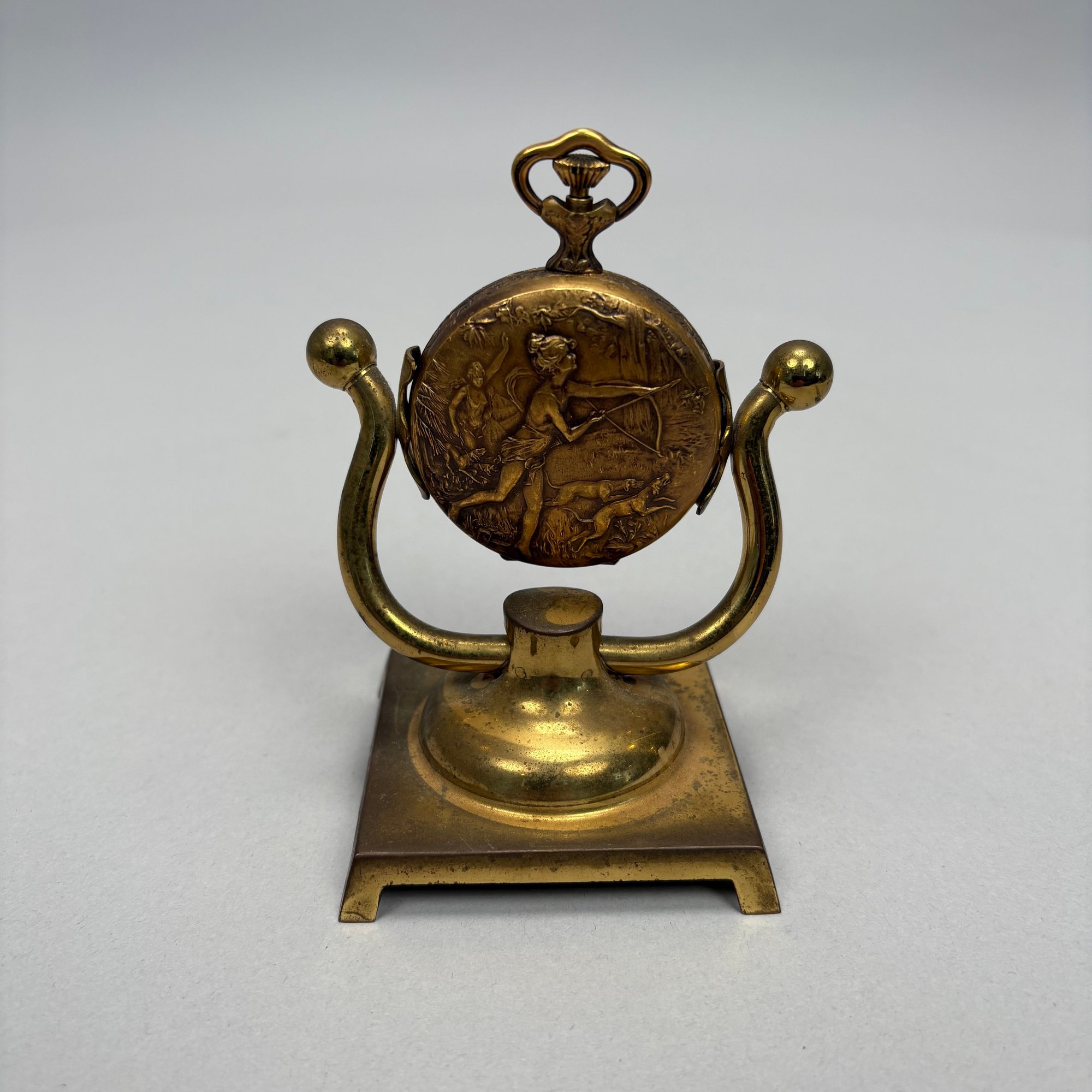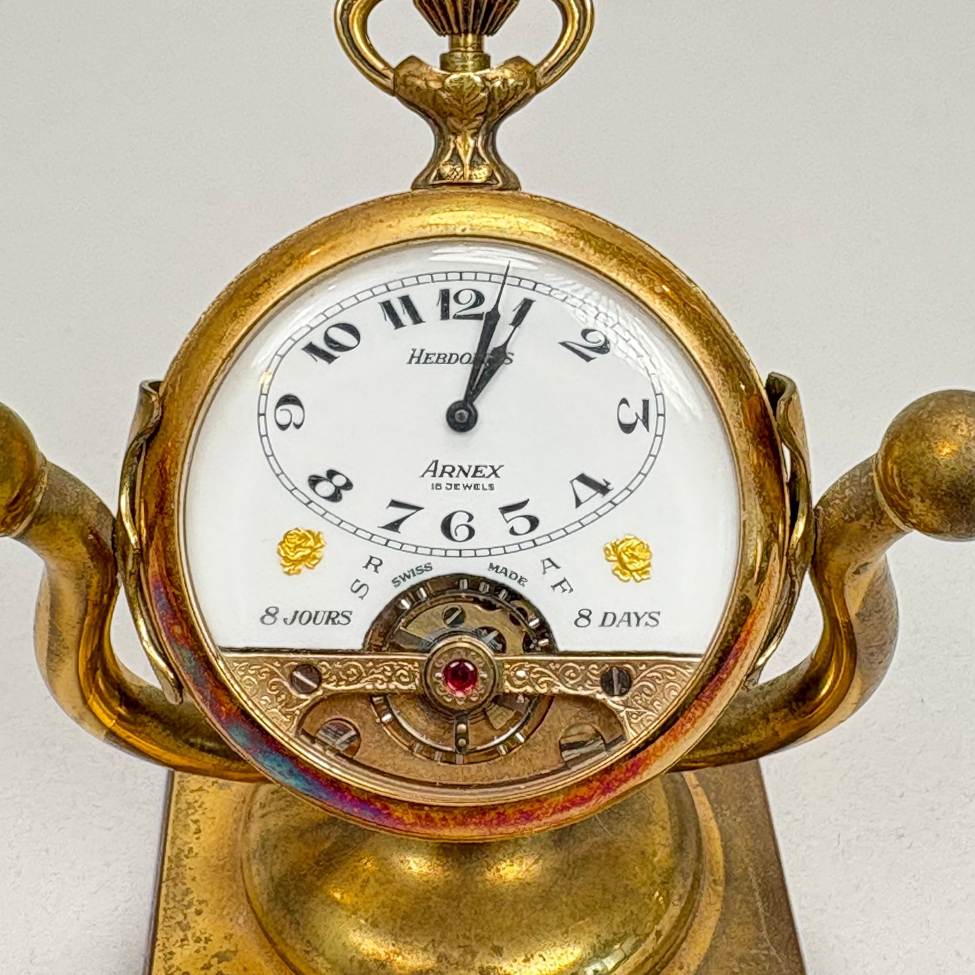 Swiss Arnex Hebdomas Pocket Watch on Stand. Eight hours, eight days, open escapement and 15 jewels, the back cover with a view of the goddess 'Diana' hunting with her hounds, marked beneath base "U.S.A. PAT. NO. 3062401/ MADE IN U.S.A." and "EB" in a circle.