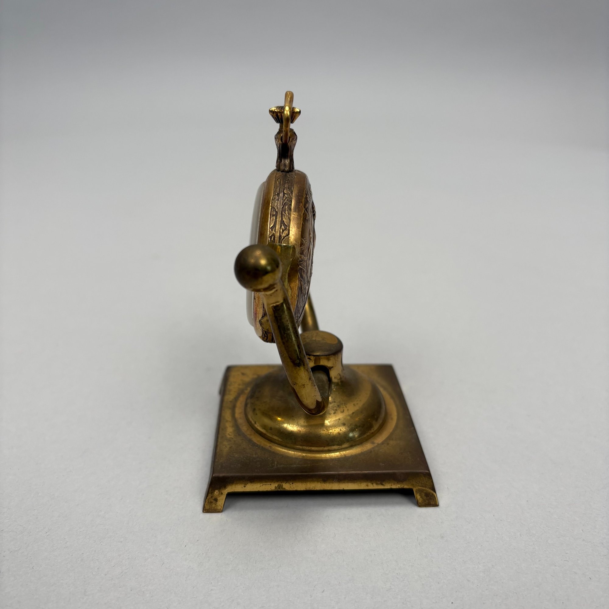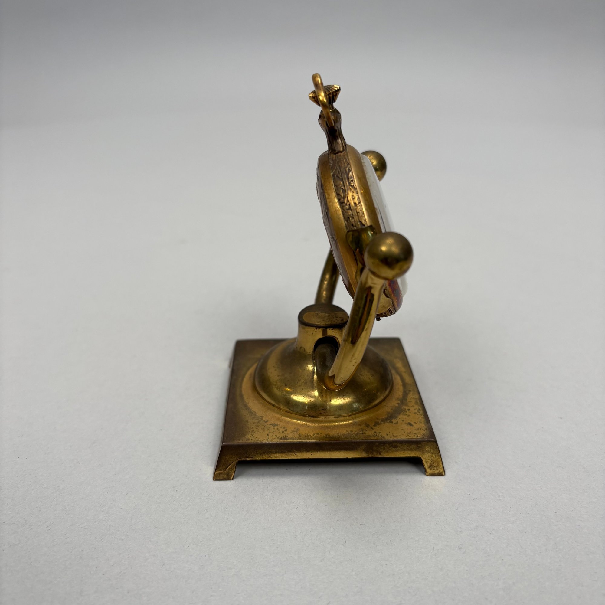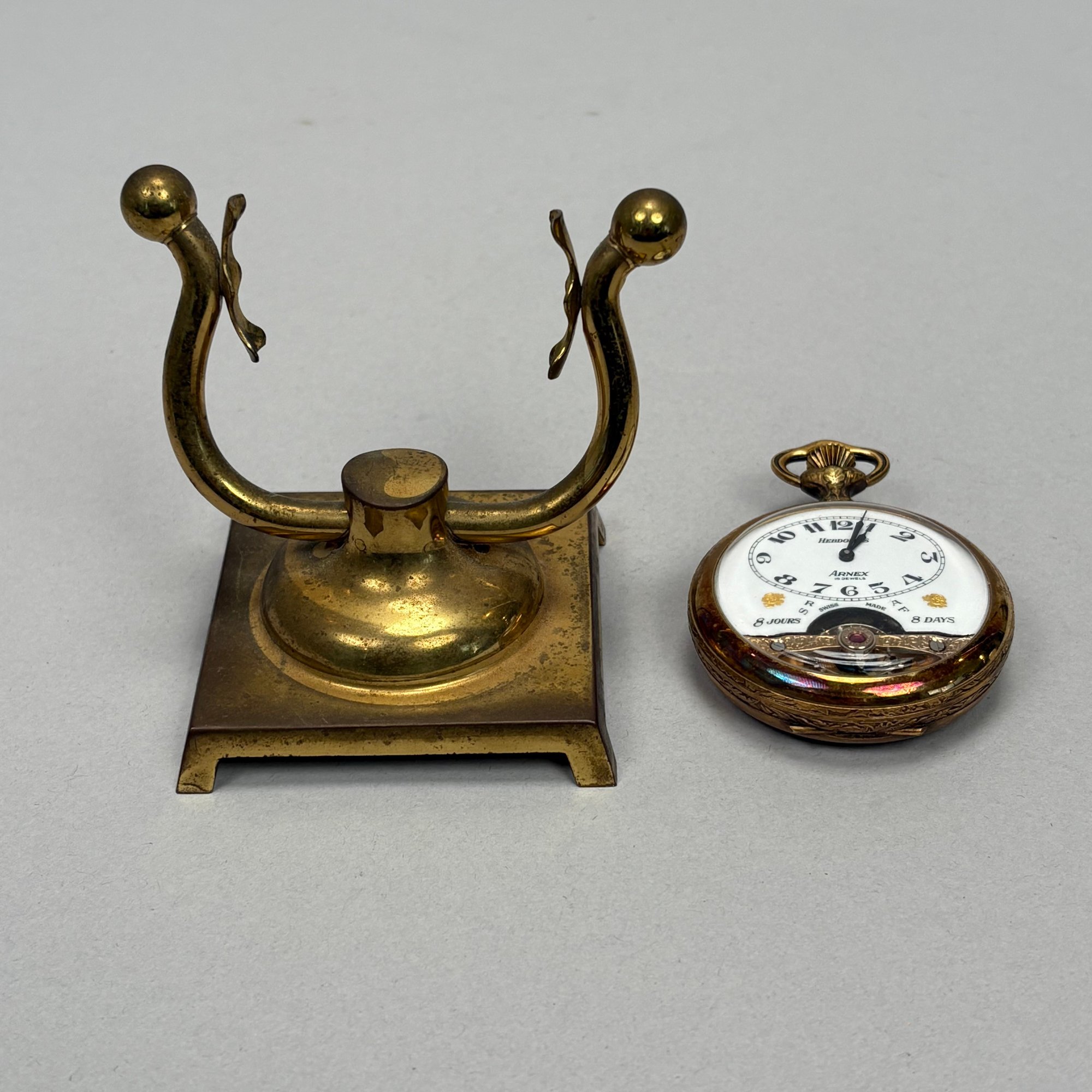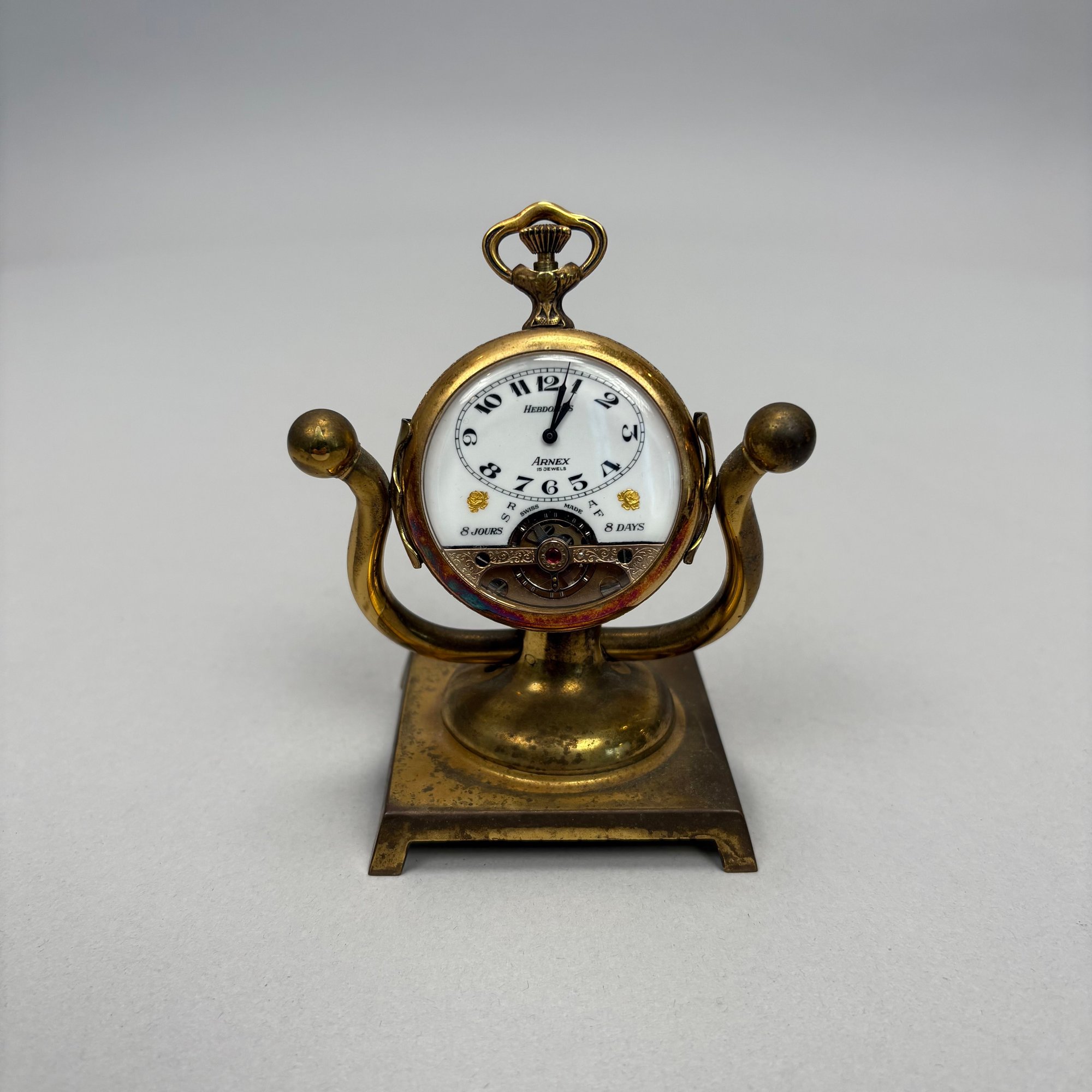 Swiss Arnex Hebdomas Pocket Watch on Stand. Eight hours, eight days, open escapement and 15 jewels, the back cover with a view of the goddess 'Diana' hunting with her hounds, marked beneath base "U.S.A. PAT. NO. 3062401/ MADE IN U.S.A." and "EB" in a circle.