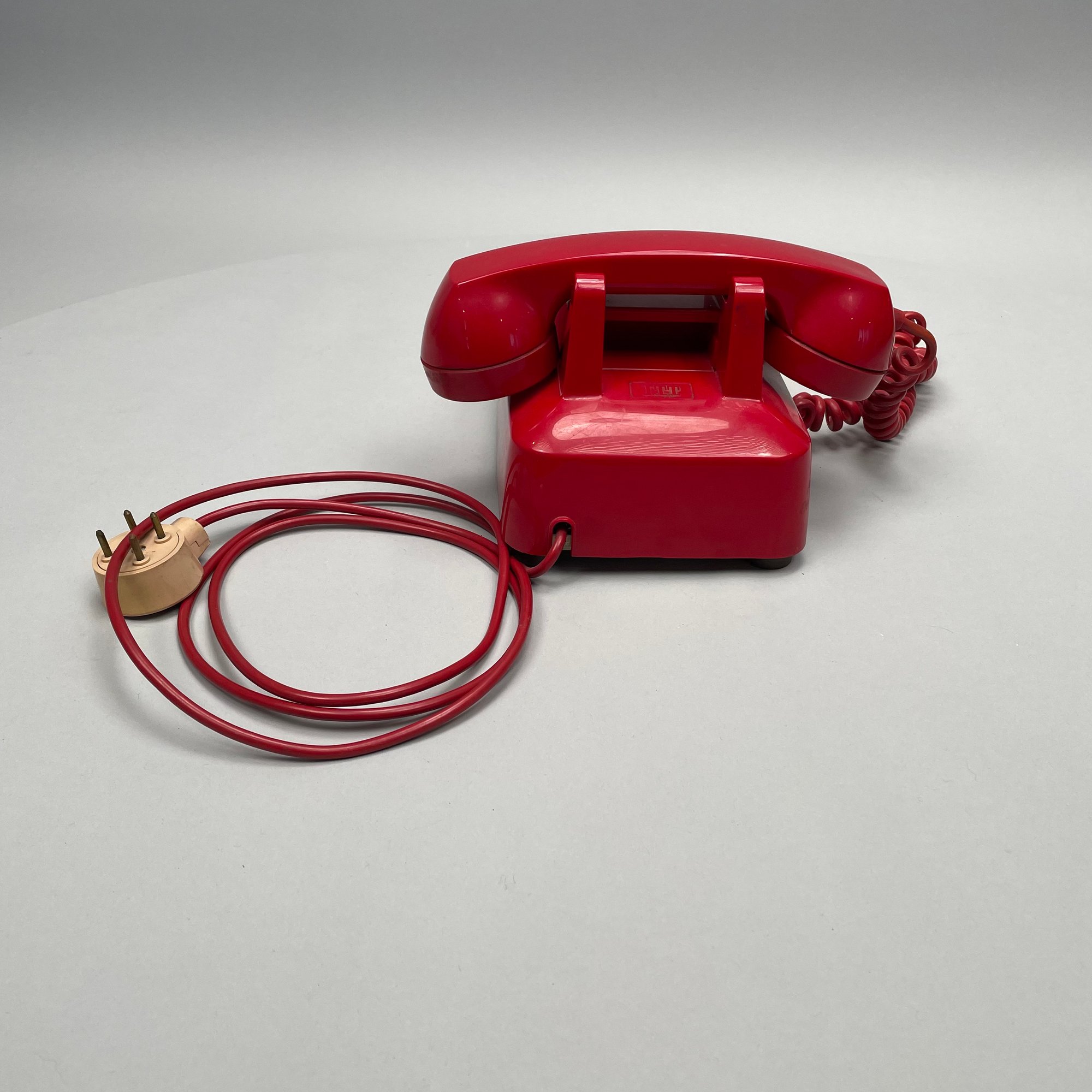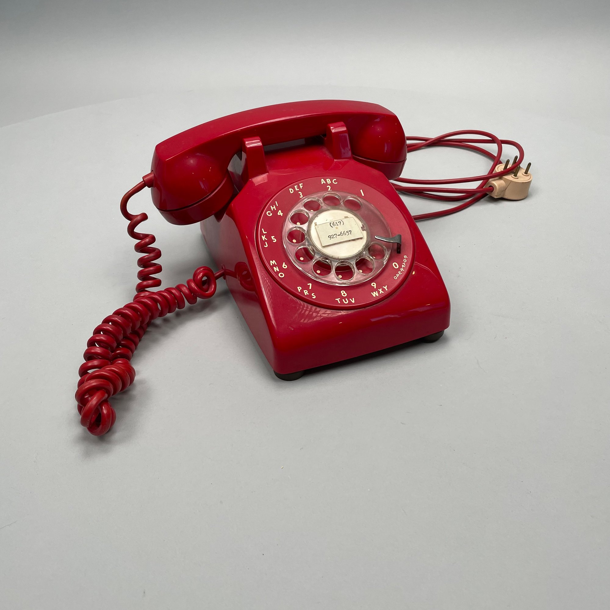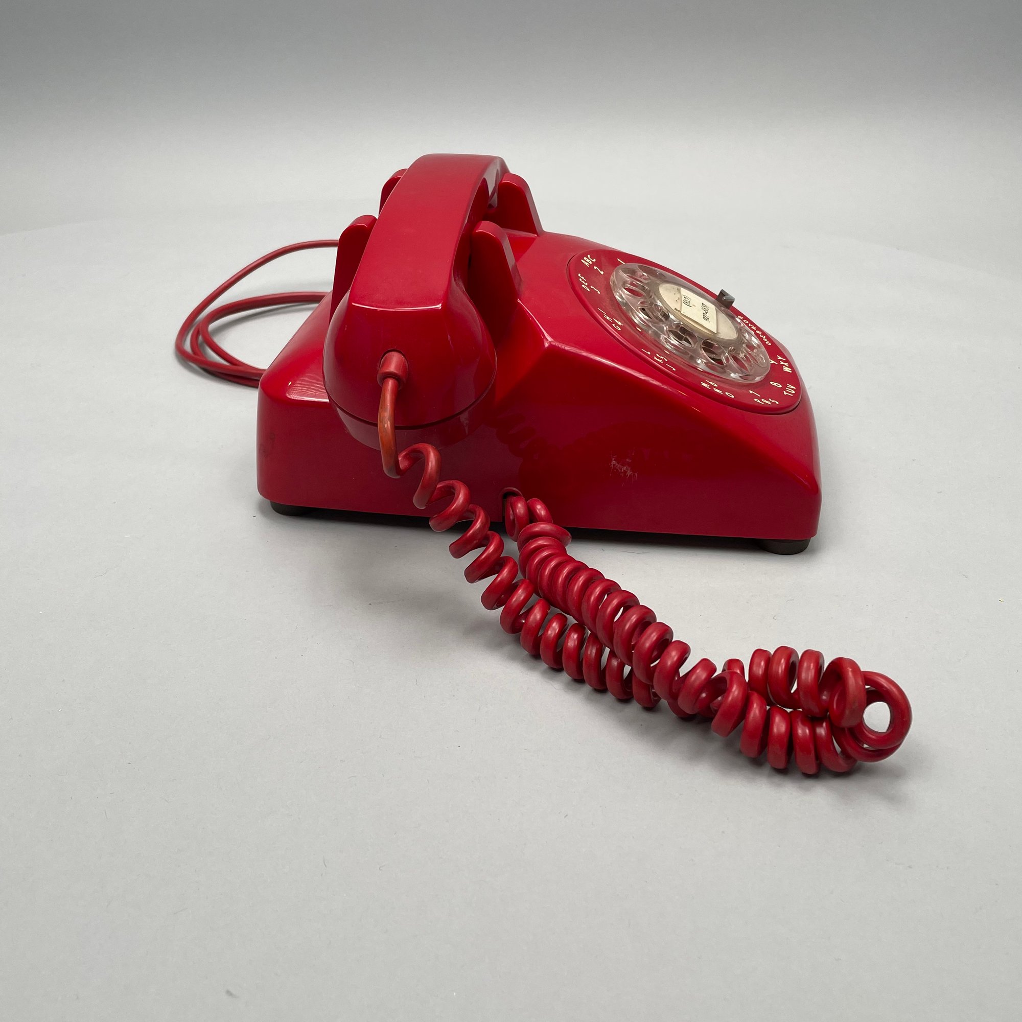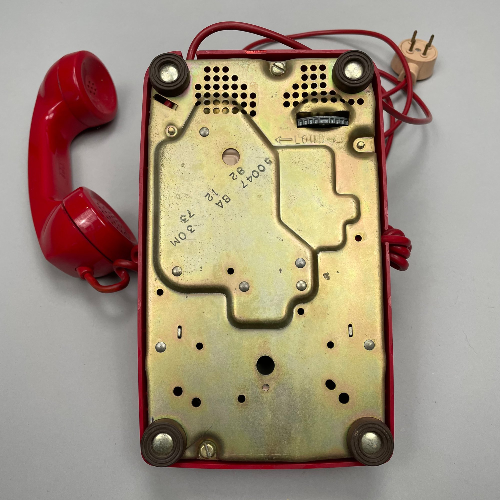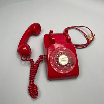 International Telephone and Telegraph Red Plastic Telephone. Marked "ITT" on the back of the shell, numbers "50047 BA 30M/ 82 12 73" underneath.
