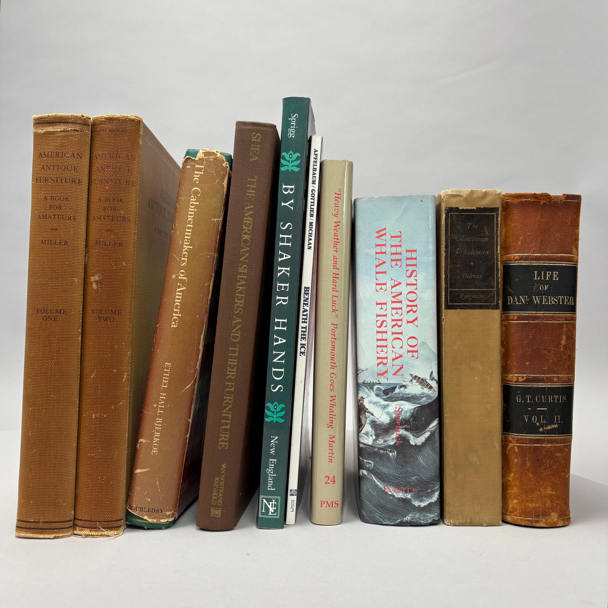 Ten Books Pertaining to Furniture, Shaker Life and Whaling. Including Edgar G. Miller, Jr., "American Antique Furniture: A Book for Amateurs," 2 vols. Baltimore: The Lord Baltimore Press, 1937; June Sprigg, "By Shaker Hands." New York: Alfred A. Knopf, Inc., 1990.