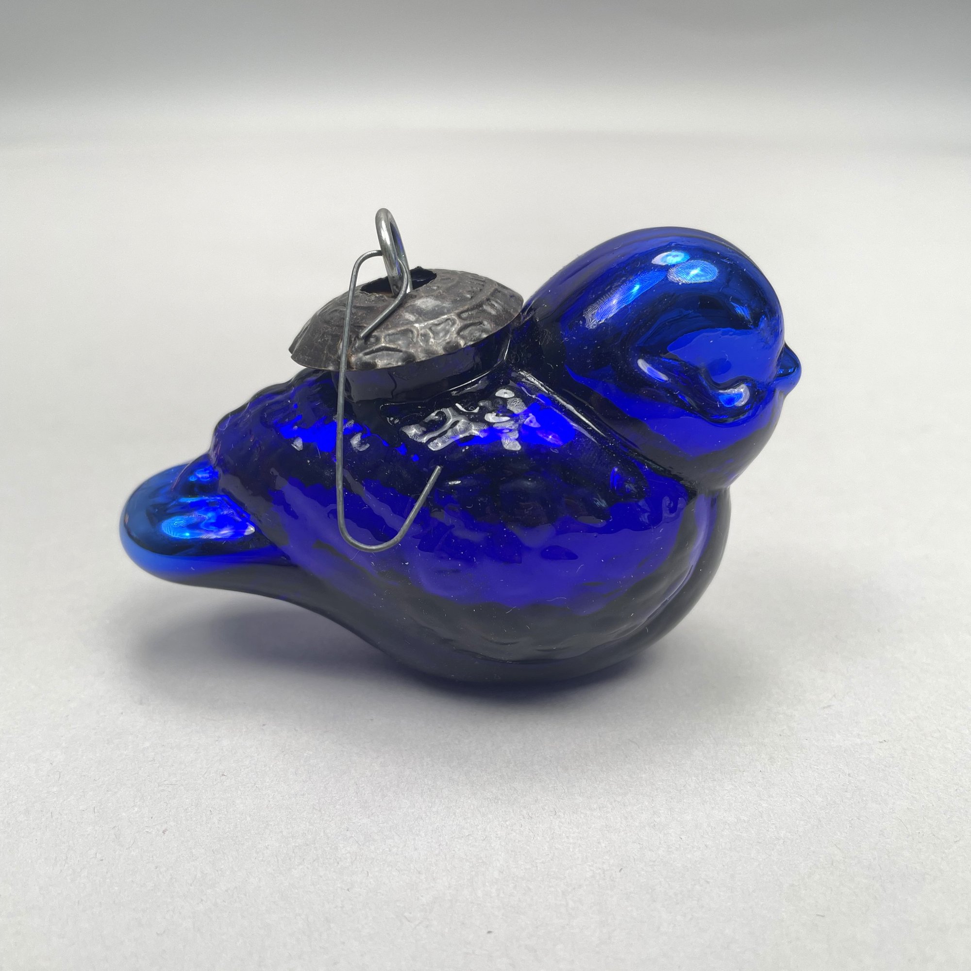 Ten Glass Kugel Christmas Ornaments, Three Midwest Kugel, Mid-20th Century. Comprising a blue songbird, two spiral kugels in gold and red, a red cluster of grapes, five balls- two orange, two green and one red, and a large lobed blue ball, the songbird, red and gold spiral each marked "MIDWEST KUGEL."