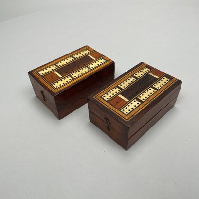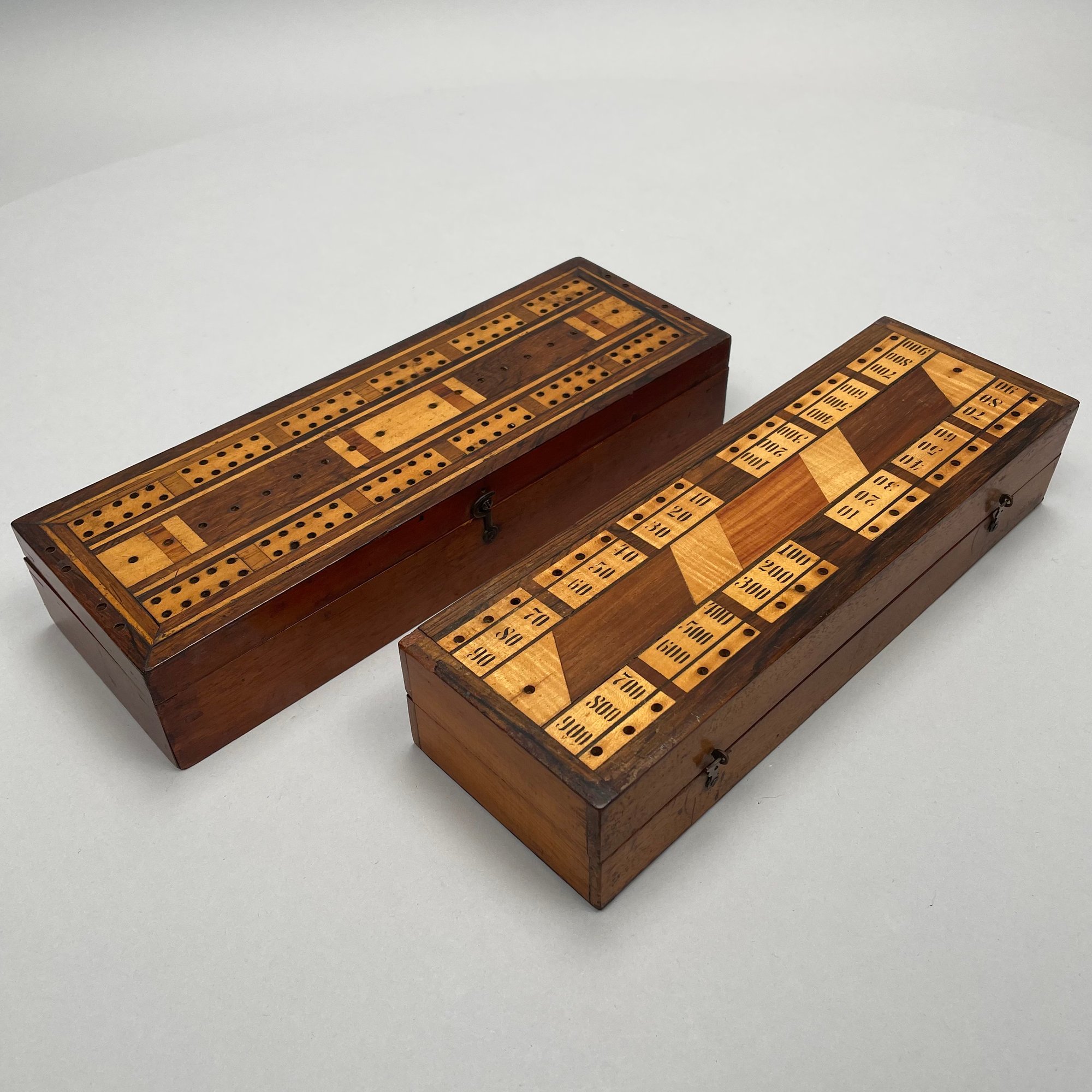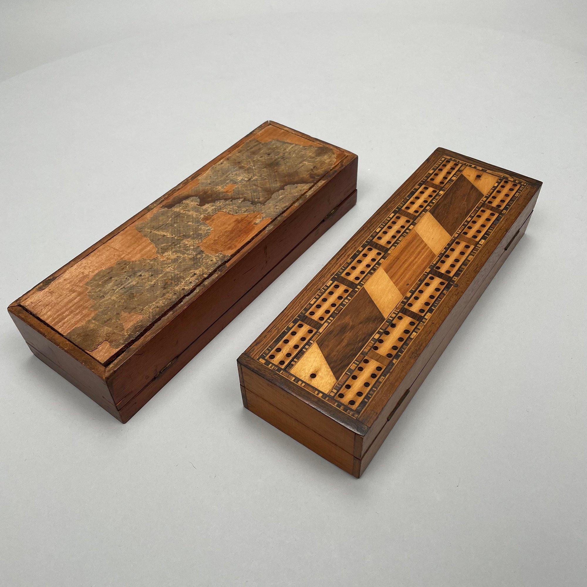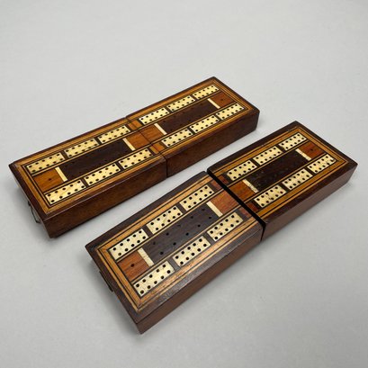 Ten Various Woods Cribbage Boards. Inlaid in various woods comprising rosewood, mahogany, teakwood and including a slate and a heavy cardboard example.