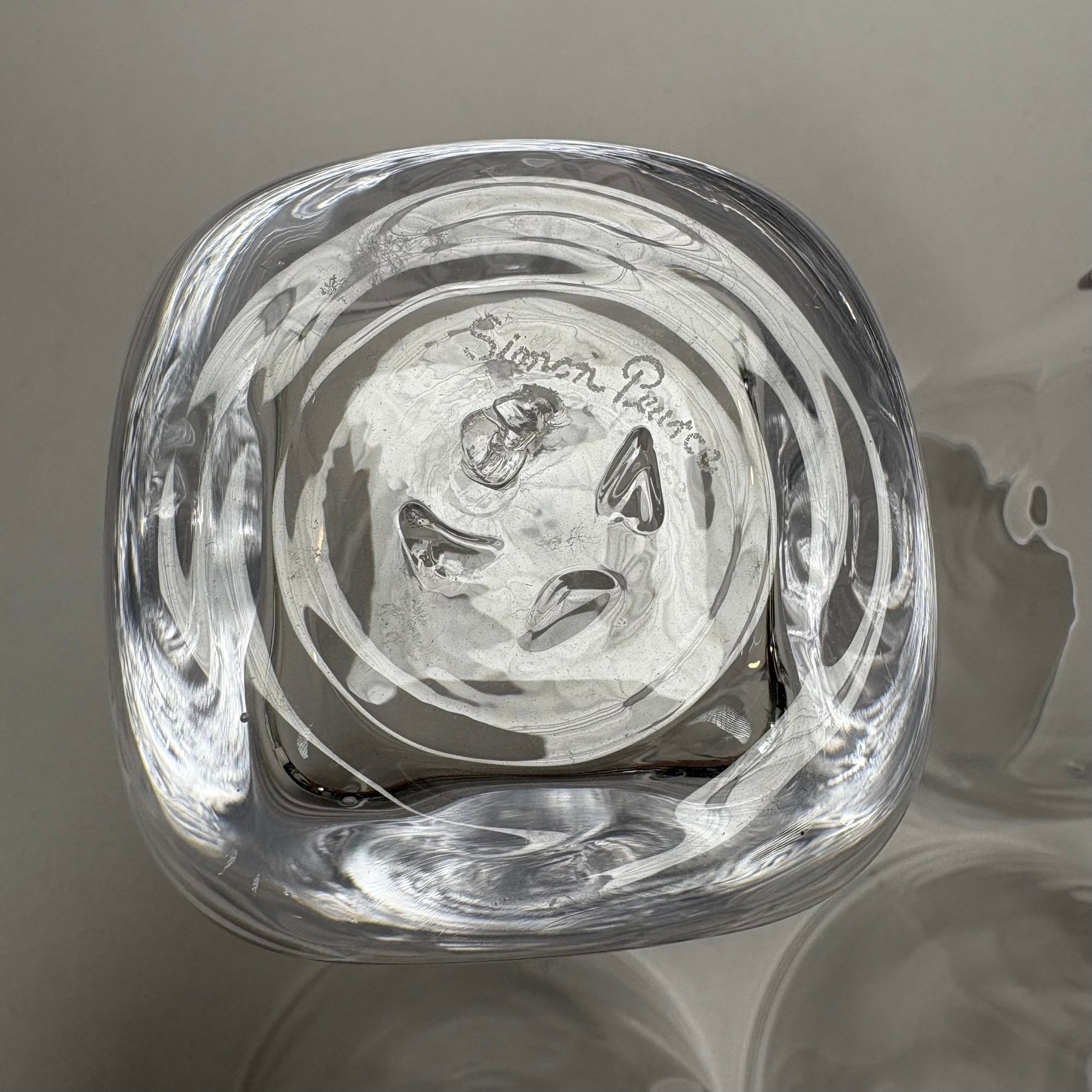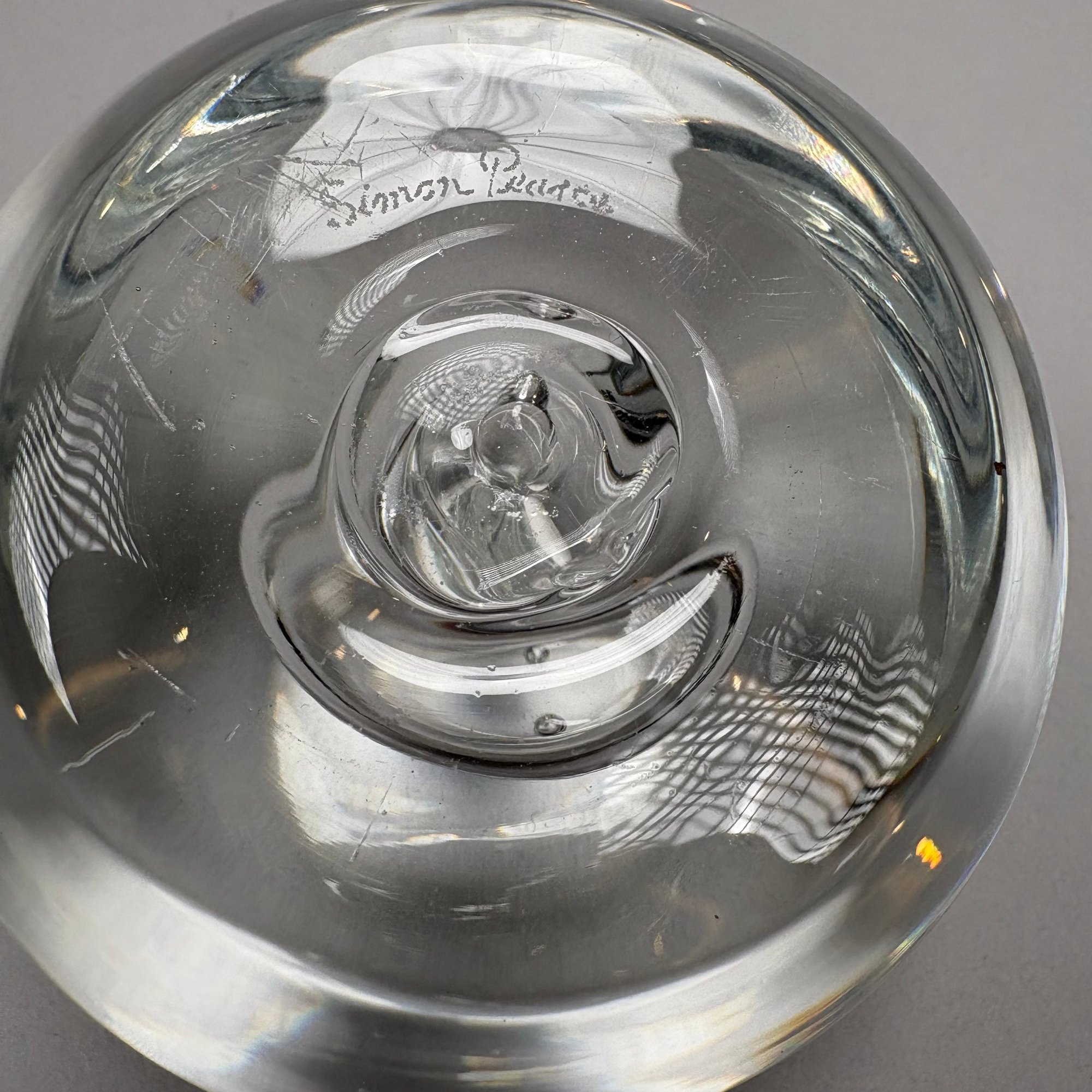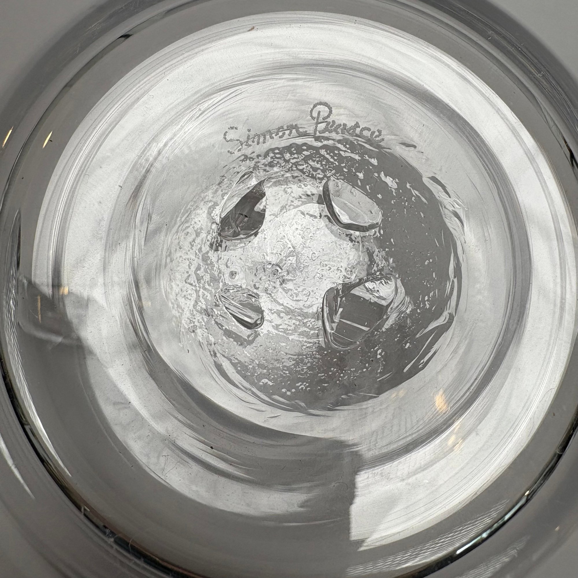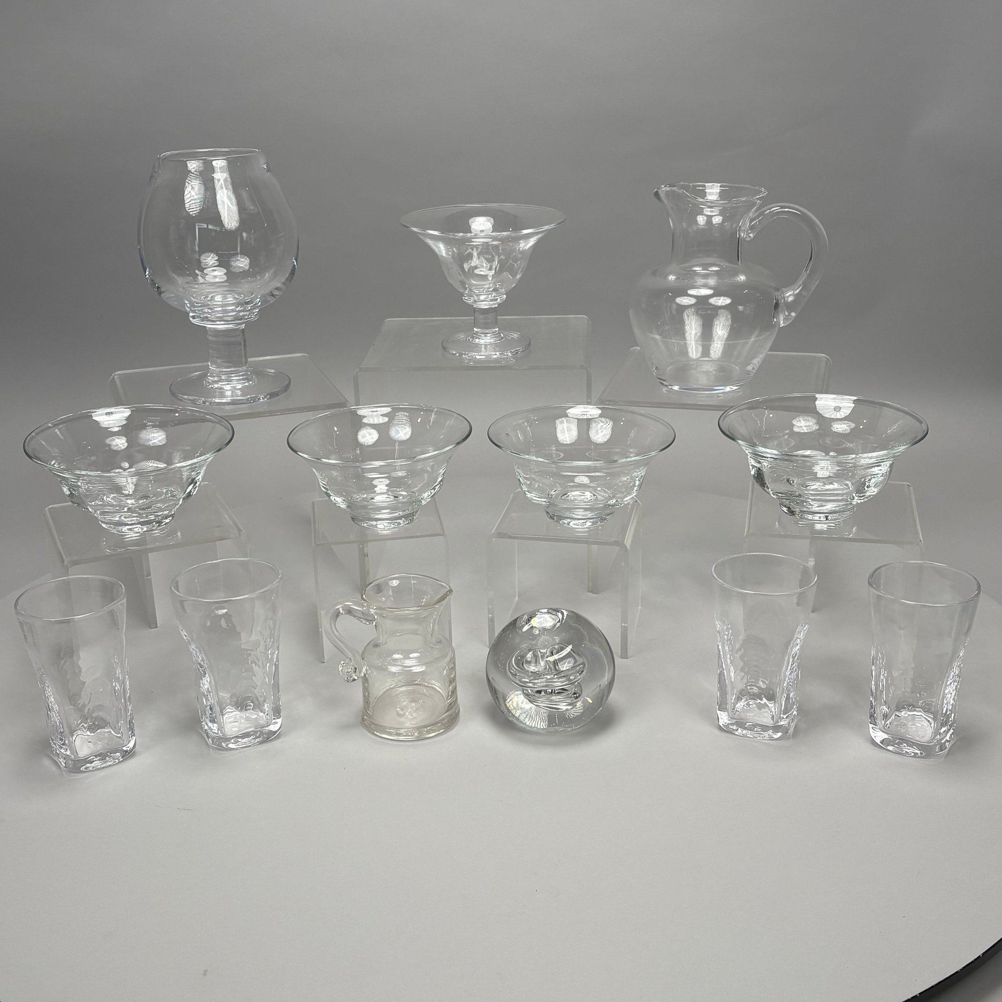 Thirteen Contemporary Simon Pearce Colorless Glass Tablewares, 20th Century. Some patterns discontinued, comprising a 4- inch PEZ3 'Windsor' pitcher (2008-2015), a 6.625- inch 'Meriden' pitcher (2008-2015), four Woodbury 5- inch glasses, four 'Shelburne' 5.875- inch bowls and a footed pedestal bowl, an 8- inch PEZ8 open hurricane vase and a paperweight, all but the paperweight acid-etched "Simon Pearce" with four-part pontil mark, the paperweight acid-etched "Simon Pearce."