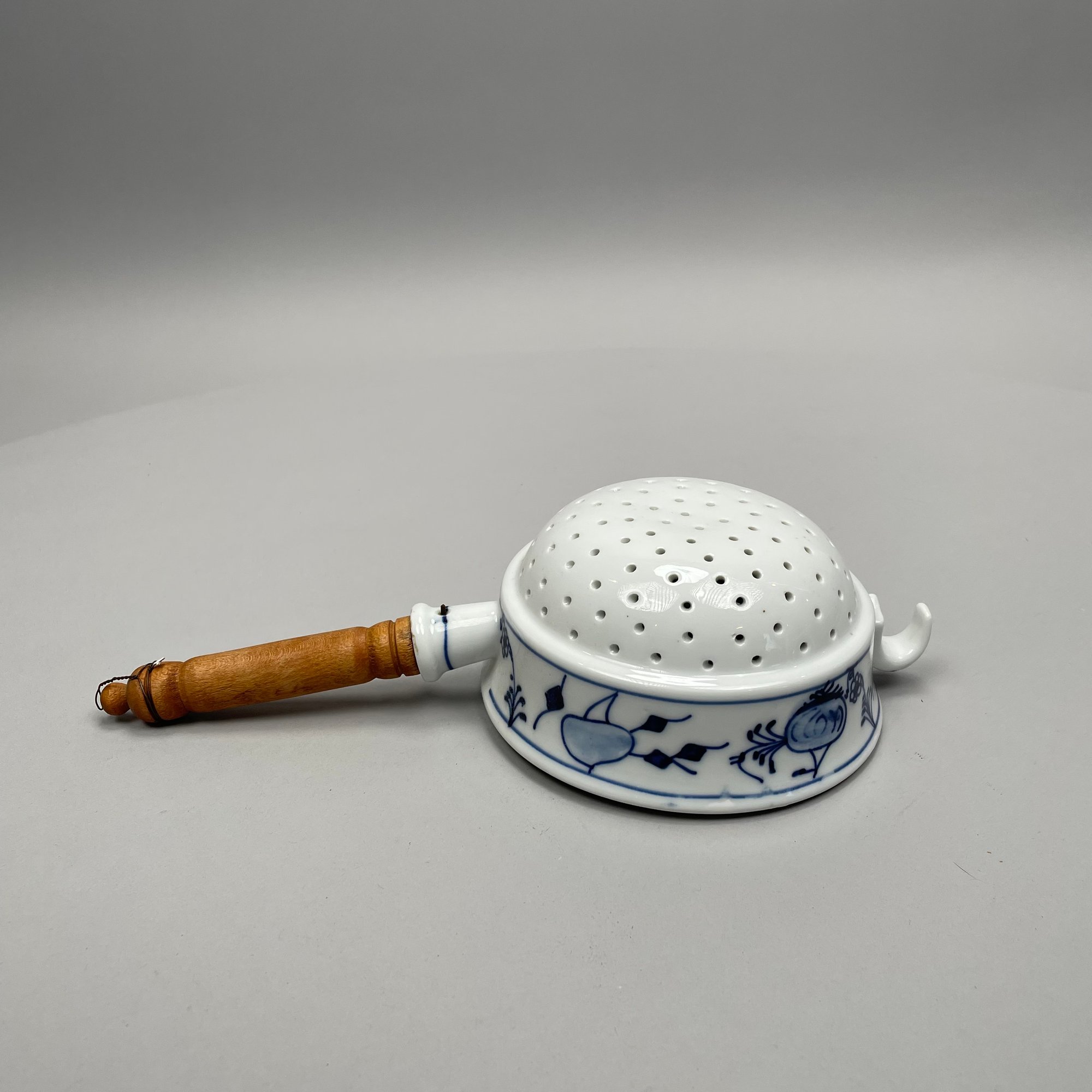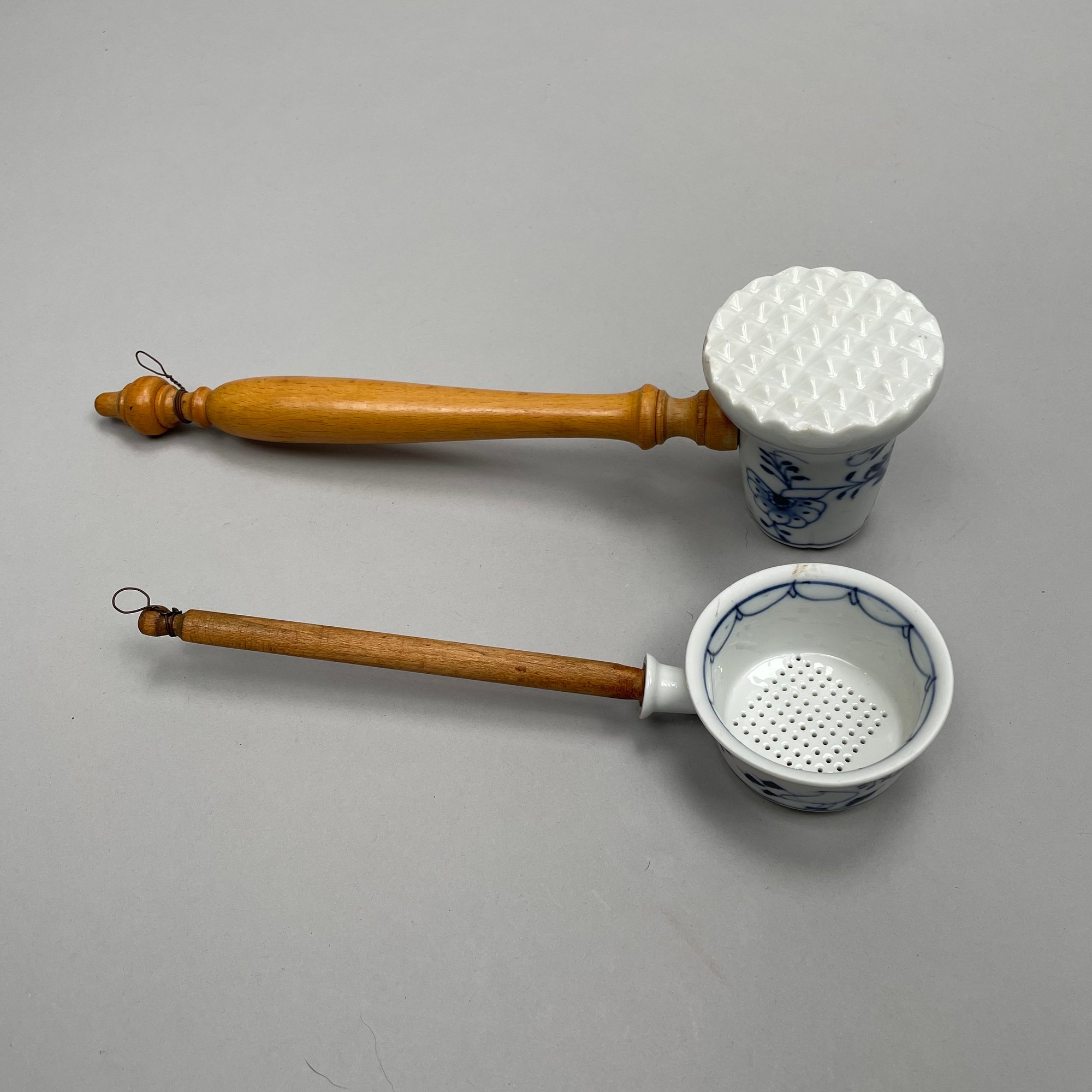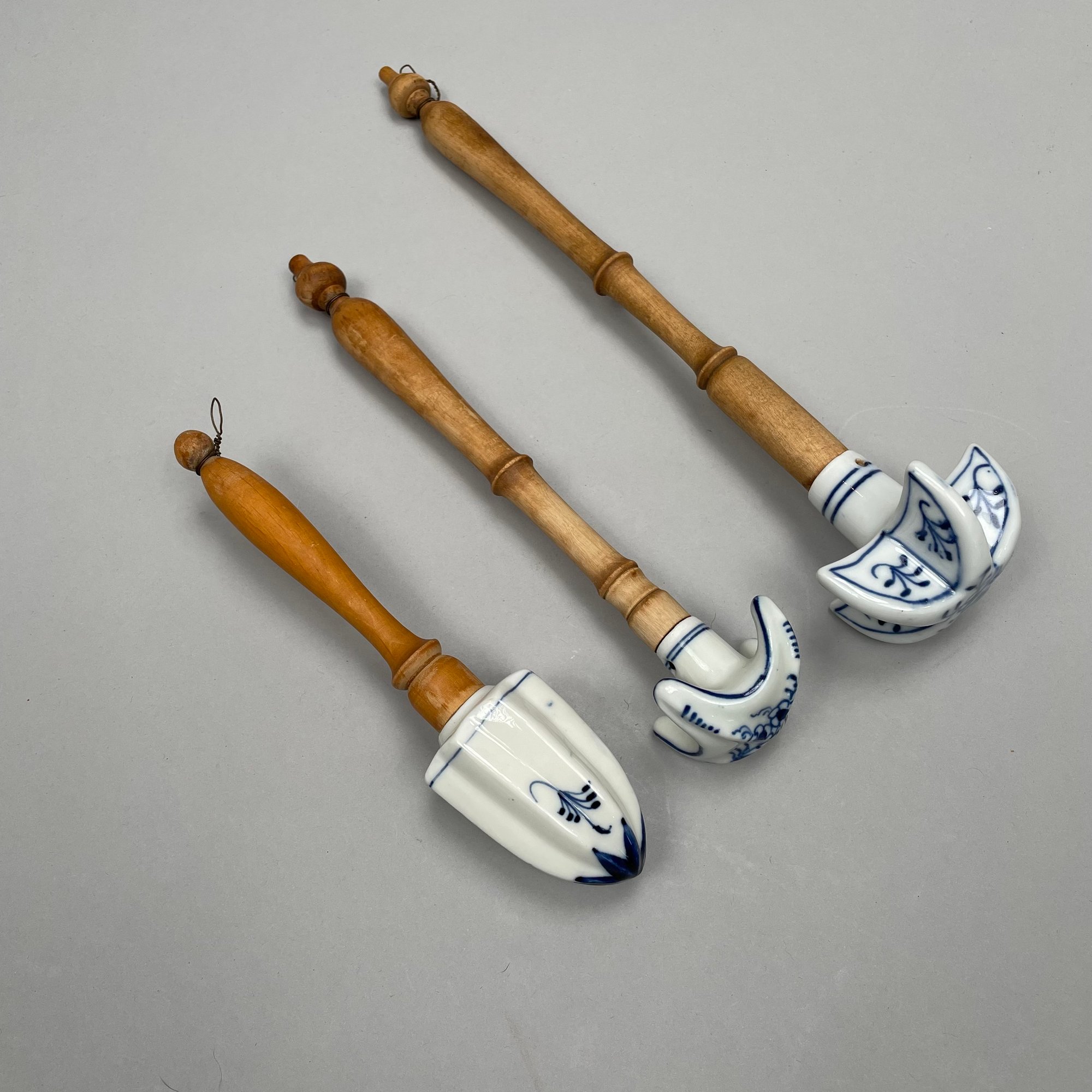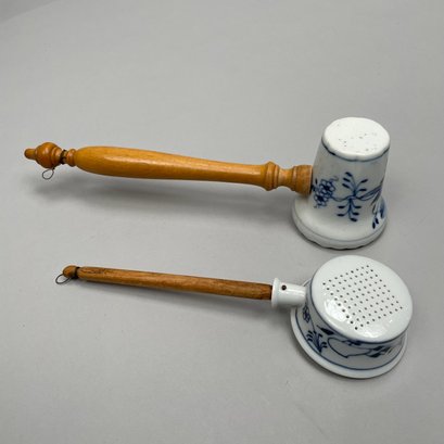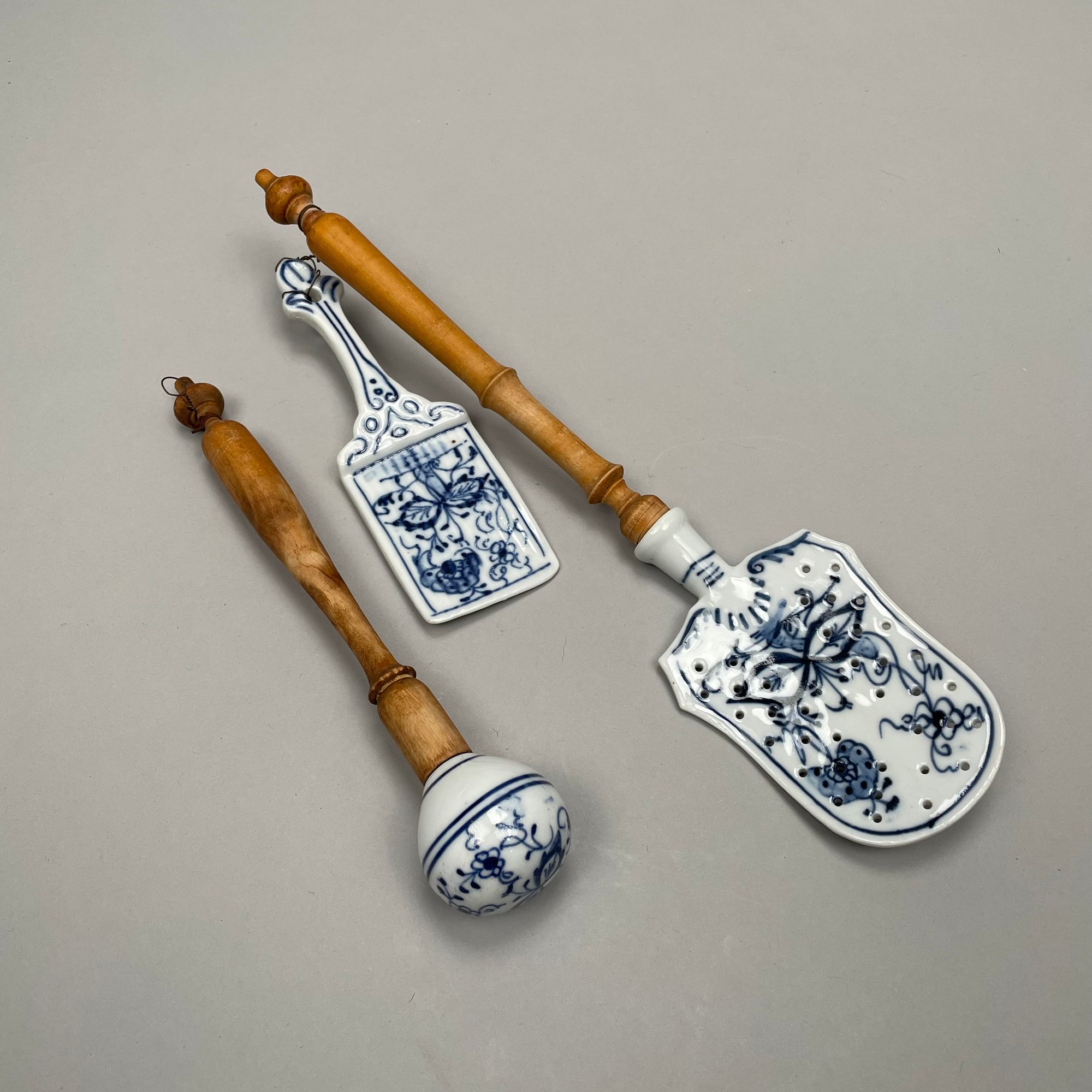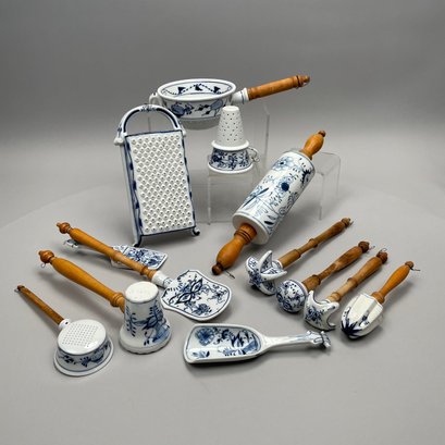 Thirteen Continental Porcelain 'Blue Onion' Serving Utensils, Late Nineteenth-Twentieth Century. Most fitted with a turned wooden handle and comprising a strainer, small strainer, funnel, meat mallet/ tenderizer, cheese grater, pierced spatula, small server, one small and one large star-shaped muddler, round muddler, juicer, rolling pin, and a flour/ sugar scoop.