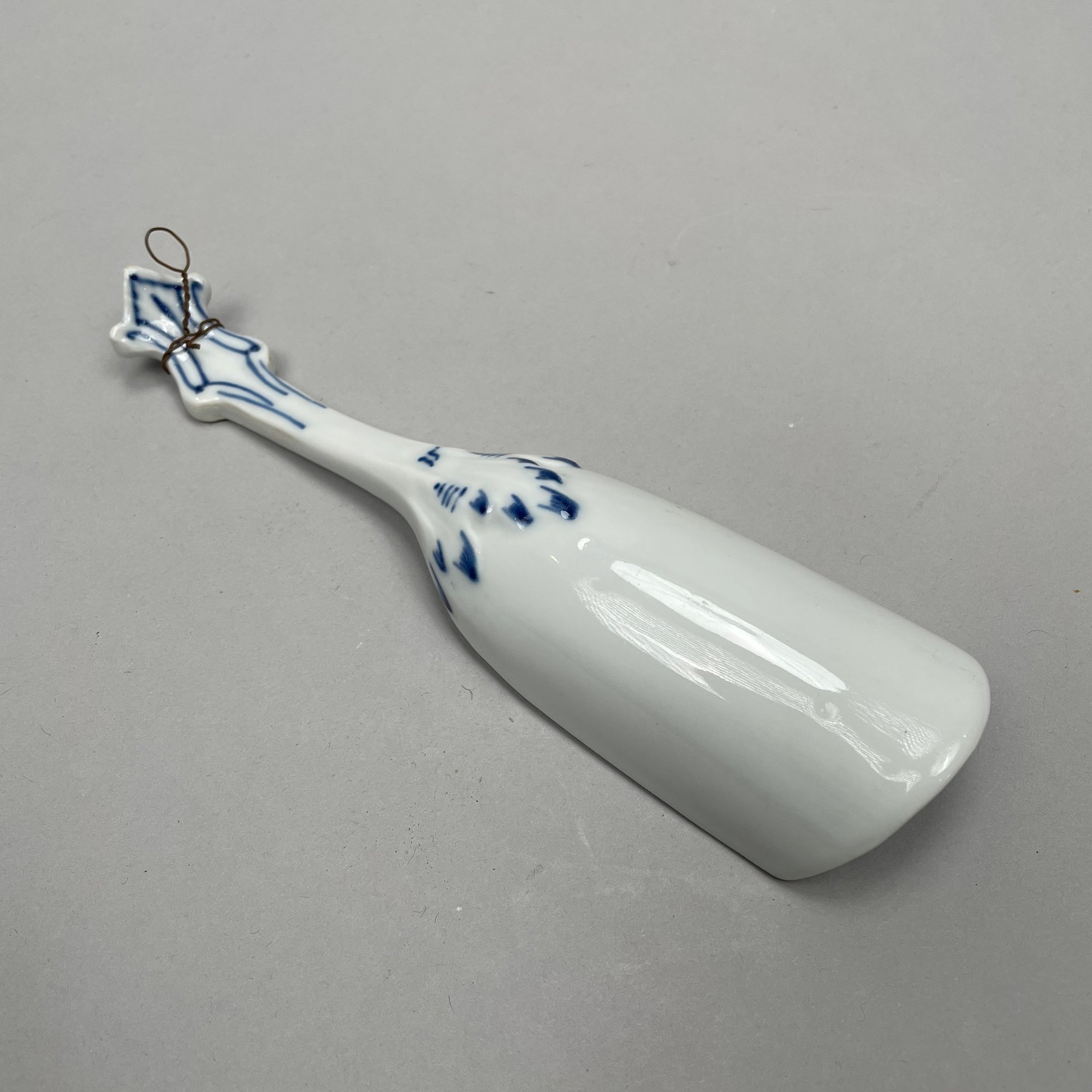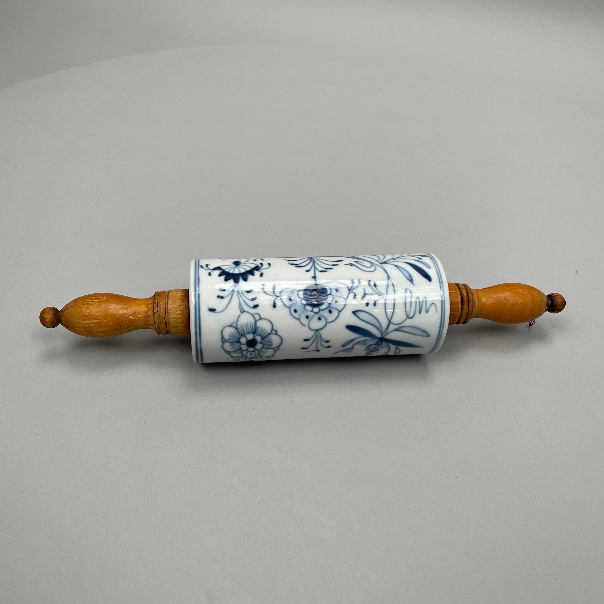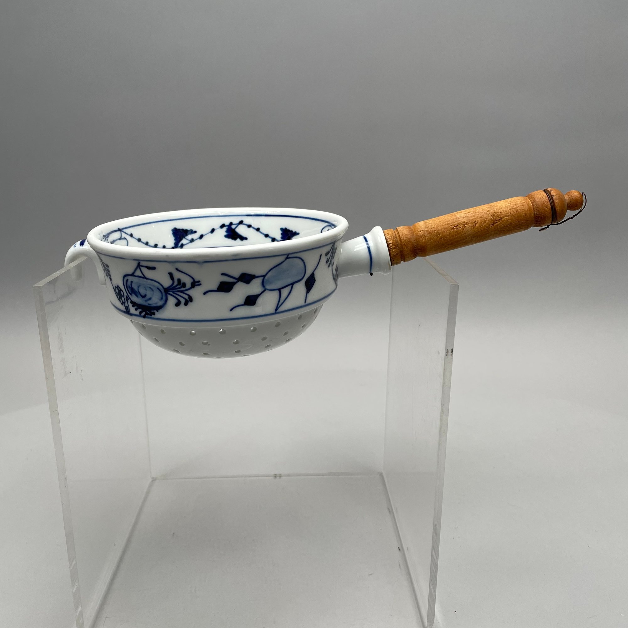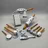 Thirteen Continental Porcelain 'Blue Onion' Serving Utensils, Late Nineteenth-Twentieth Century. Most fitted with a turned wooden handle and comprising a strainer, small strainer, funnel, meat mallet/ tenderizer, cheese grater, pierced spatula, small server, one small and one large star-shaped muddler, round muddler, juicer, rolling pin, and a flour/ sugar scoop.