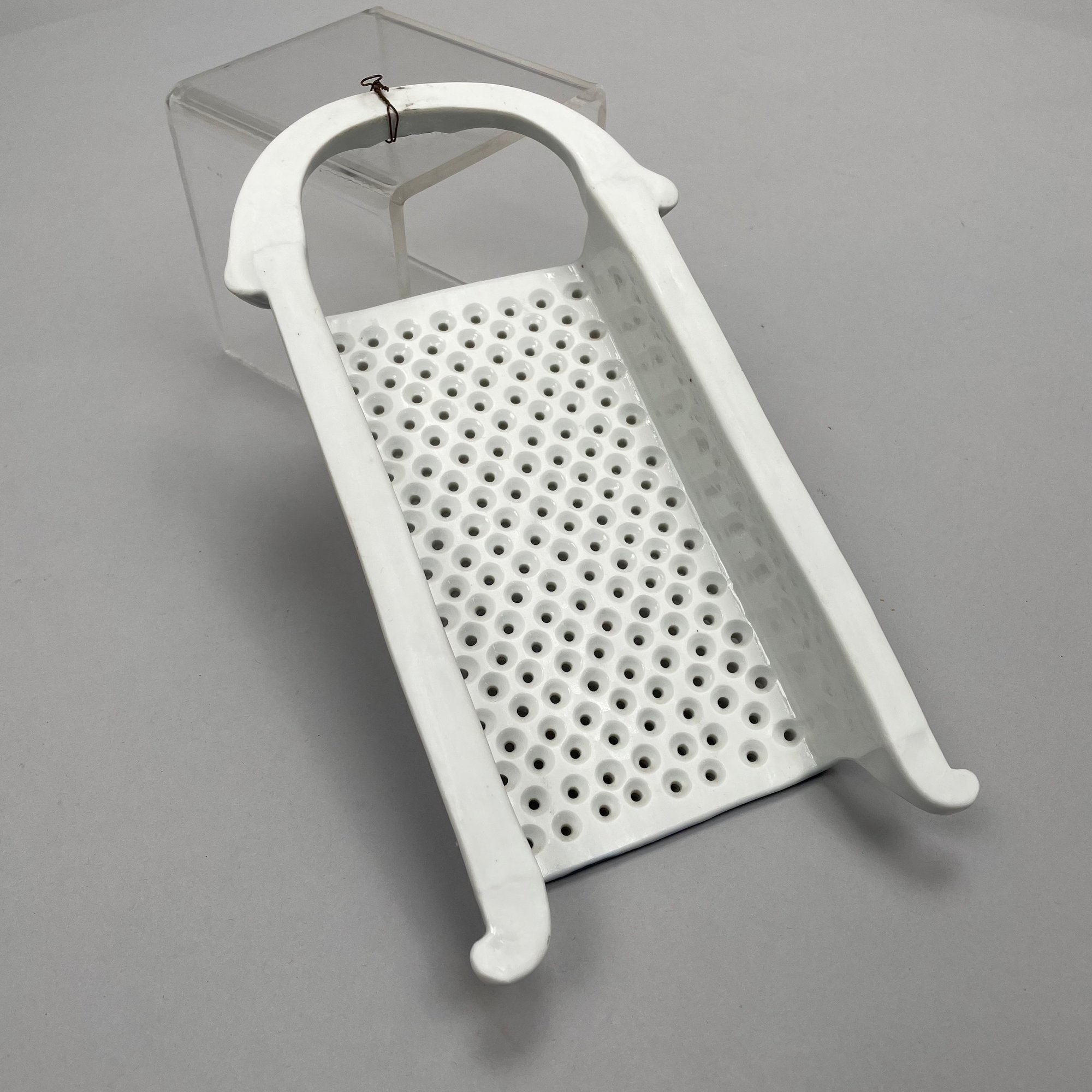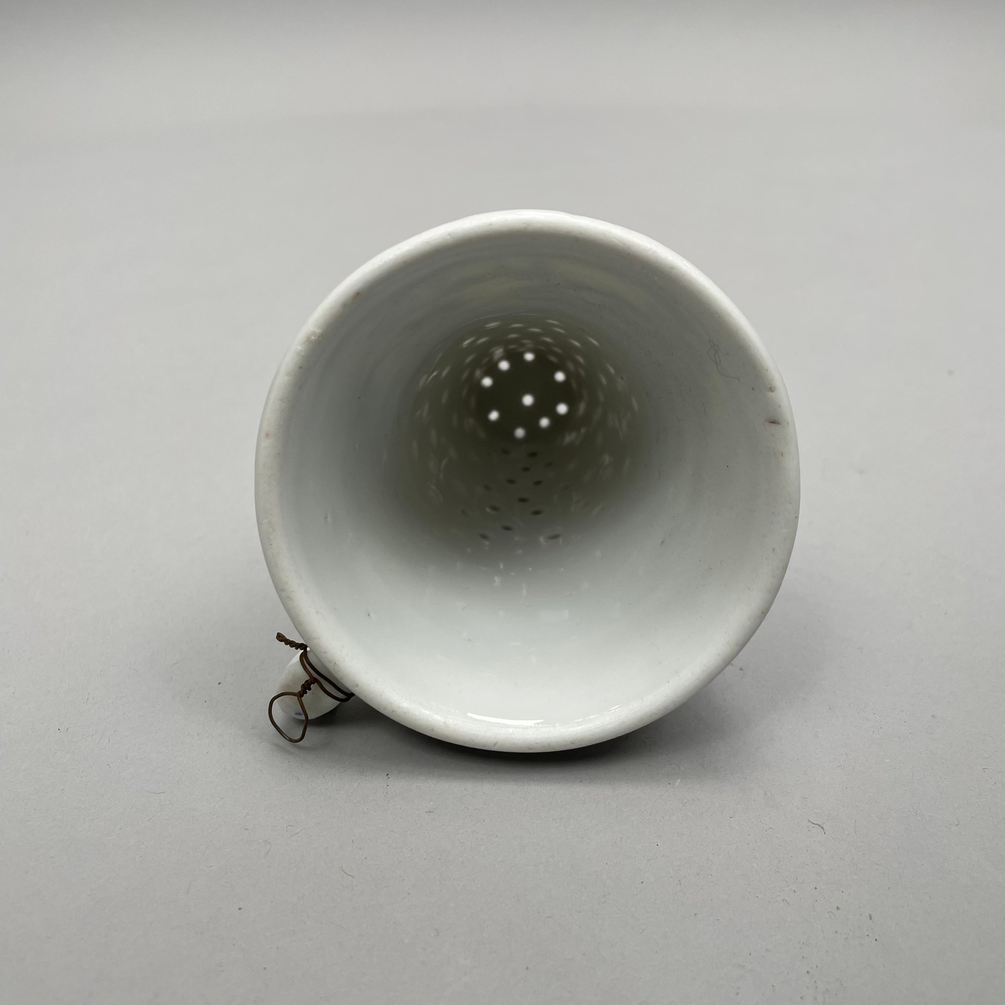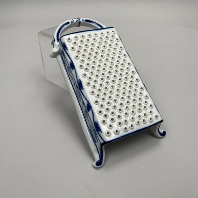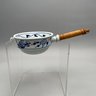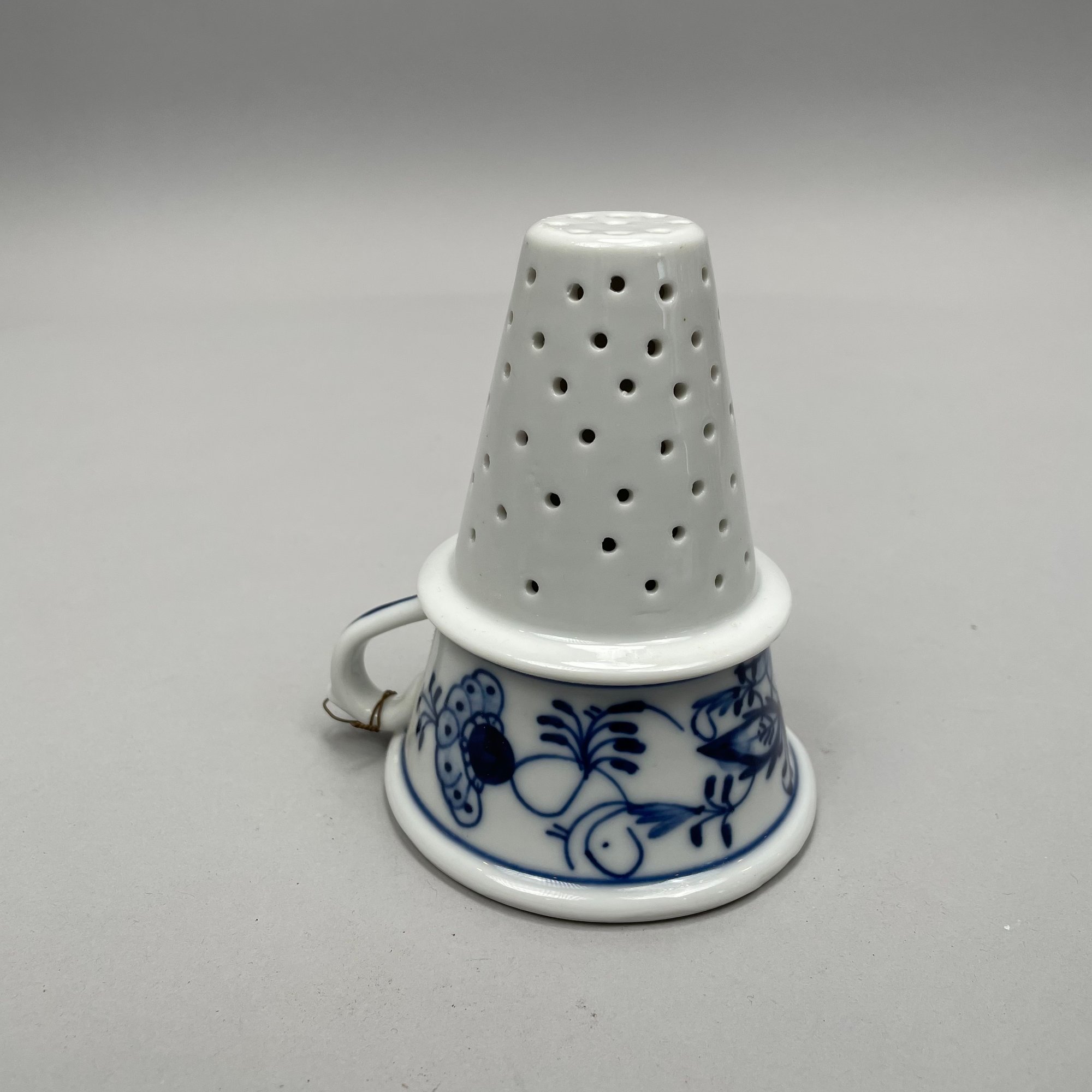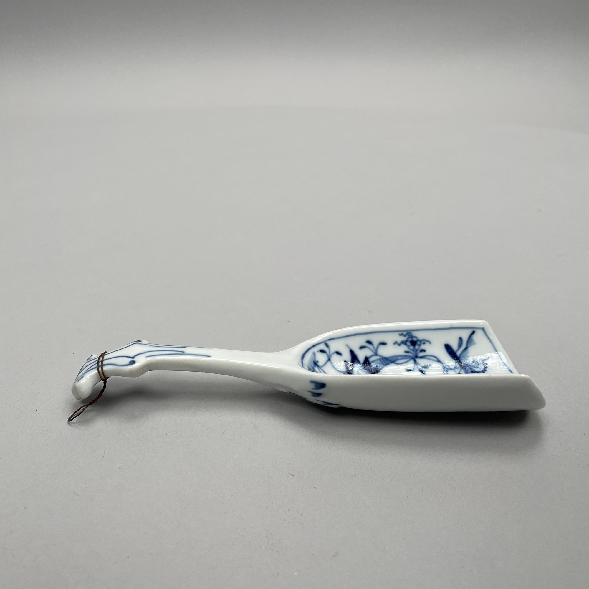 Thirteen Continental Porcelain 'Blue Onion' Serving Utensils, Late Nineteenth-Twentieth Century. Most fitted with a turned wooden handle and comprising a strainer, small strainer, funnel, meat mallet/ tenderizer, cheese grater, pierced spatula, small server, one small and one large star-shaped muddler, round muddler, juicer, rolling pin, and a flour/ sugar scoop.