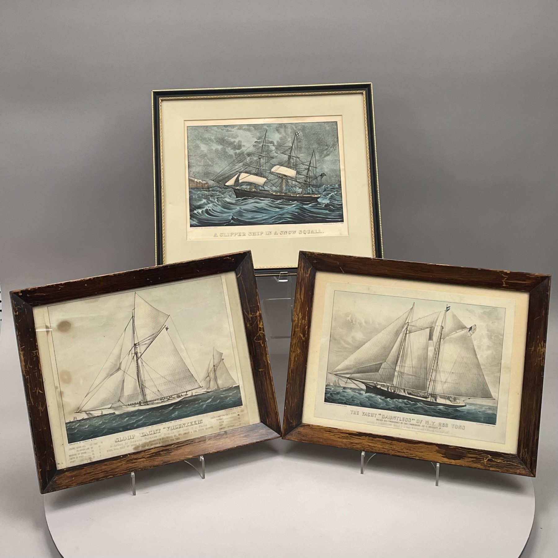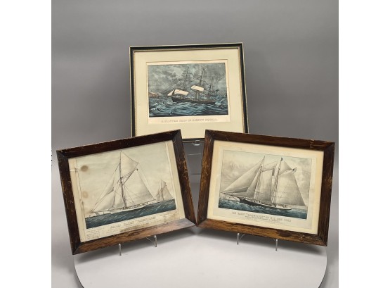 All framed, comprising "THE YACHT 'DAUNTLESS' OF N.Y. 268 TONS," "A CLIPPER SHIP IN A SNOW SQUALL" and "SLOOP YACHT 'VOLUNTEER,'" all "PUBLISHED BY CURRIER & IVES," the addresses 152, 125 and 115, respectively.